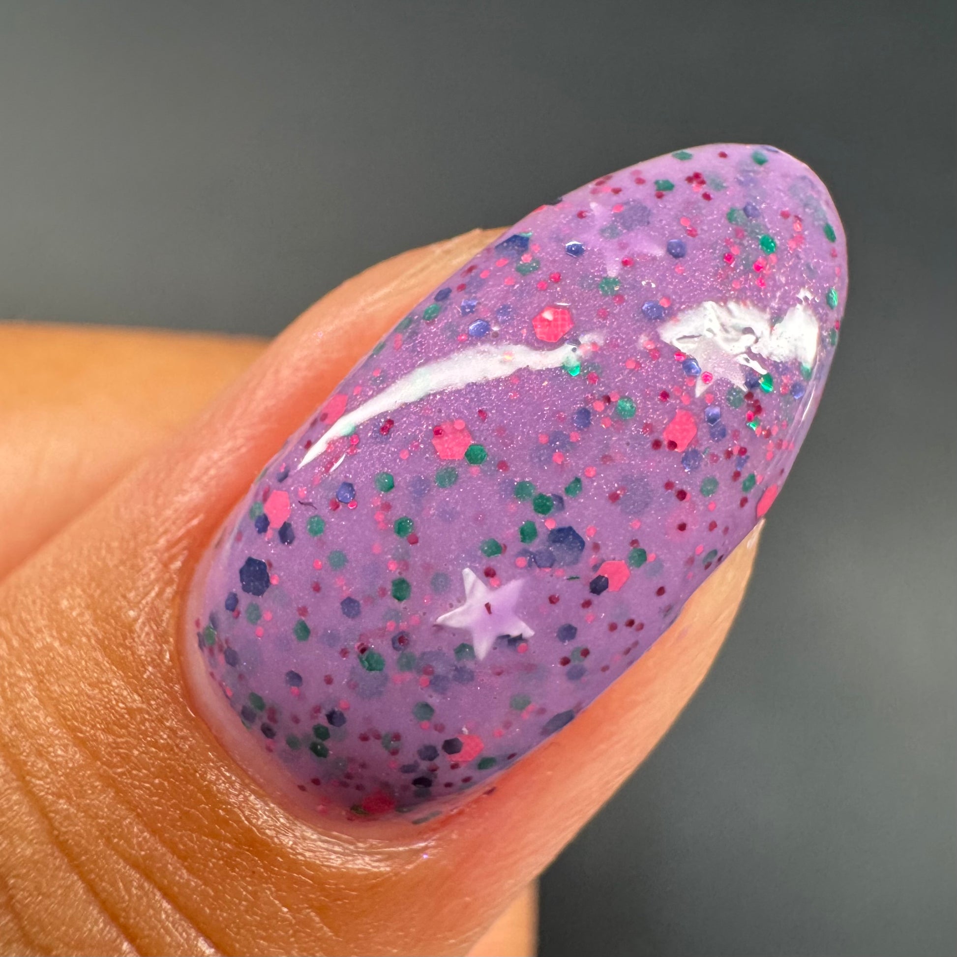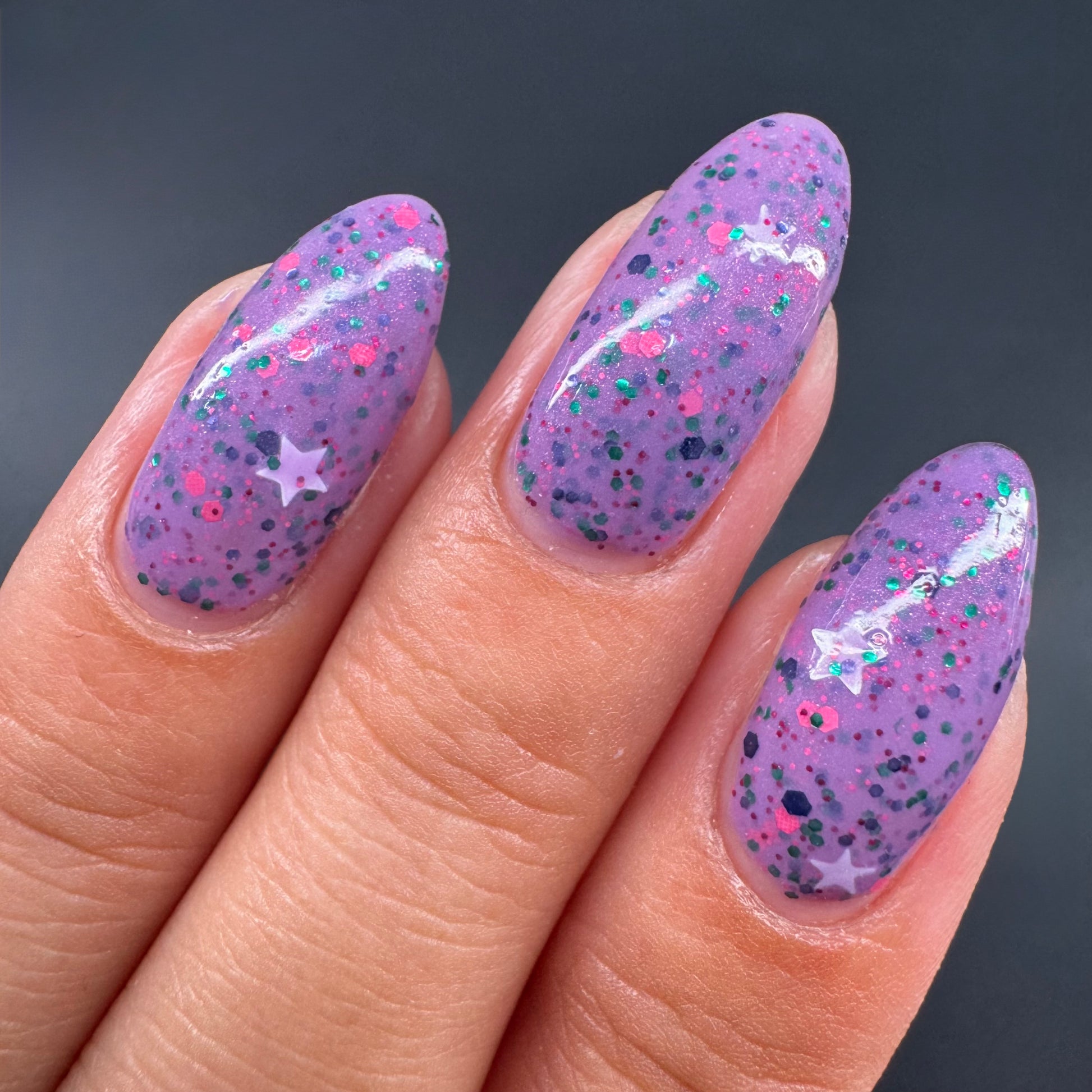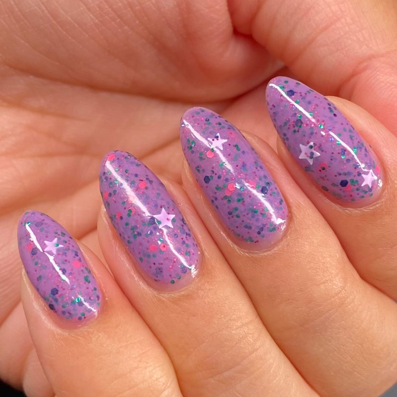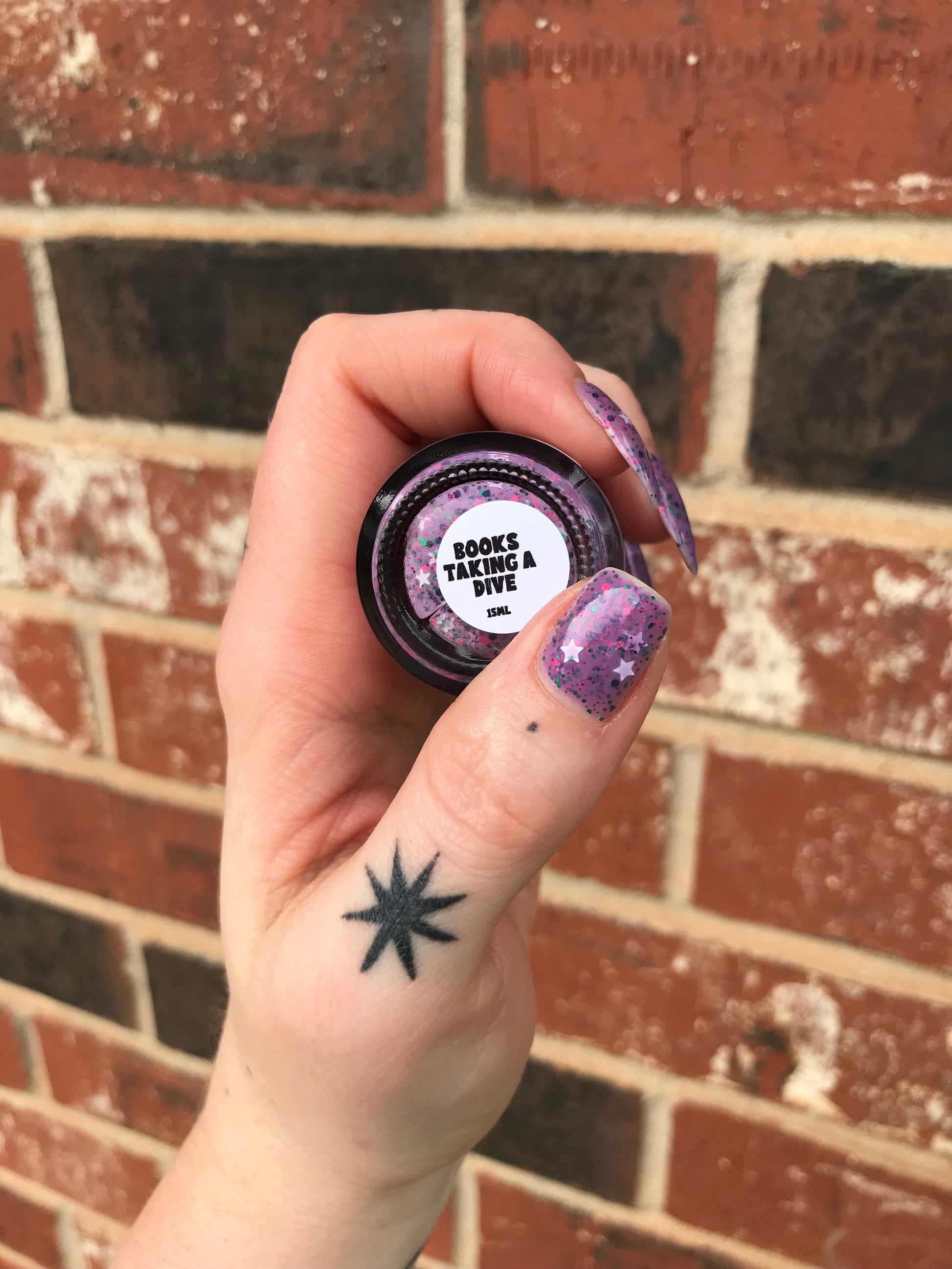 Books Taking A Dive is a warm toned purple crelly with red shimmer, white stars, pink, purple and green hex glitters in various sizes.