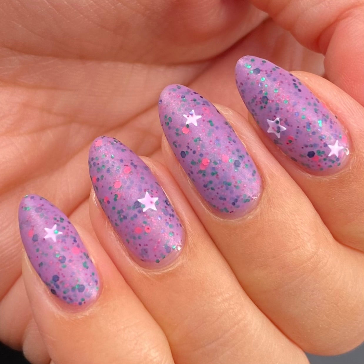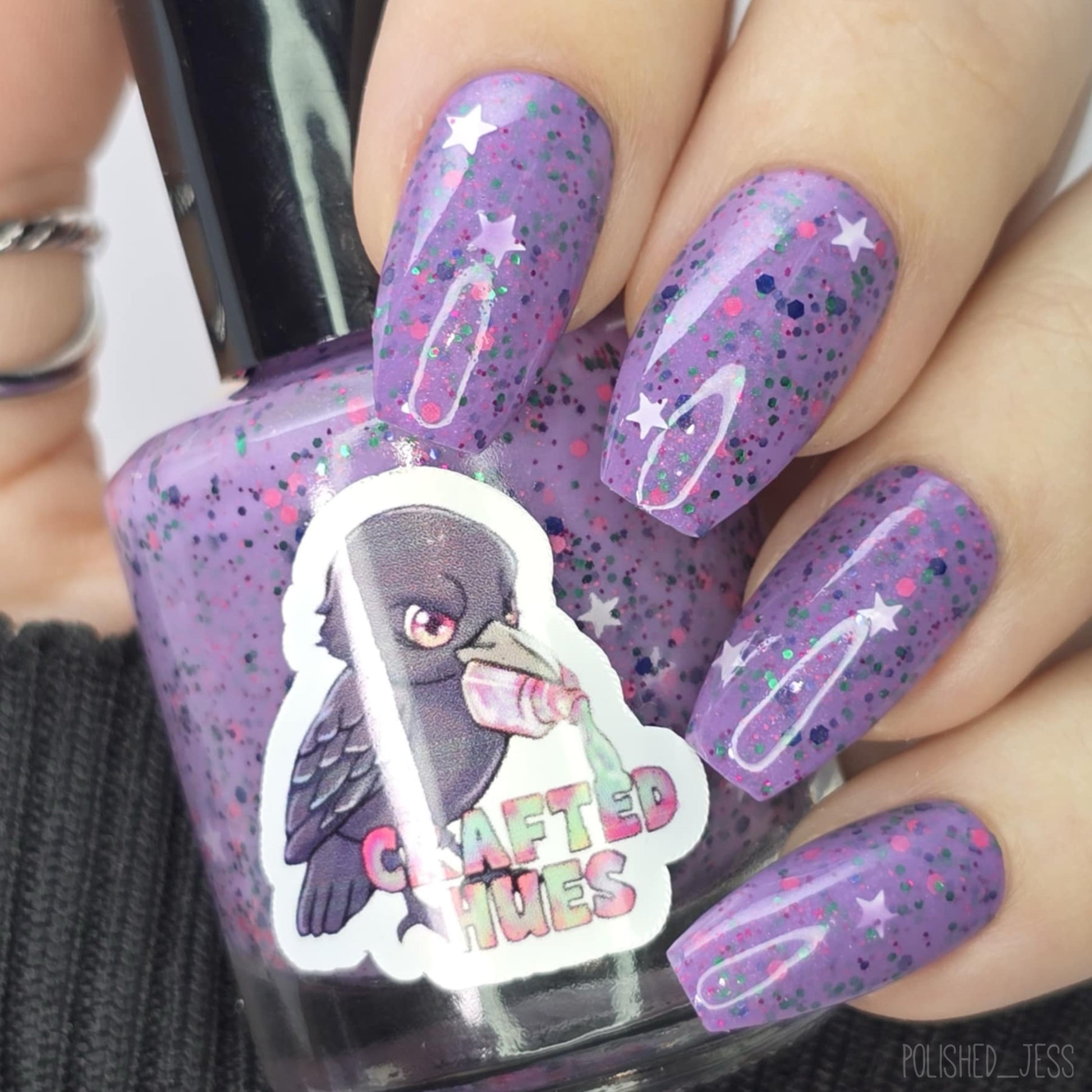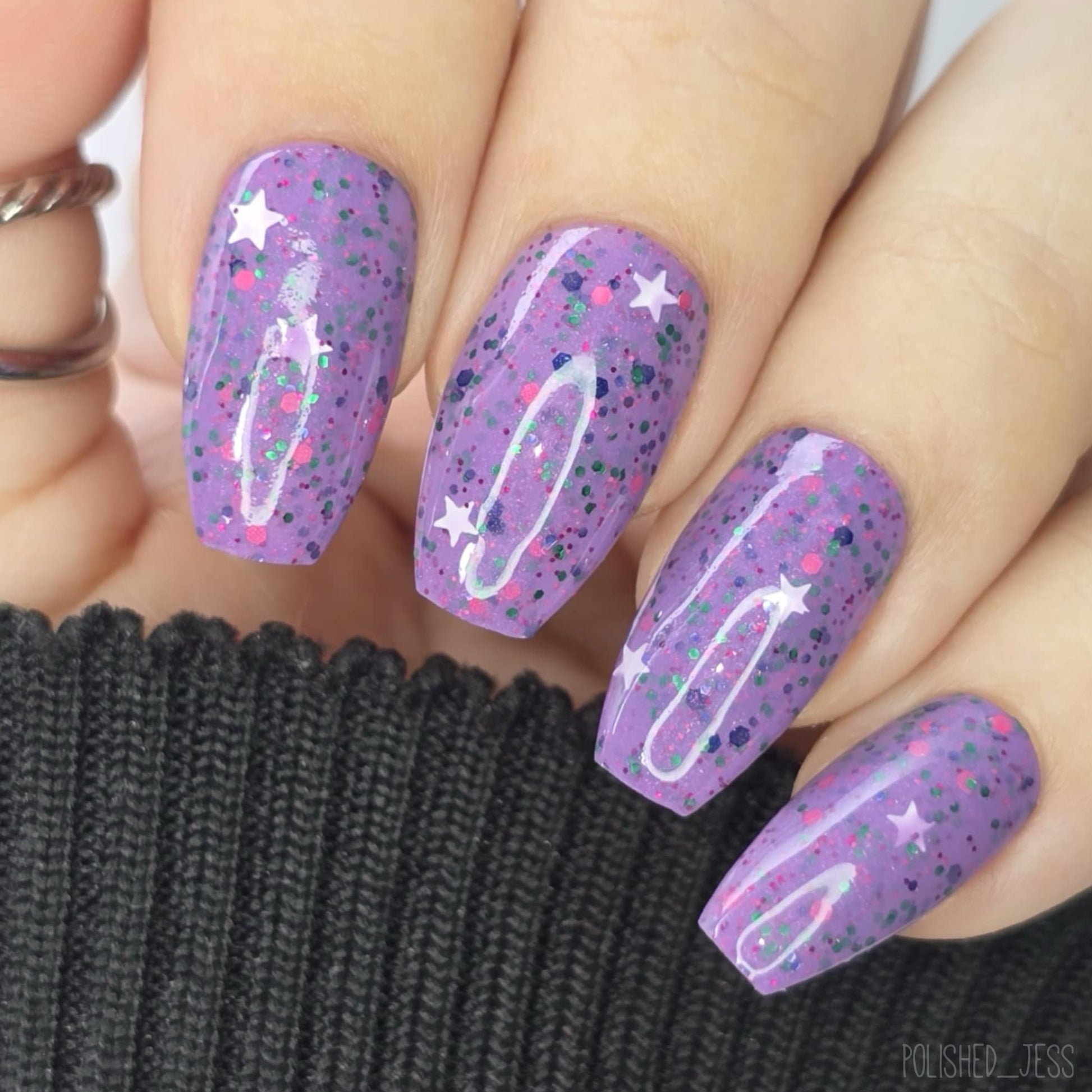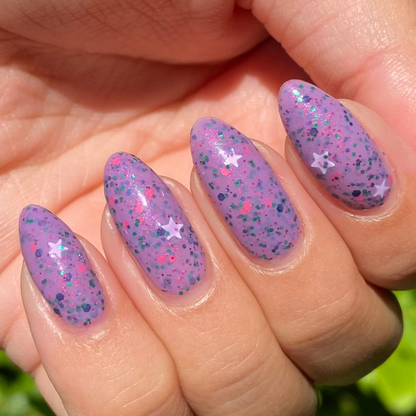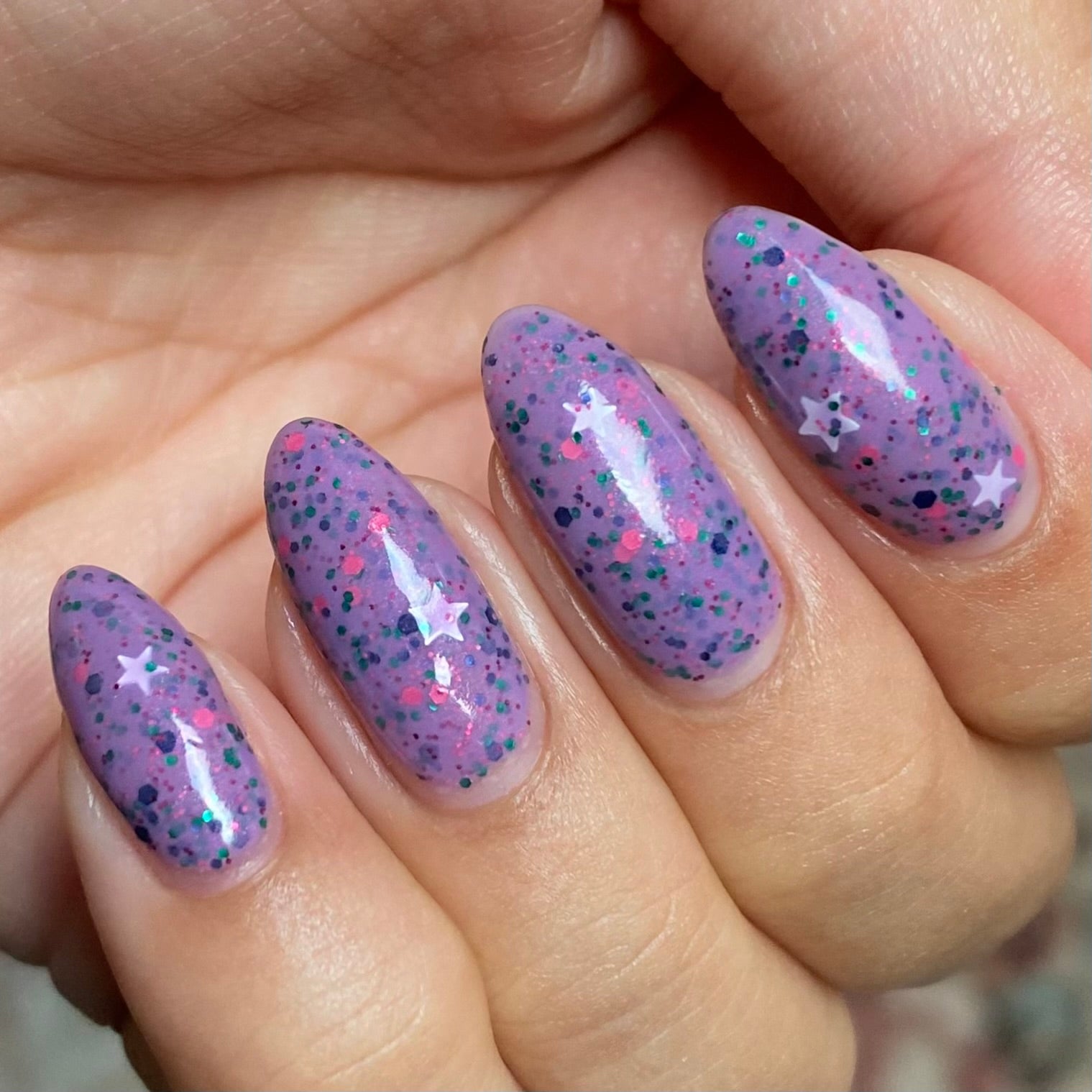 Books Taking A Dive is a warm toned purple crelly with red shimmer, white stars, pink, purple and green hex glitters in various sizes.
