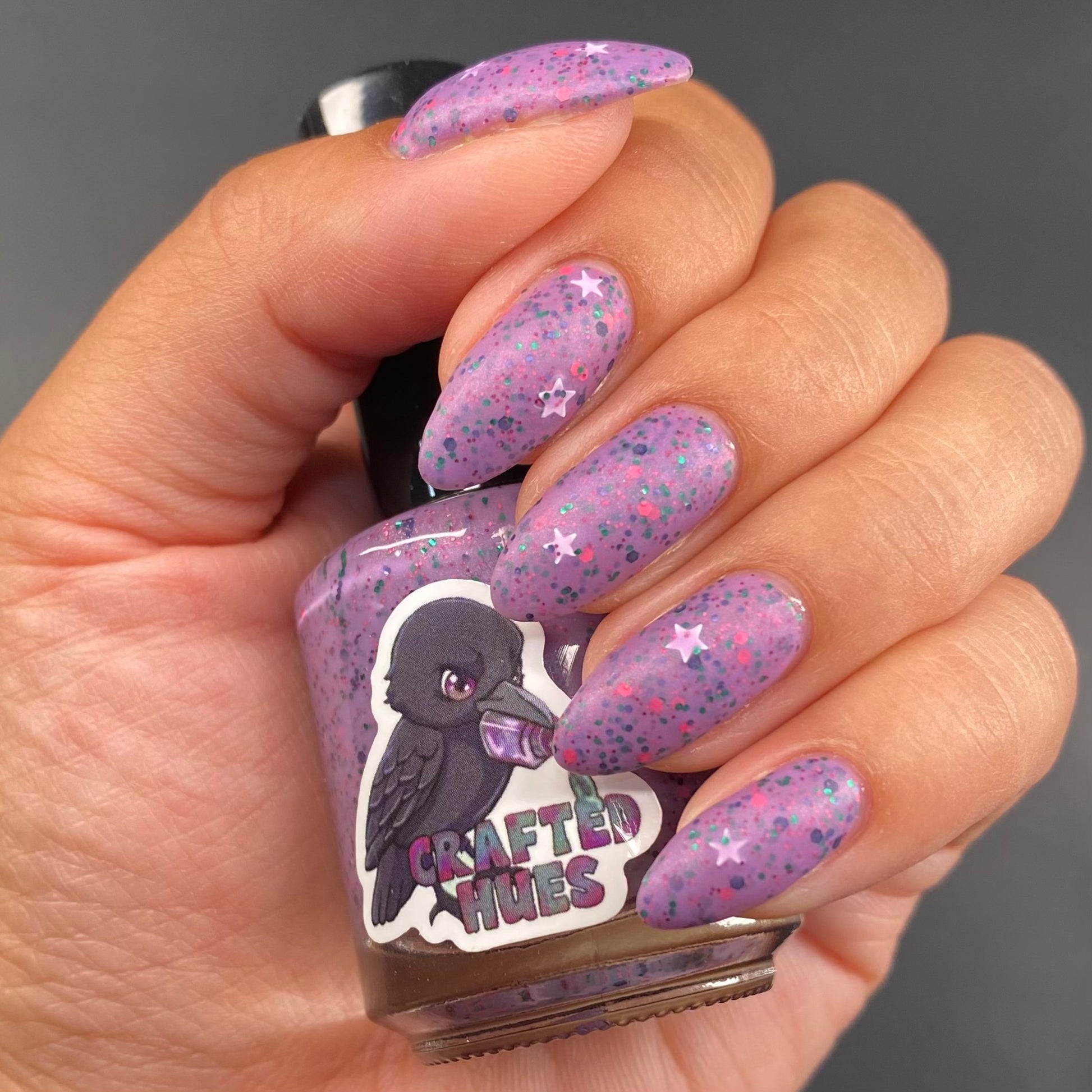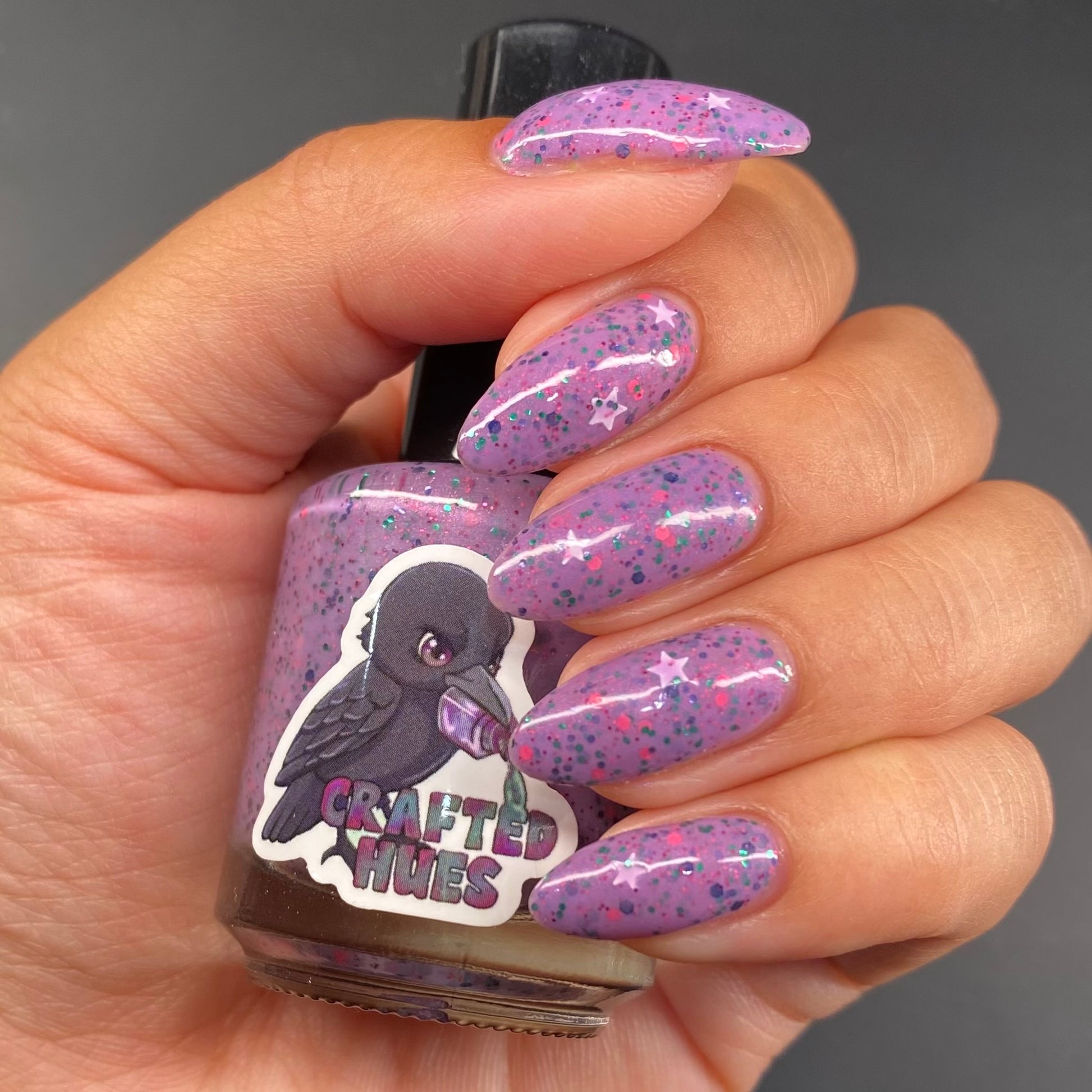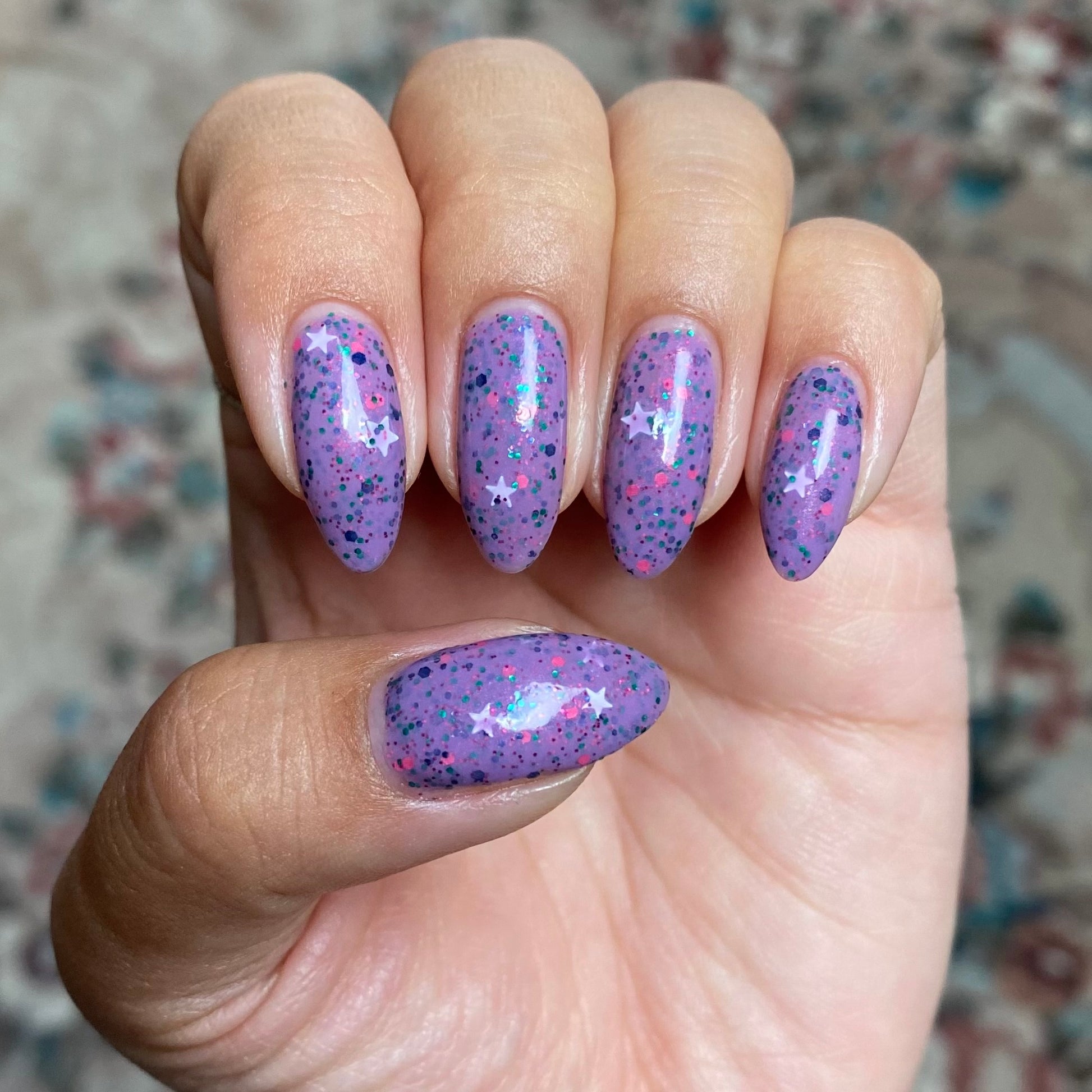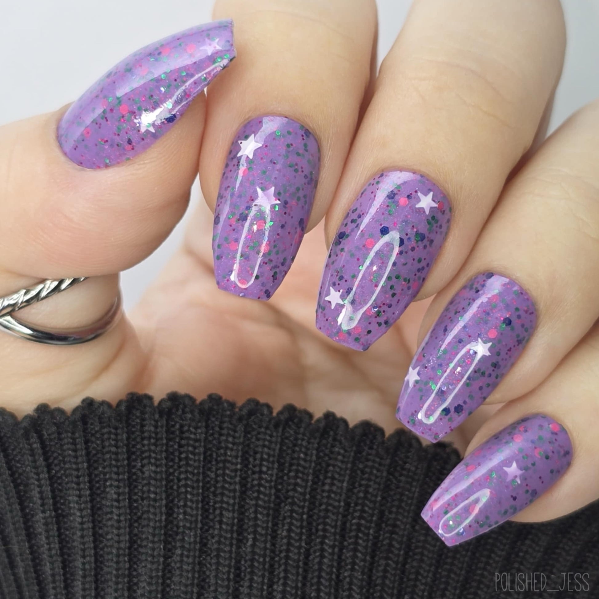 Books Taking A Dive is a warm toned purple crelly with red shimmer, white stars, pink, purple and green hex glitters in various sizes.