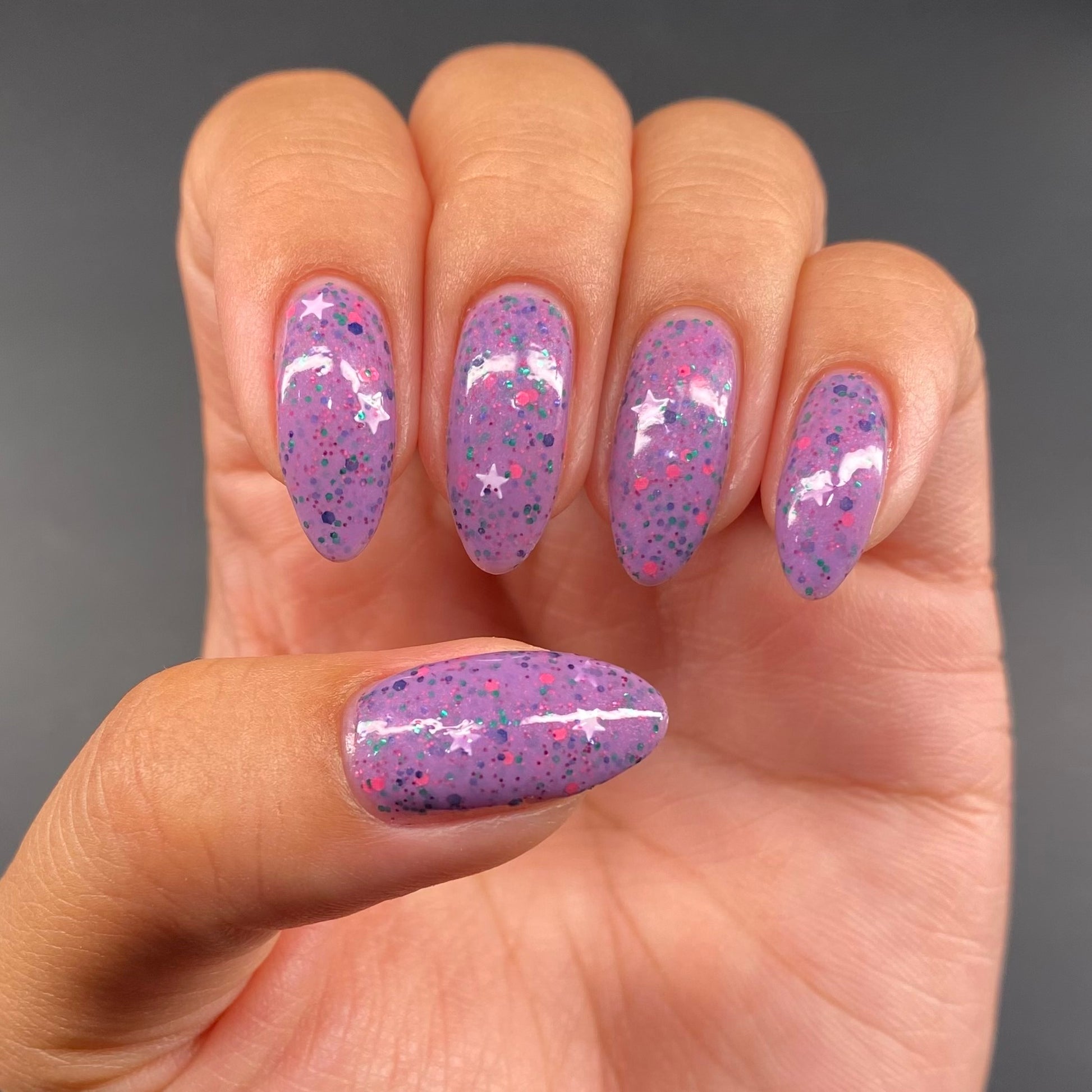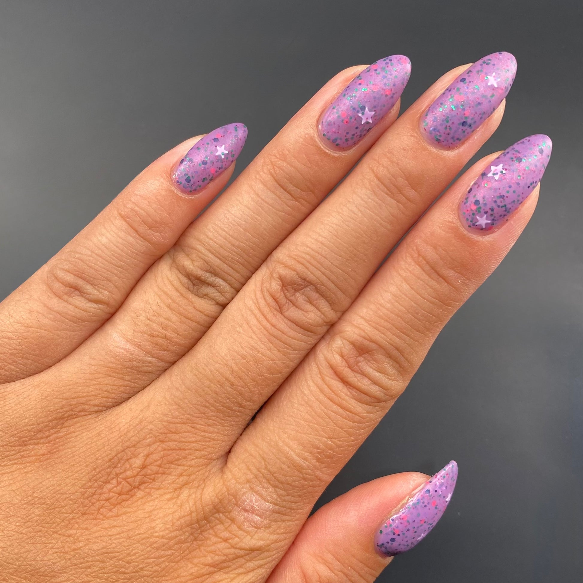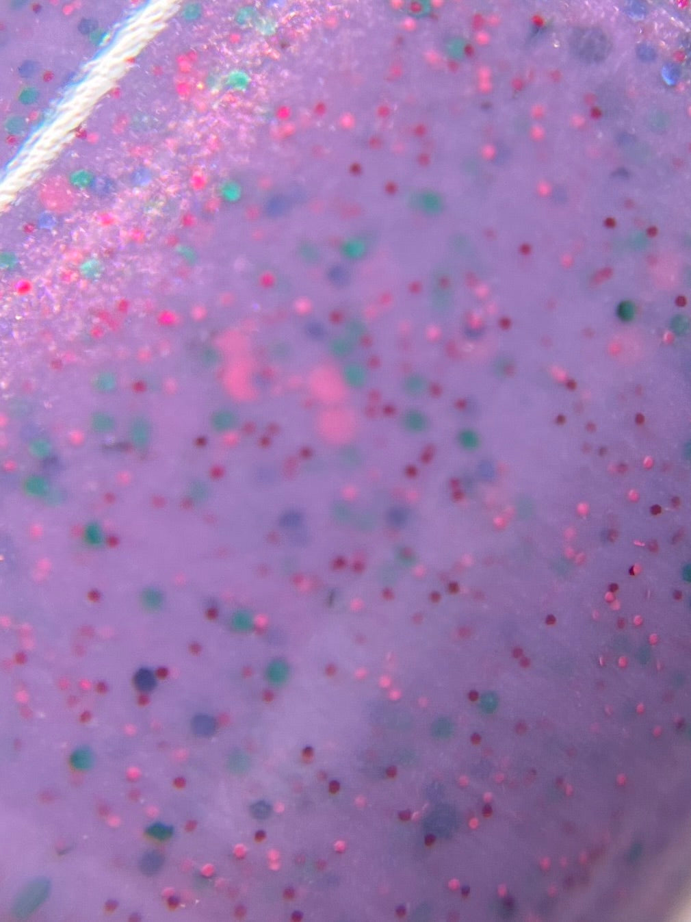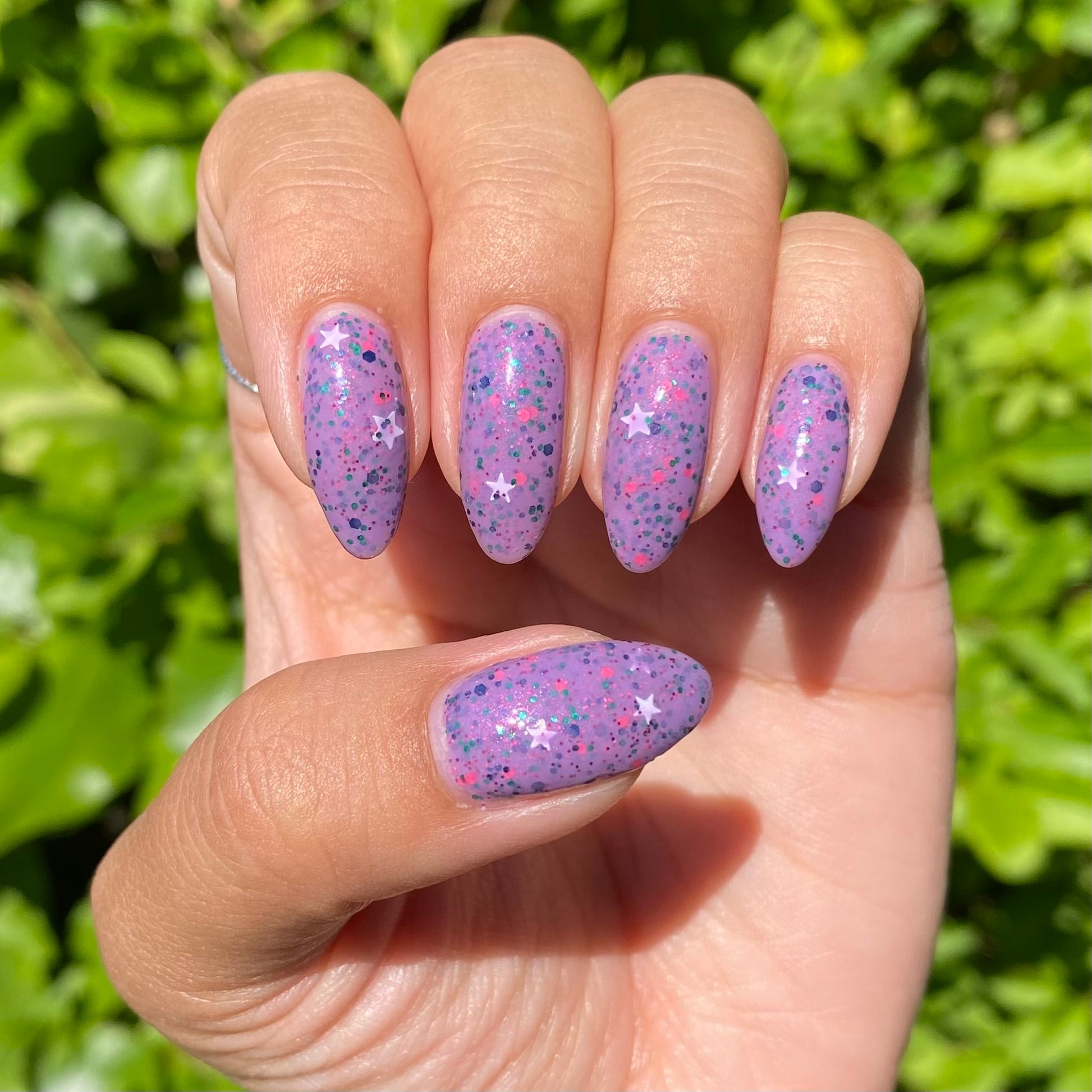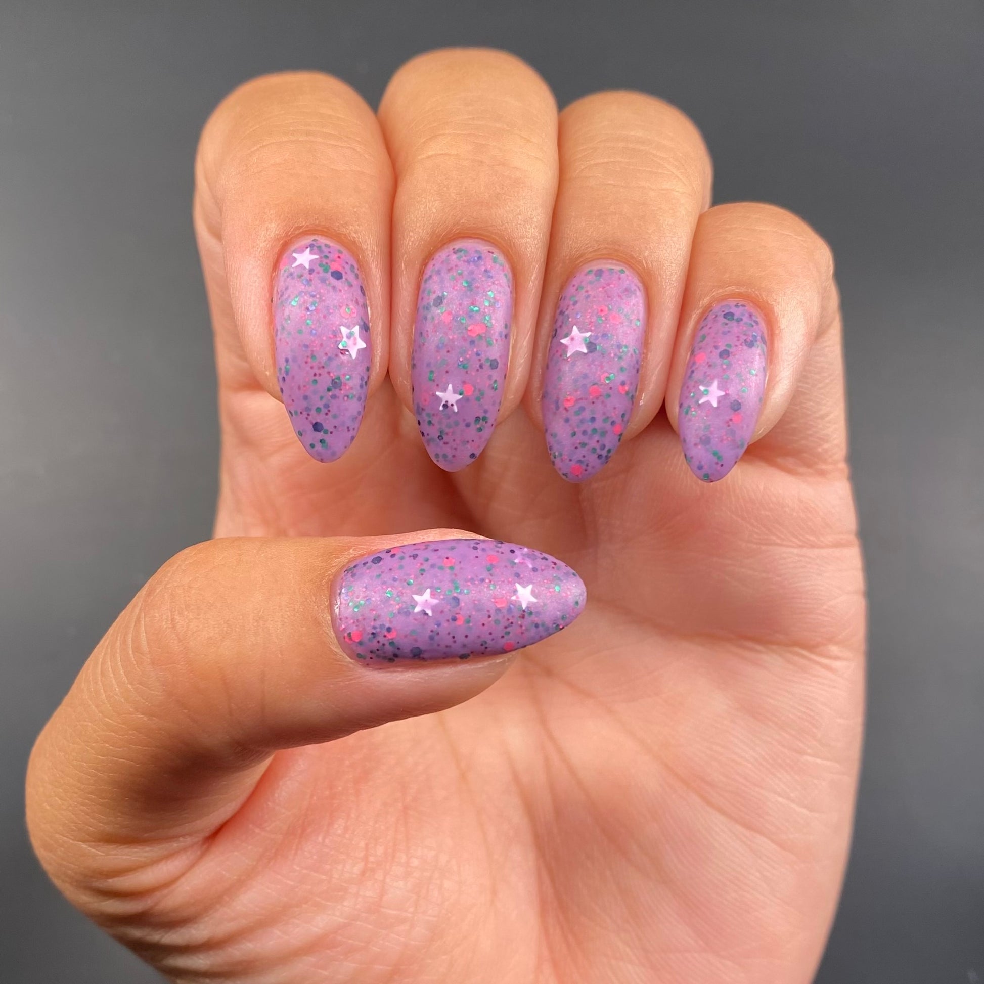Books Taking A Dive is a warm toned purple crelly with red shimmer, white stars, pink, purple and green hex glitters in various sizes.