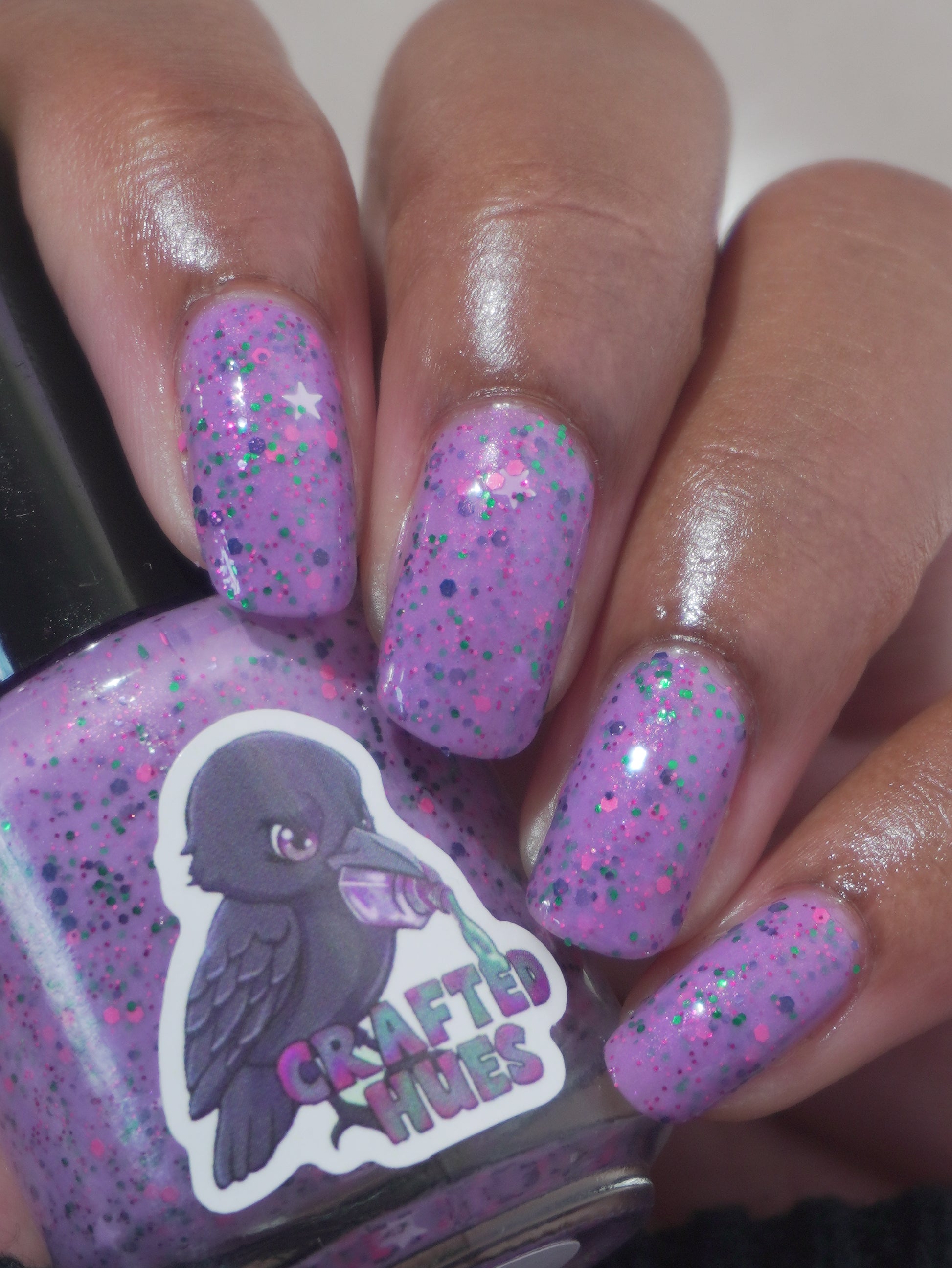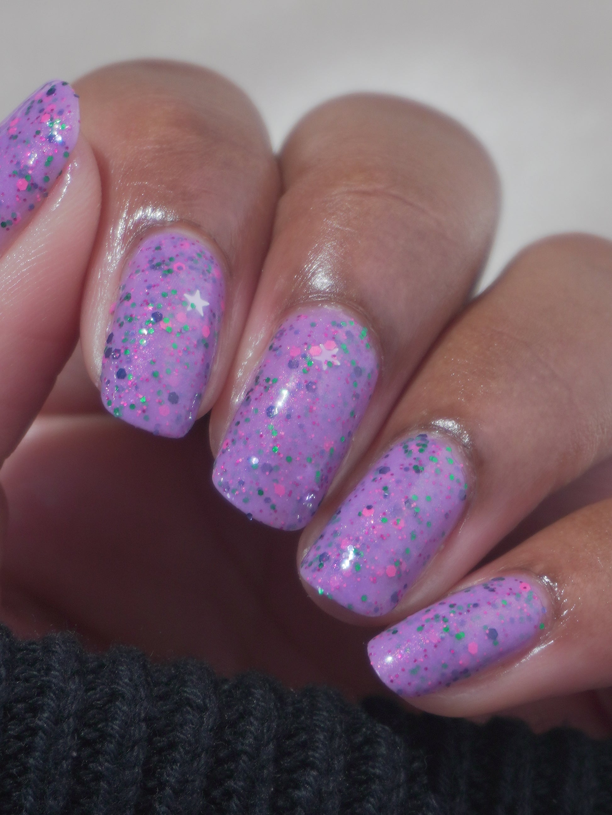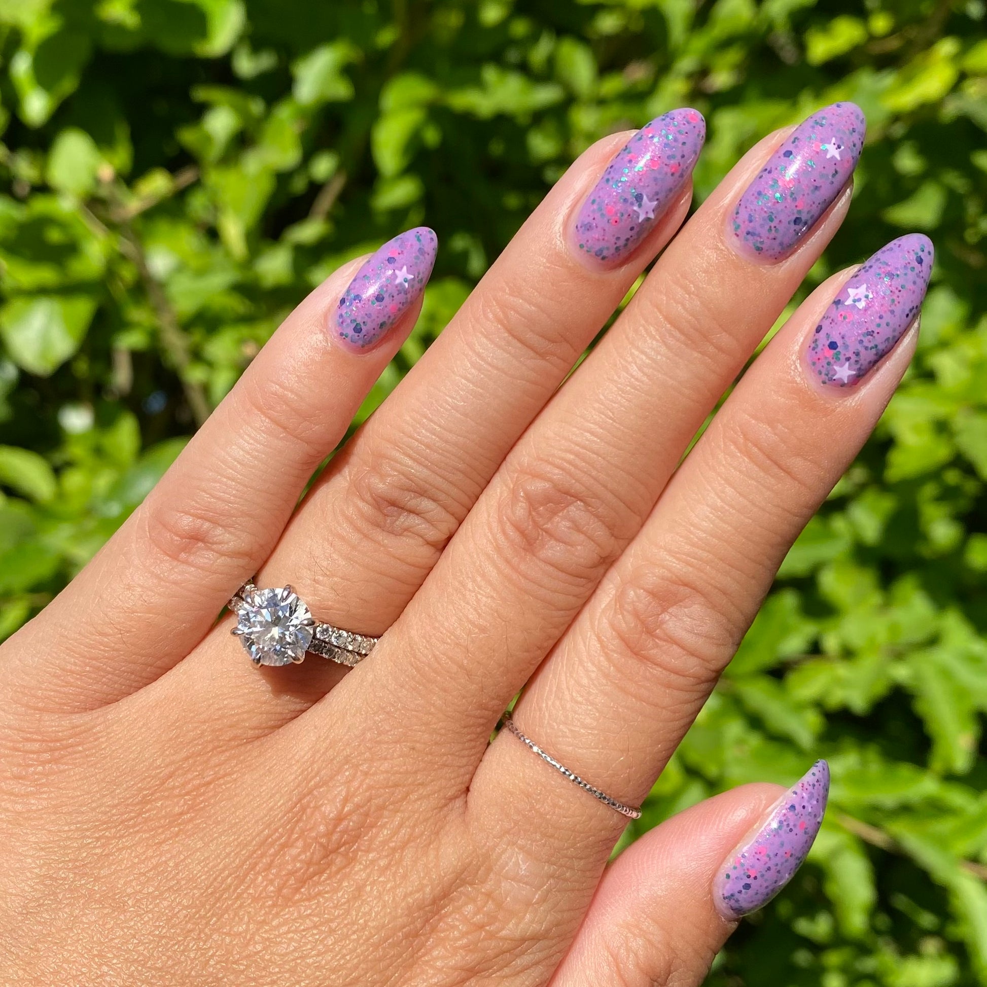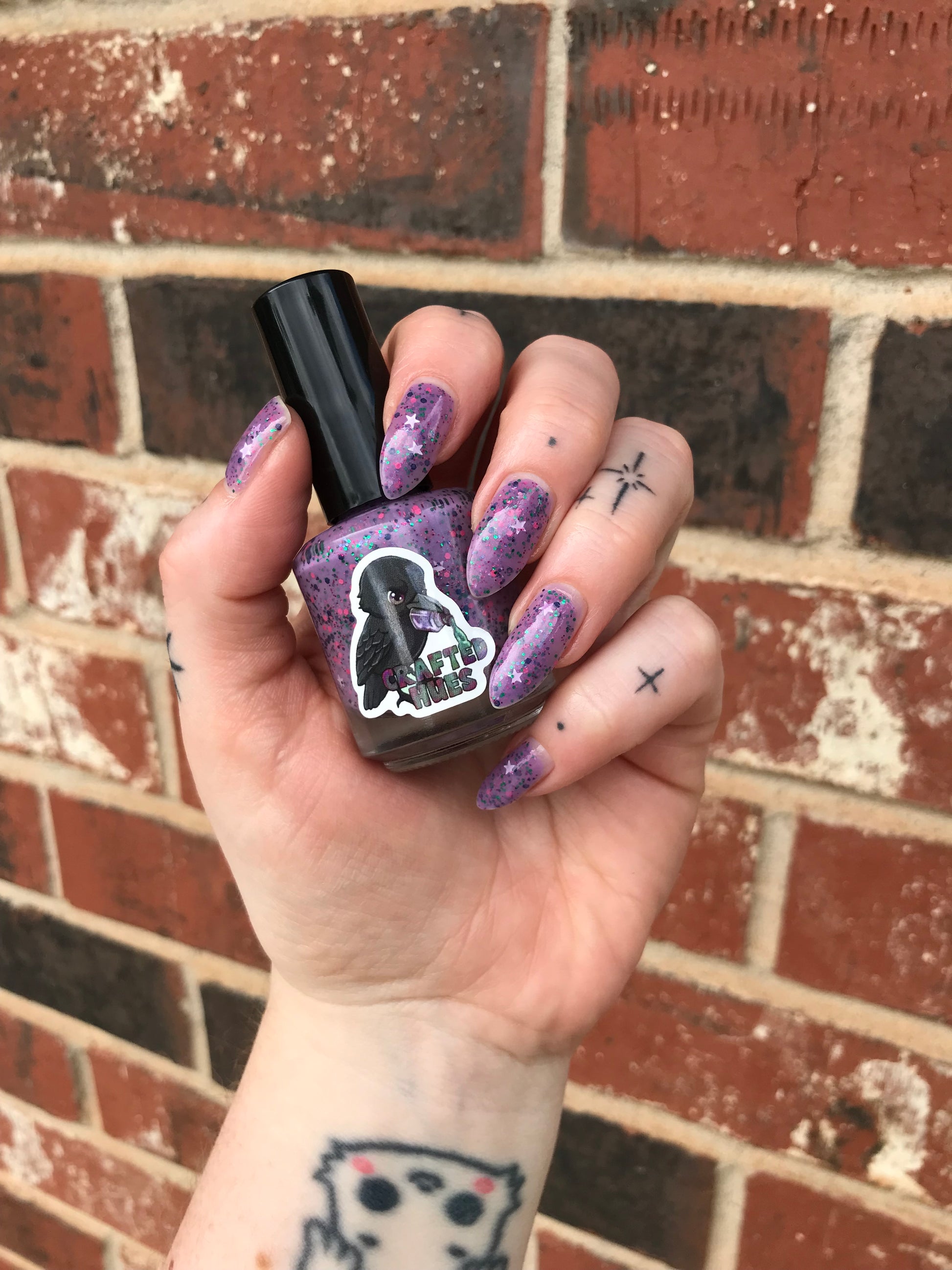 Books Taking A Dive is a warm toned purple crelly with red shimmer, white stars, pink, purple and green hex glitters in various sizes.