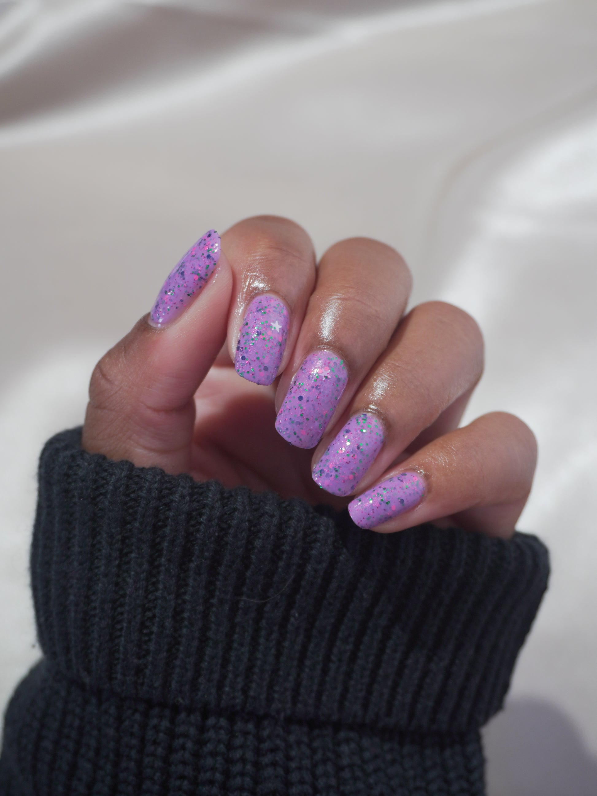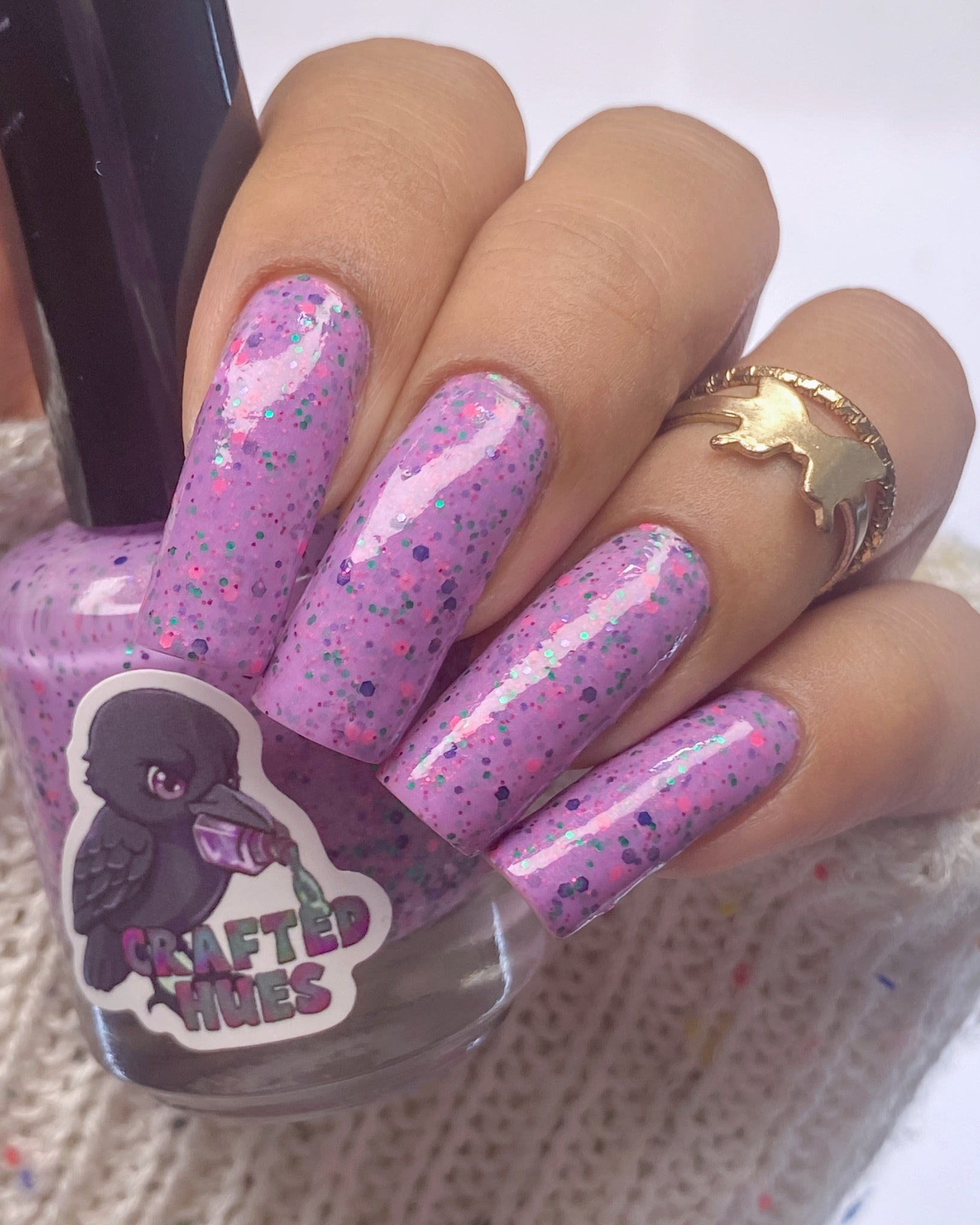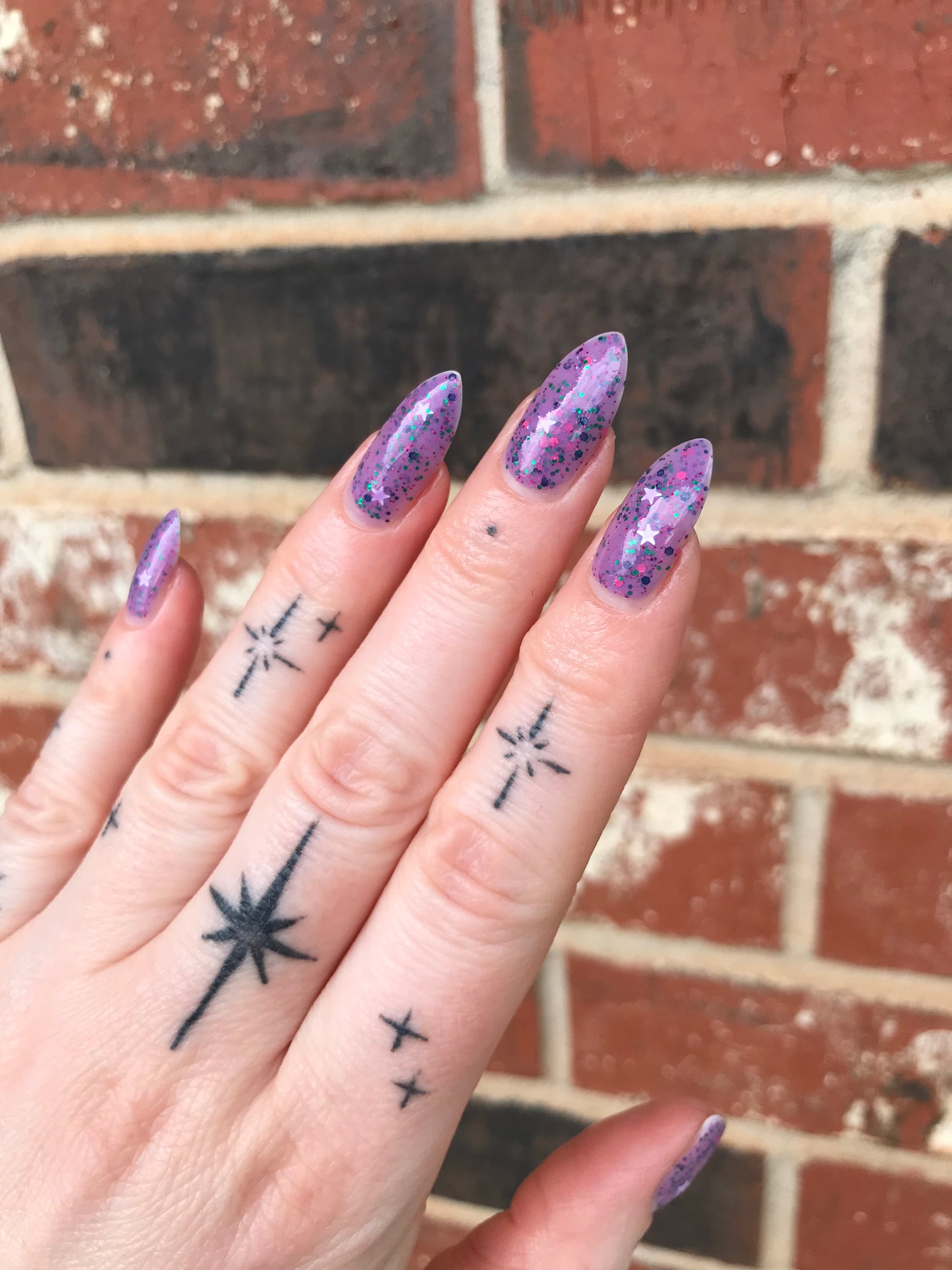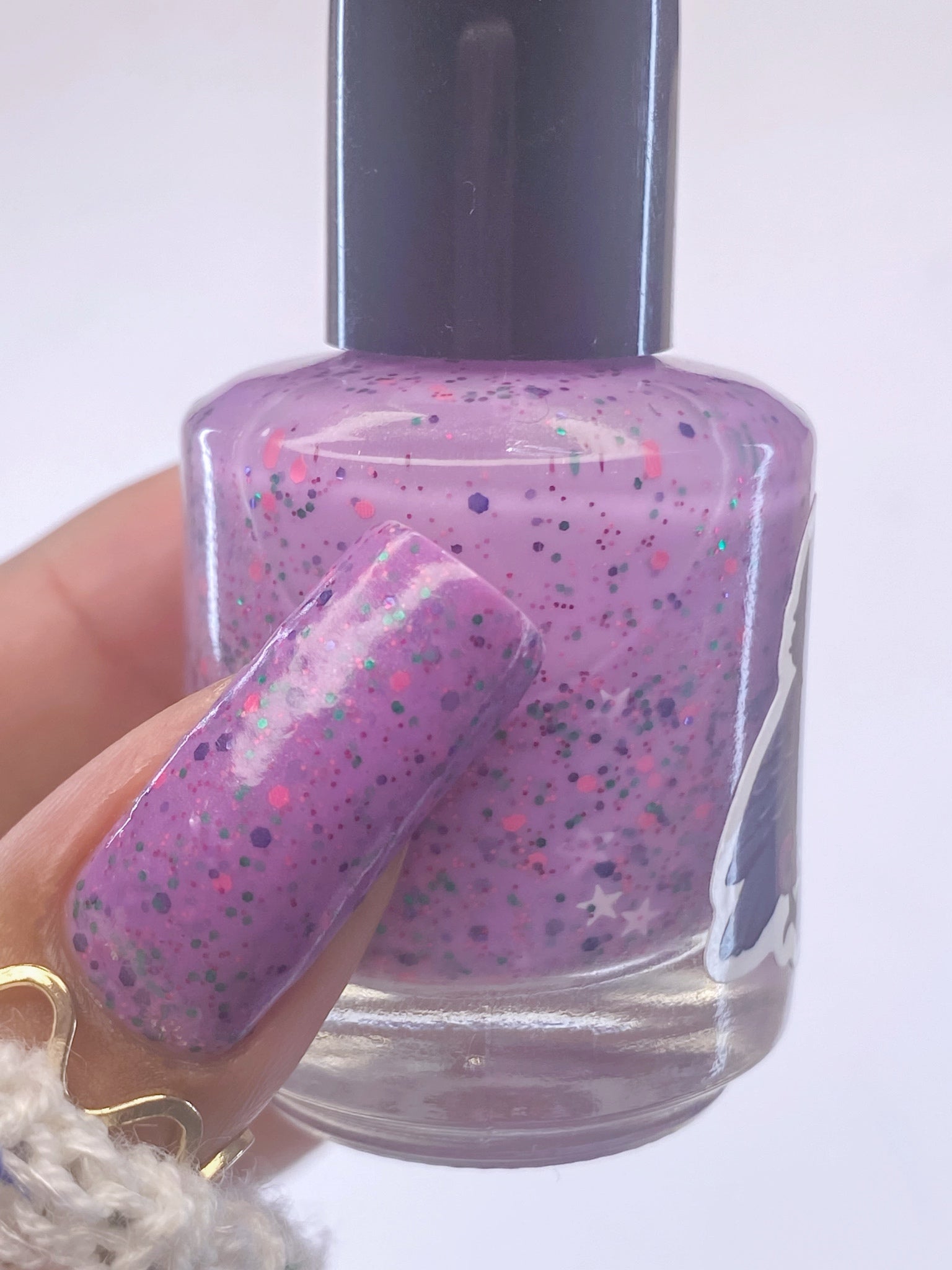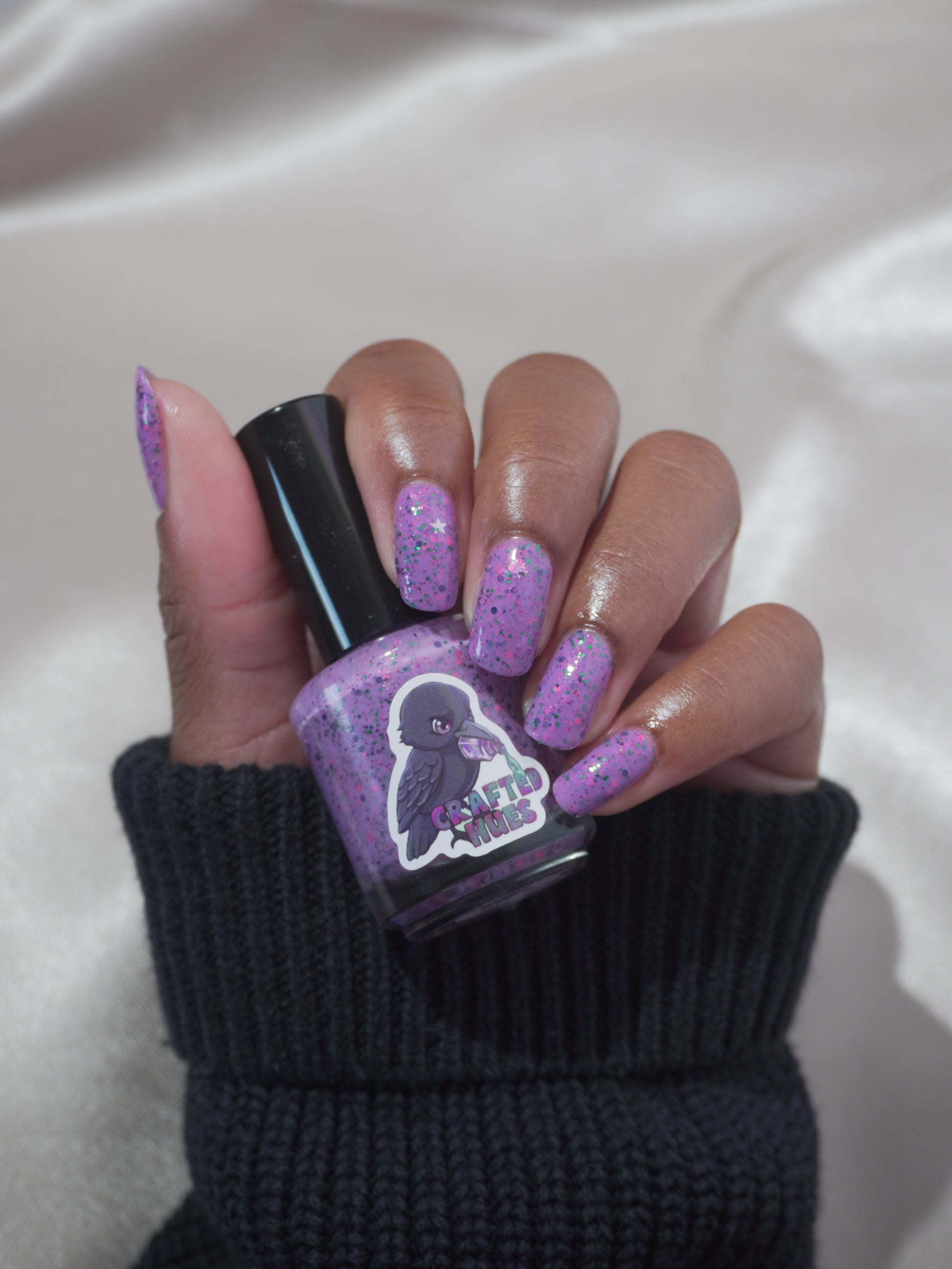 Books Taking A Dive is a warm toned purple crelly with red shimmer, white stars, pink, purple and green hex glitters in various sizes.
