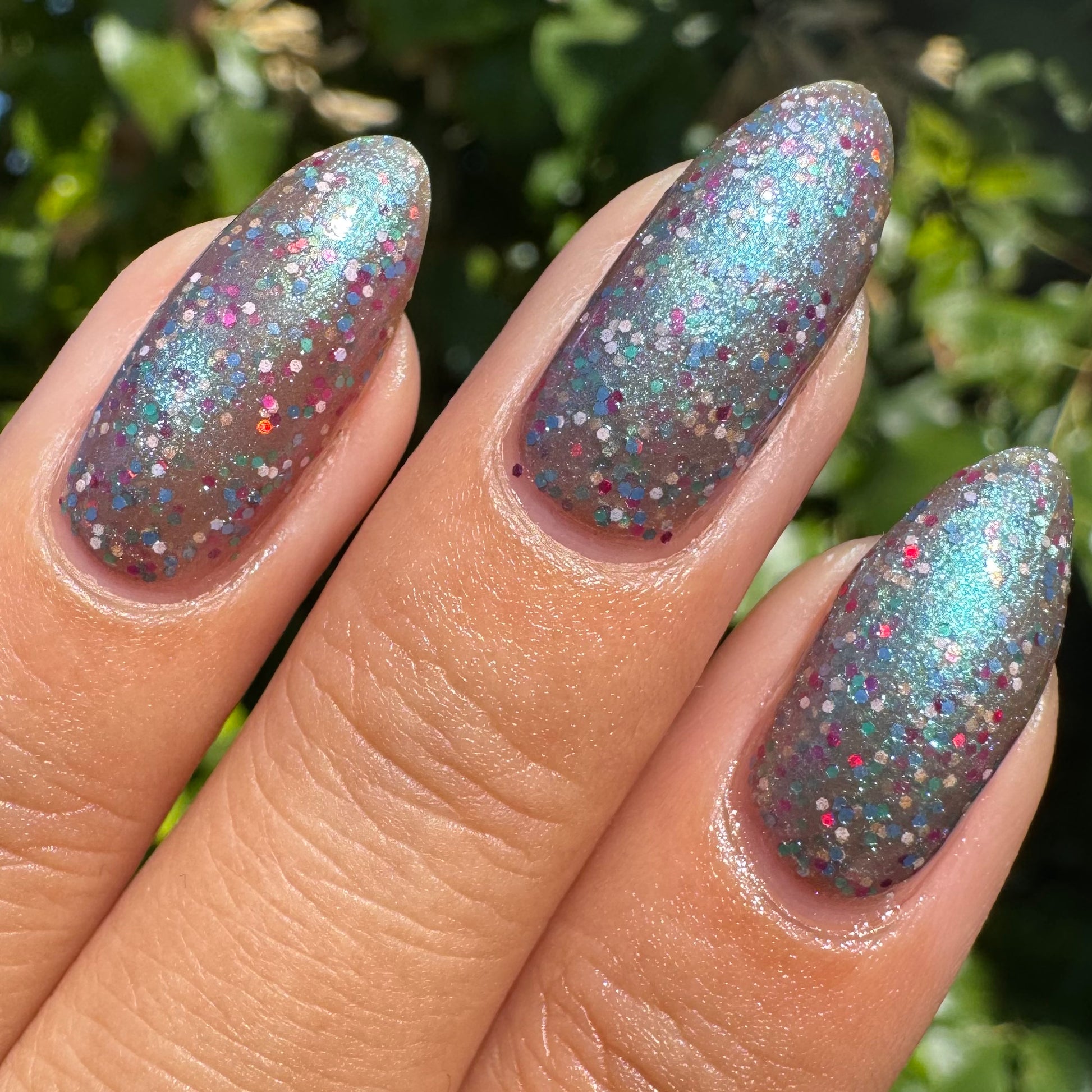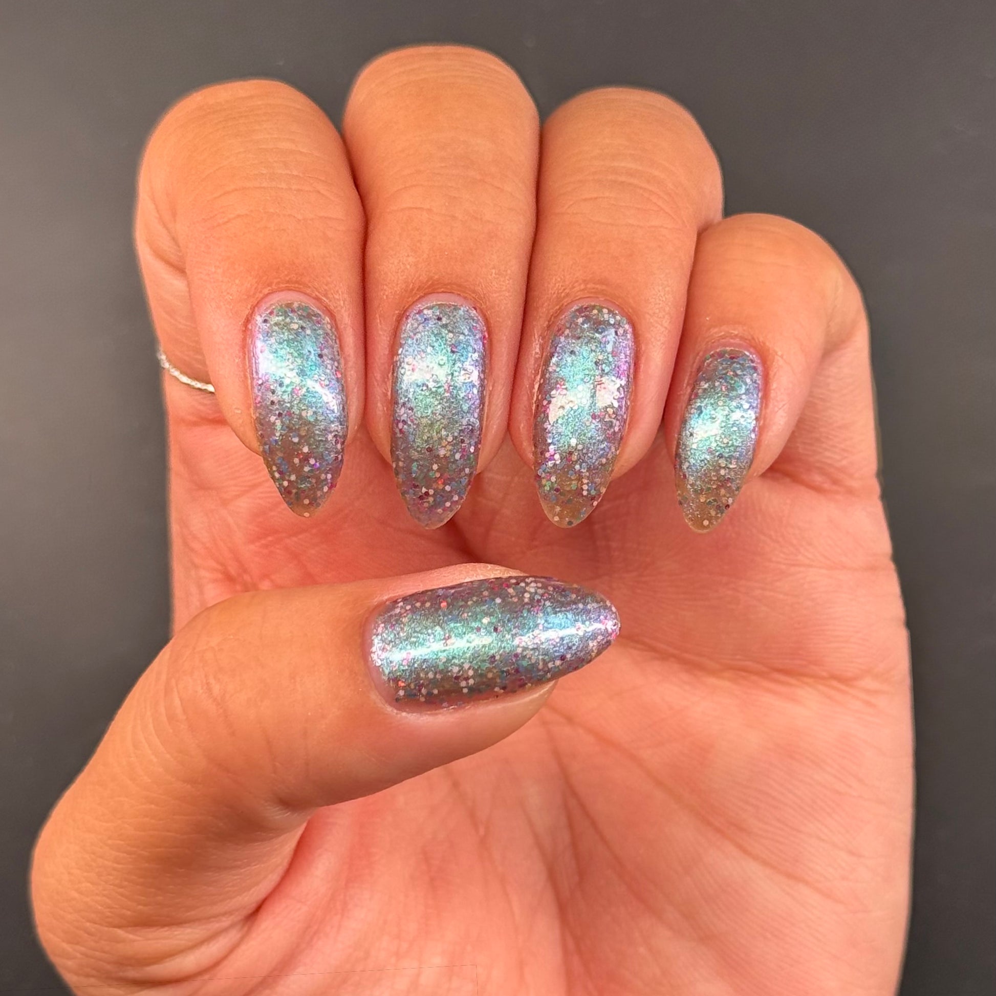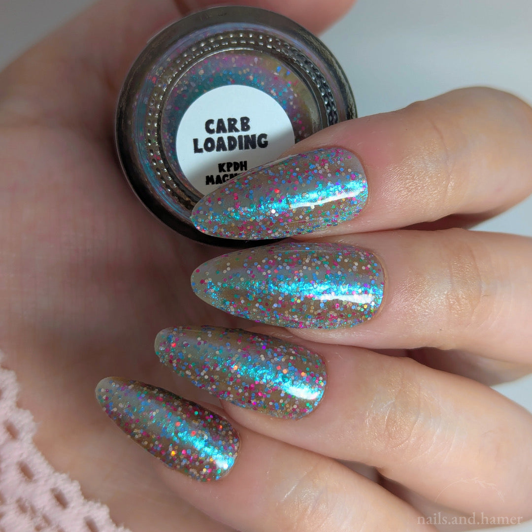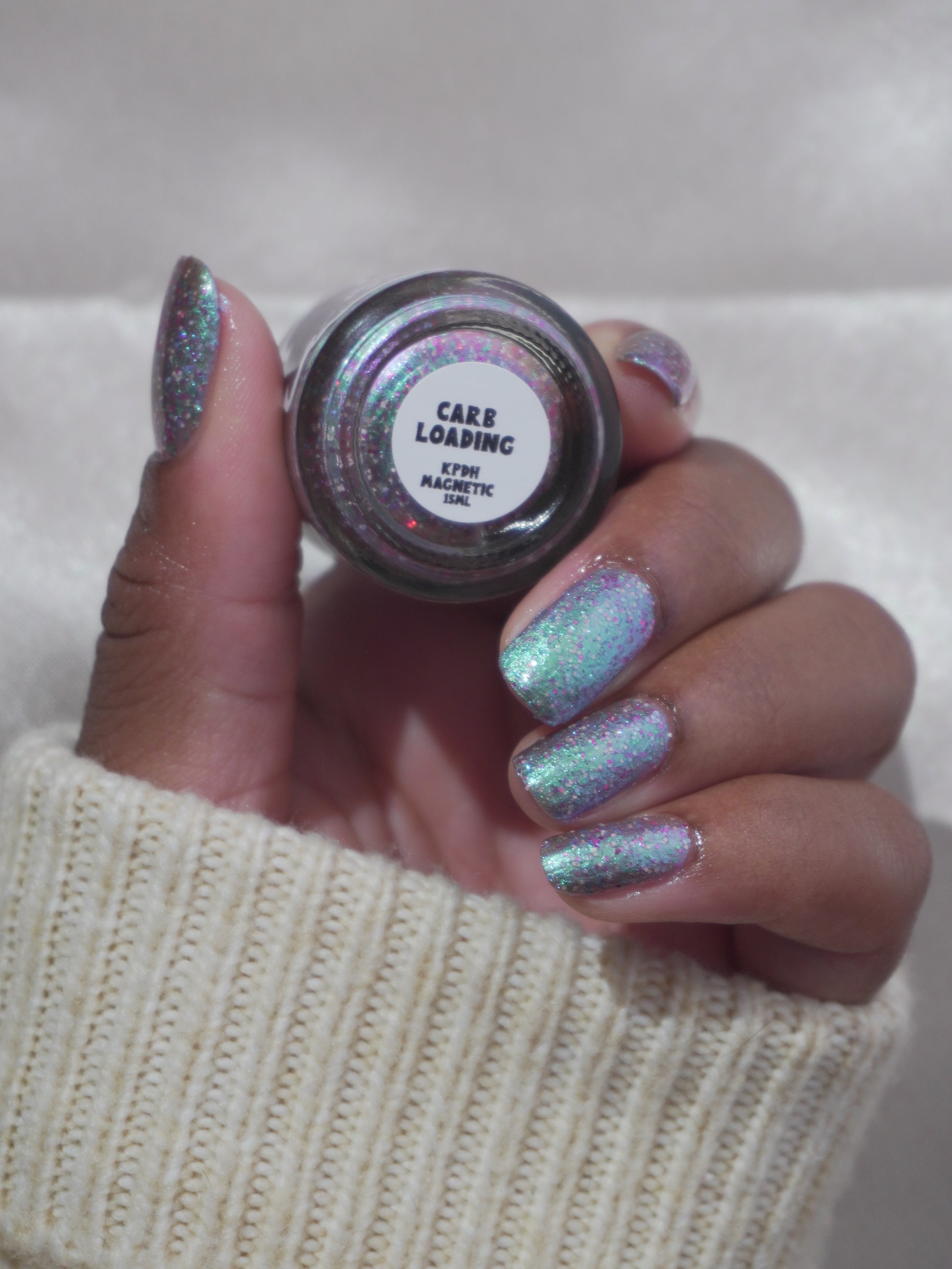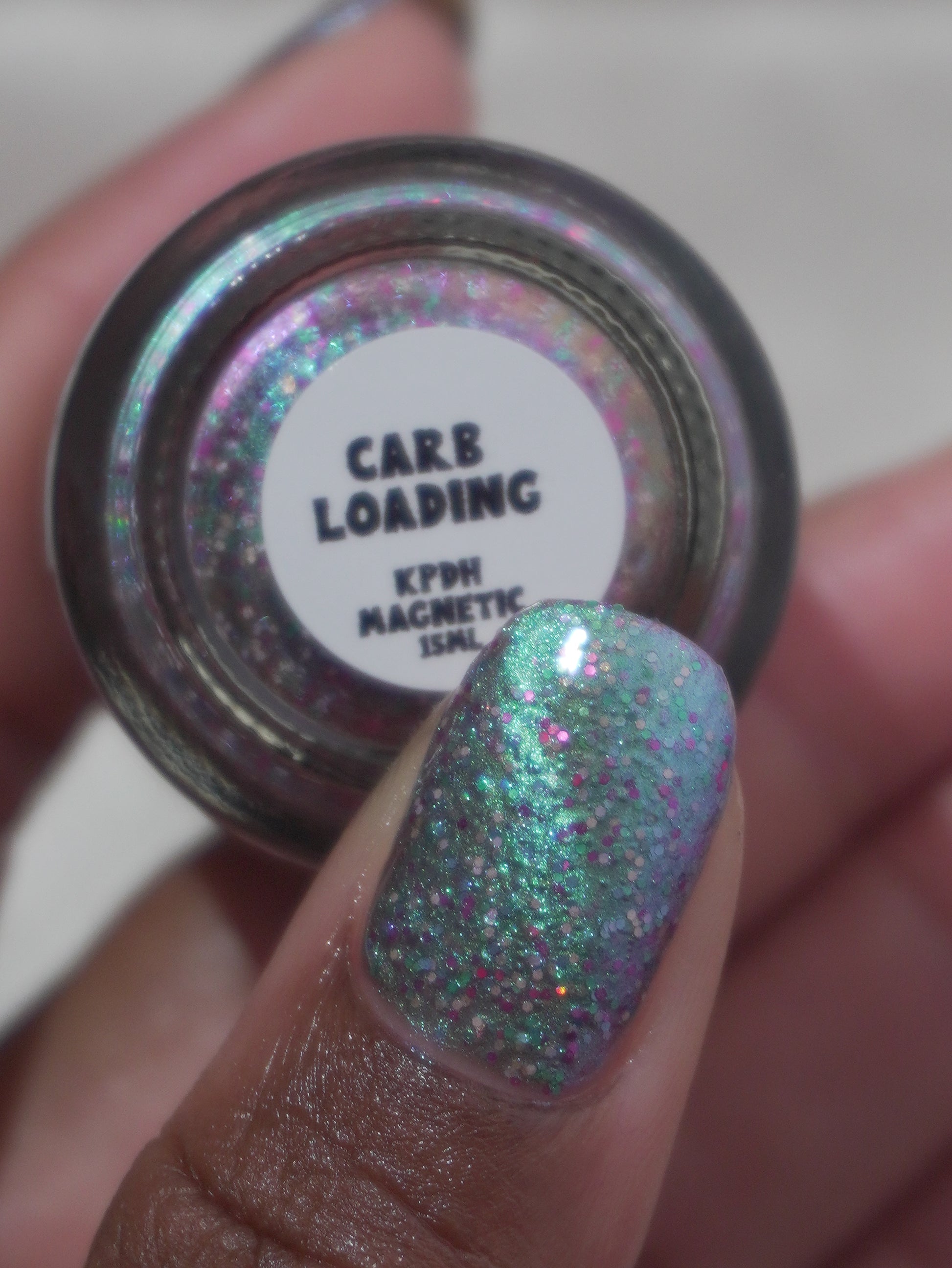 Carb Loading is an olive green aqua purple shift crelly that’s also magnetic! Loaded with green, purple, pink hex glitters and pink holo glitters.