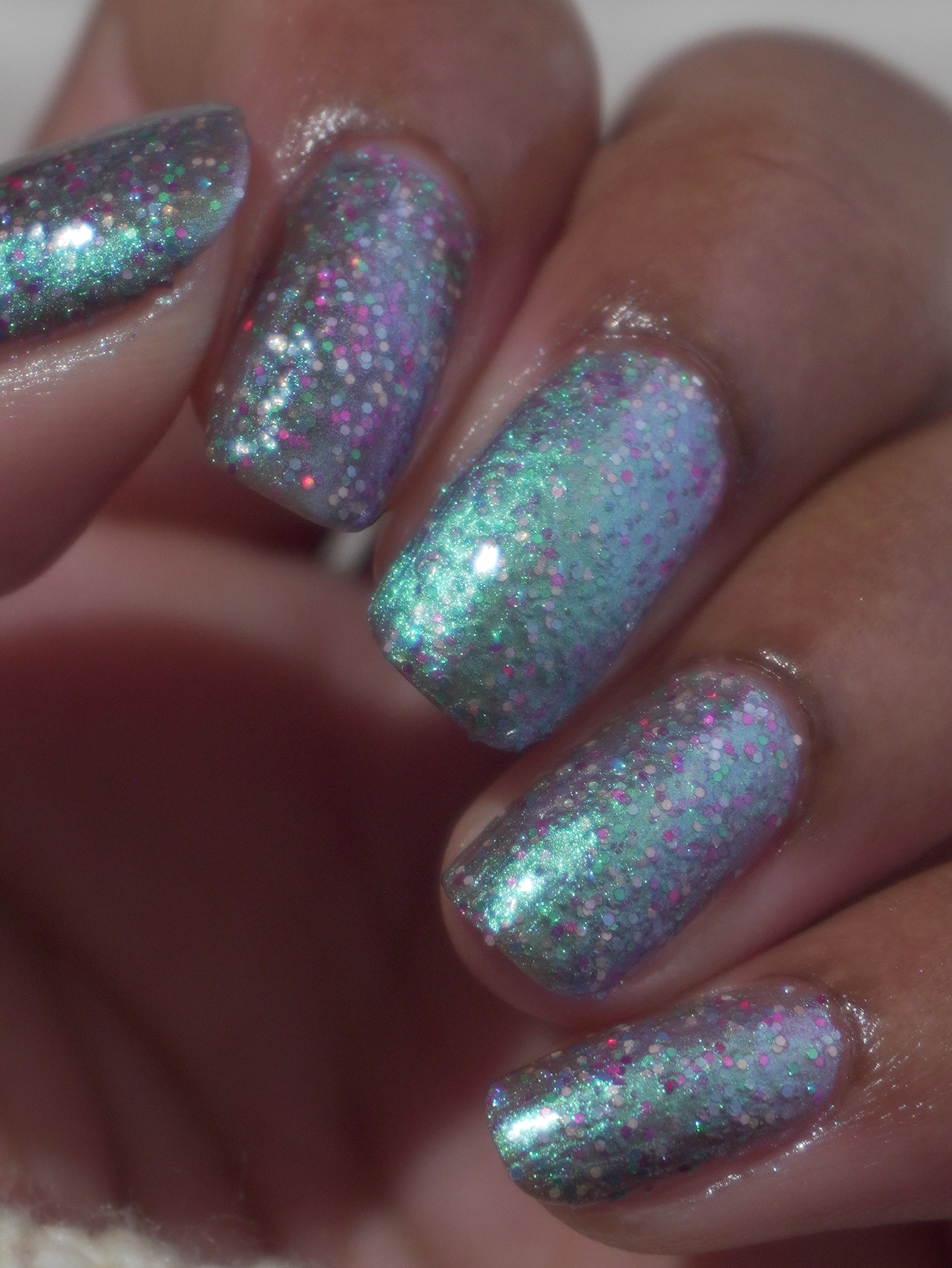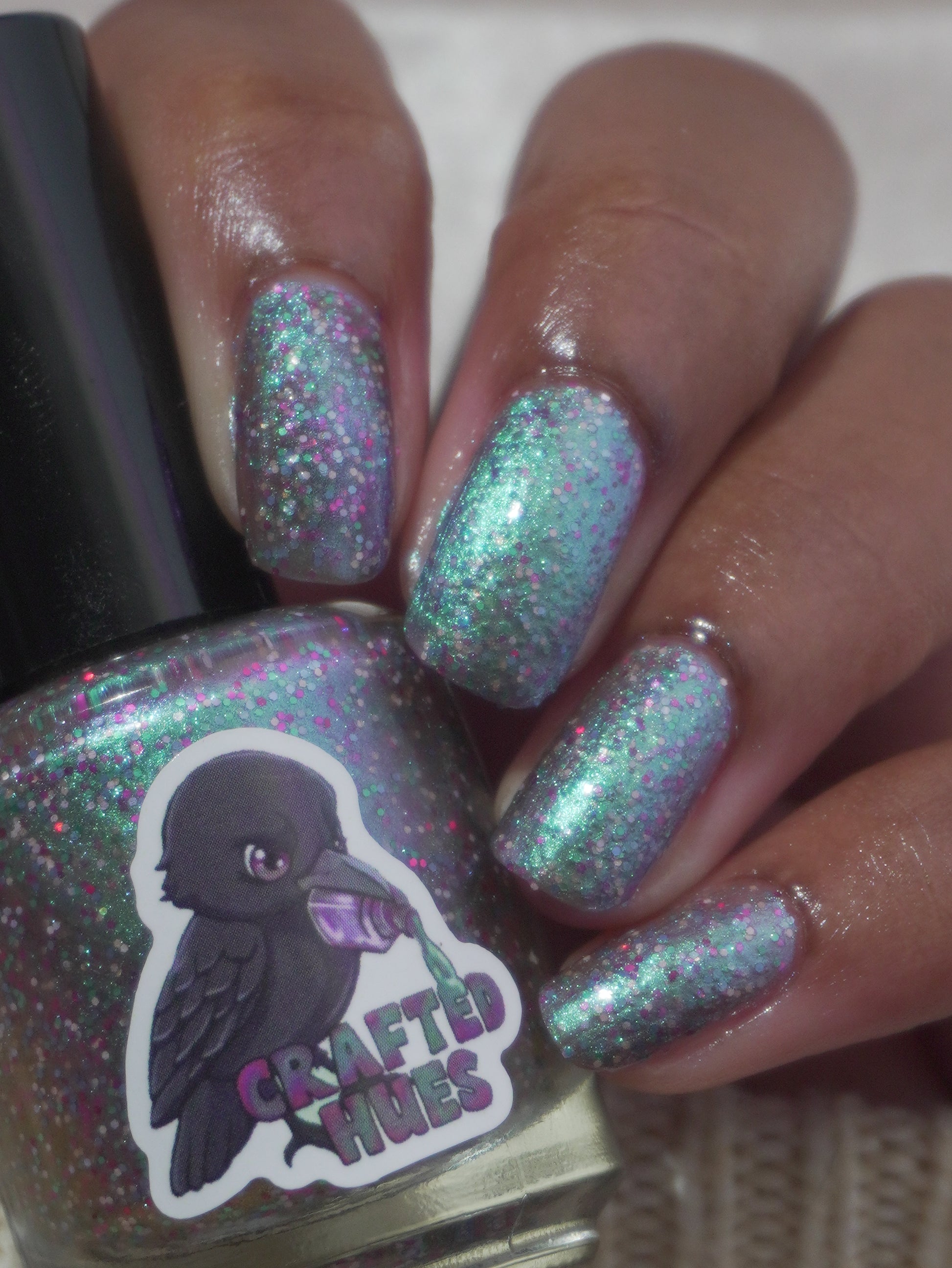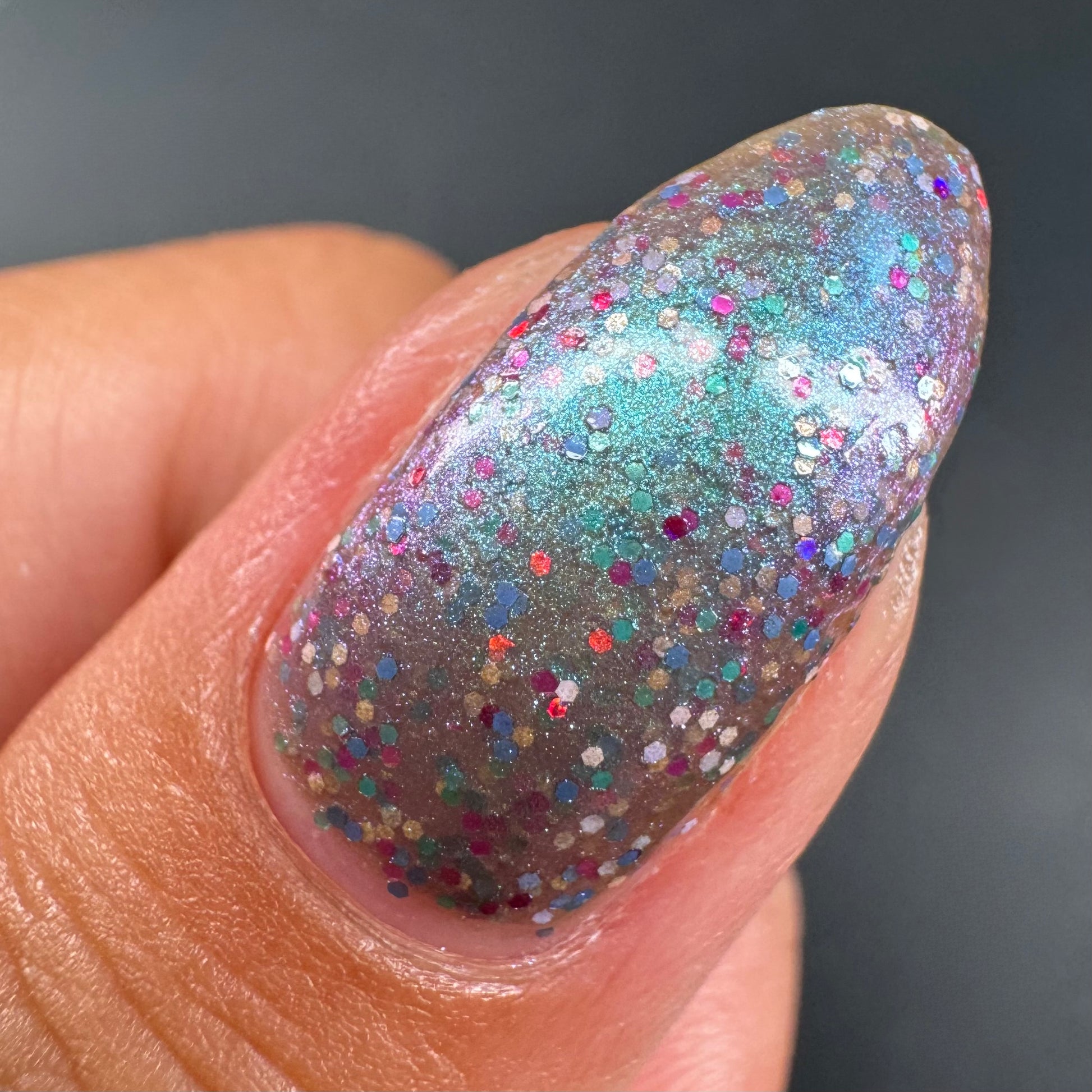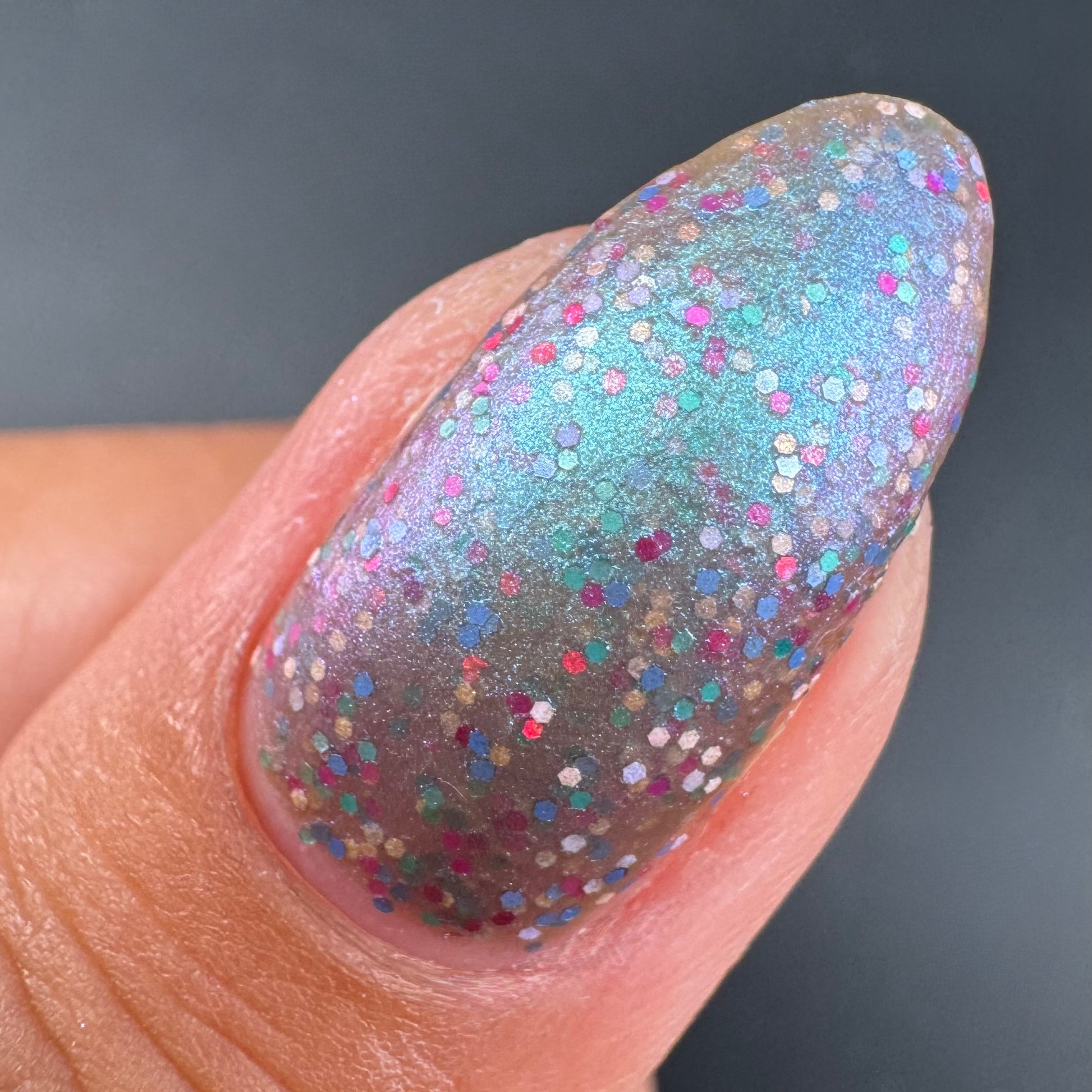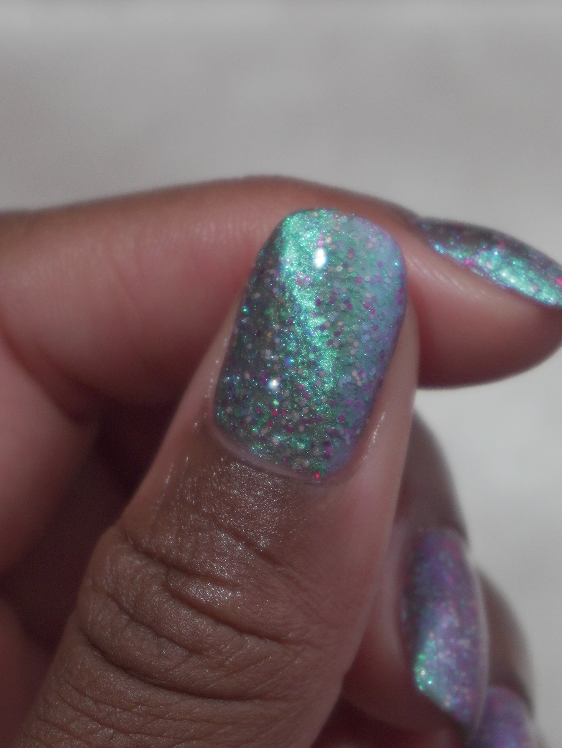 Carb Loading is an olive green aqua purple shift crelly that’s also magnetic! Loaded with green, purple, pink hex glitters and pink holo glitters.