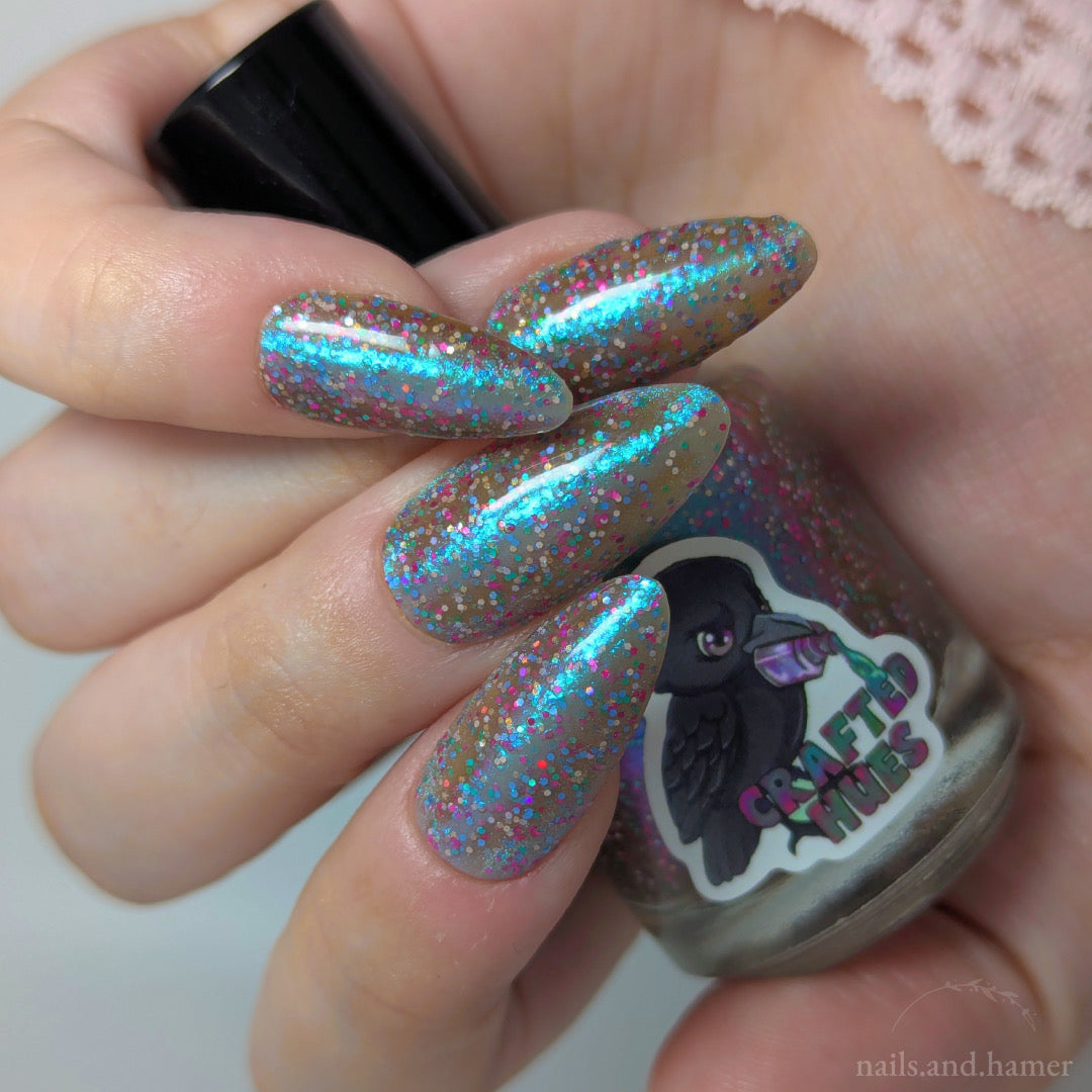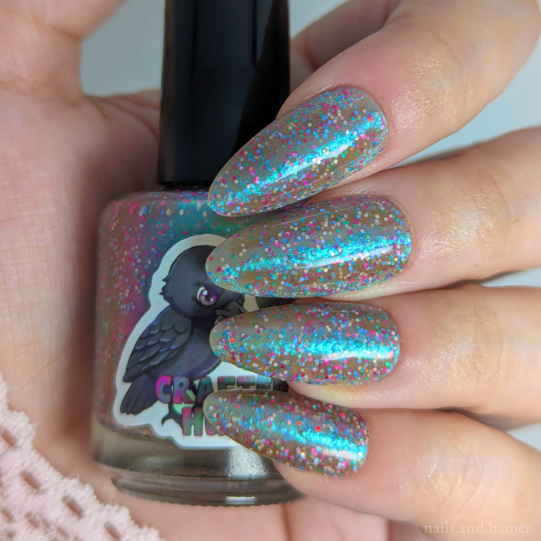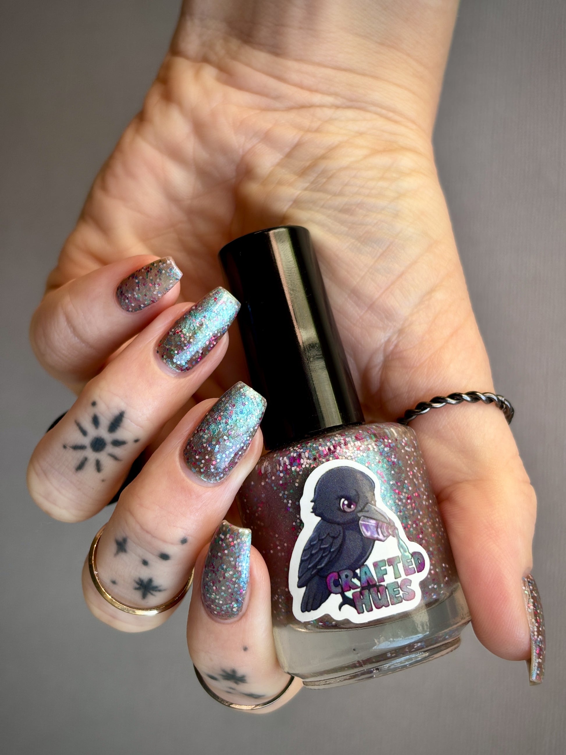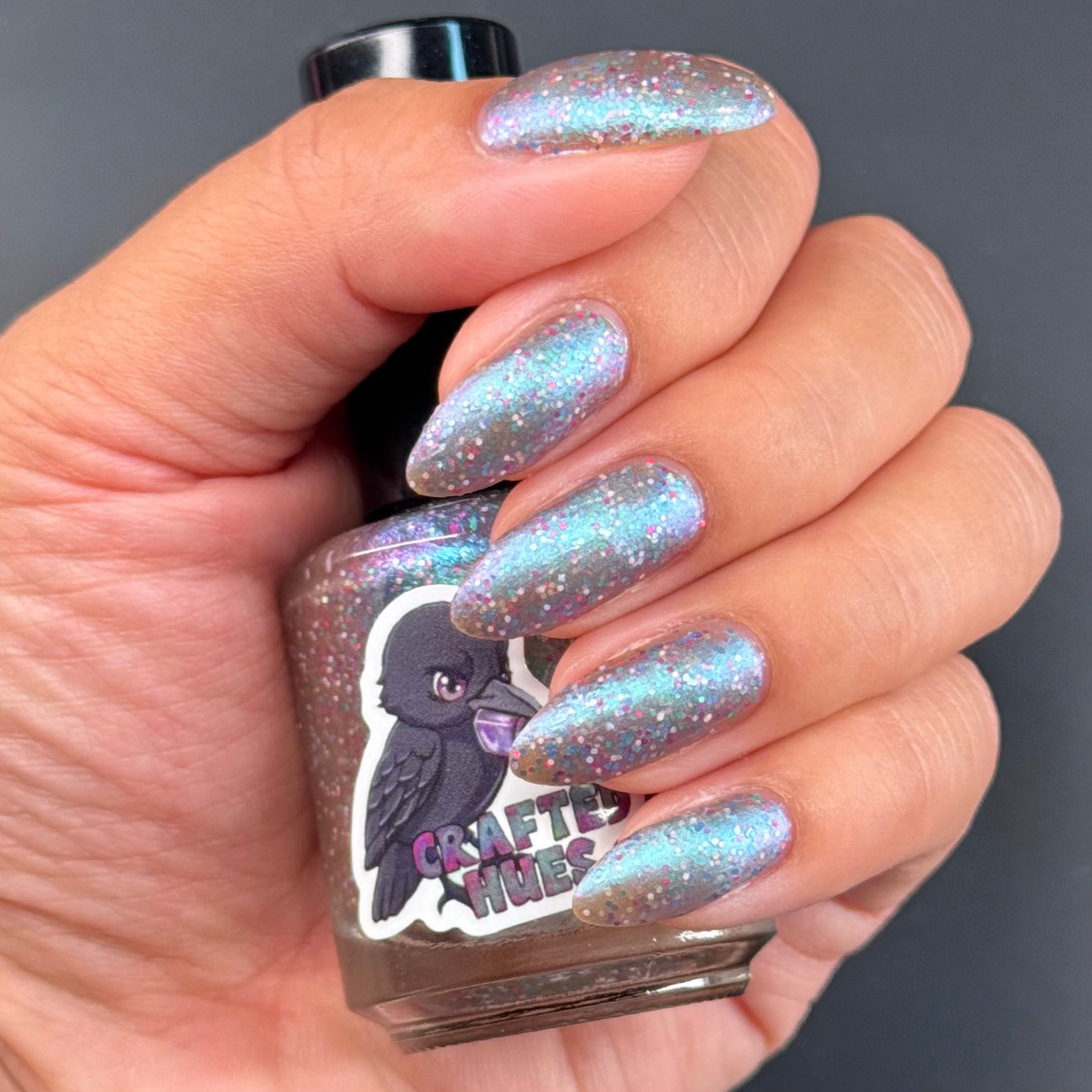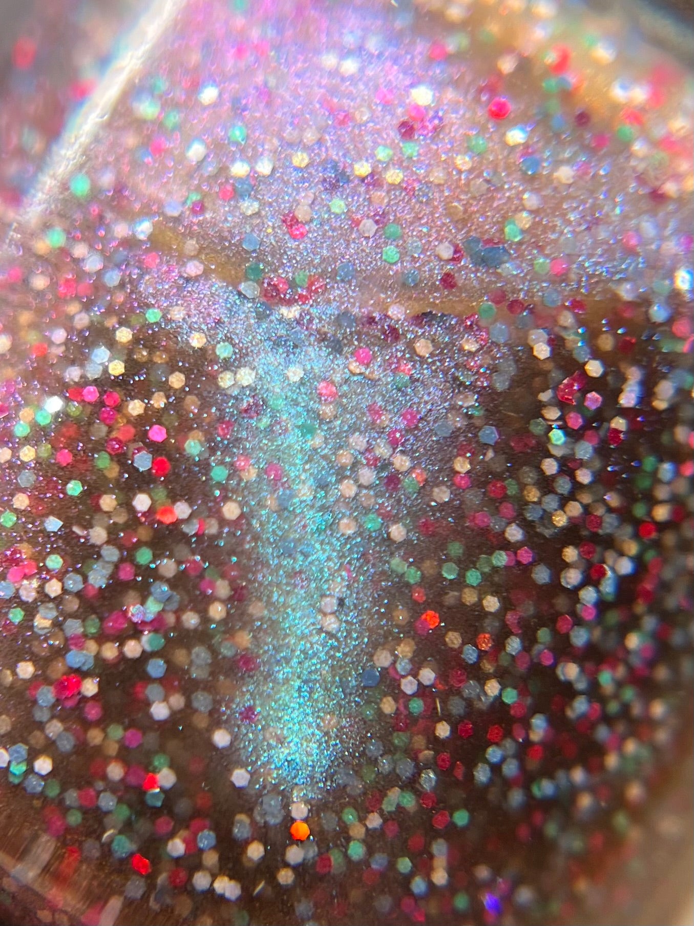 Carb Loading is an olive green aqua purple shift crelly that’s also magnetic! Loaded with green, purple, pink hex glitters and pink holo glitters.