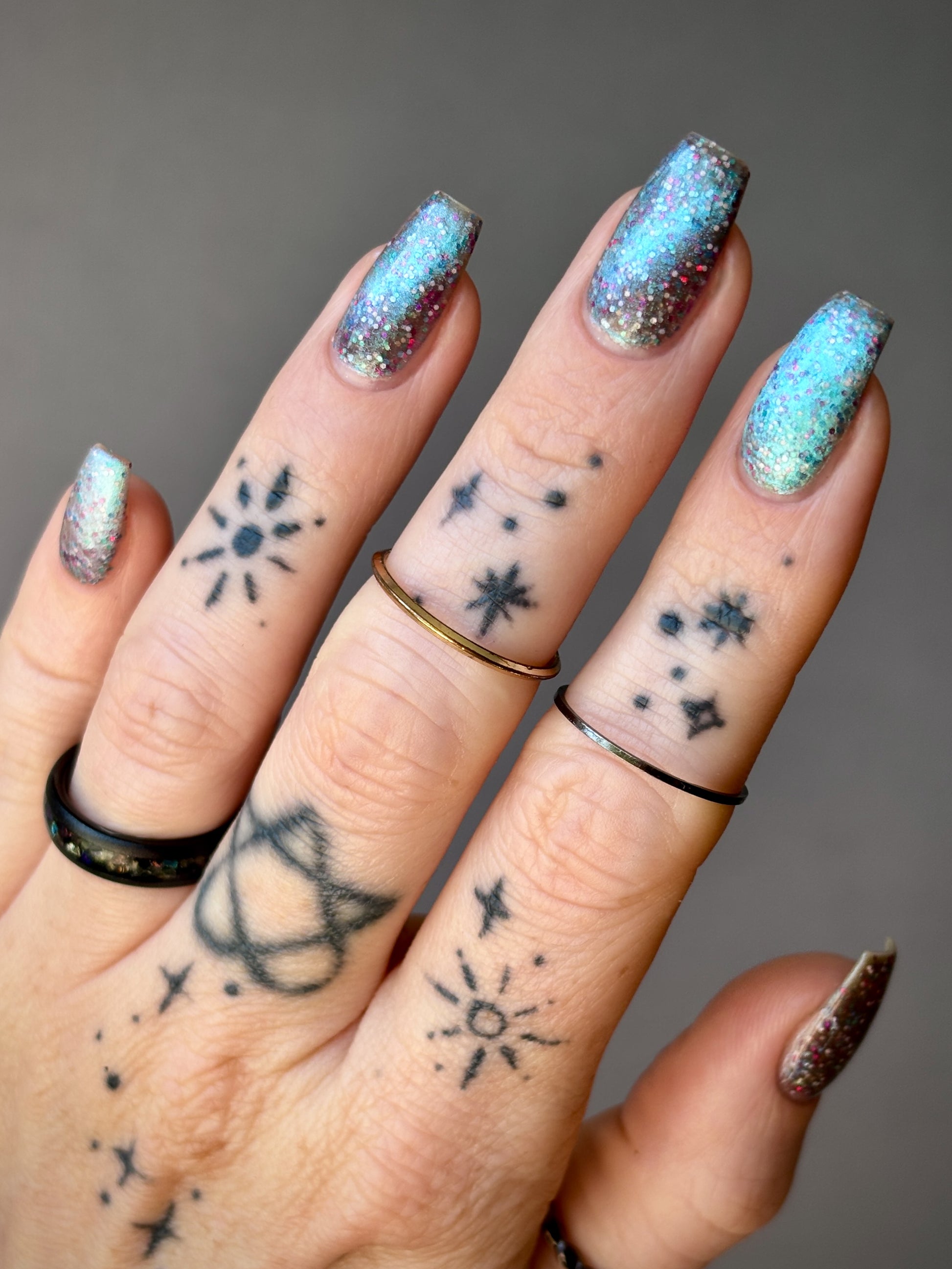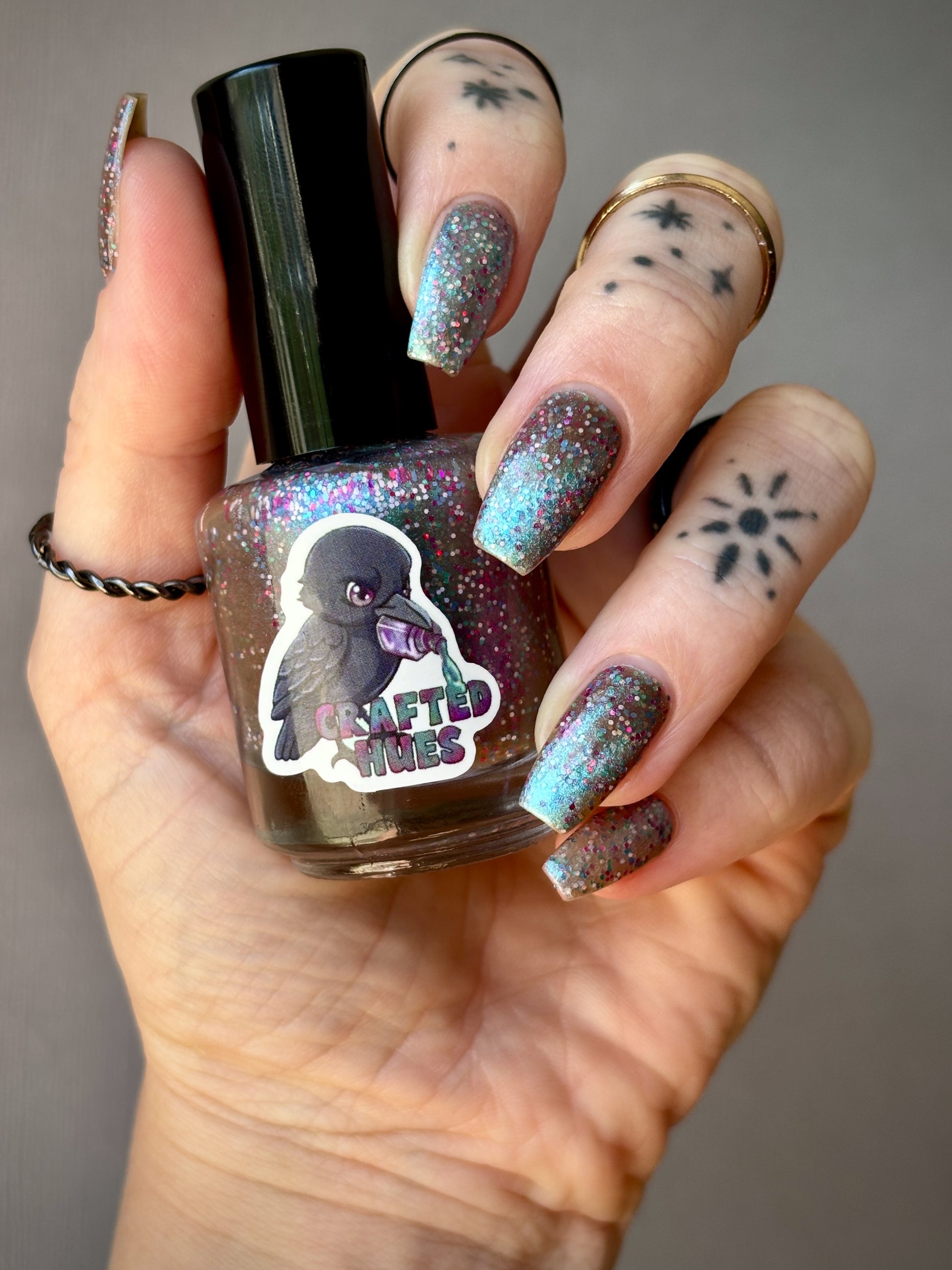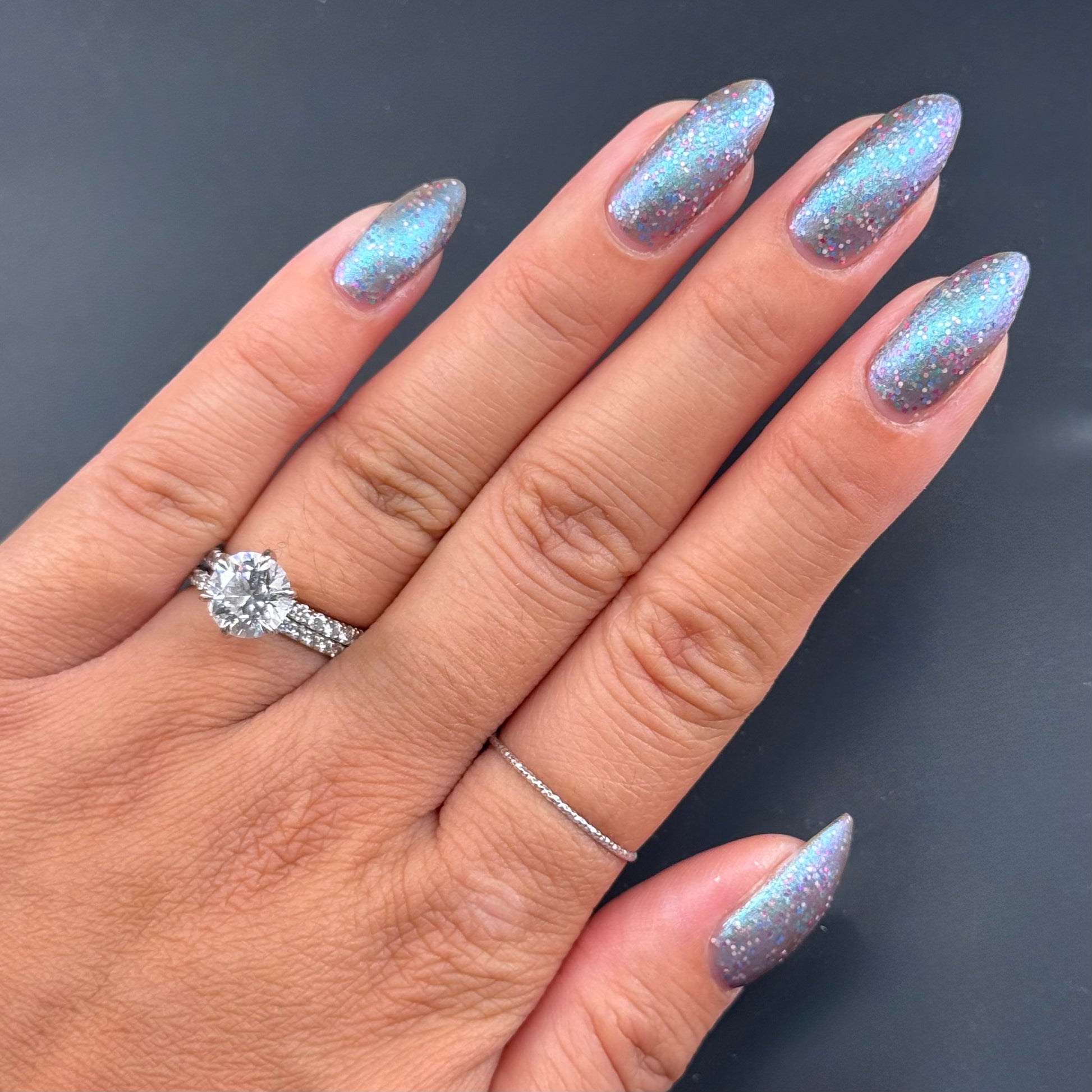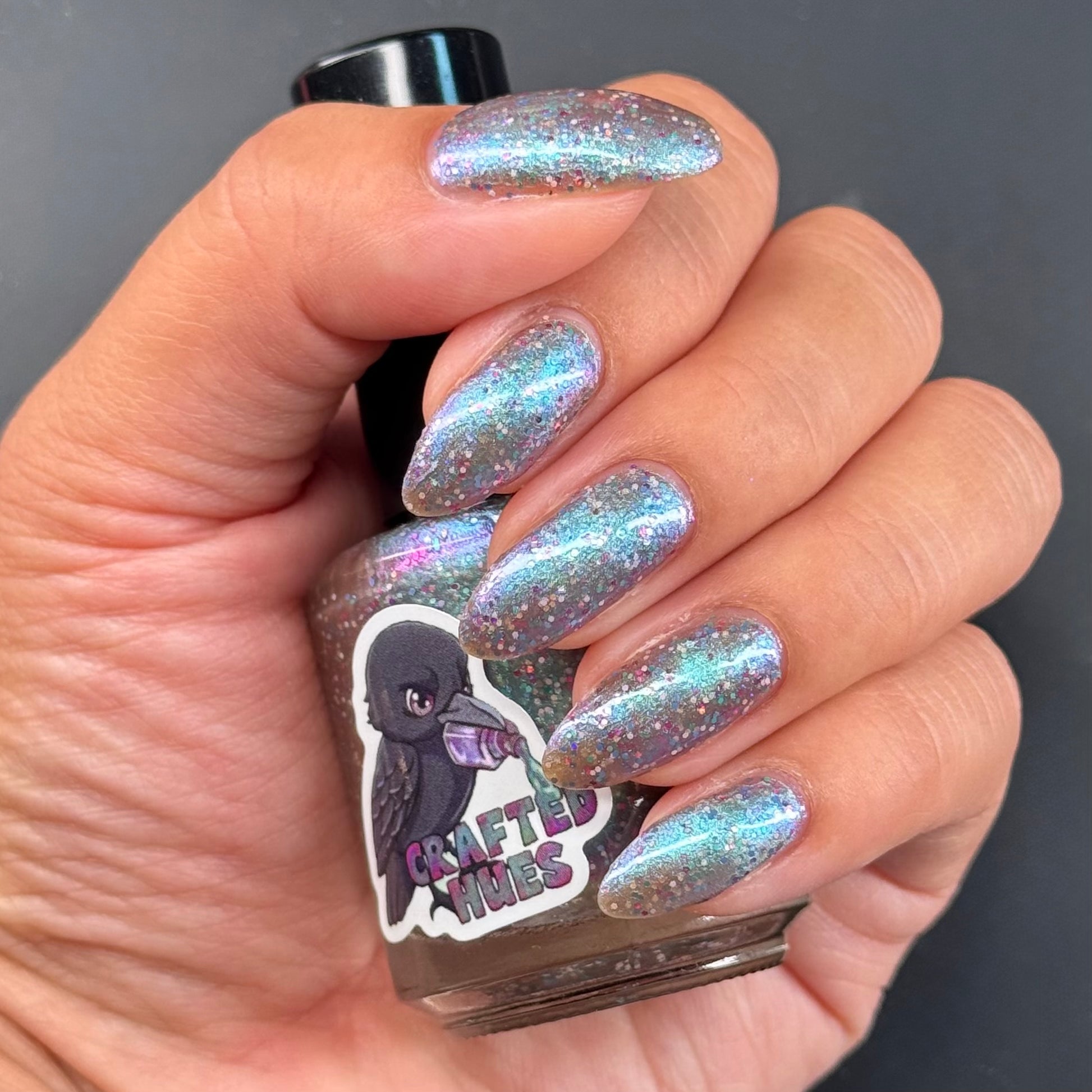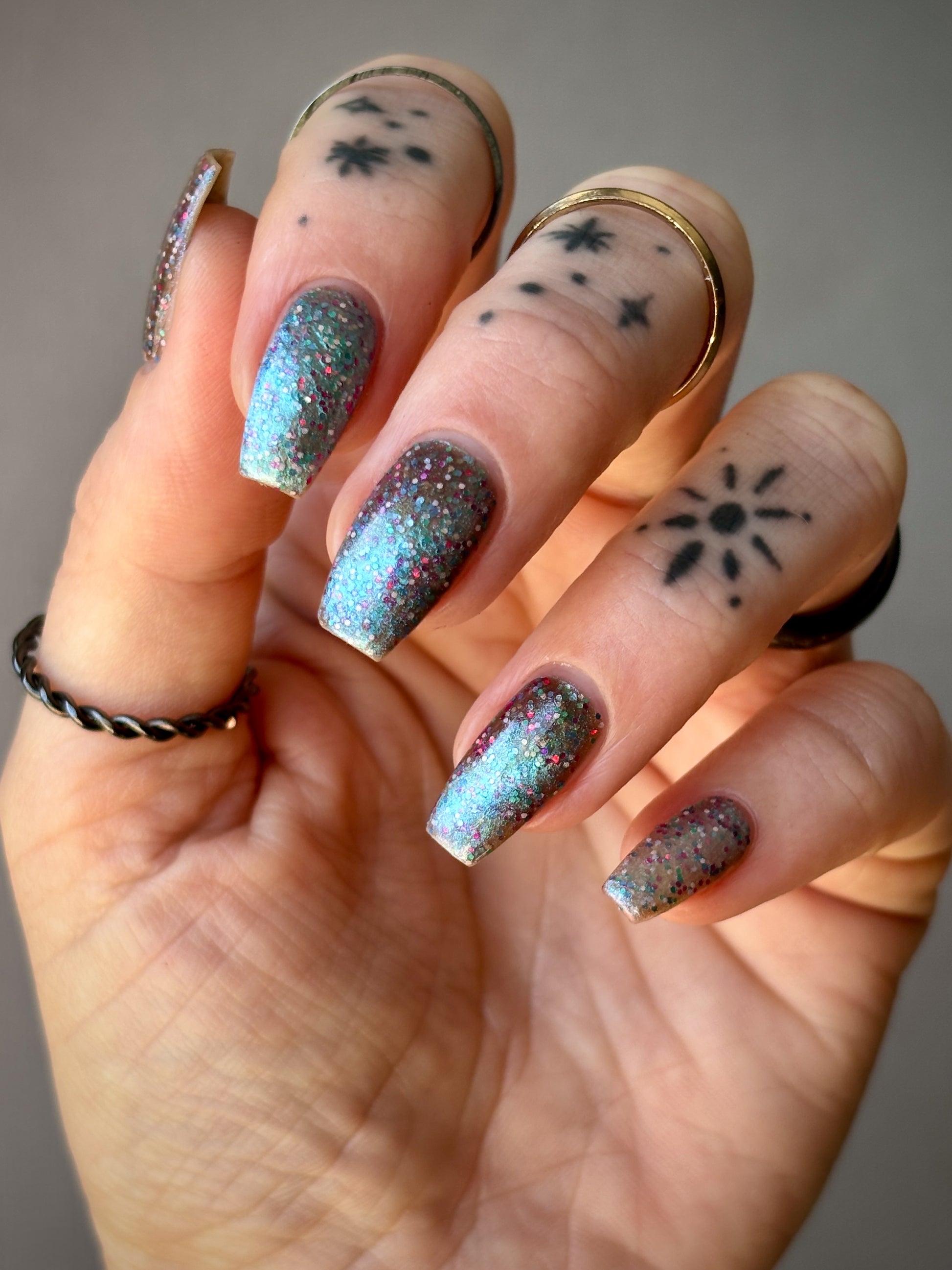 Carb Loading is an olive green aqua purple shift crelly that’s also magnetic! Loaded with green, purple, pink hex glitters and pink holo glitters.