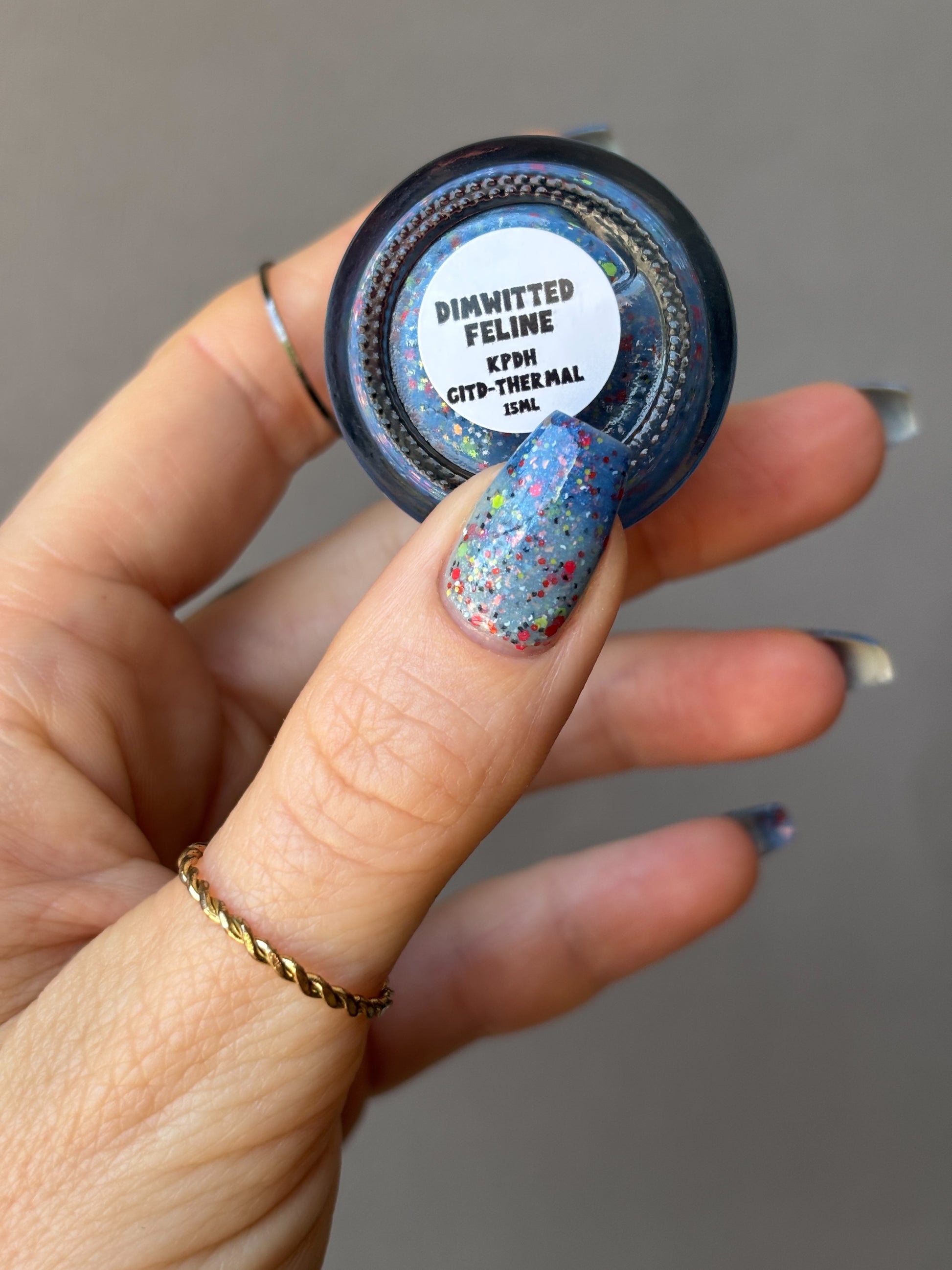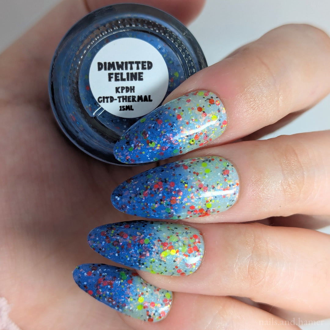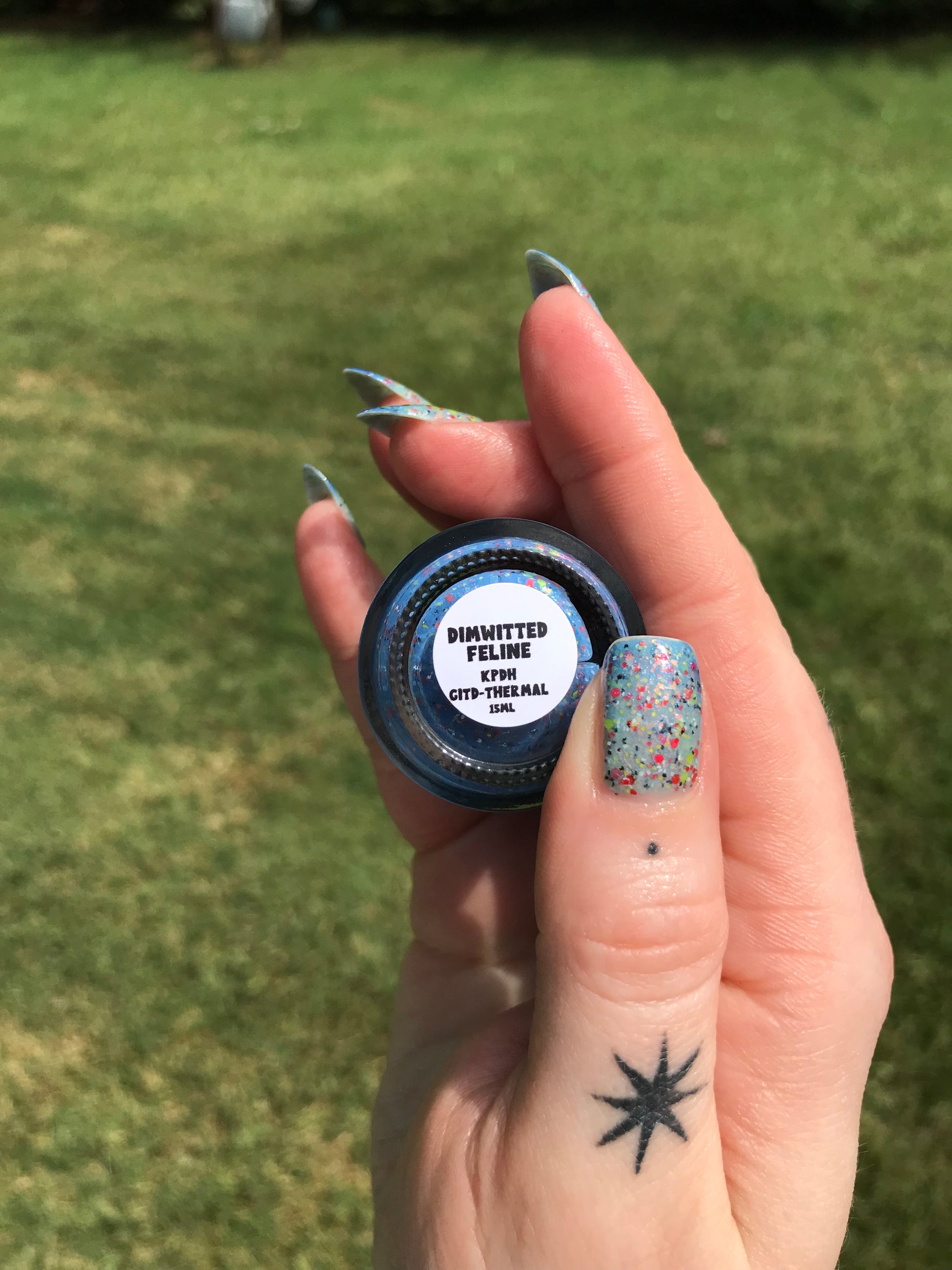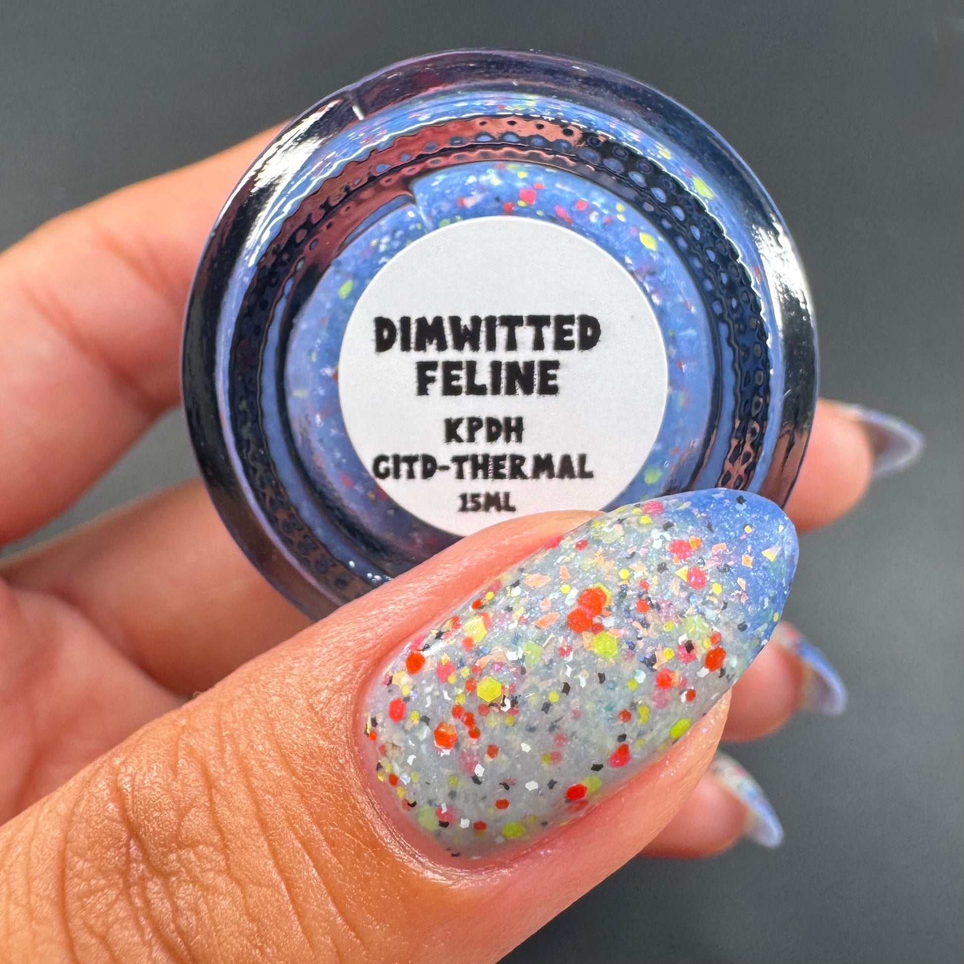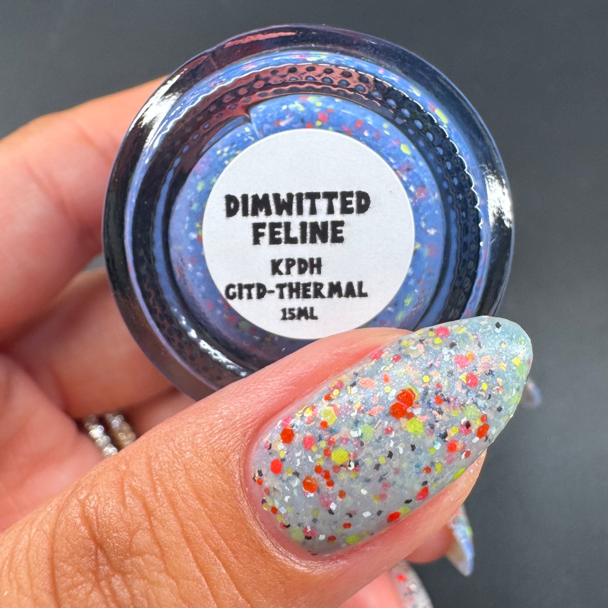 Dimwitted Feline is a glow in the dark thermal crelly with orange copper shifty flakes, red, green hex glitters and black micro flakes.