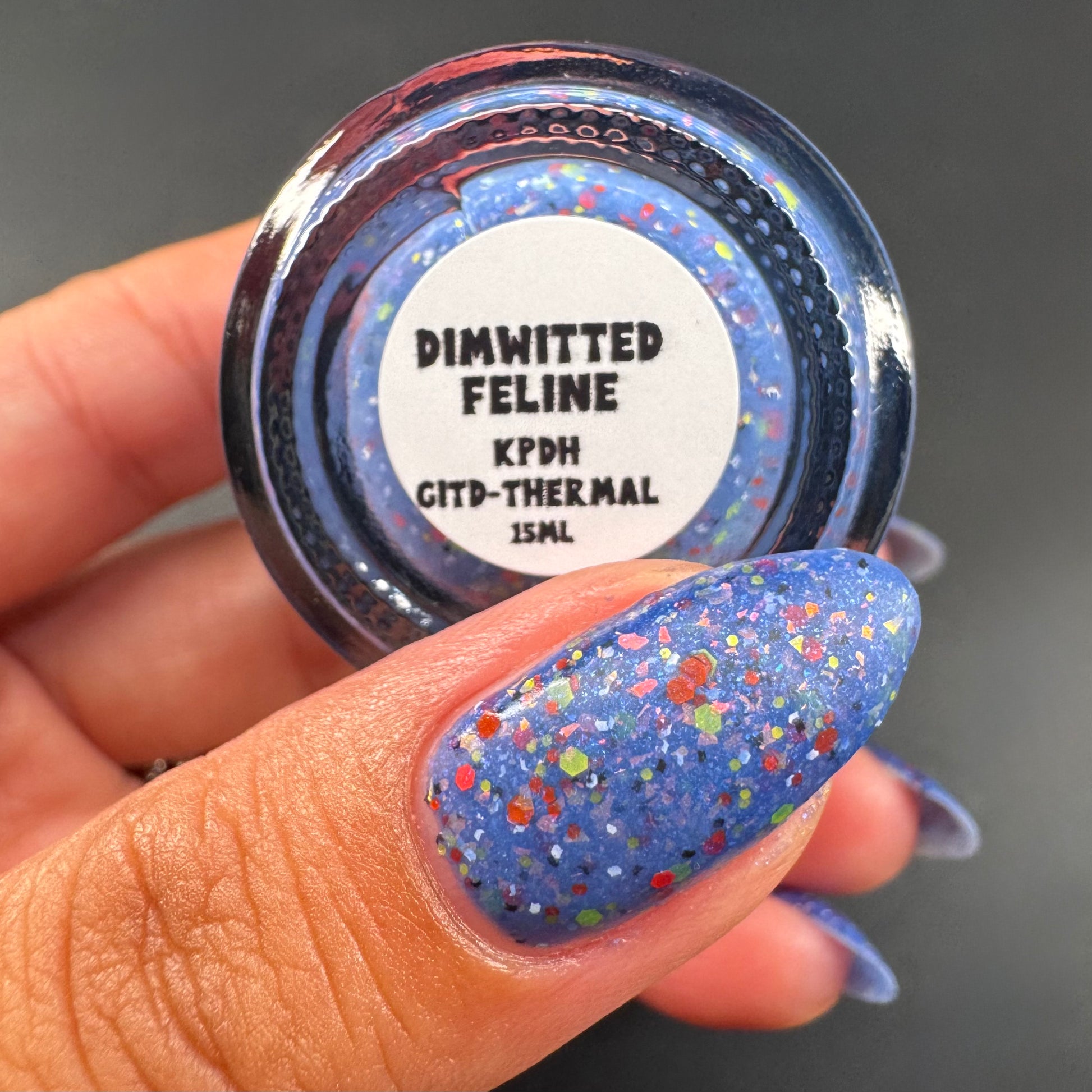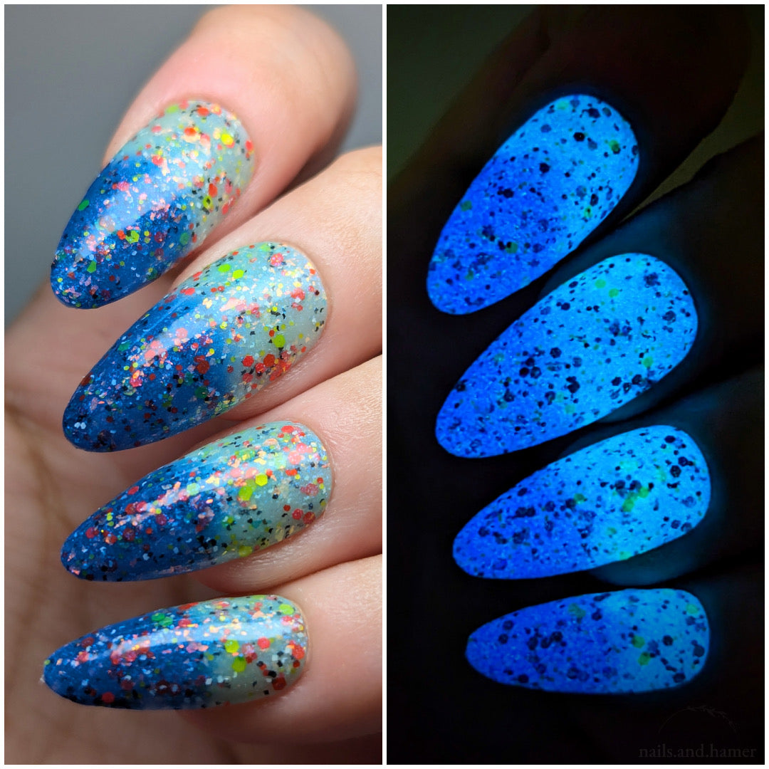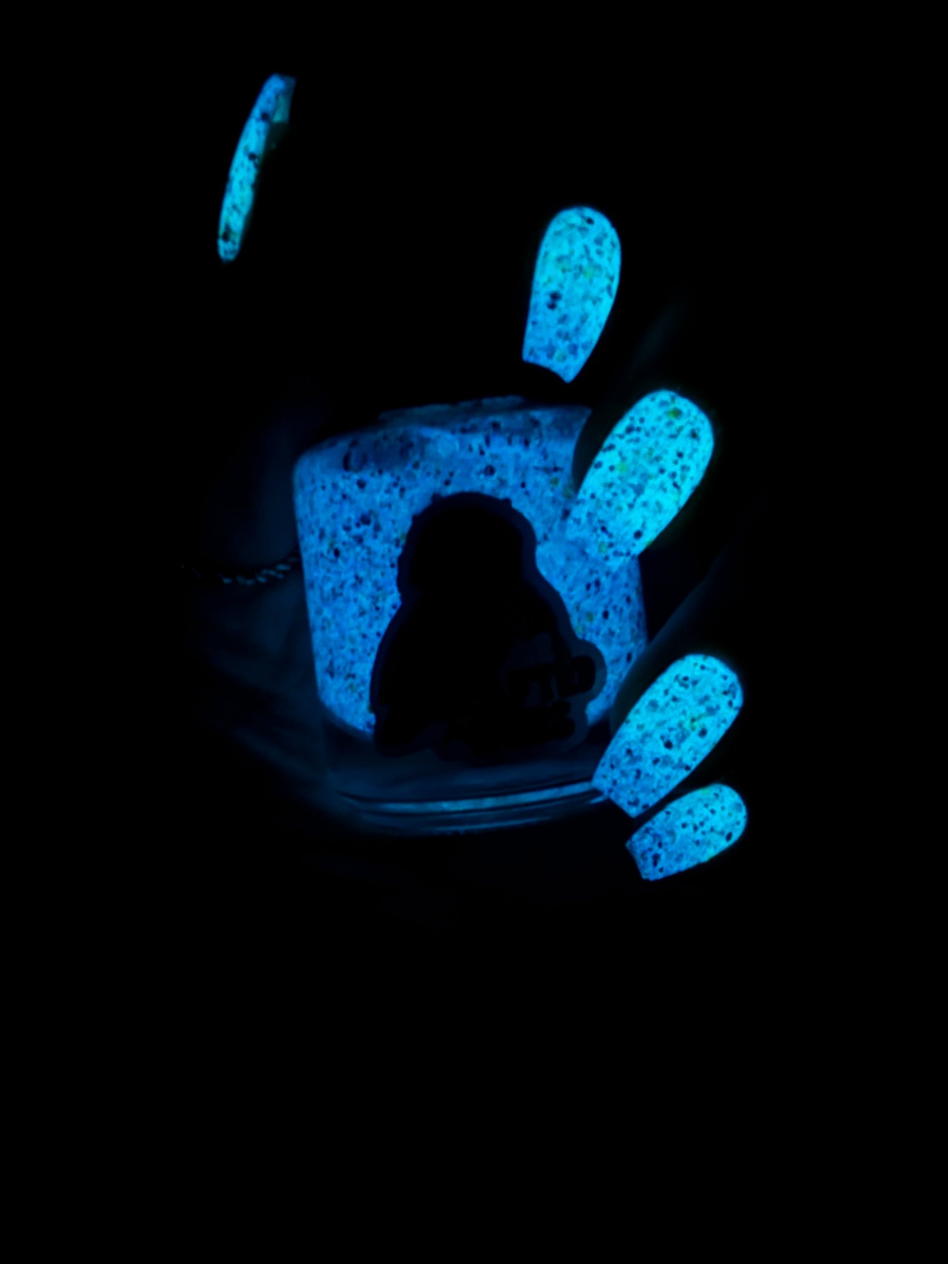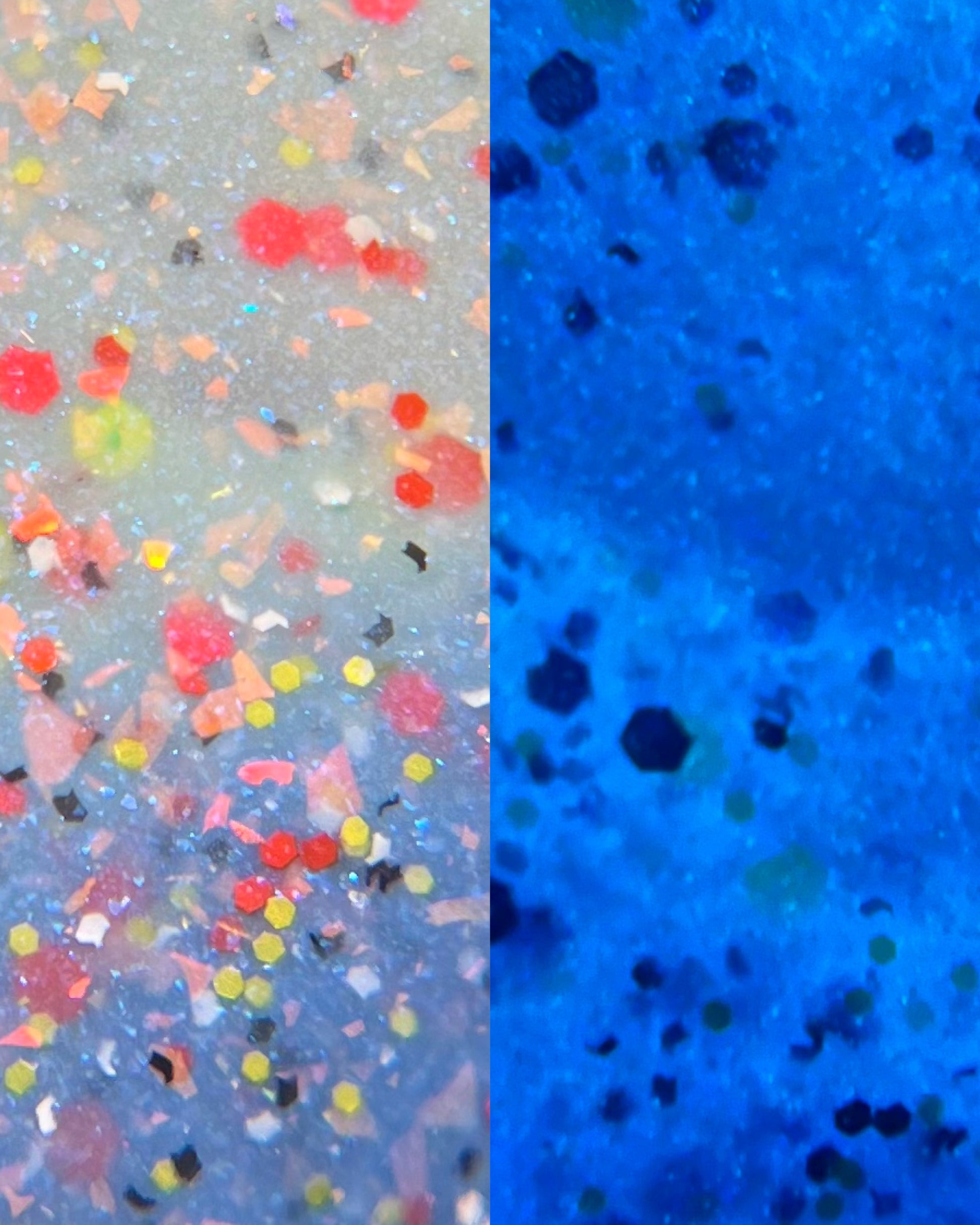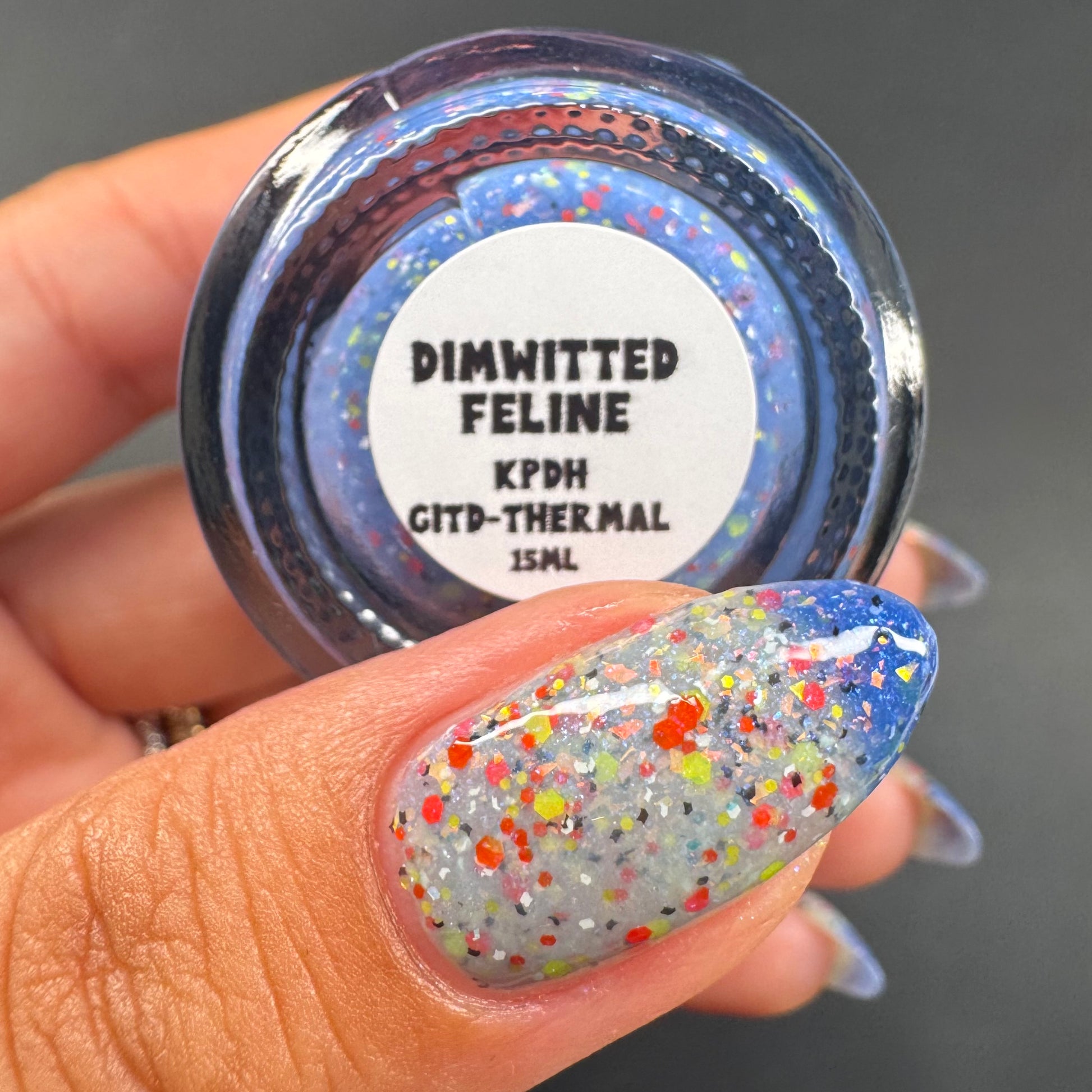 Dimwitted Feline is a glow in the dark thermal crelly with orange copper shifty flakes, red, green hex glitters and black micro flakes.