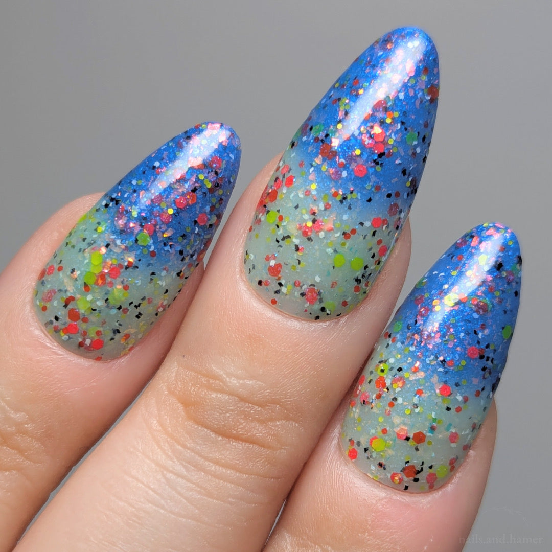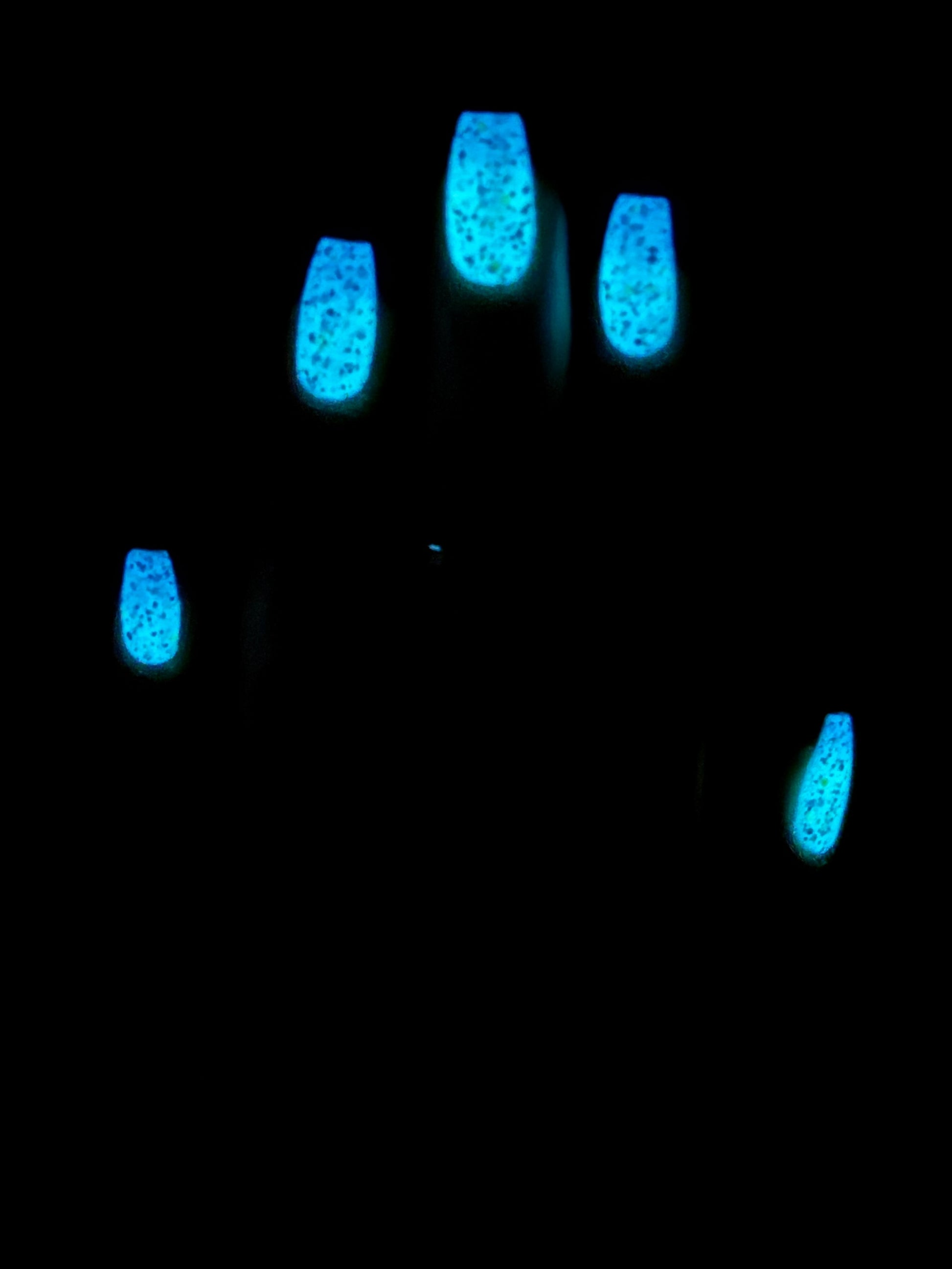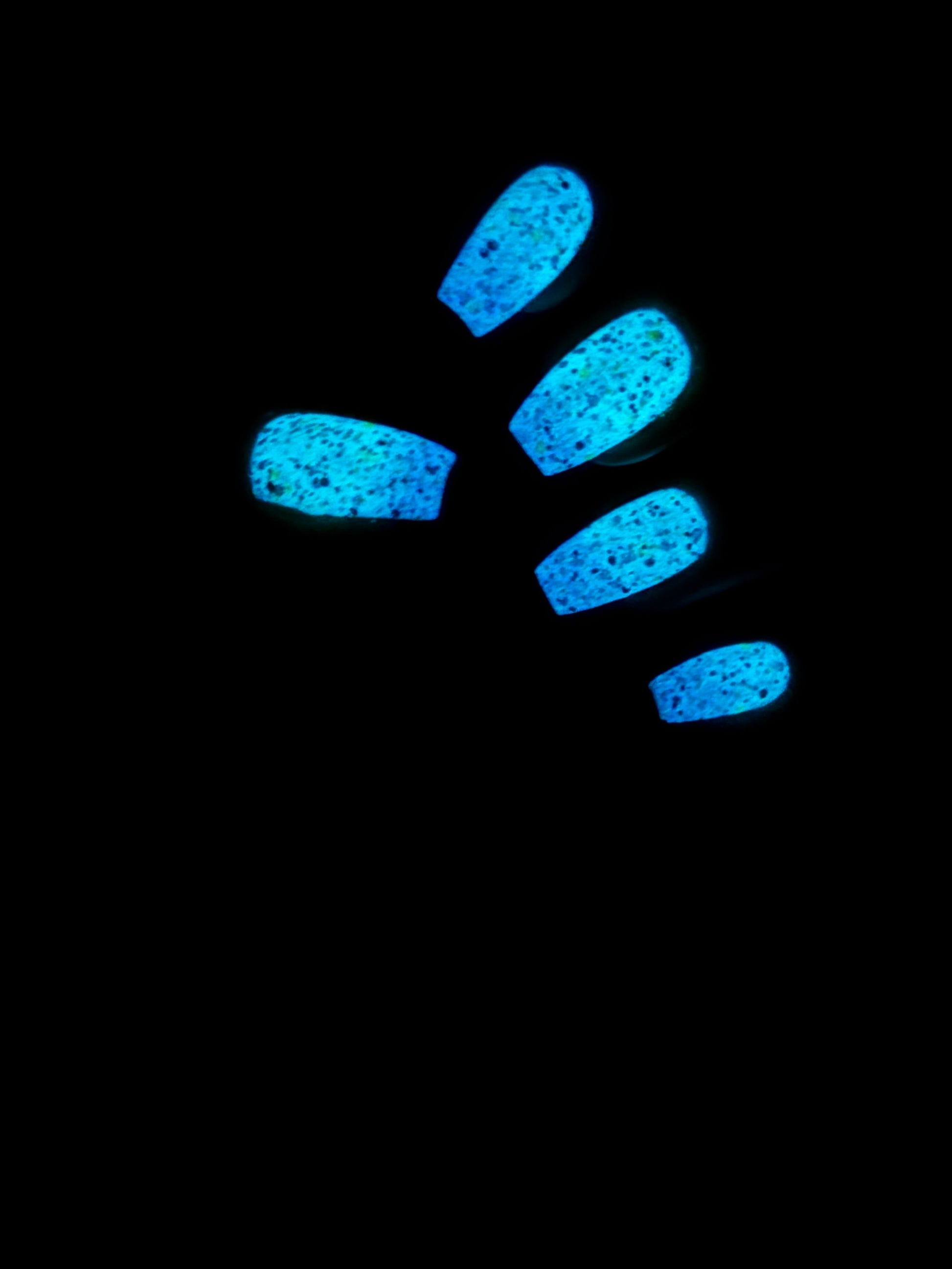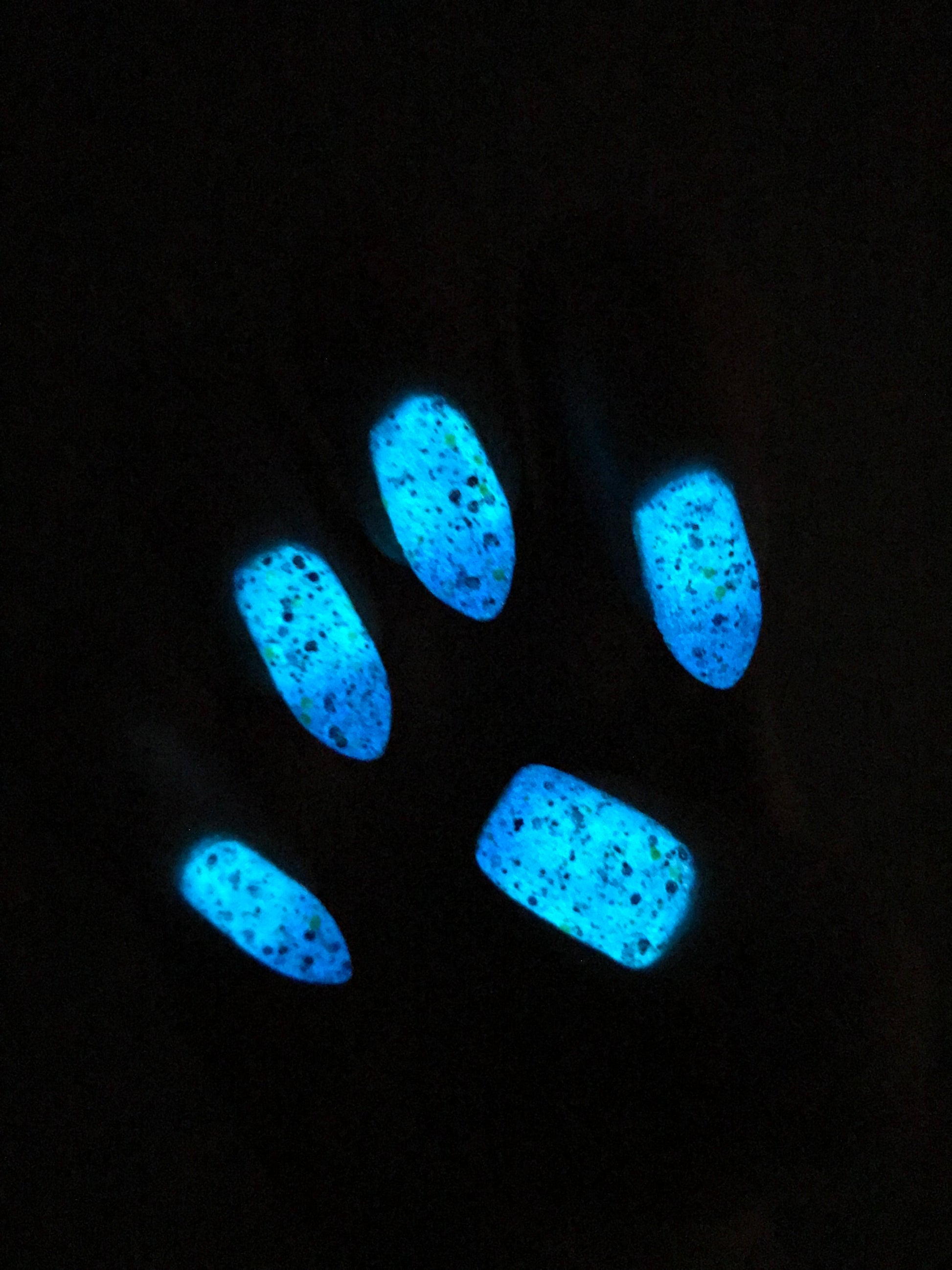 Dimwitted Feline is a glow in the dark thermal crelly with orange copper shifty flakes, red, green hex glitters and black micro flakes.