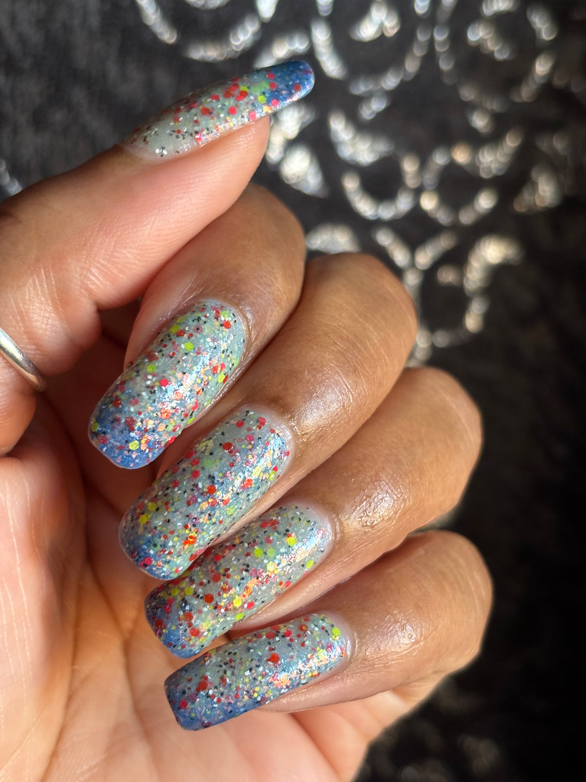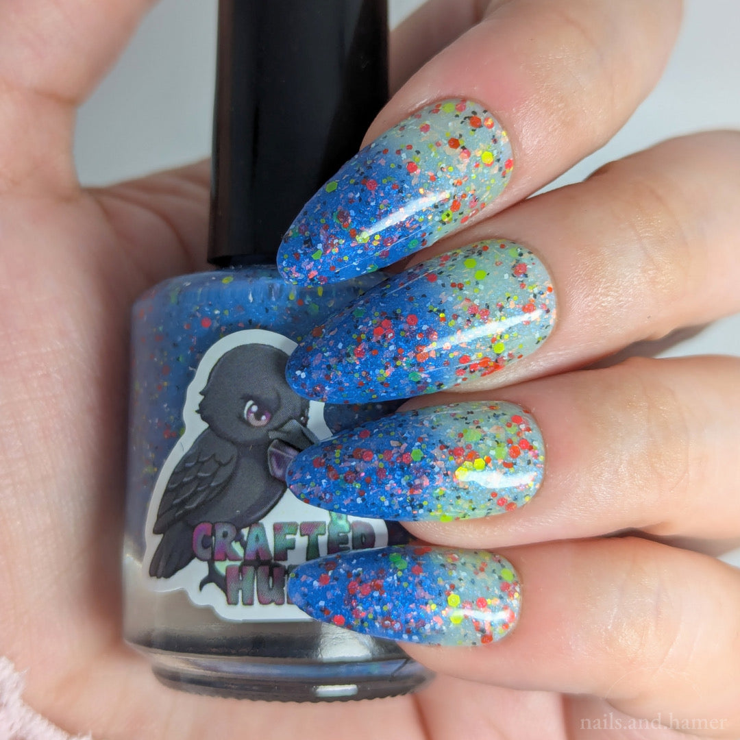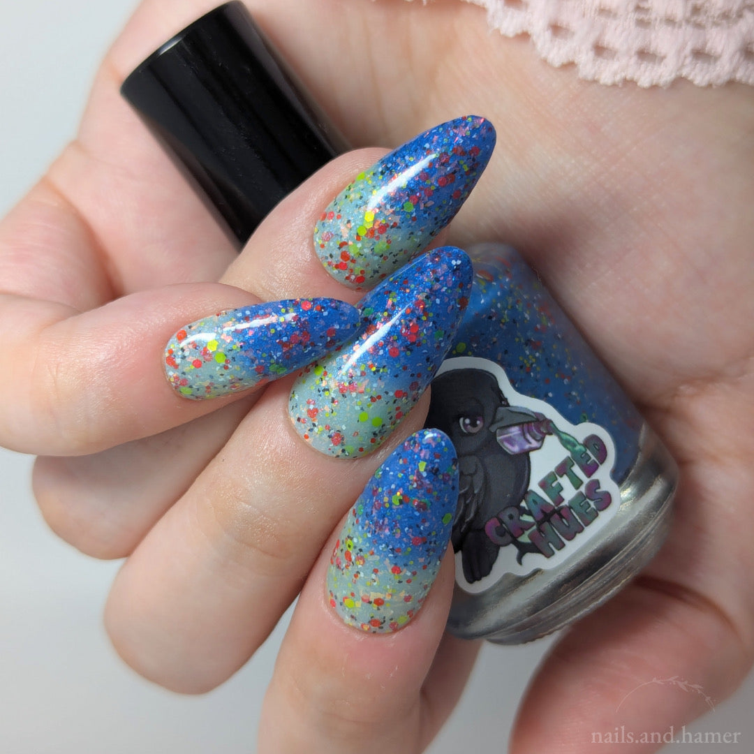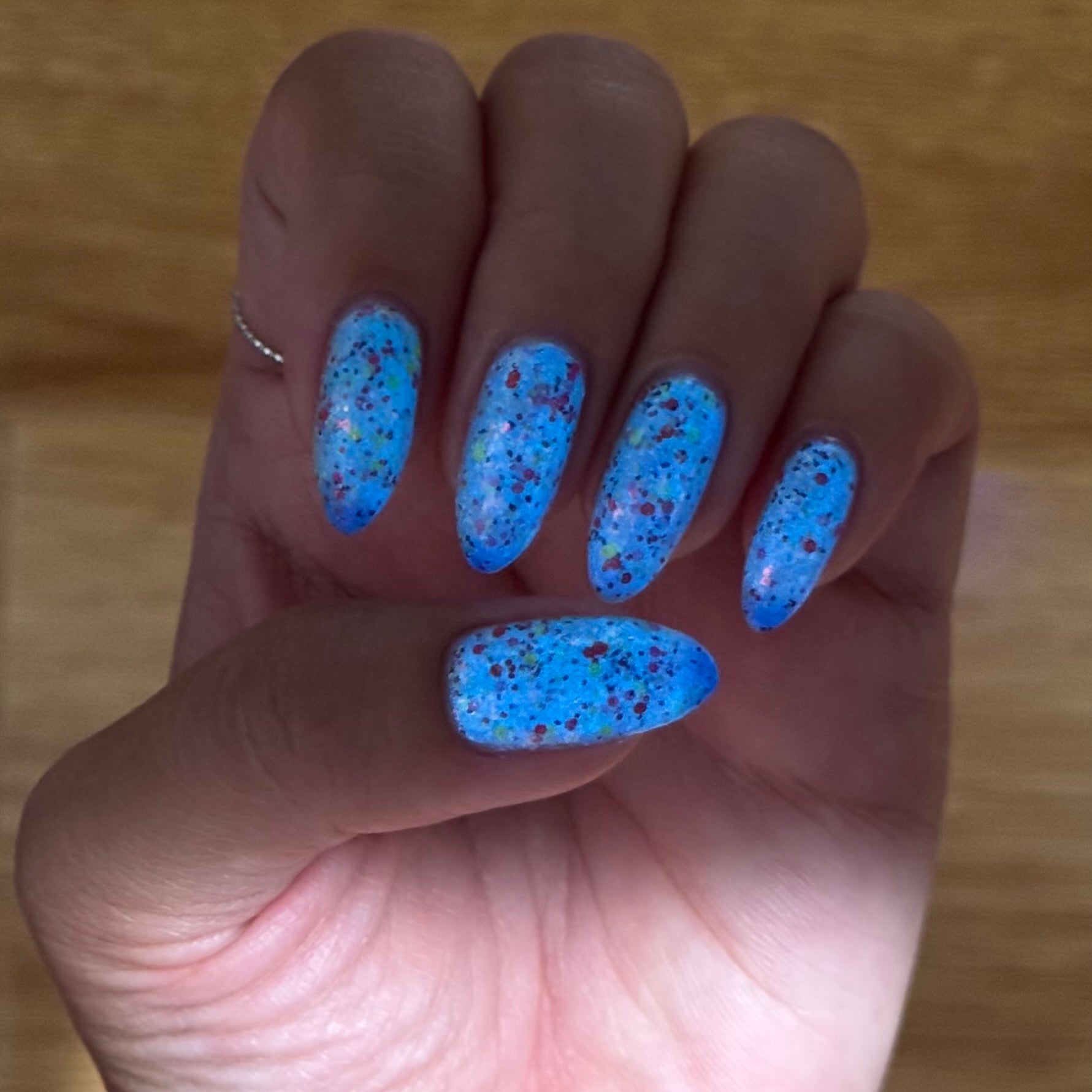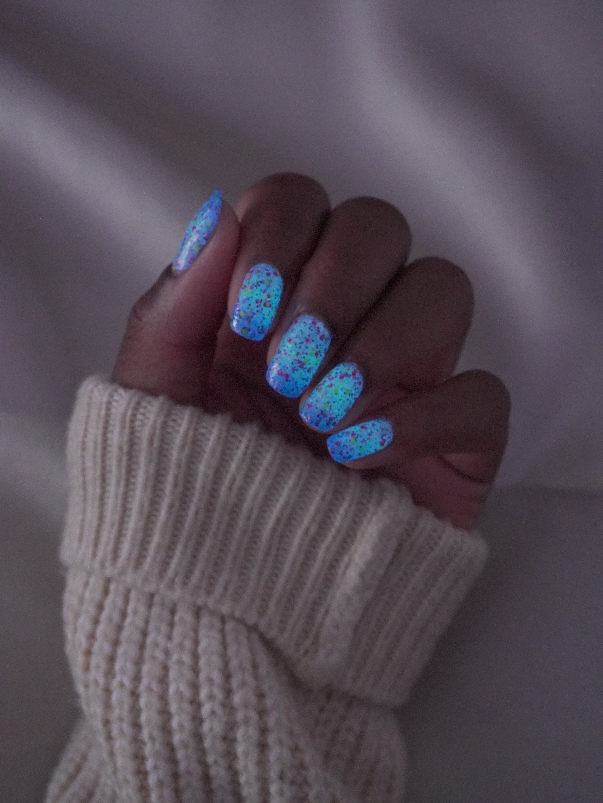 Dimwitted Feline is a glow in the dark thermal crelly with orange copper shifty flakes, red, green hex glitters and black micro flakes.