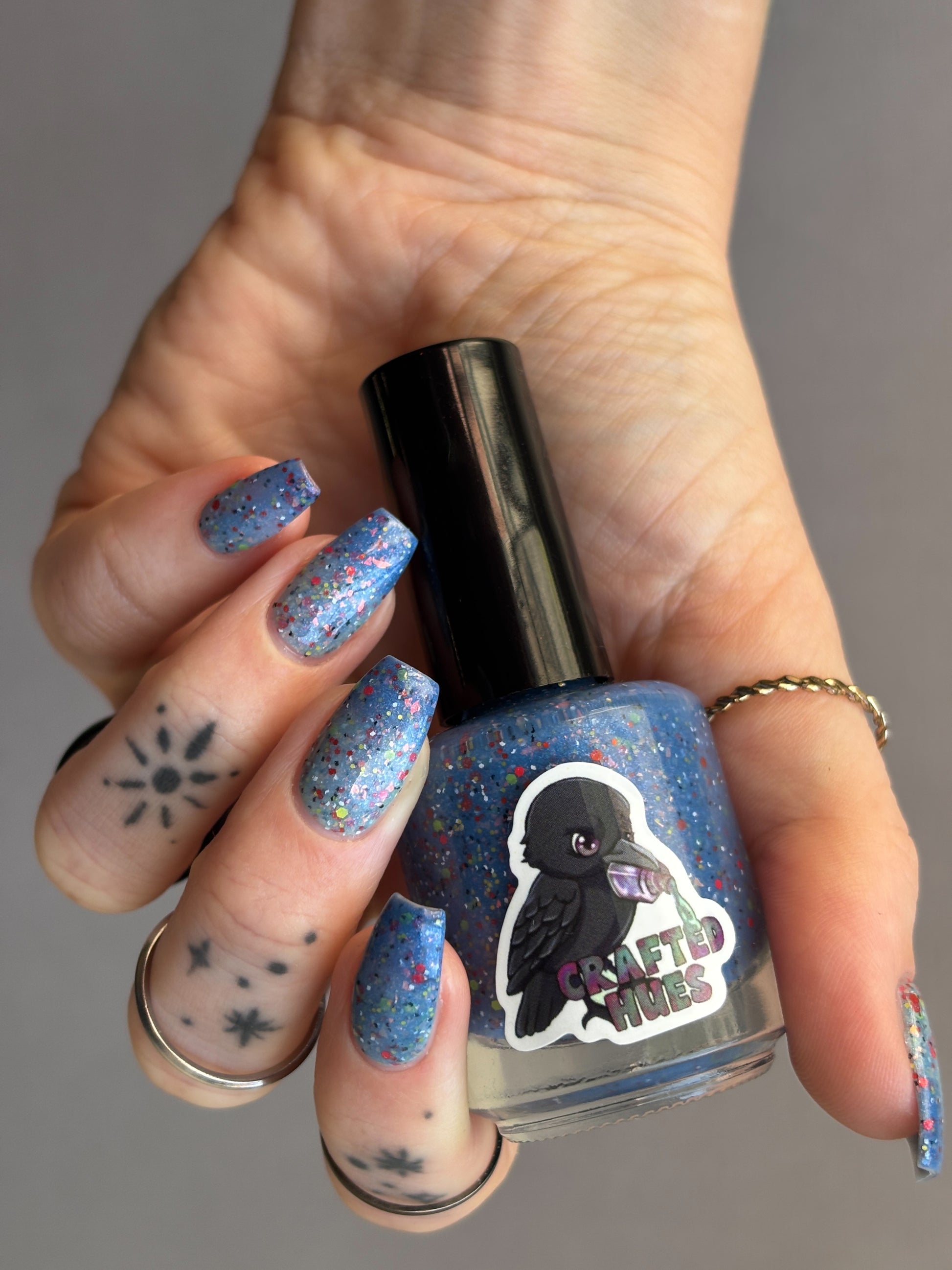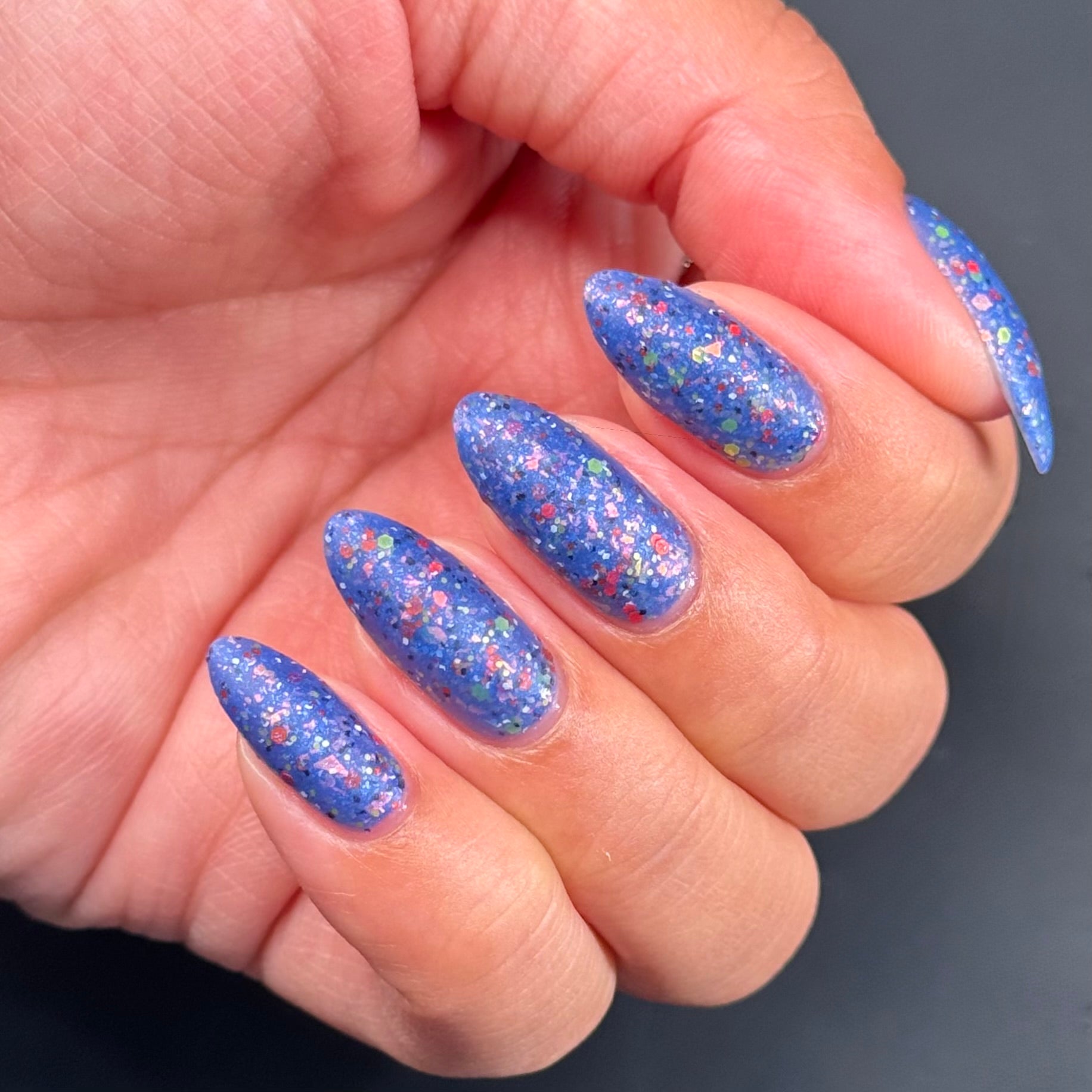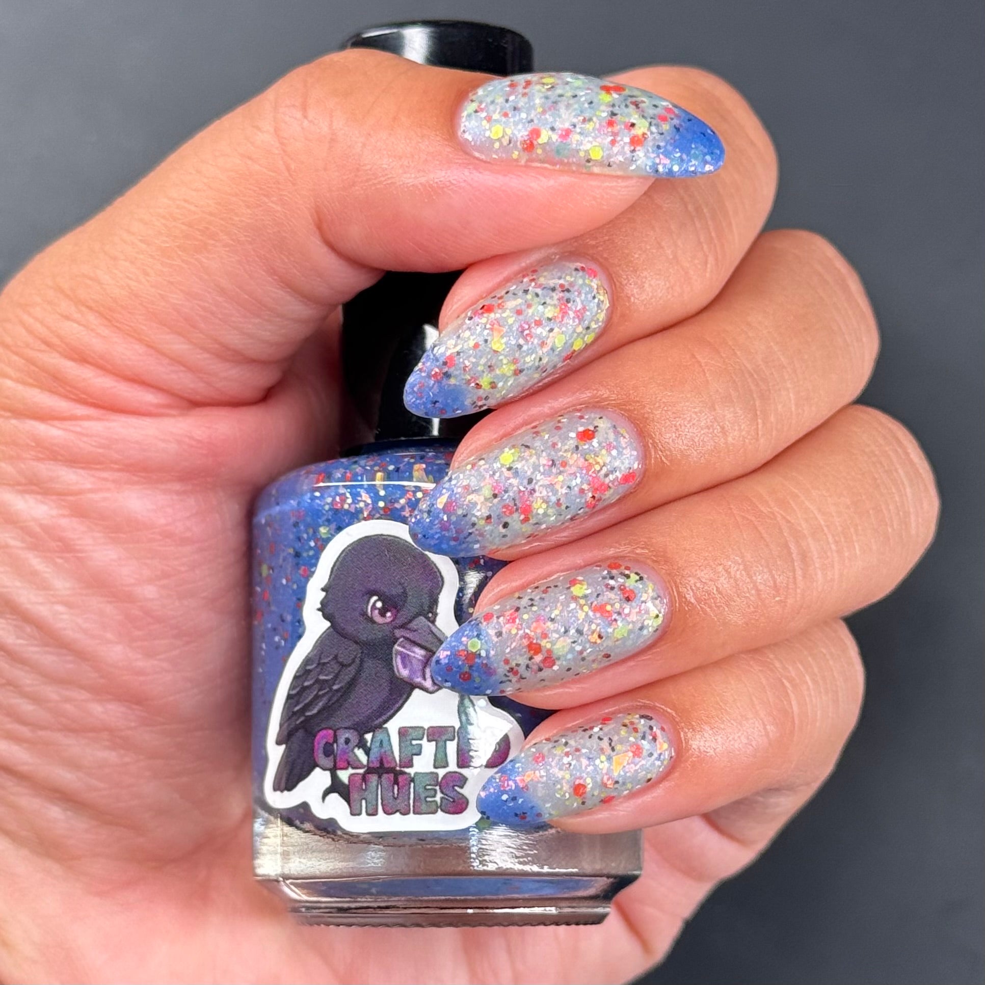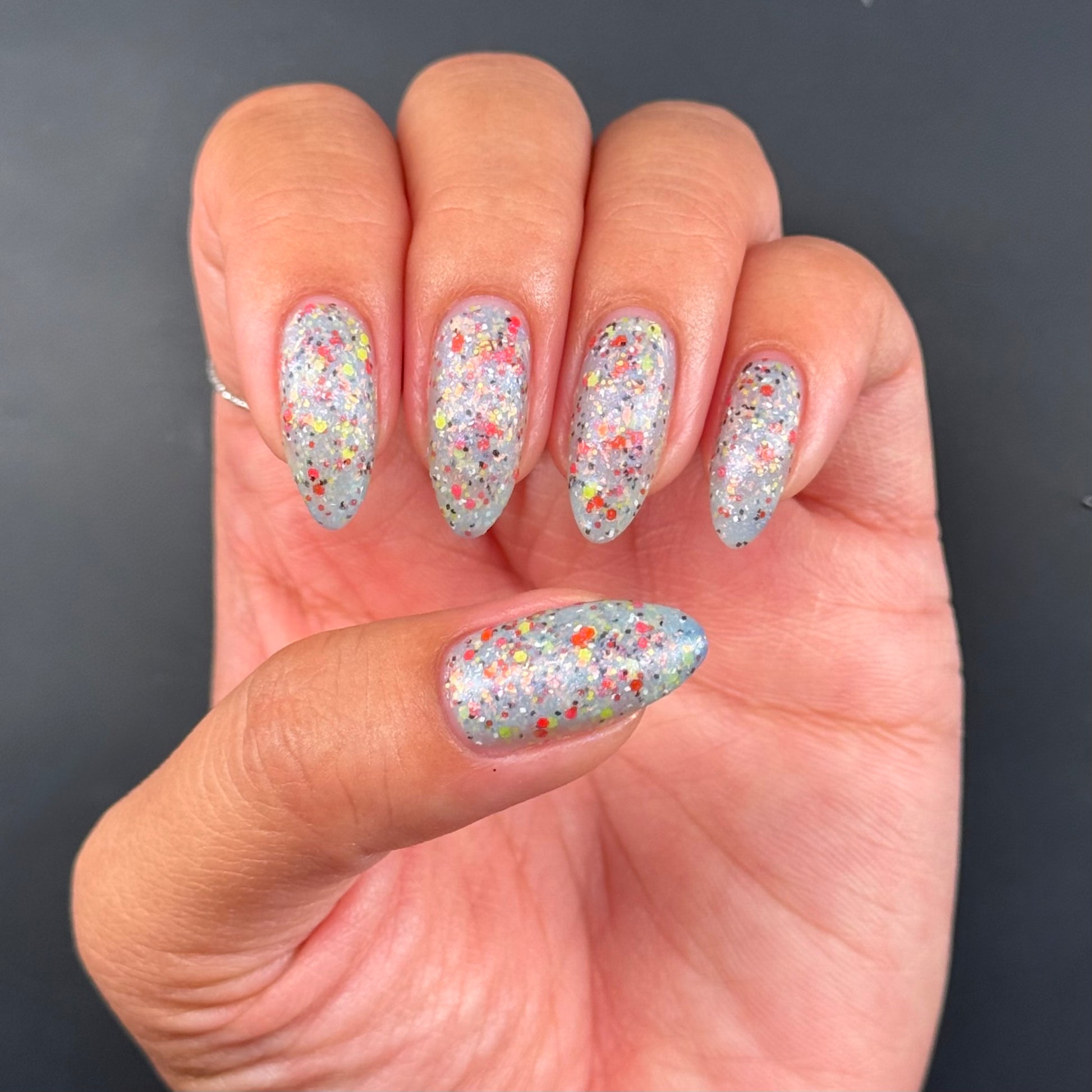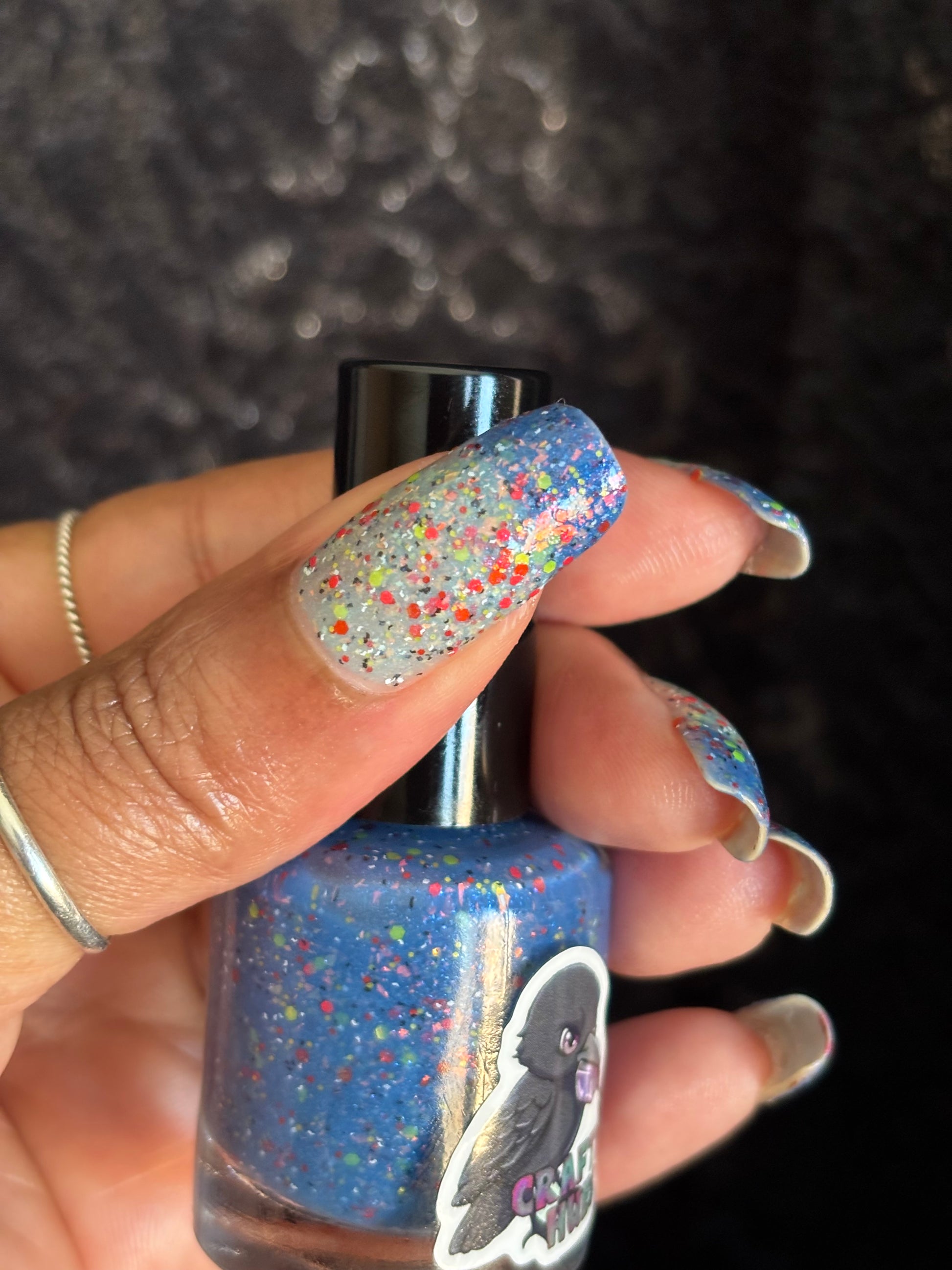 Dimwitted Feline is a glow in the dark thermal crelly with orange copper shifty flakes, red, green hex glitters and black micro flakes.
