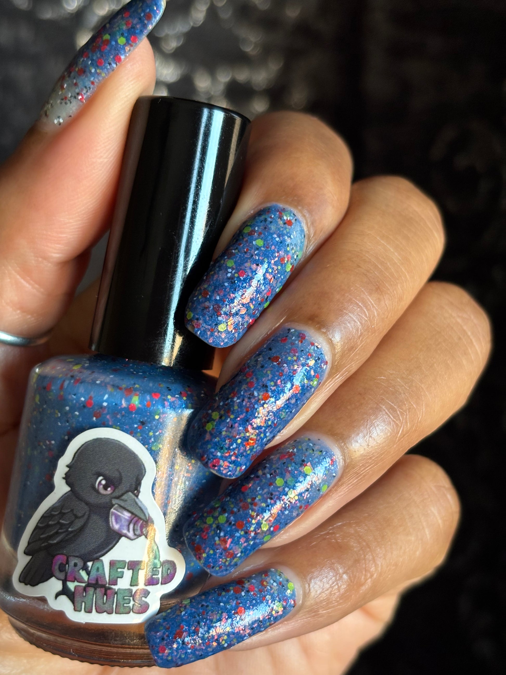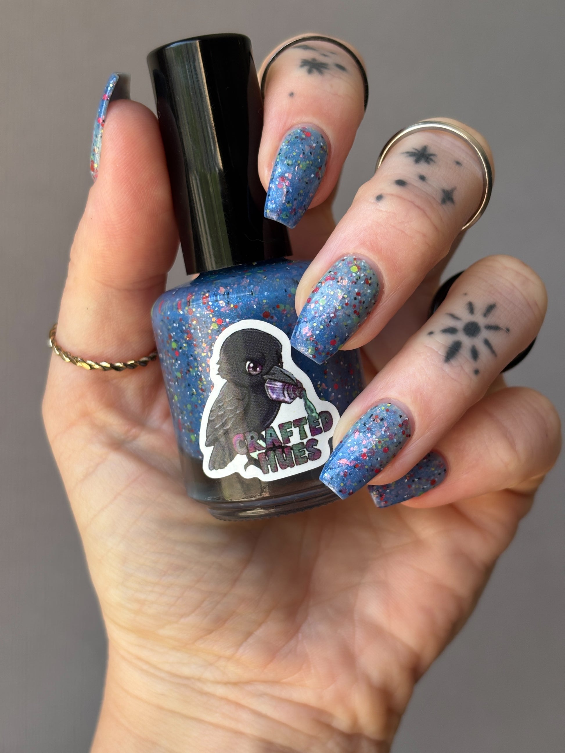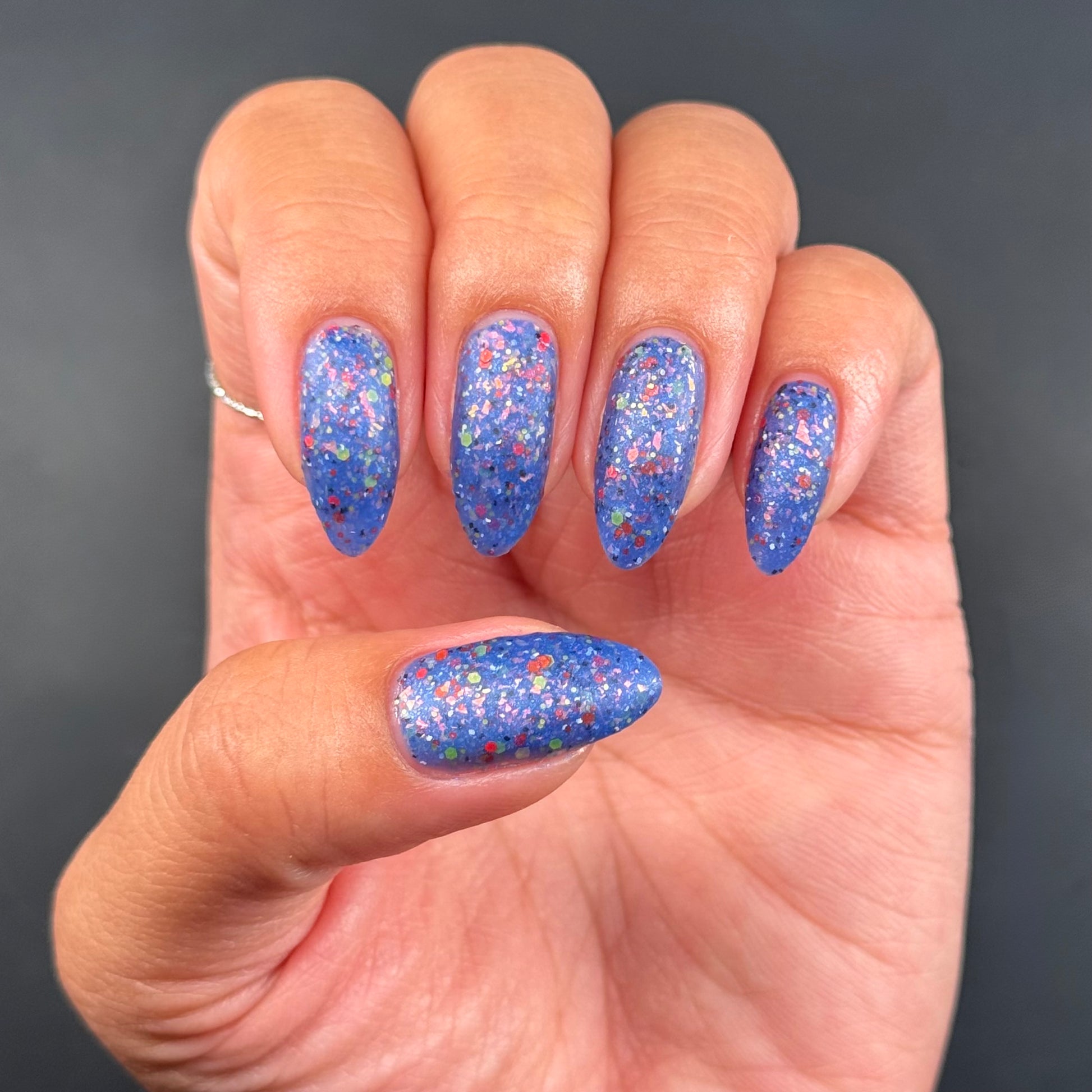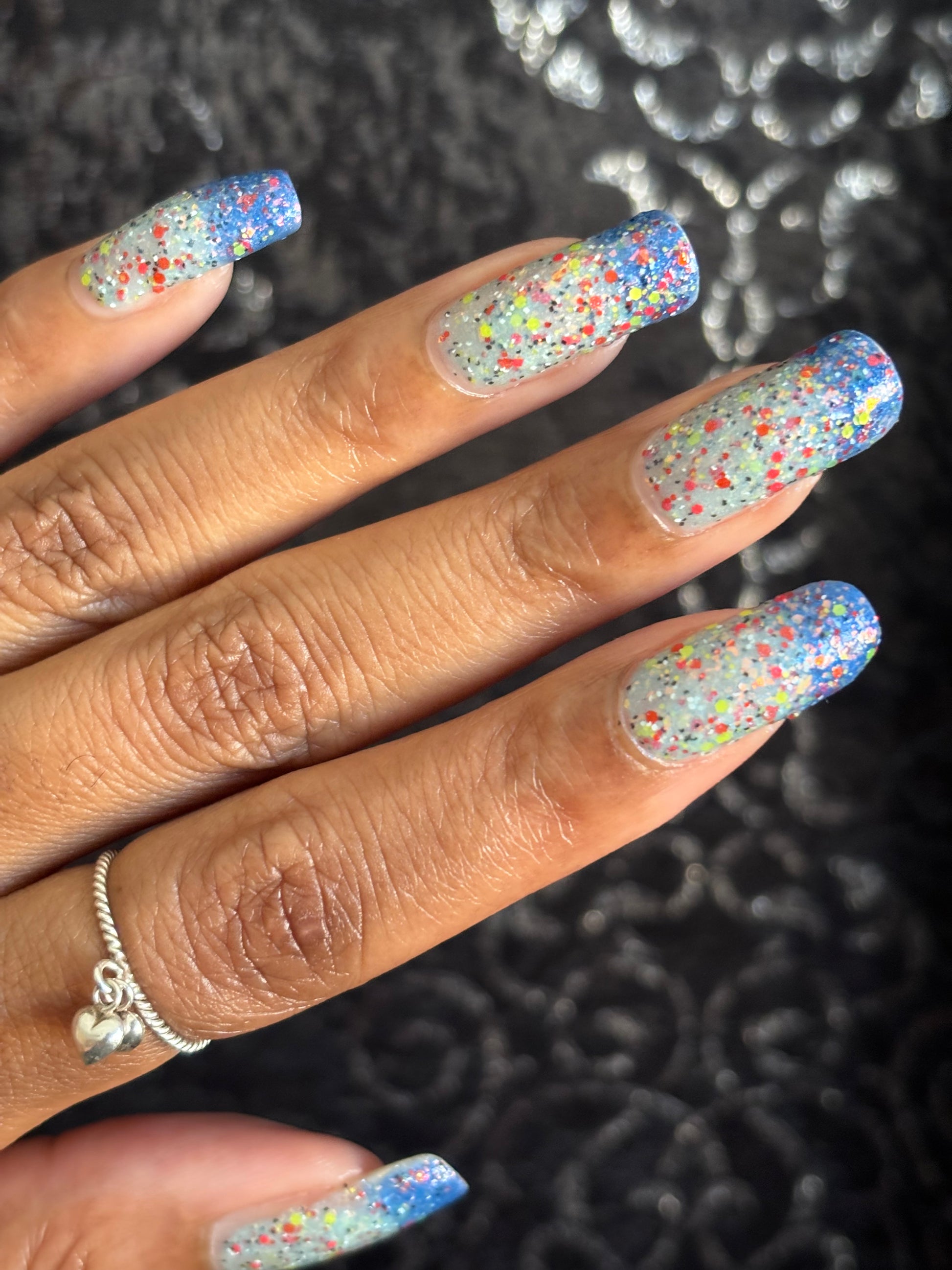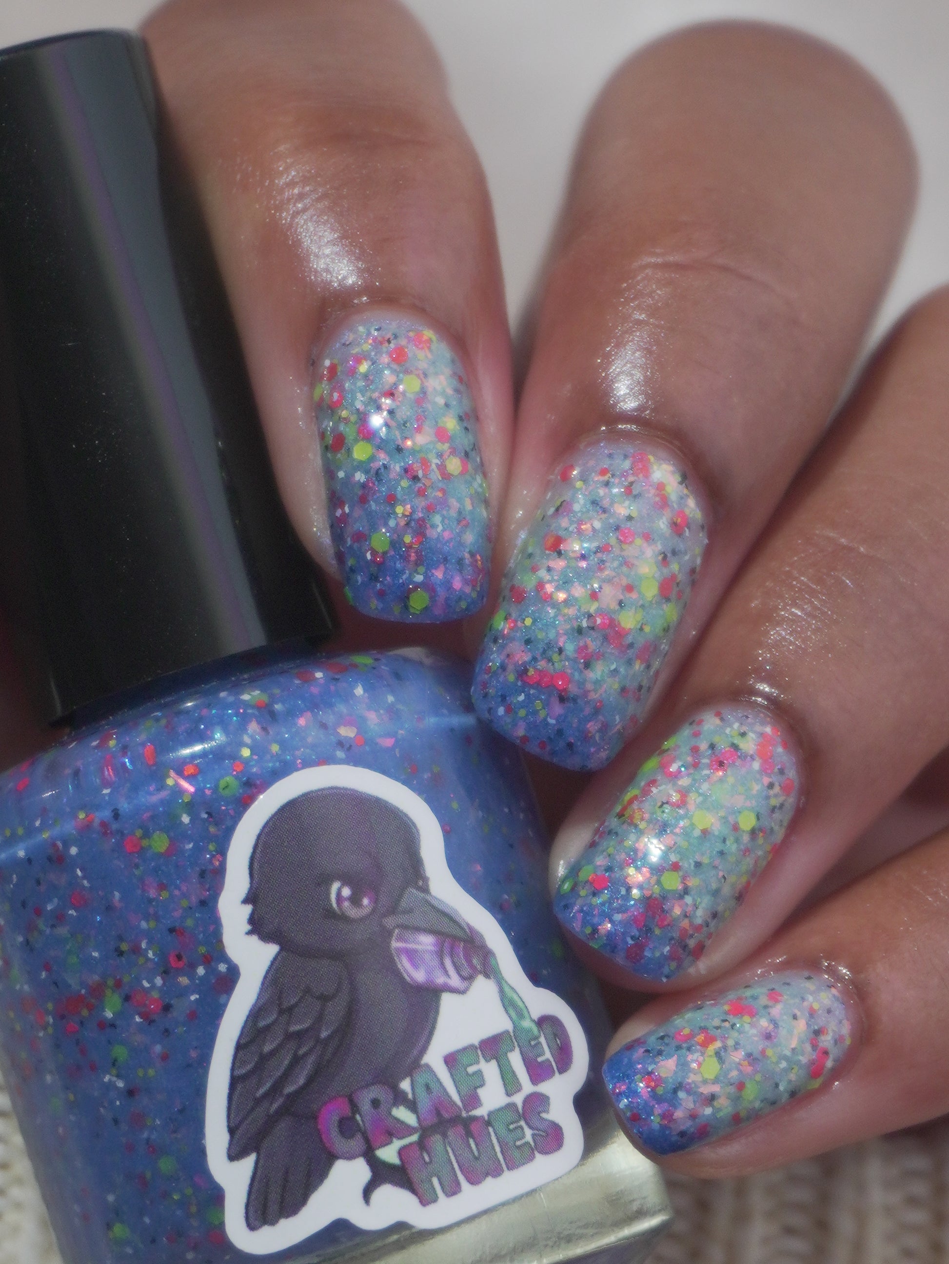 Dimwitted Feline is a glow in the dark thermal crelly with orange copper shifty flakes, red, green hex glitters and black micro flakes.
