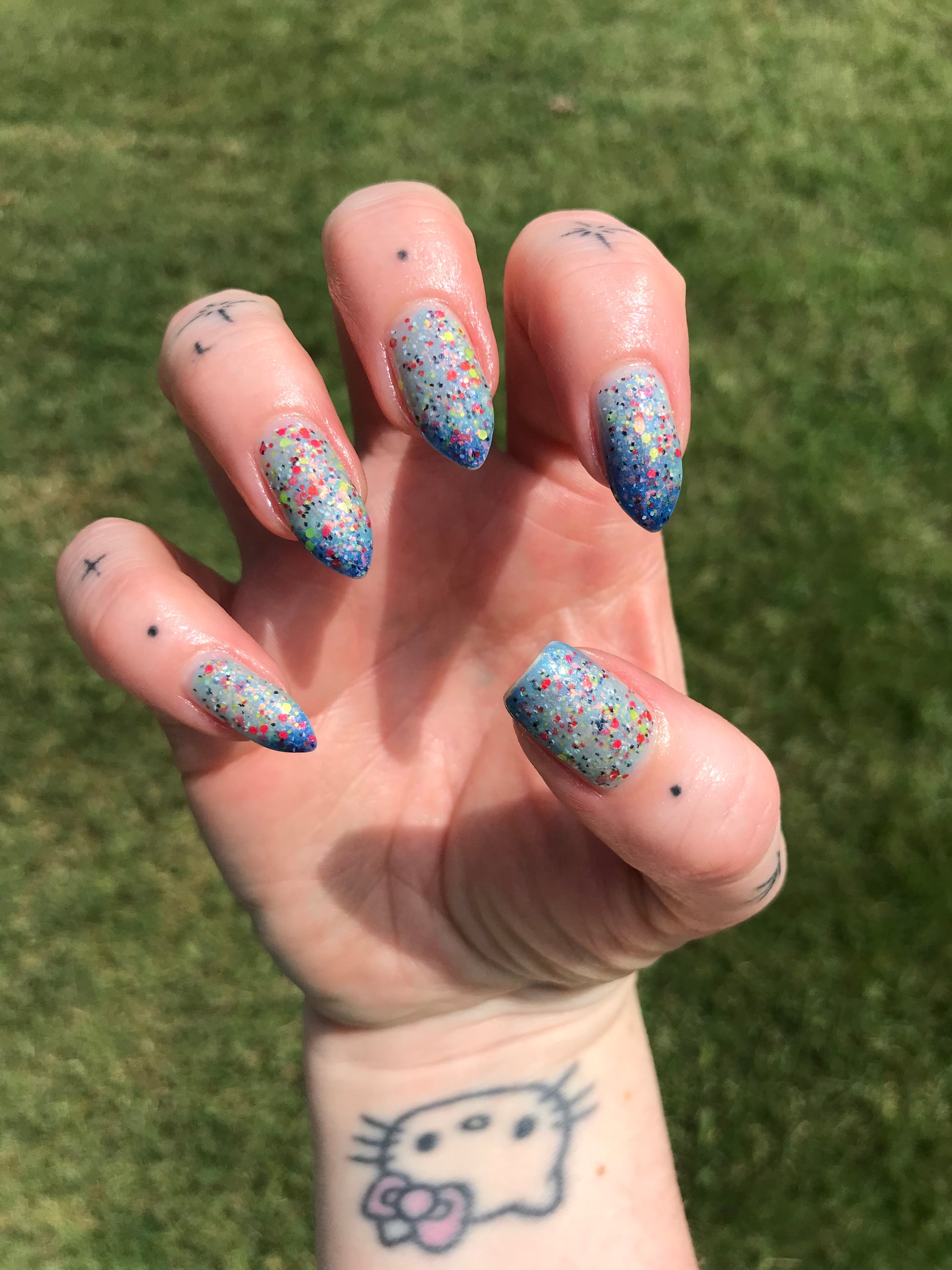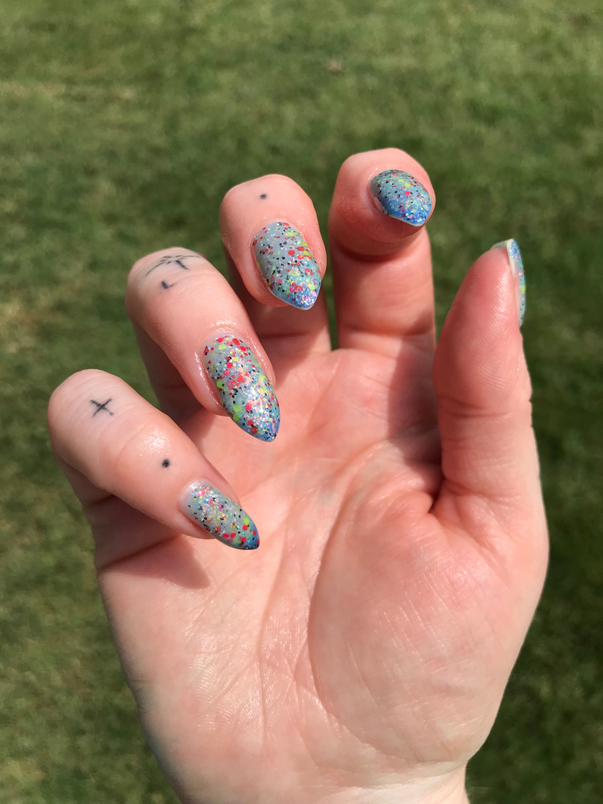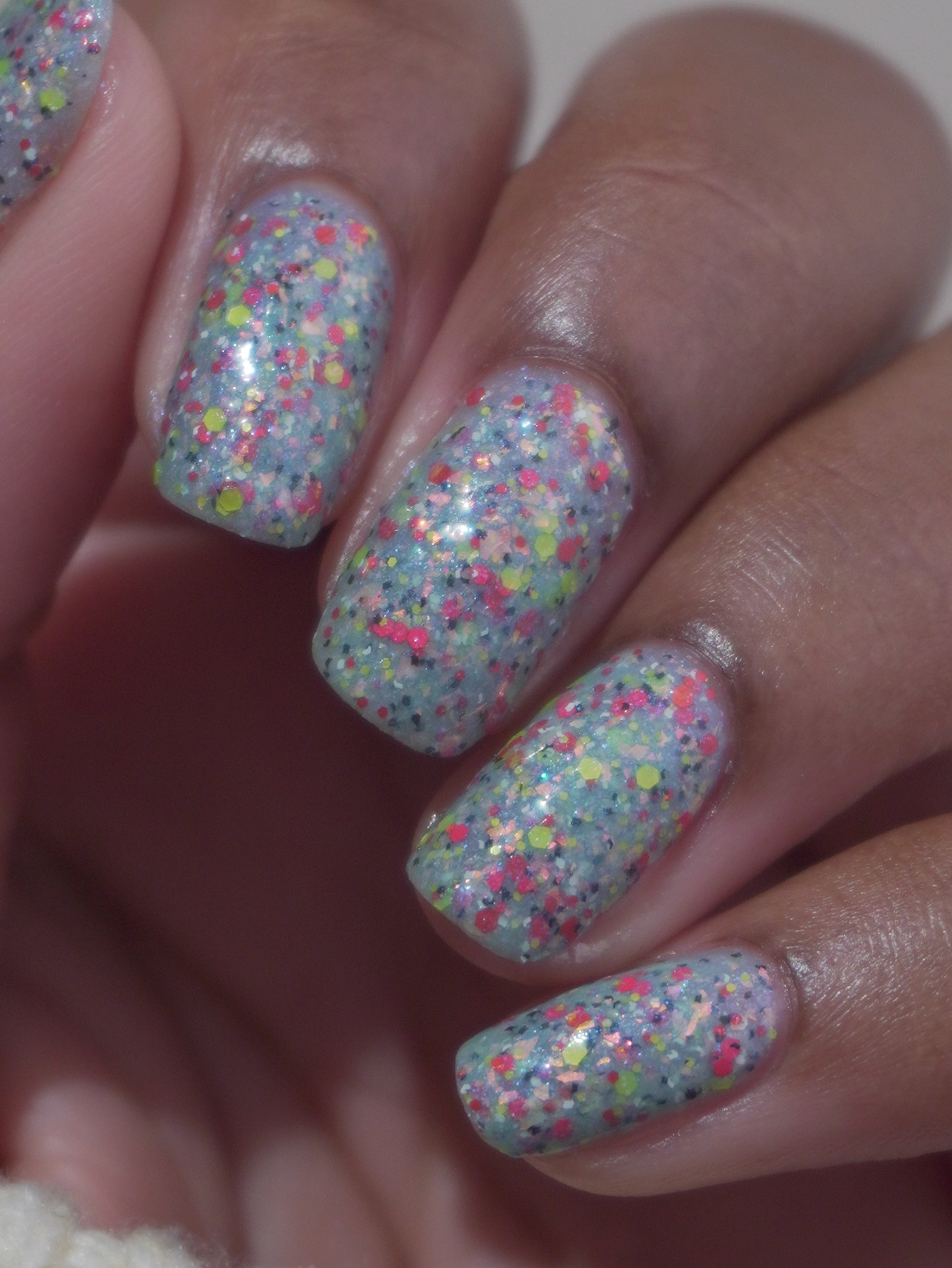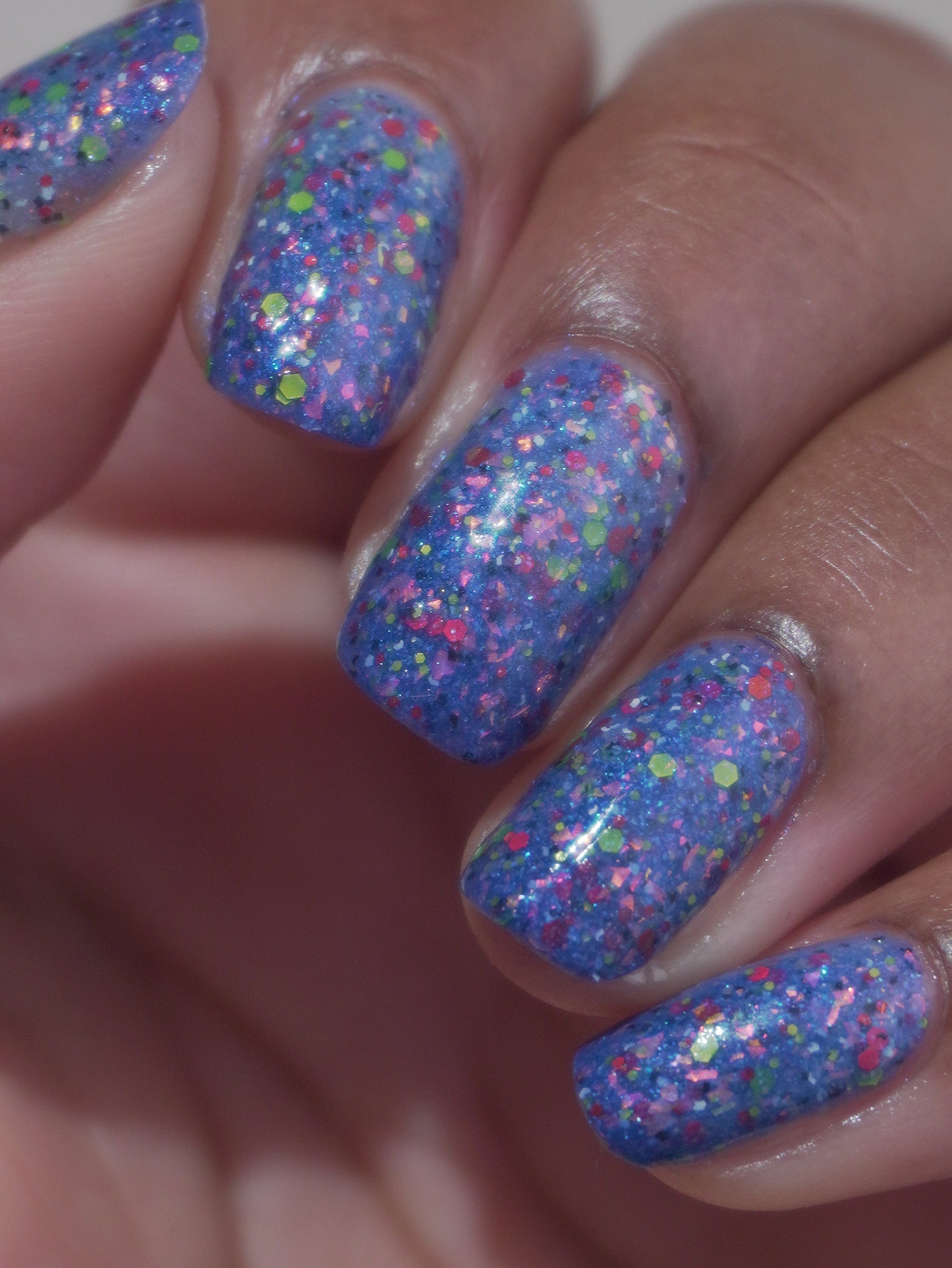 Dimwitted Feline is a glow in the dark thermal crelly with orange copper shifty flakes, red, green hex glitters and black micro flakes.