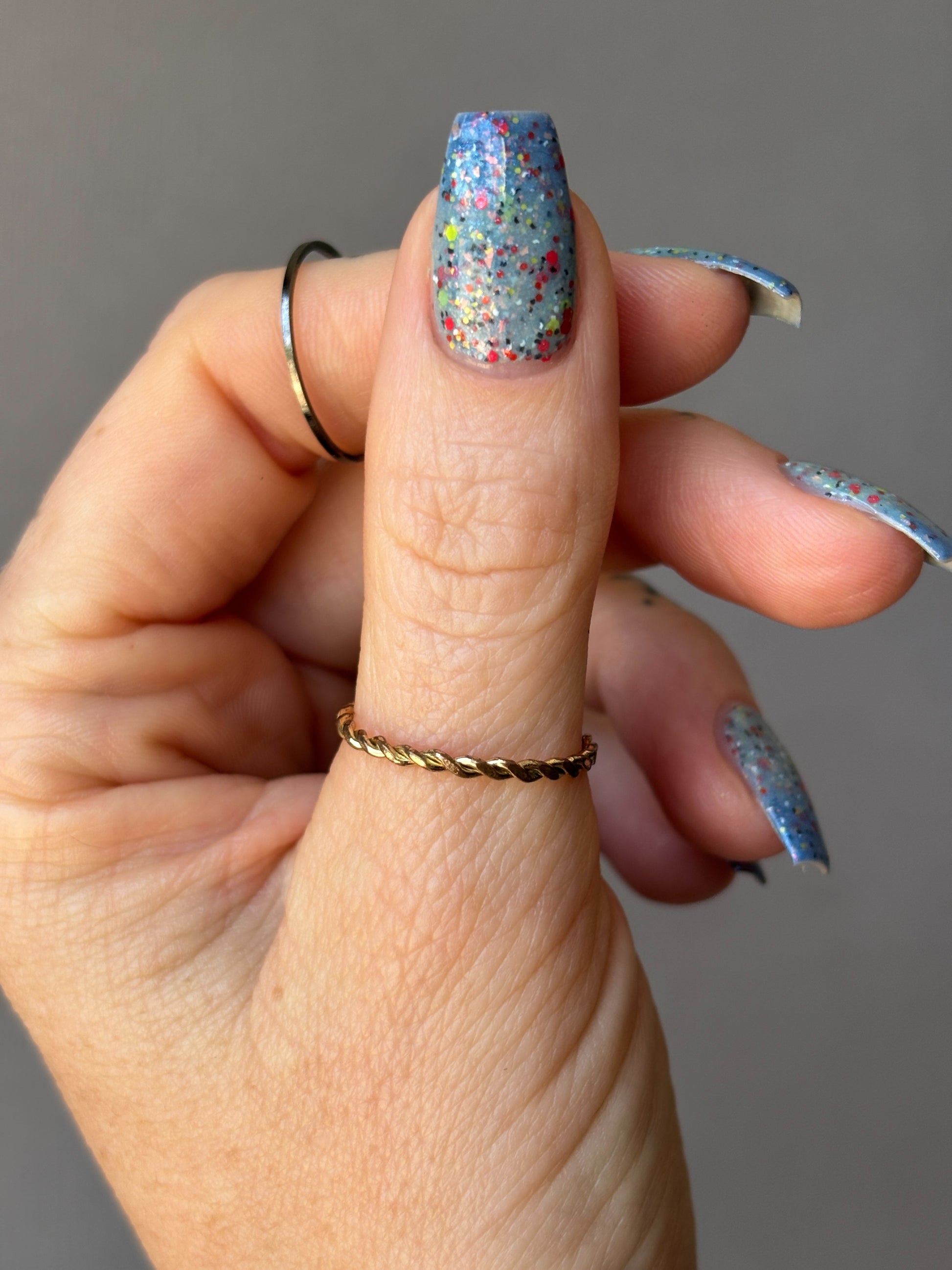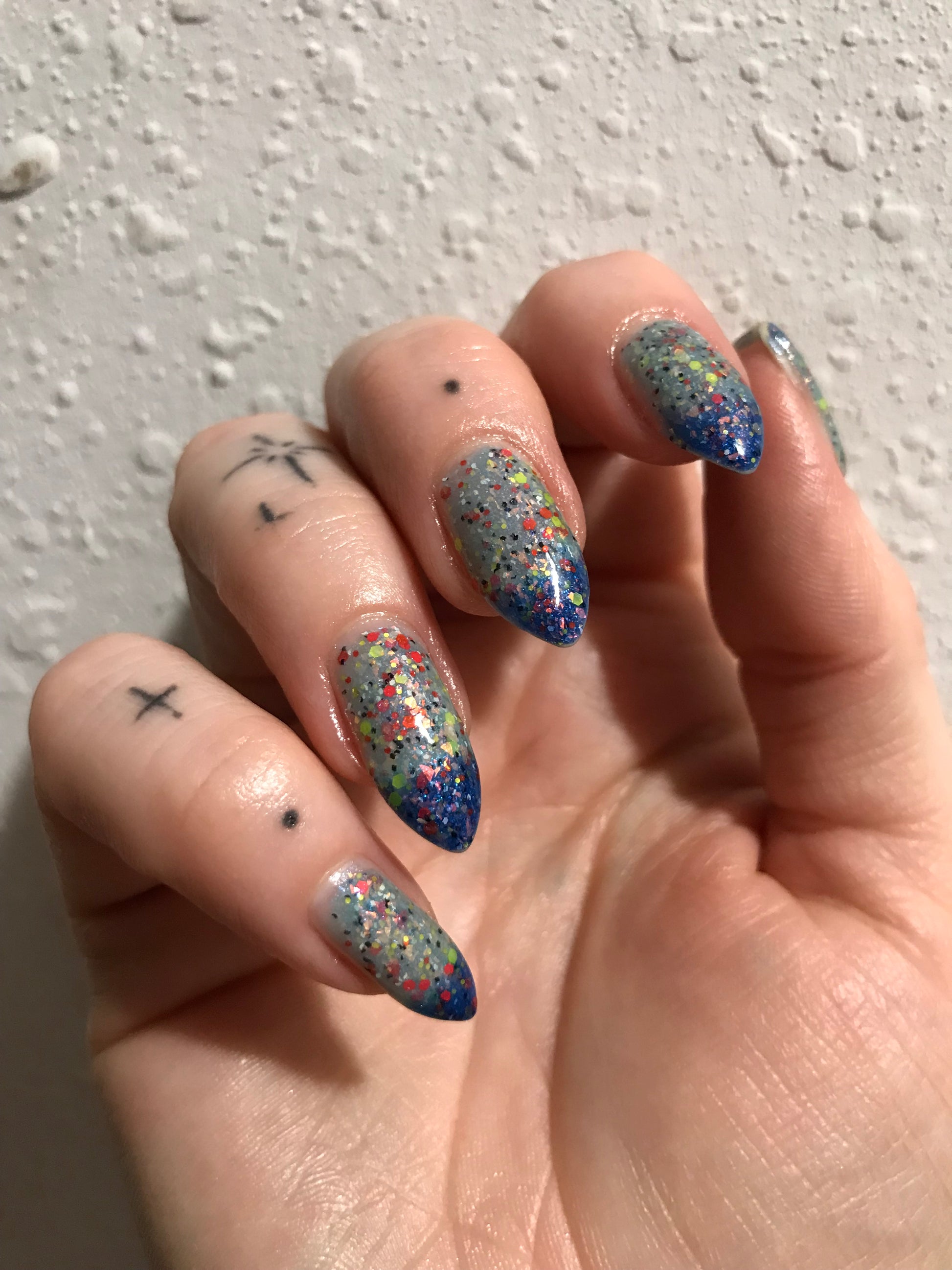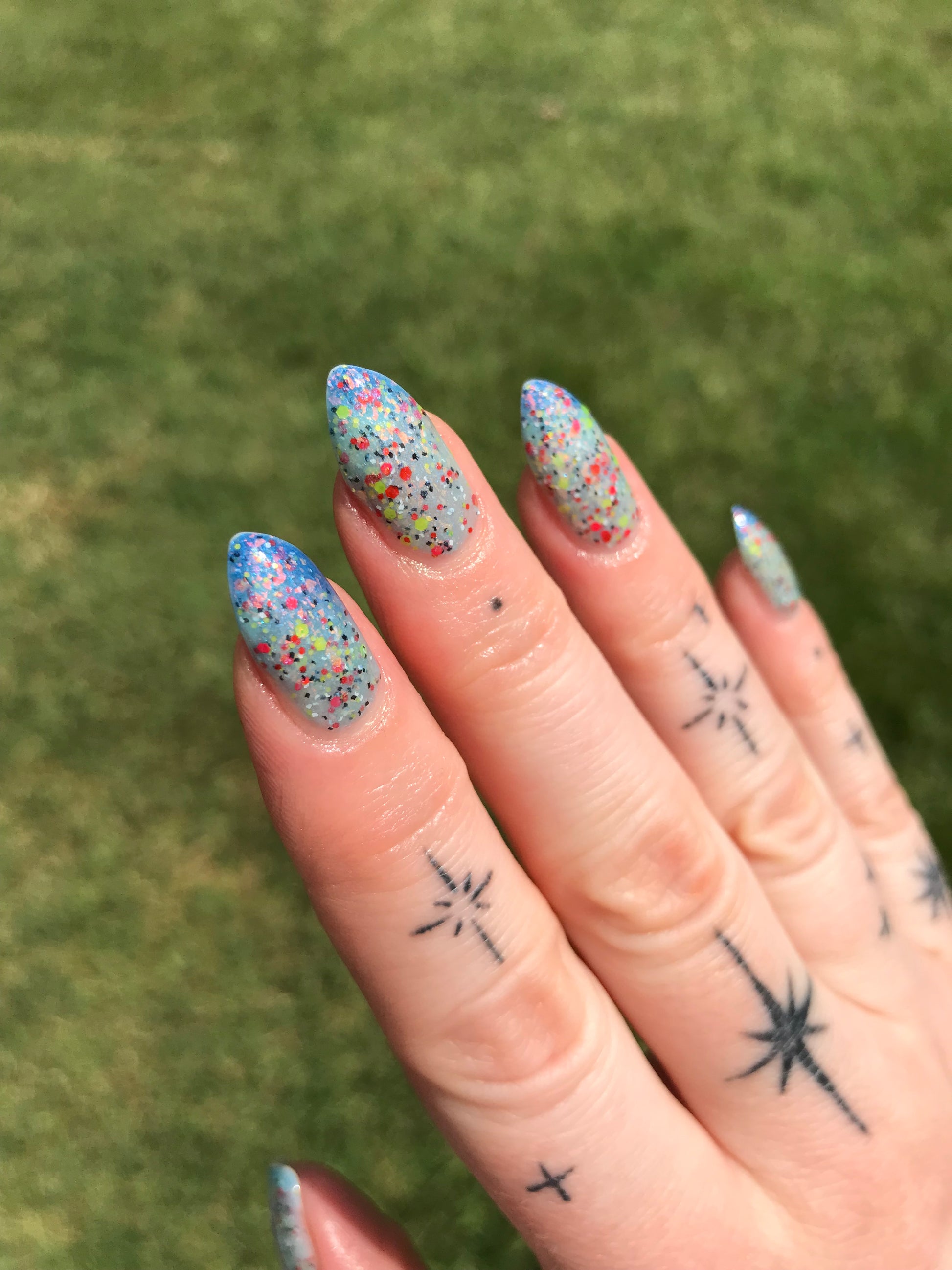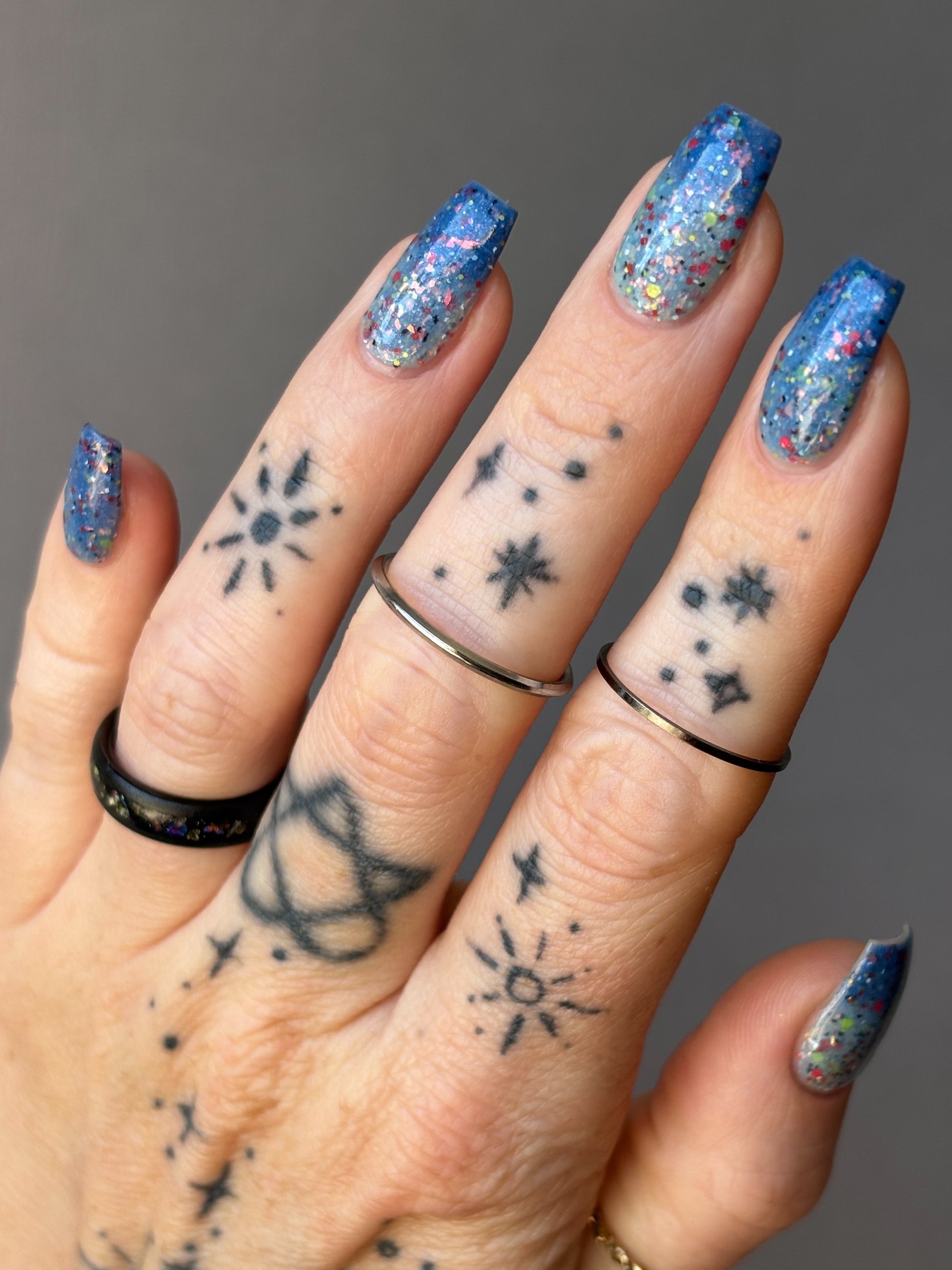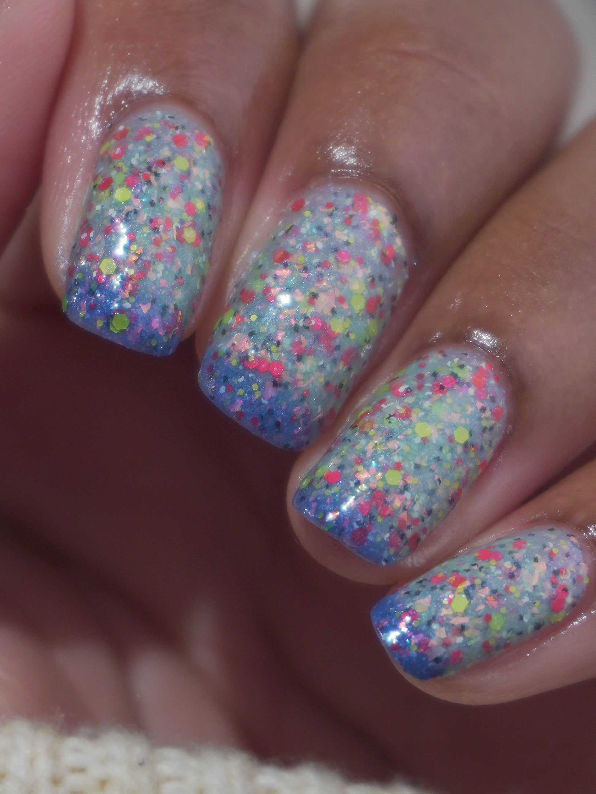 Dimwitted Feline is a glow in the dark thermal crelly with orange copper shifty flakes, red, green hex glitters and black micro flakes.