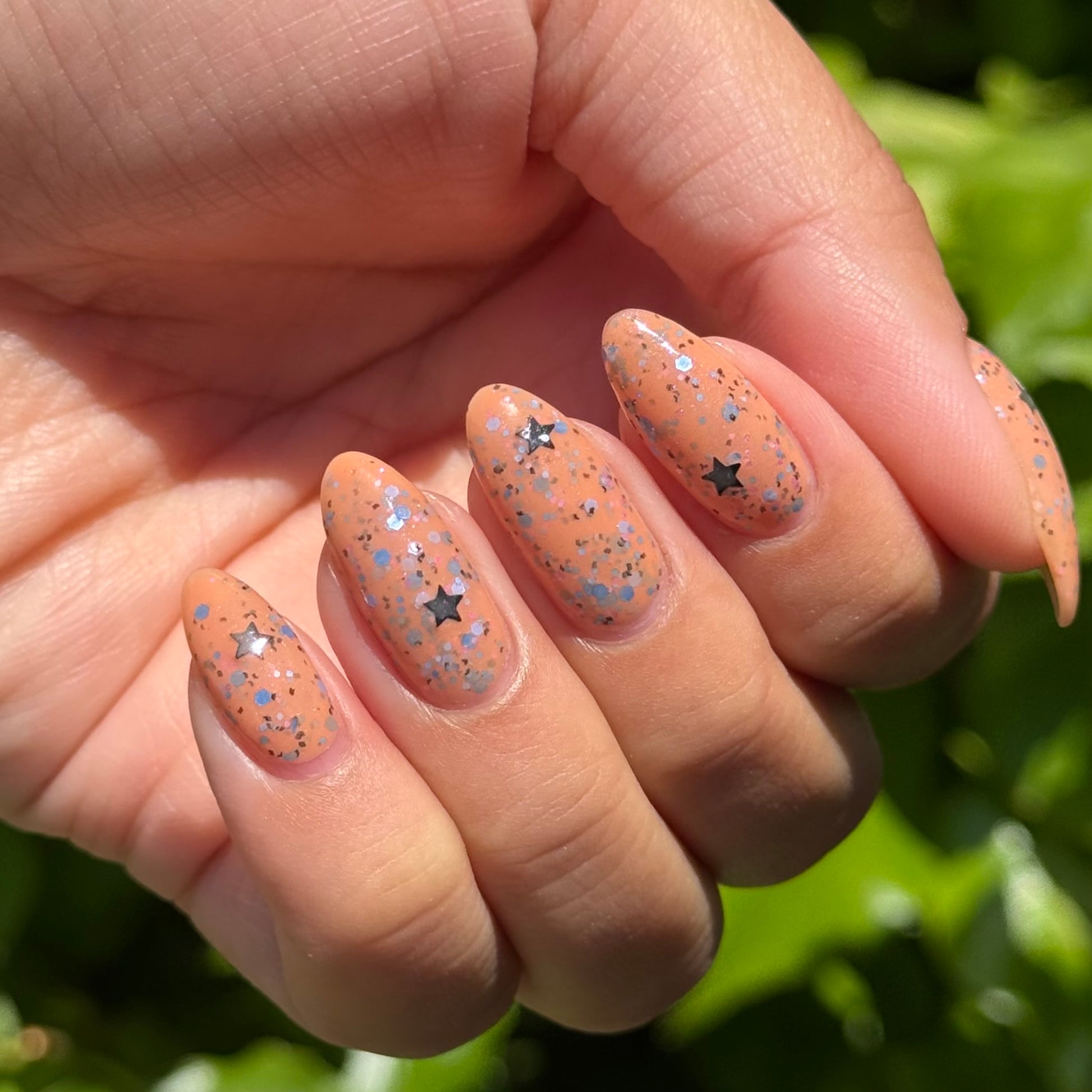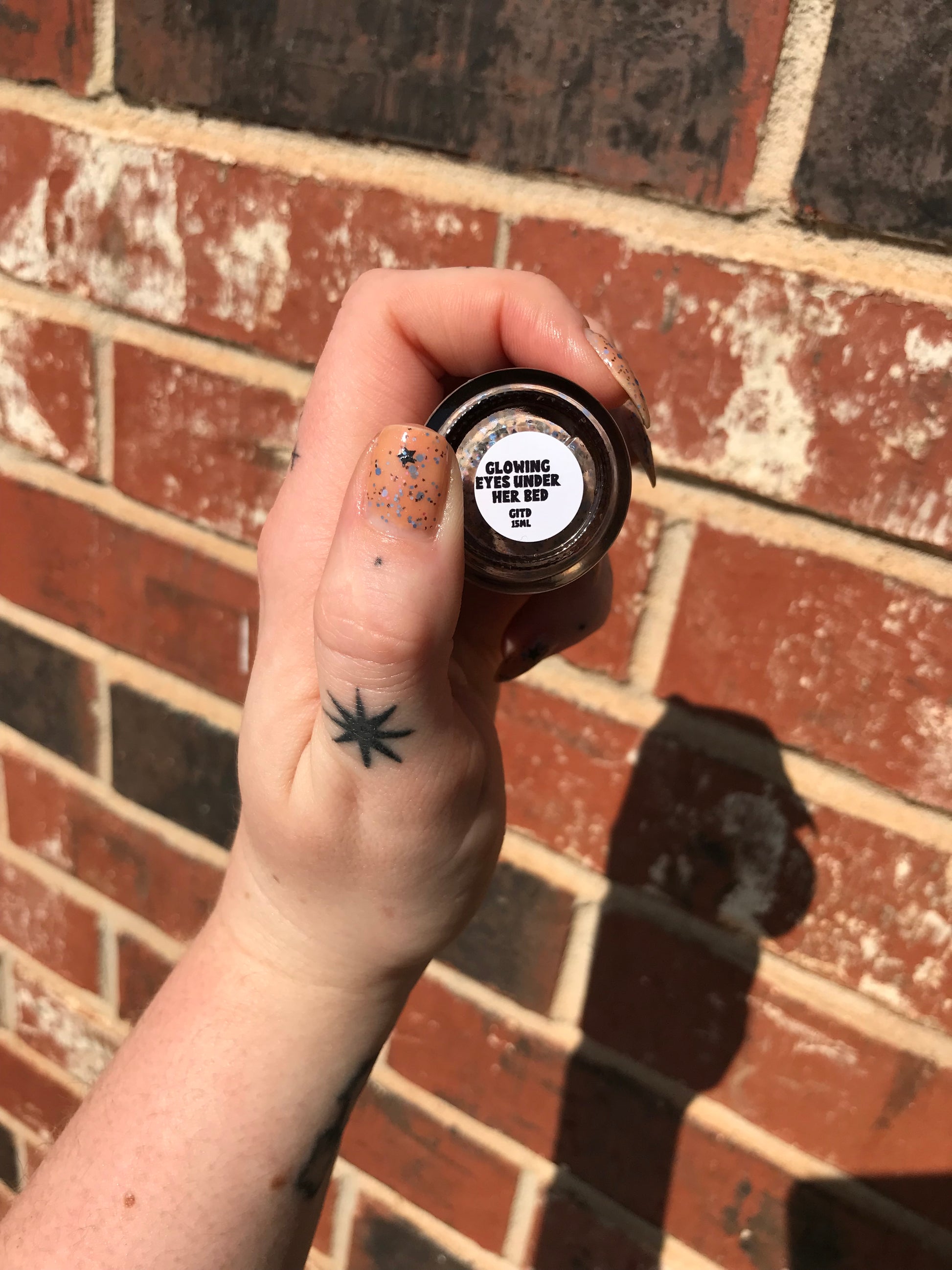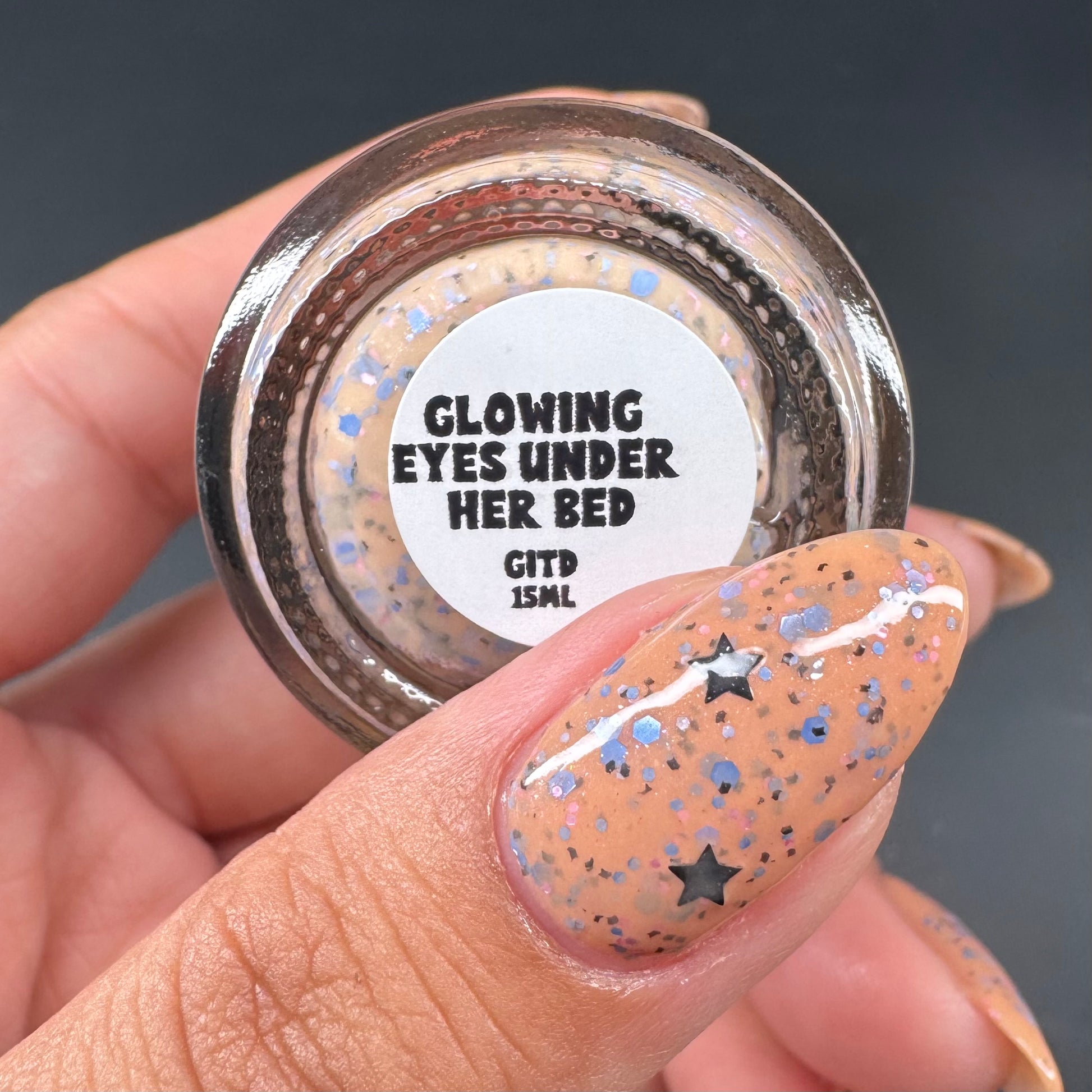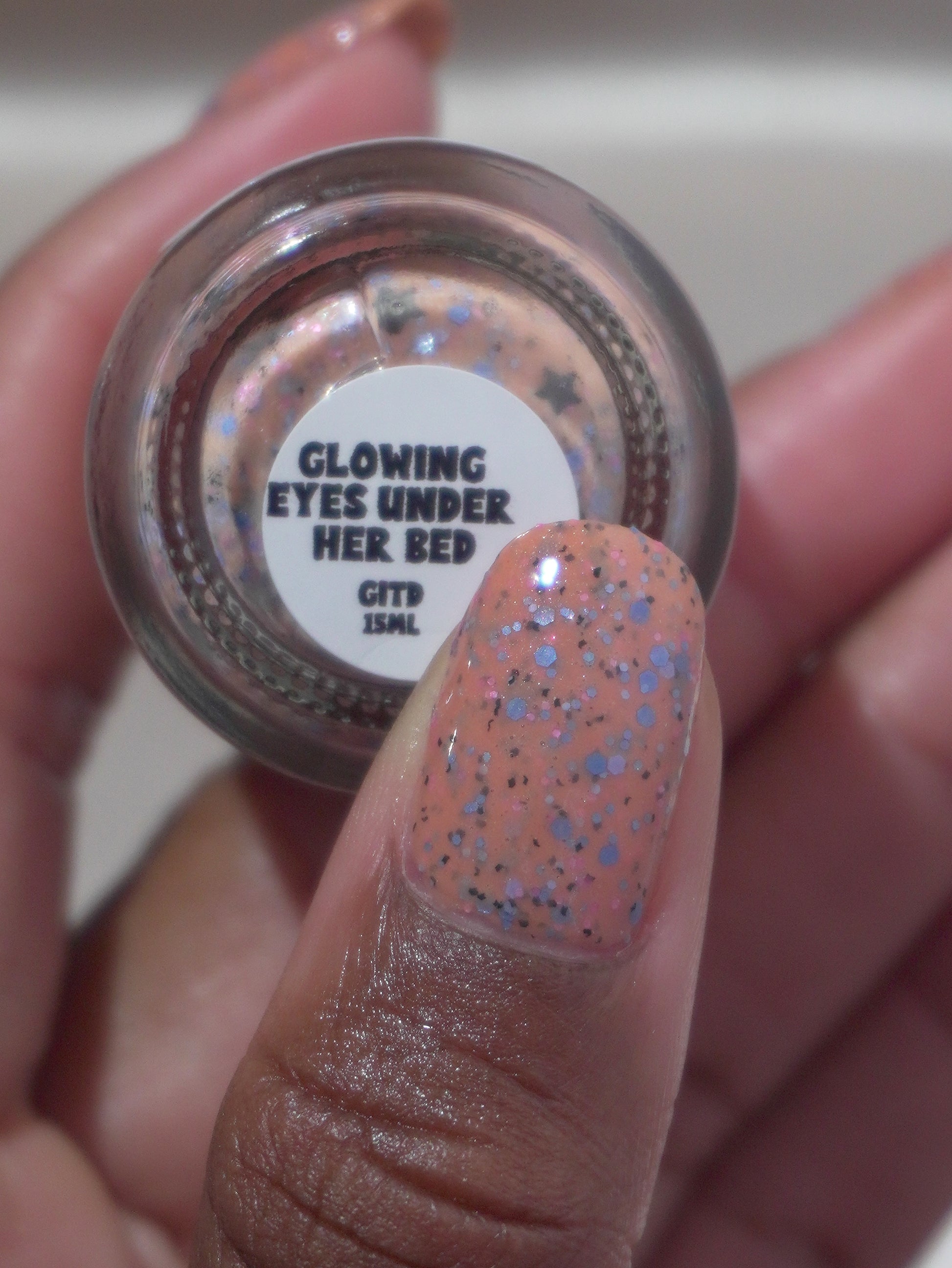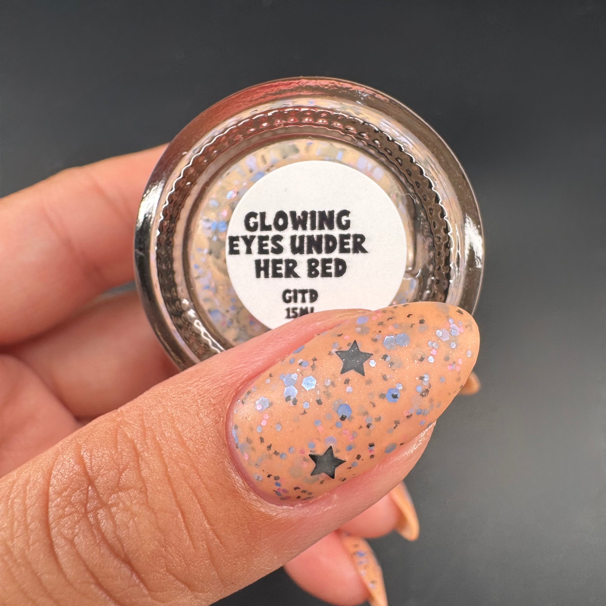 Glowing Eyes Under Her Bed is a glow in the dark crelly! A salmon orange base that glows green with micro holo glitters, black micro flakes, pink and purple glitter hexes along with black stars!