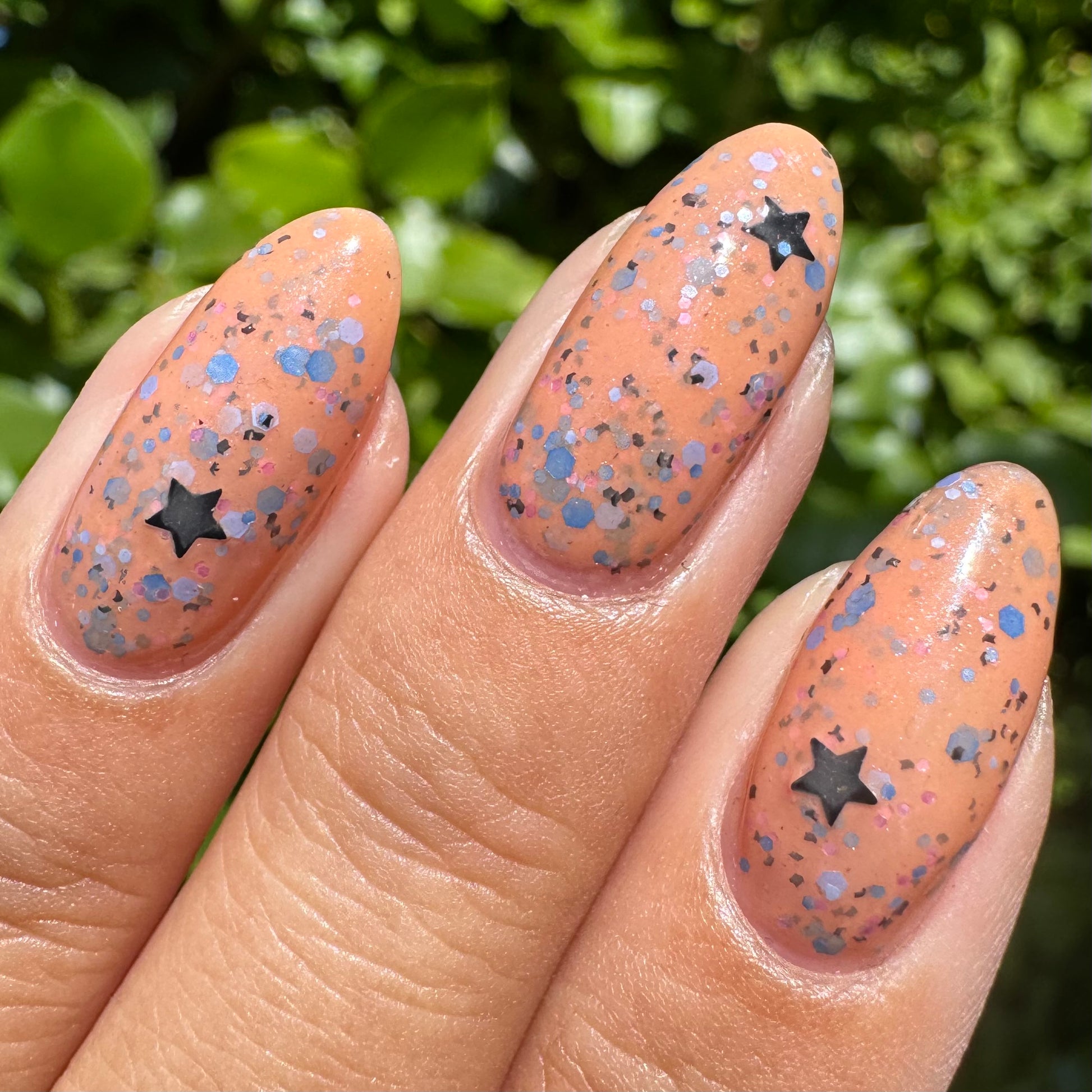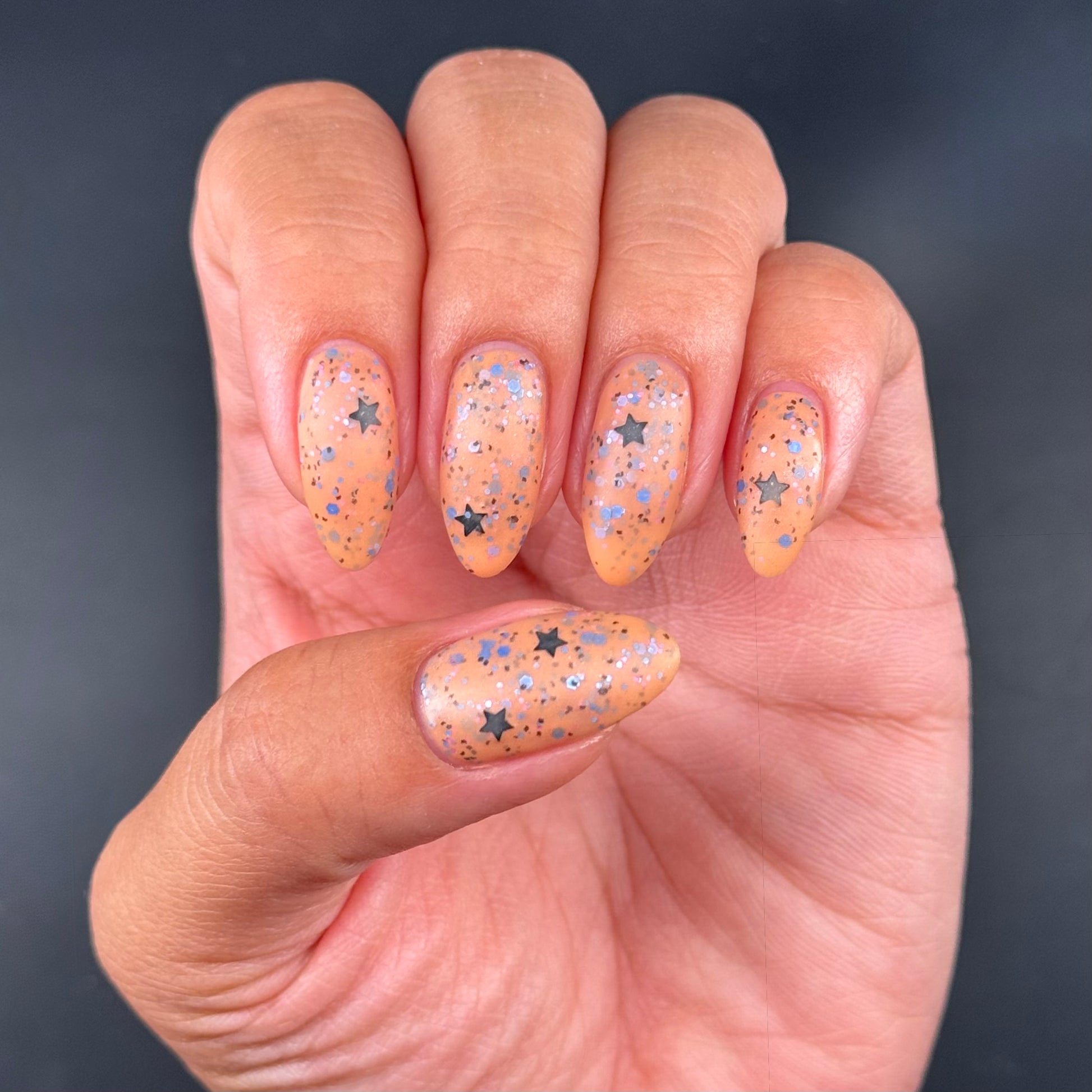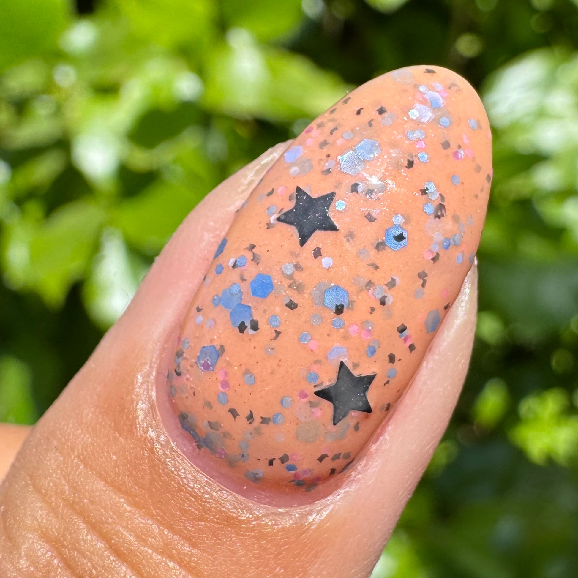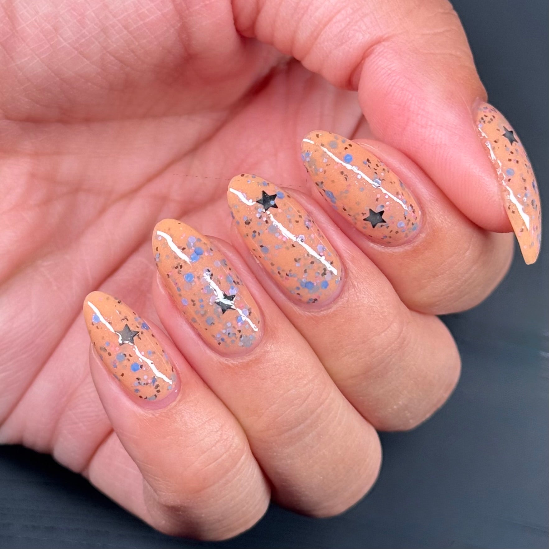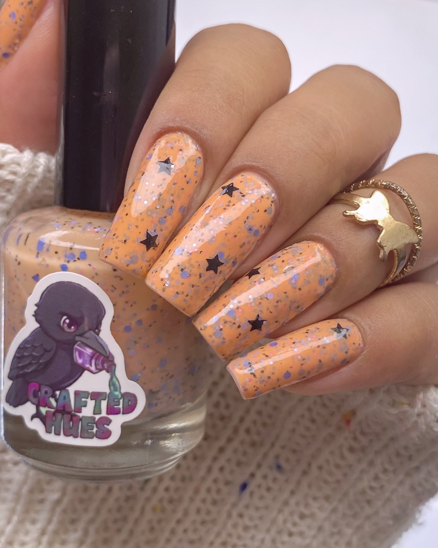Glowing Eyes Under Her Bed is a glow in the dark crelly! A salmon orange base that glows green with micro holo glitters, black micro flakes, pink and purple glitter hexes along with black stars!