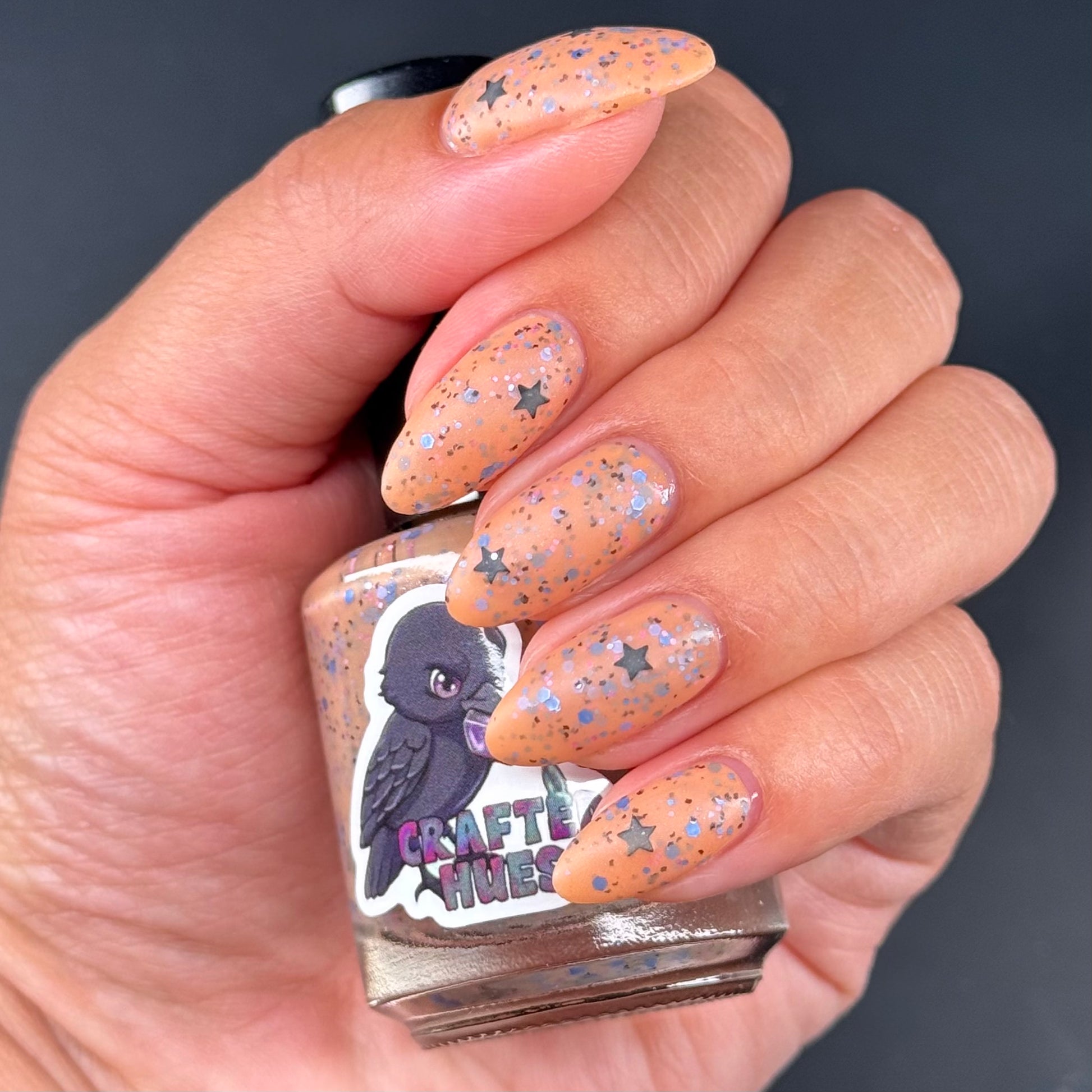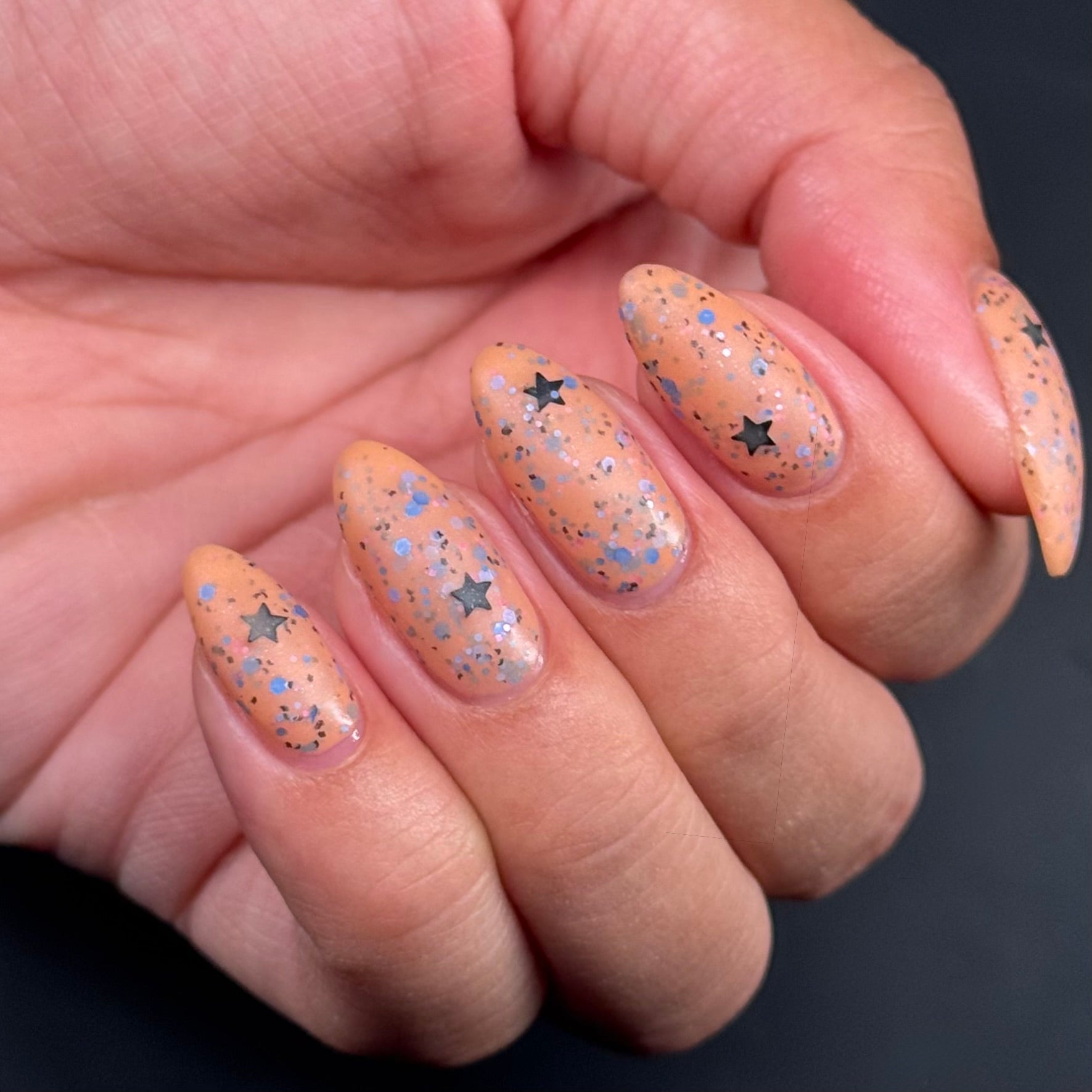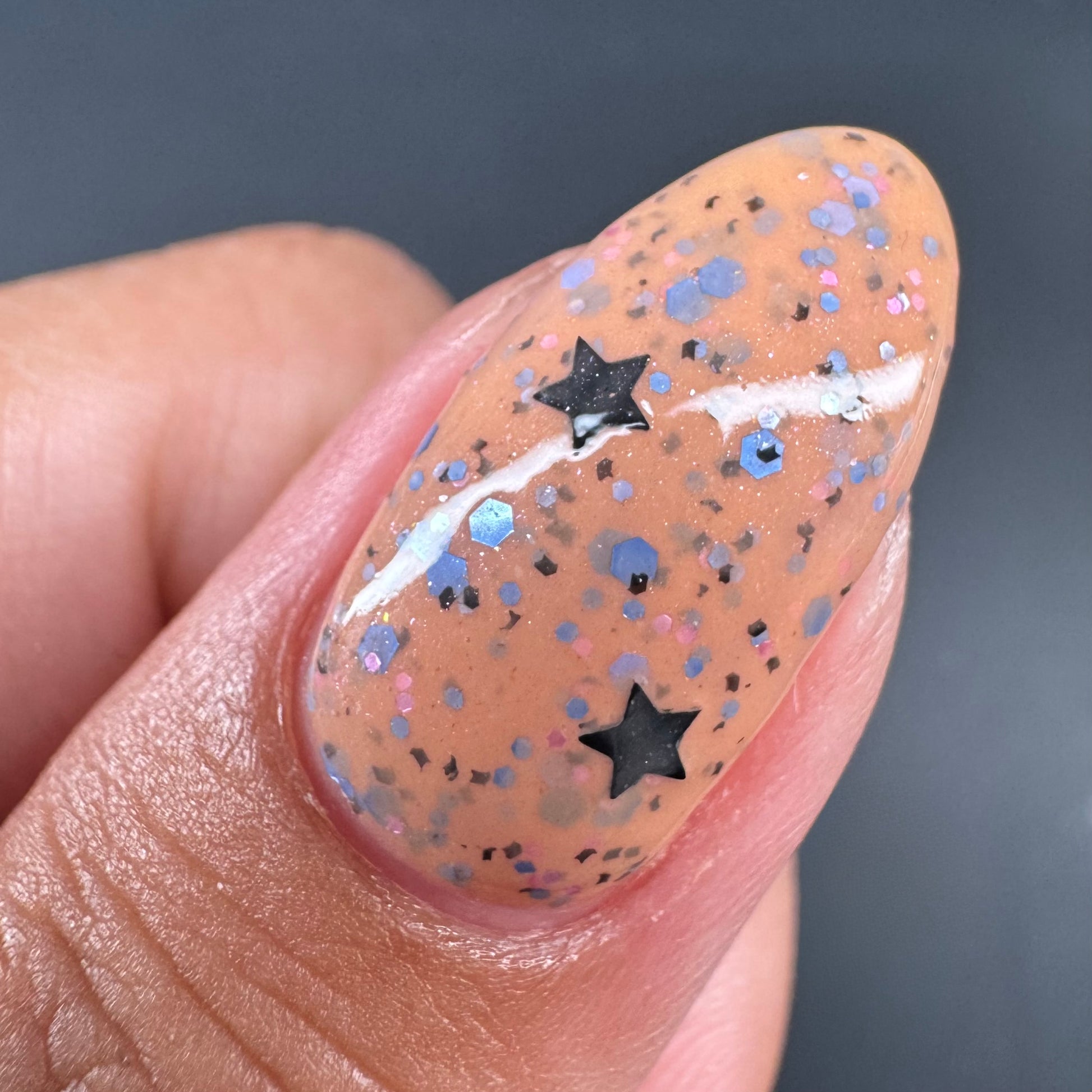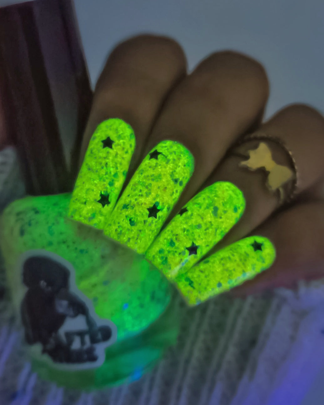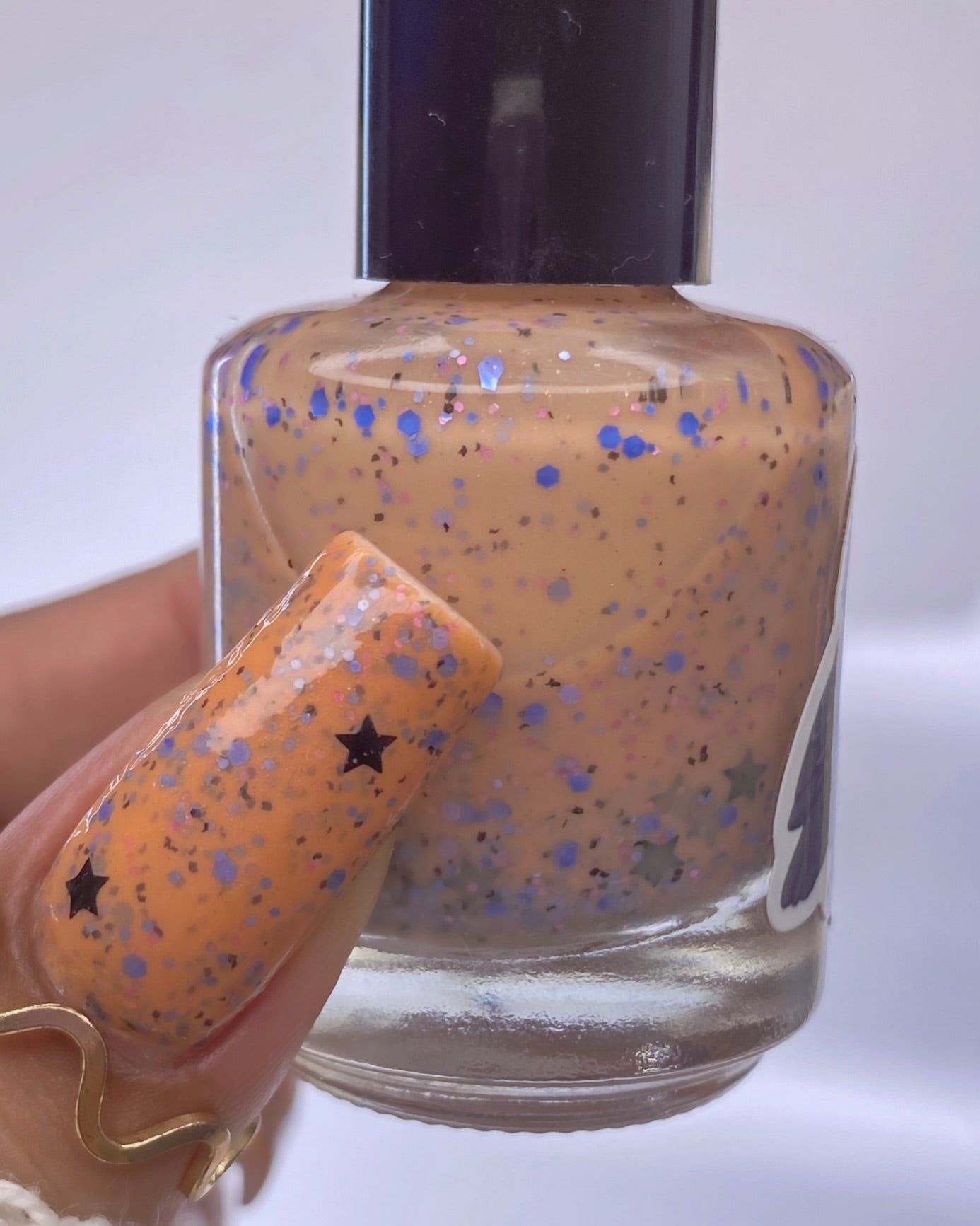 Glowing Eyes Under Her Bed is a glow in the dark crelly! A salmon orange base that glows green with micro holo glitters, black micro flakes, pink and purple glitter hexes along with black stars!