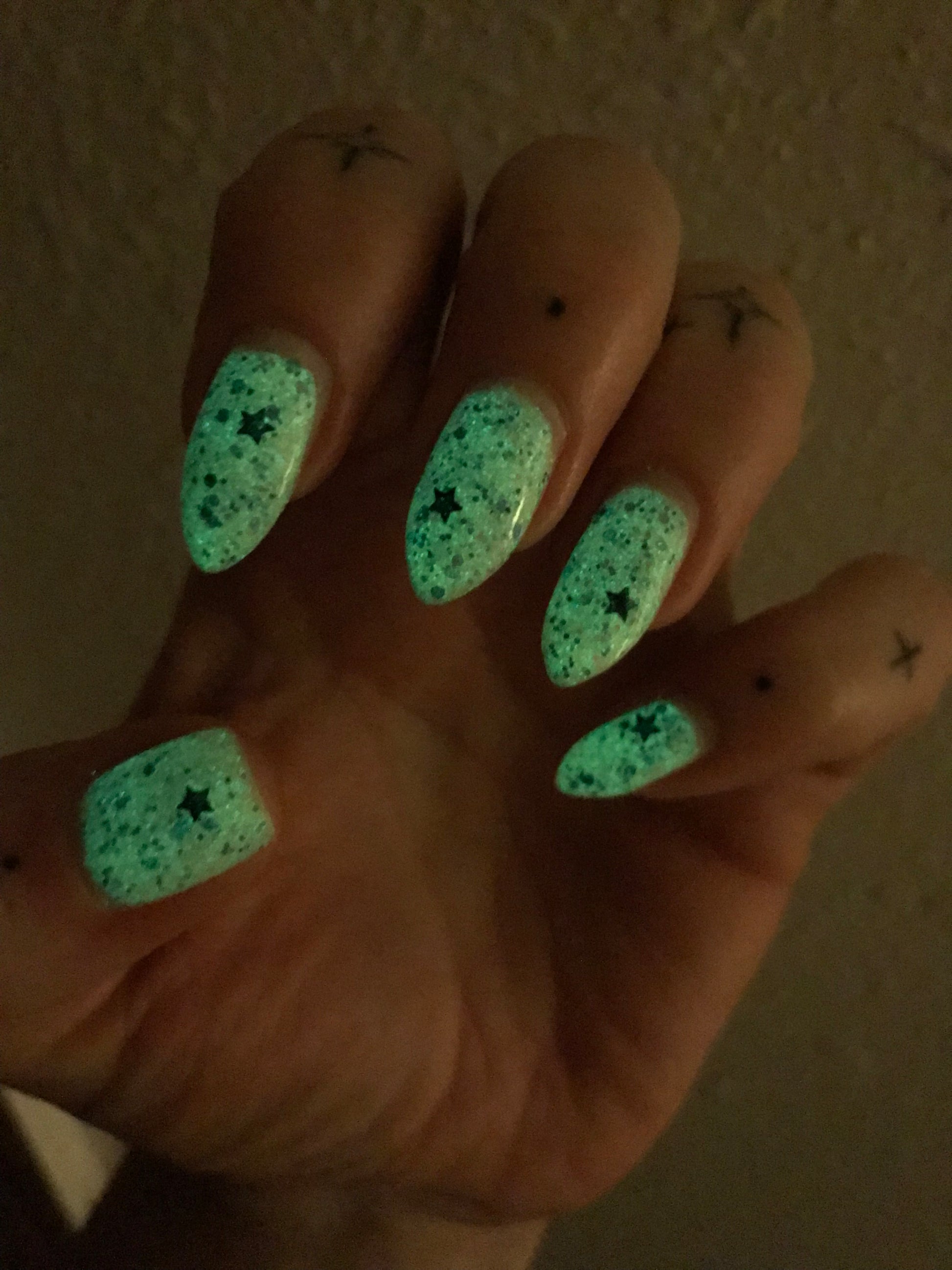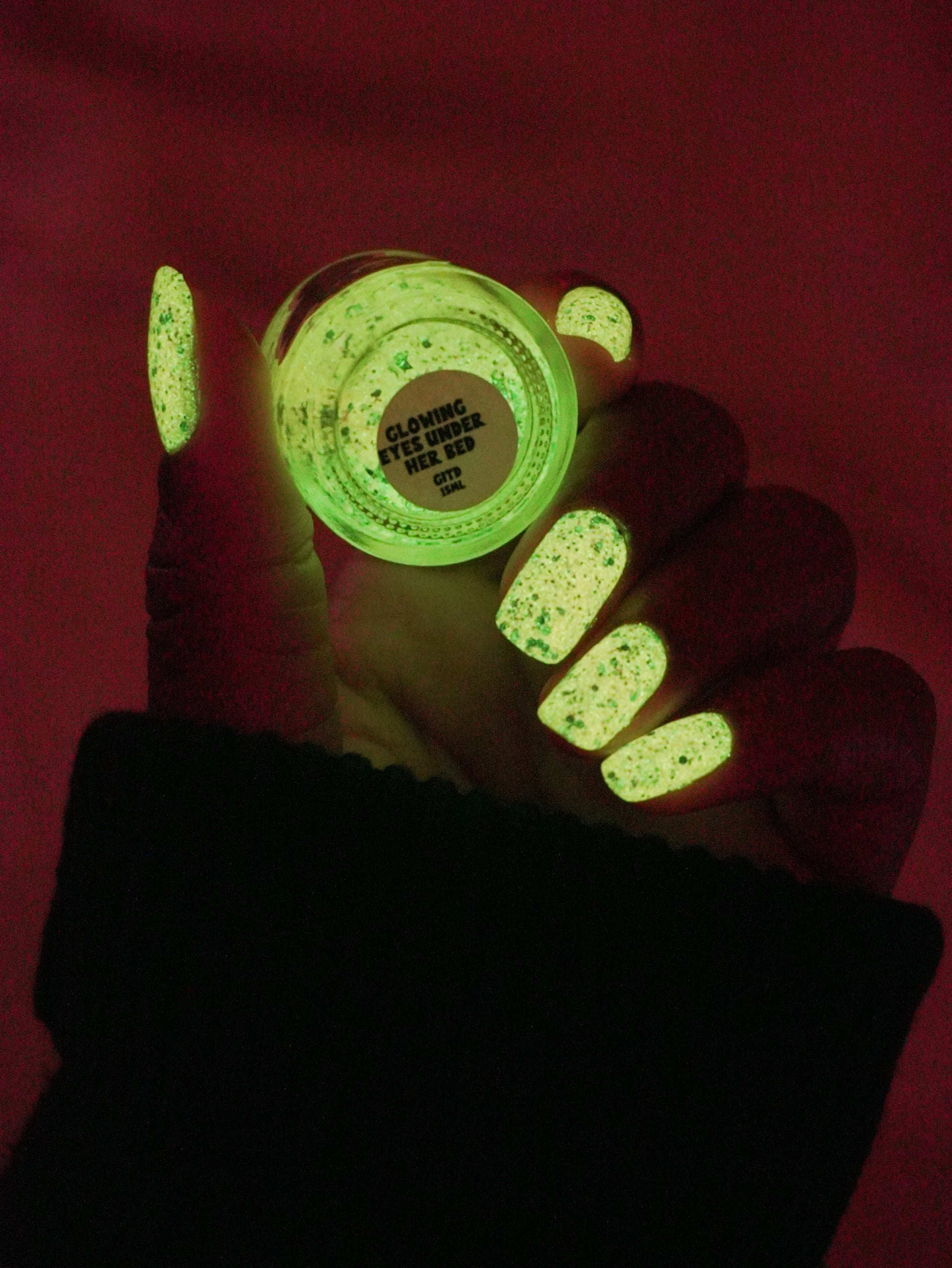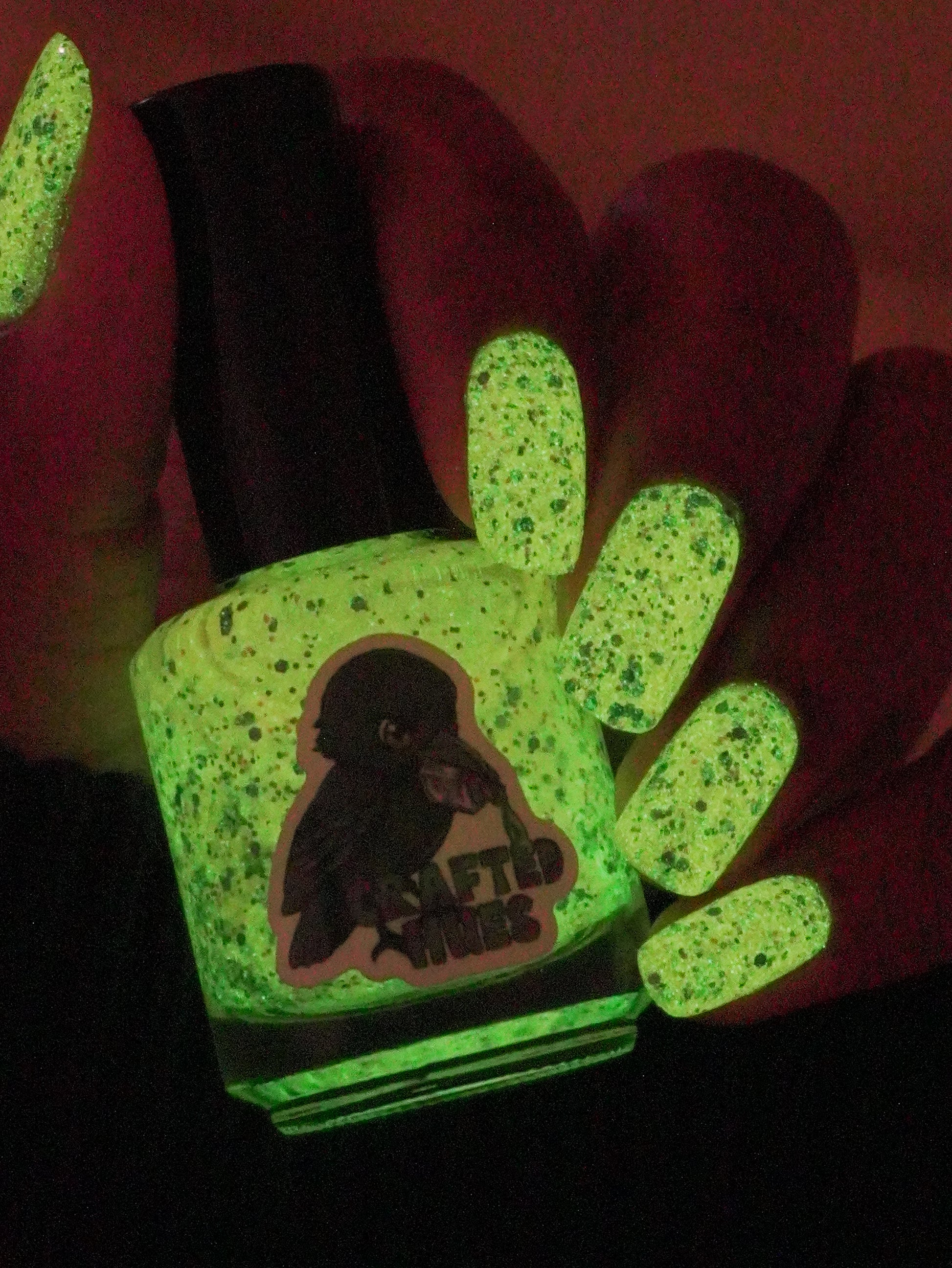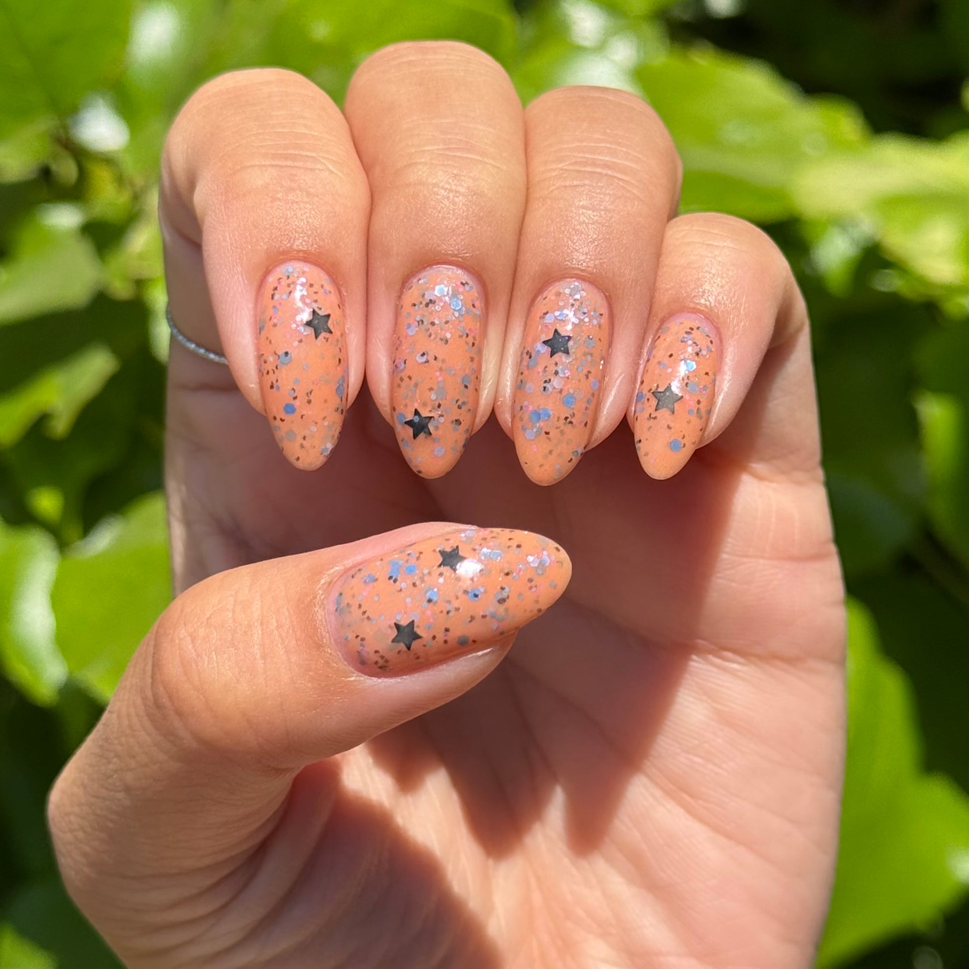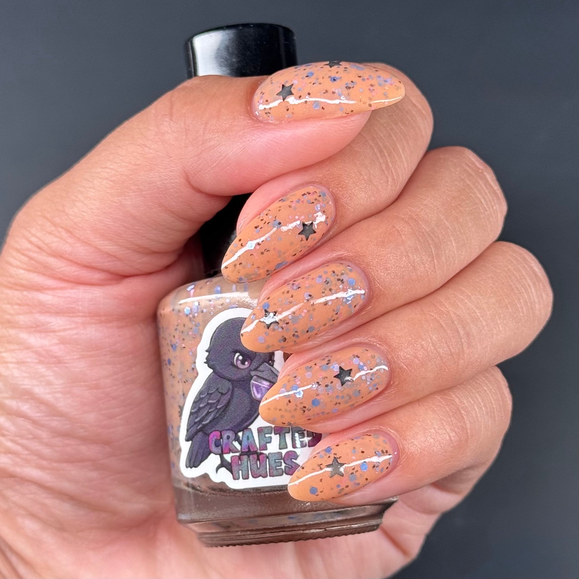Glowing Eyes Under Her Bed is a glow in the dark crelly! A salmon orange base that glows green with micro holo glitters, black micro flakes, pink and purple glitter hexes along with black stars!
