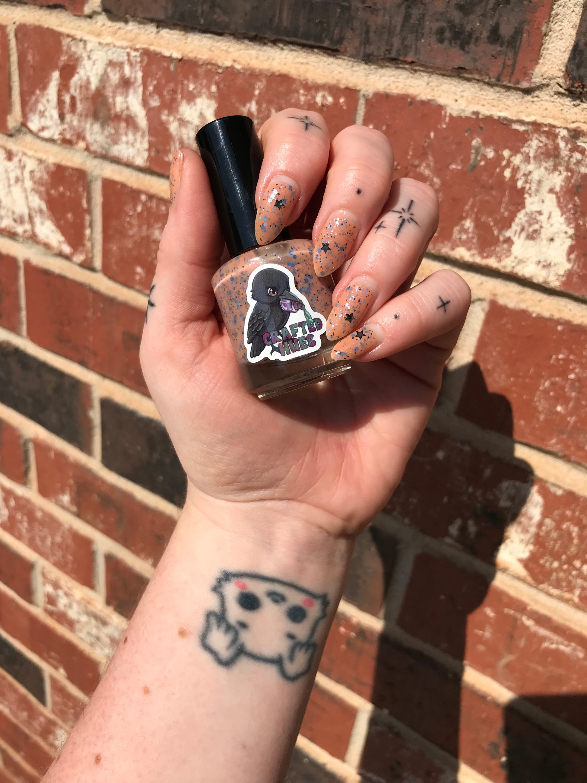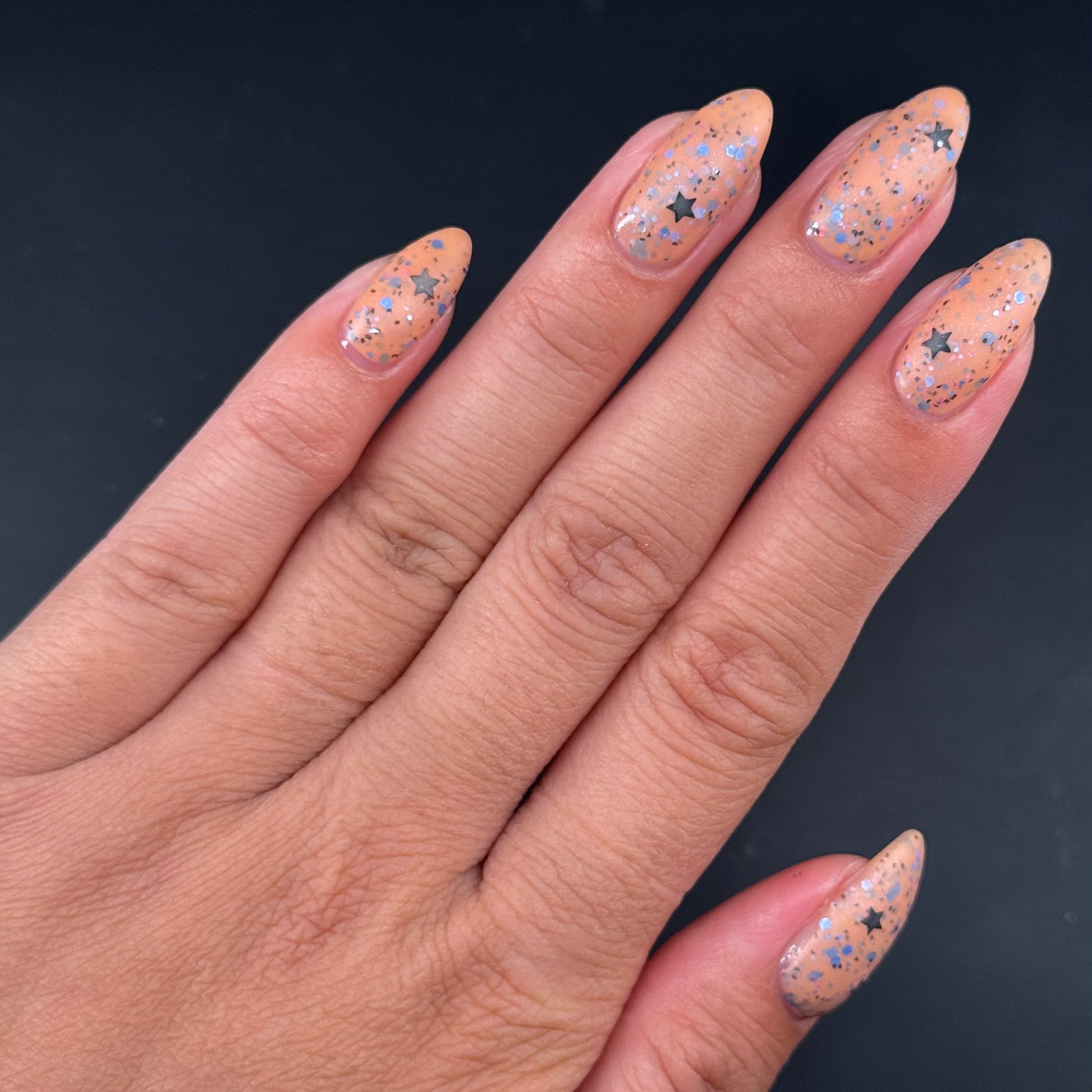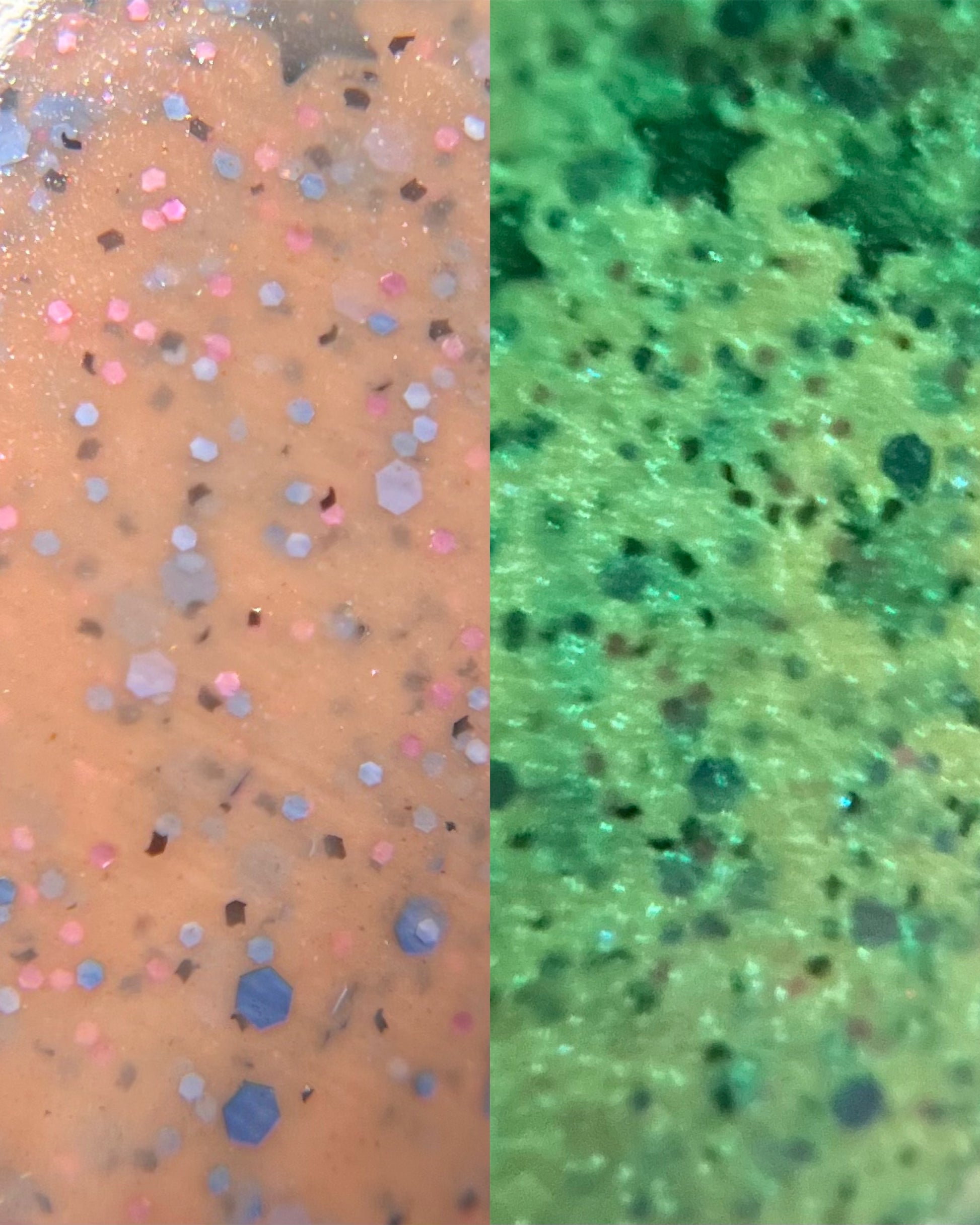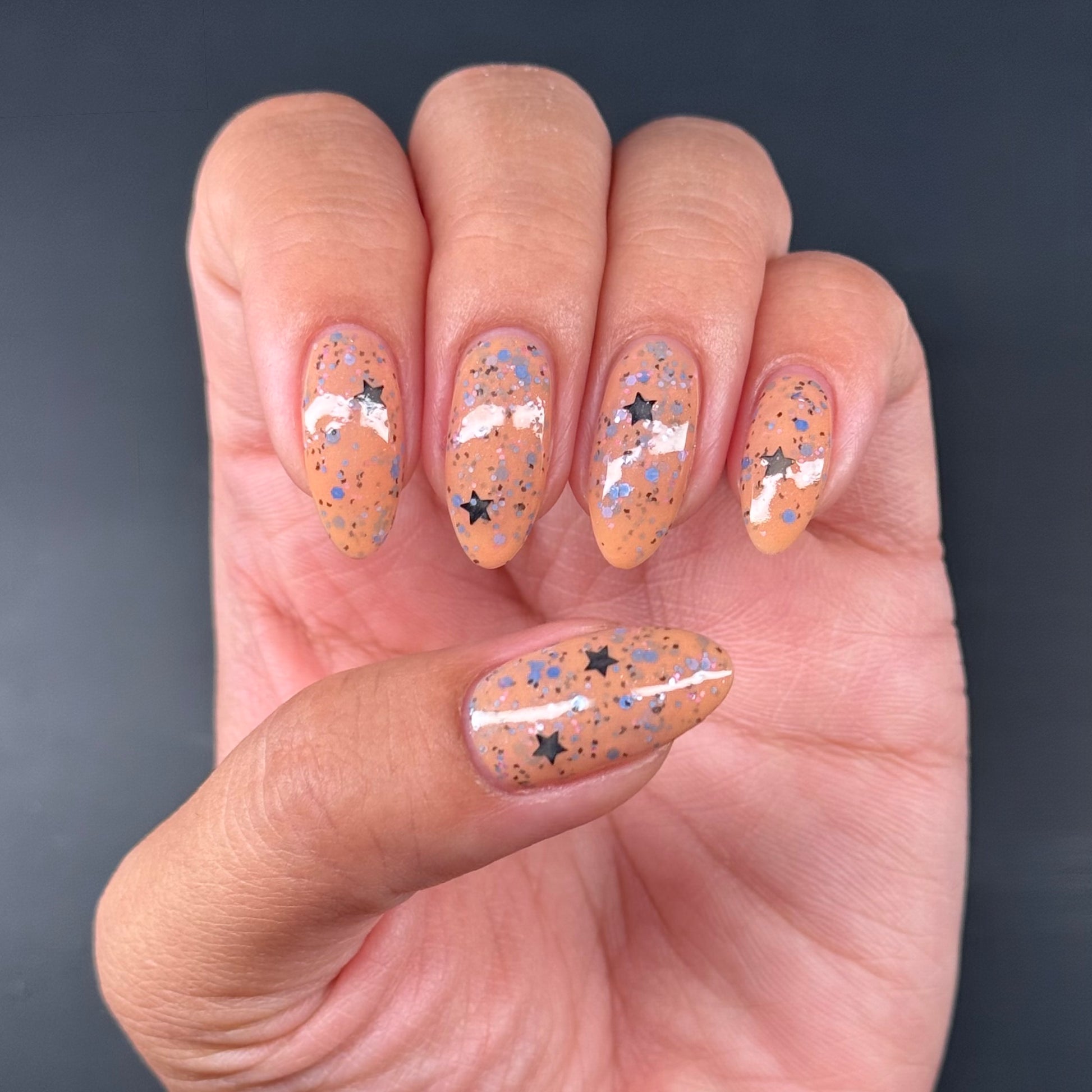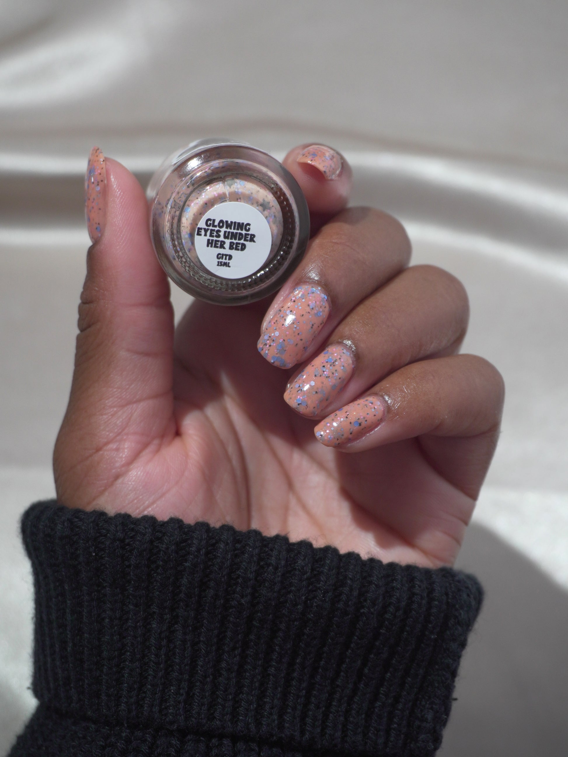 Glowing Eyes Under Her Bed is a glow in the dark crelly! A salmon orange base that glows green with micro holo glitters, black micro flakes, pink and purple glitter hexes along with black stars!