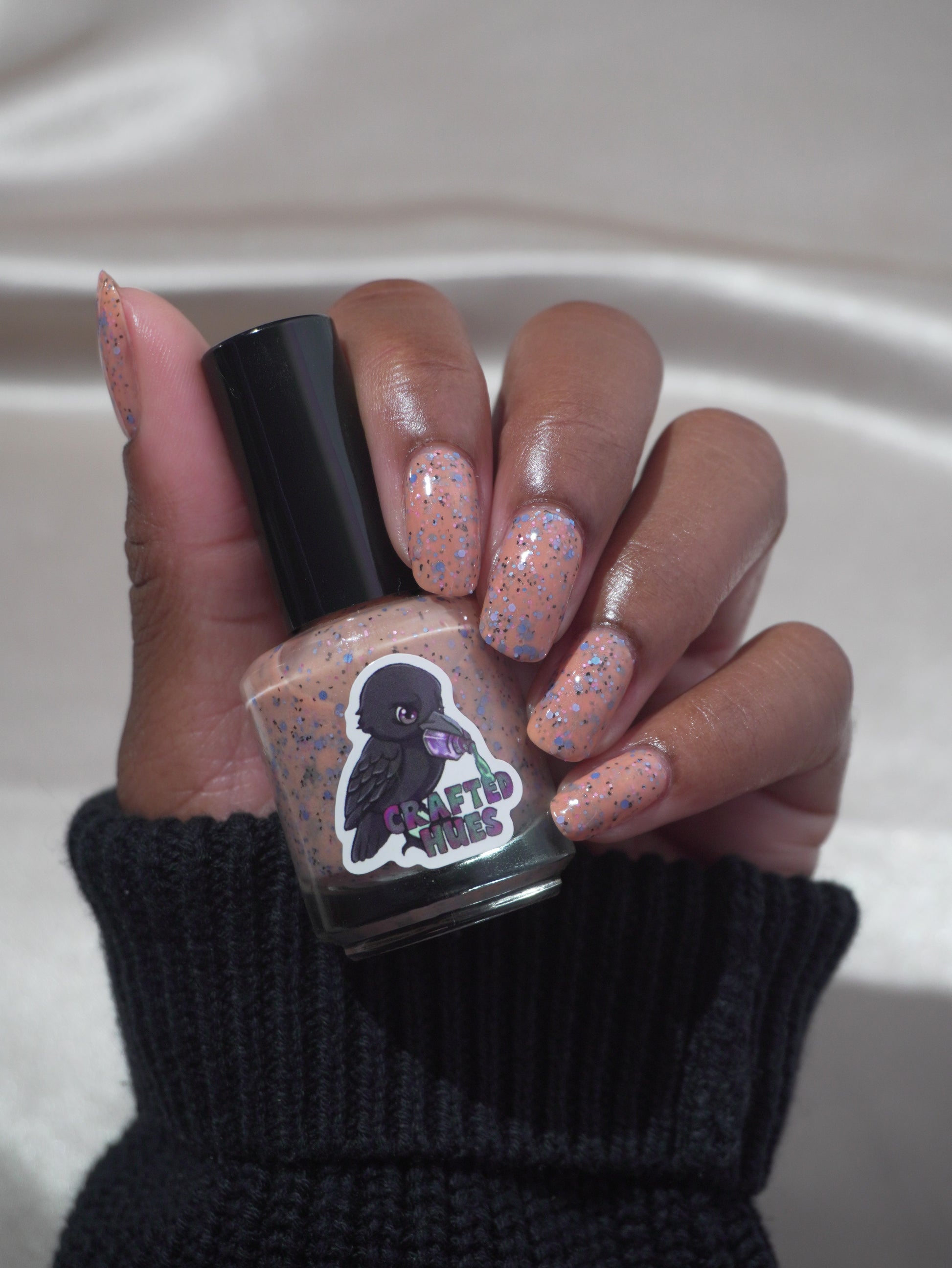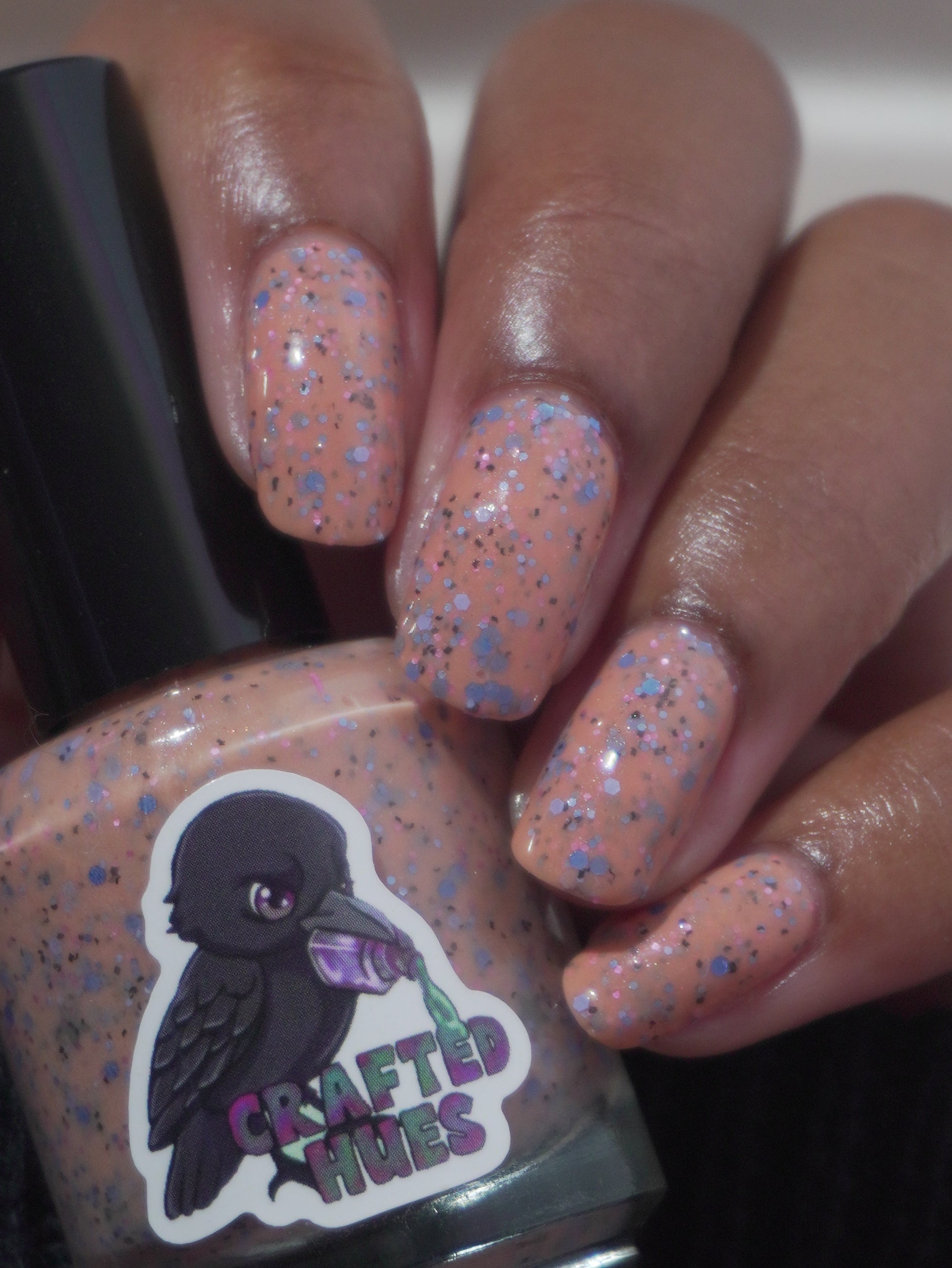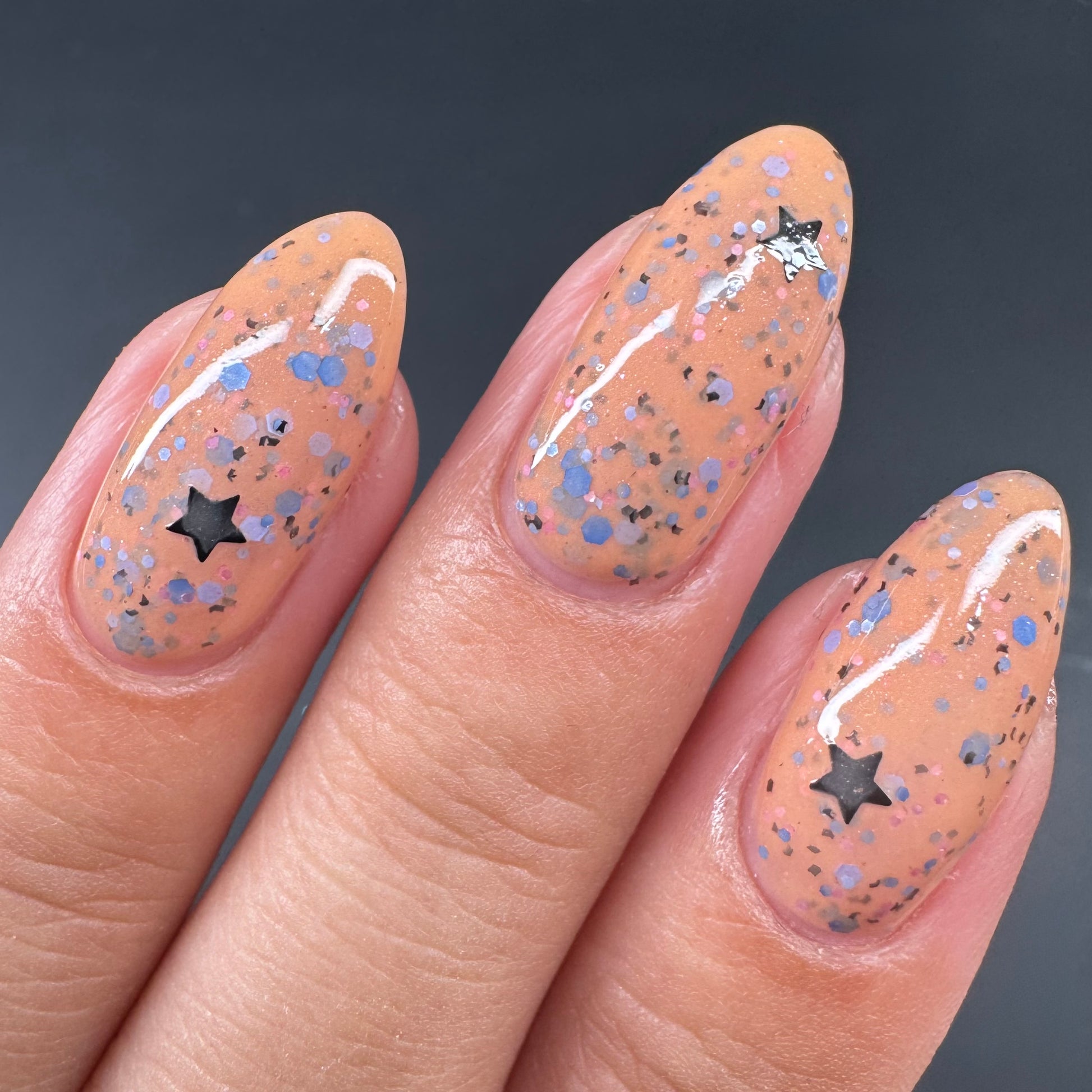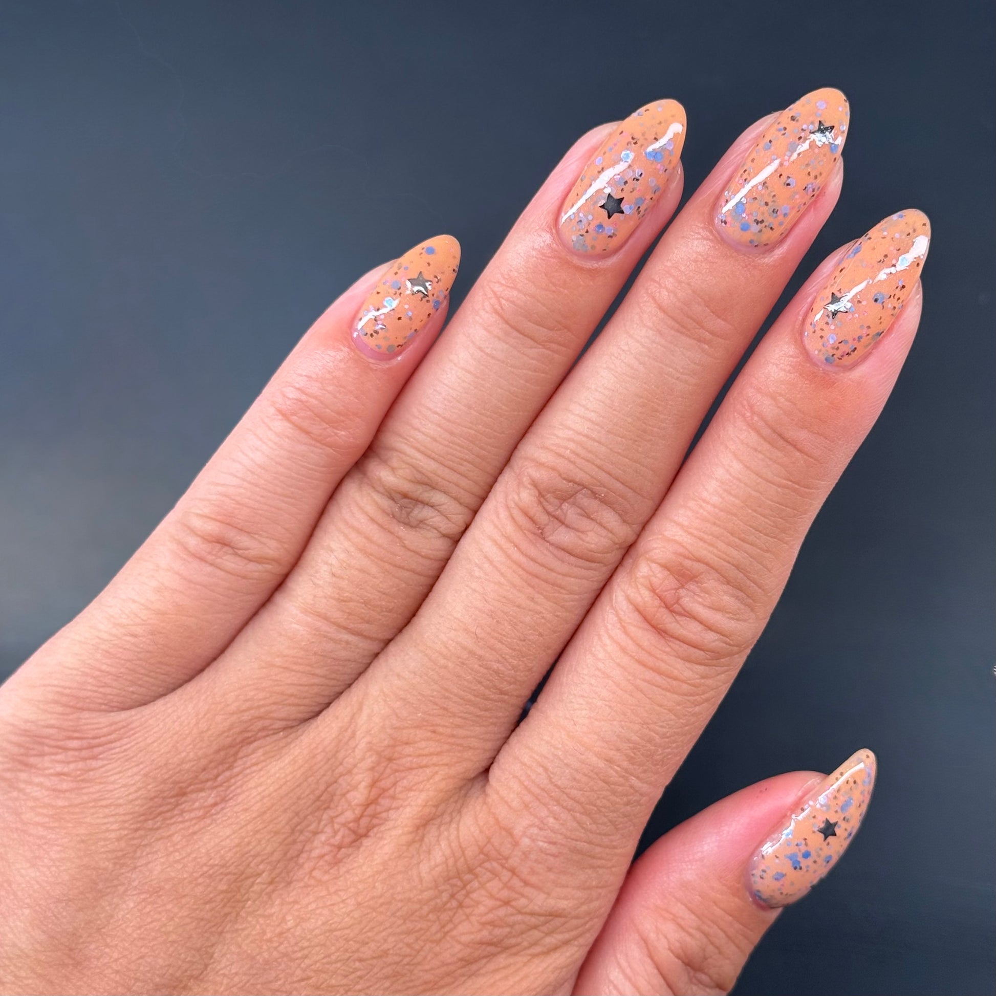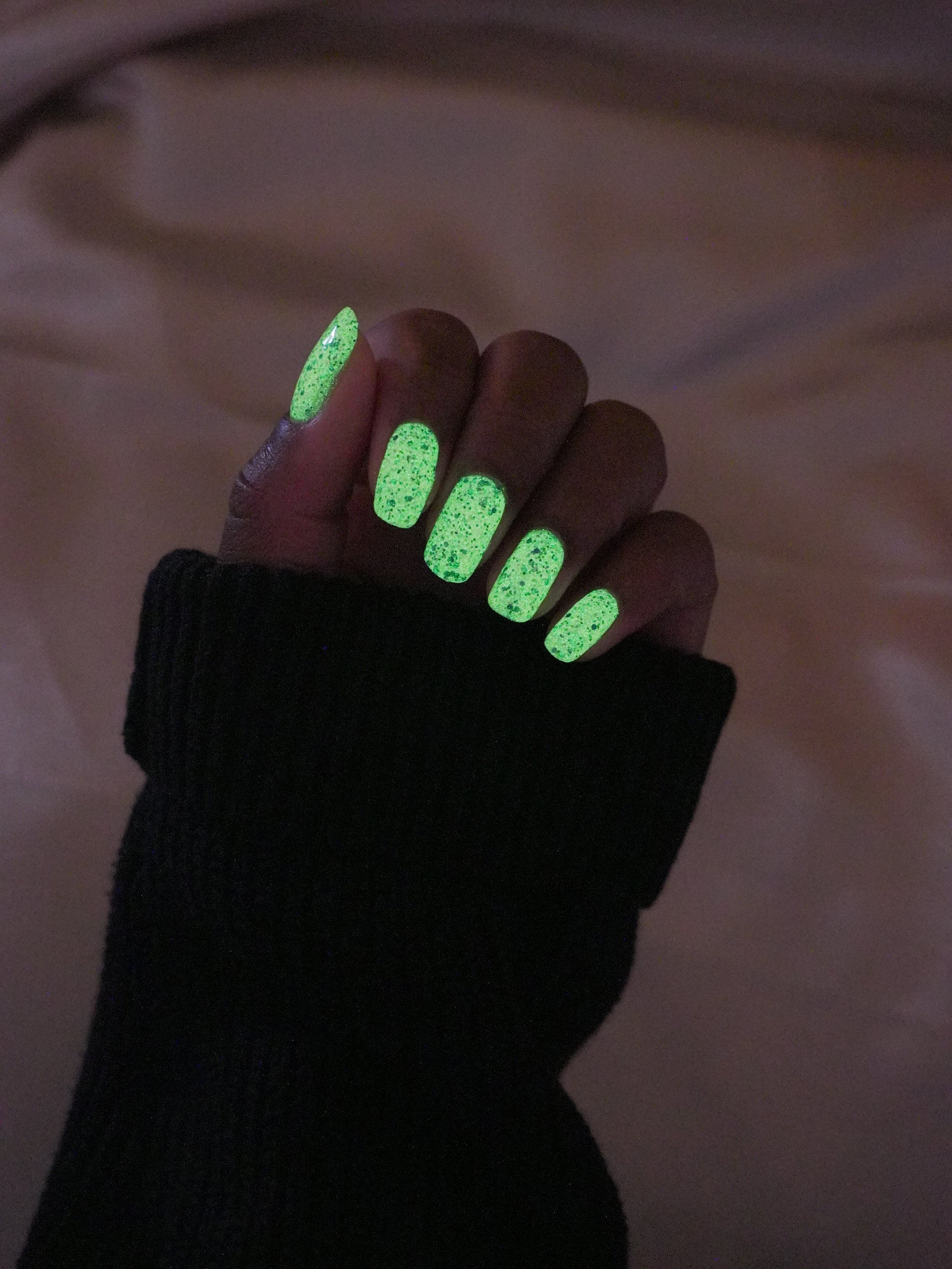 Glowing Eyes Under Her Bed is a glow in the dark crelly! A salmon orange base that glows green with micro holo glitters, black micro flakes, pink and purple glitter hexes along with black stars!