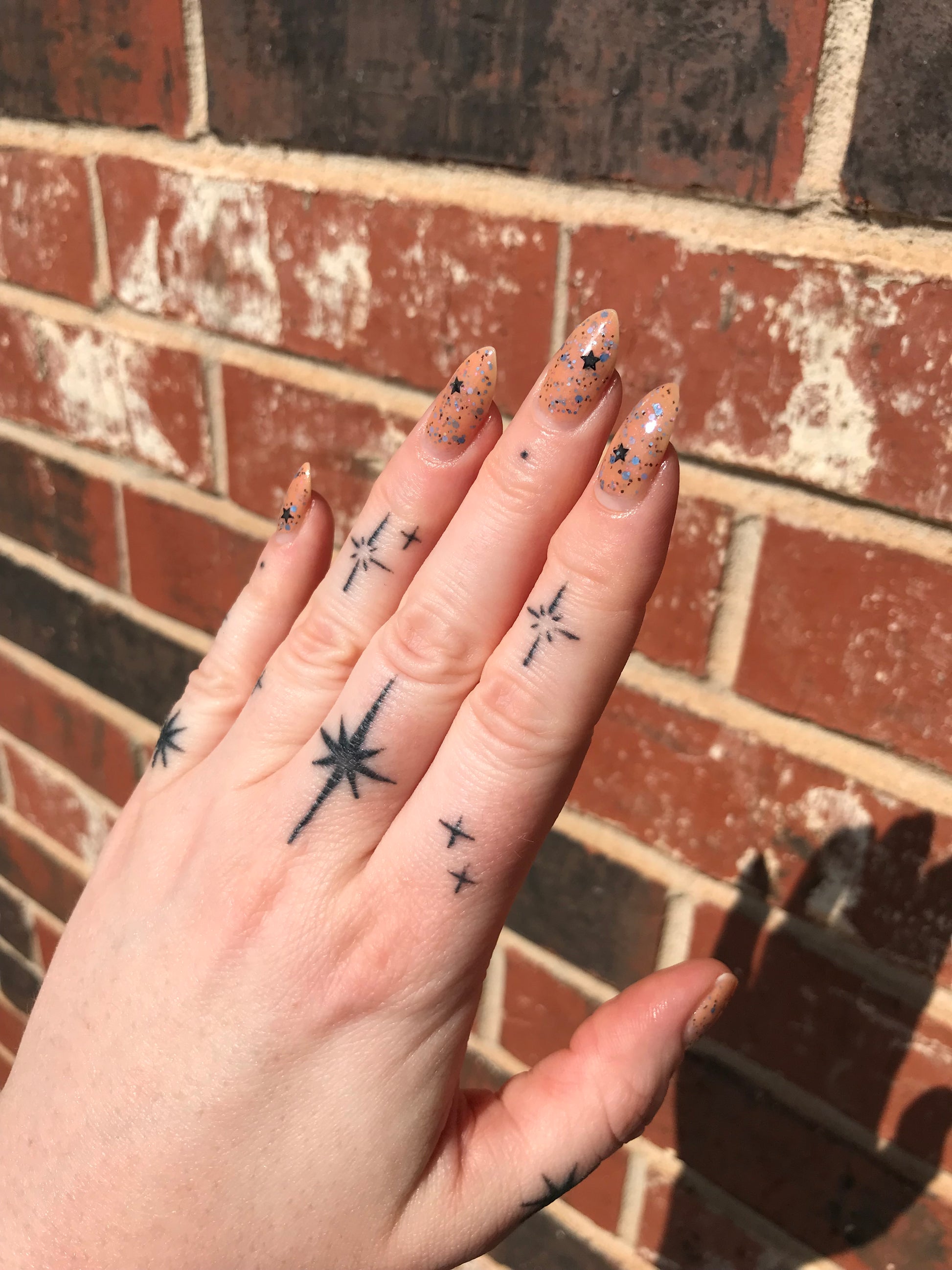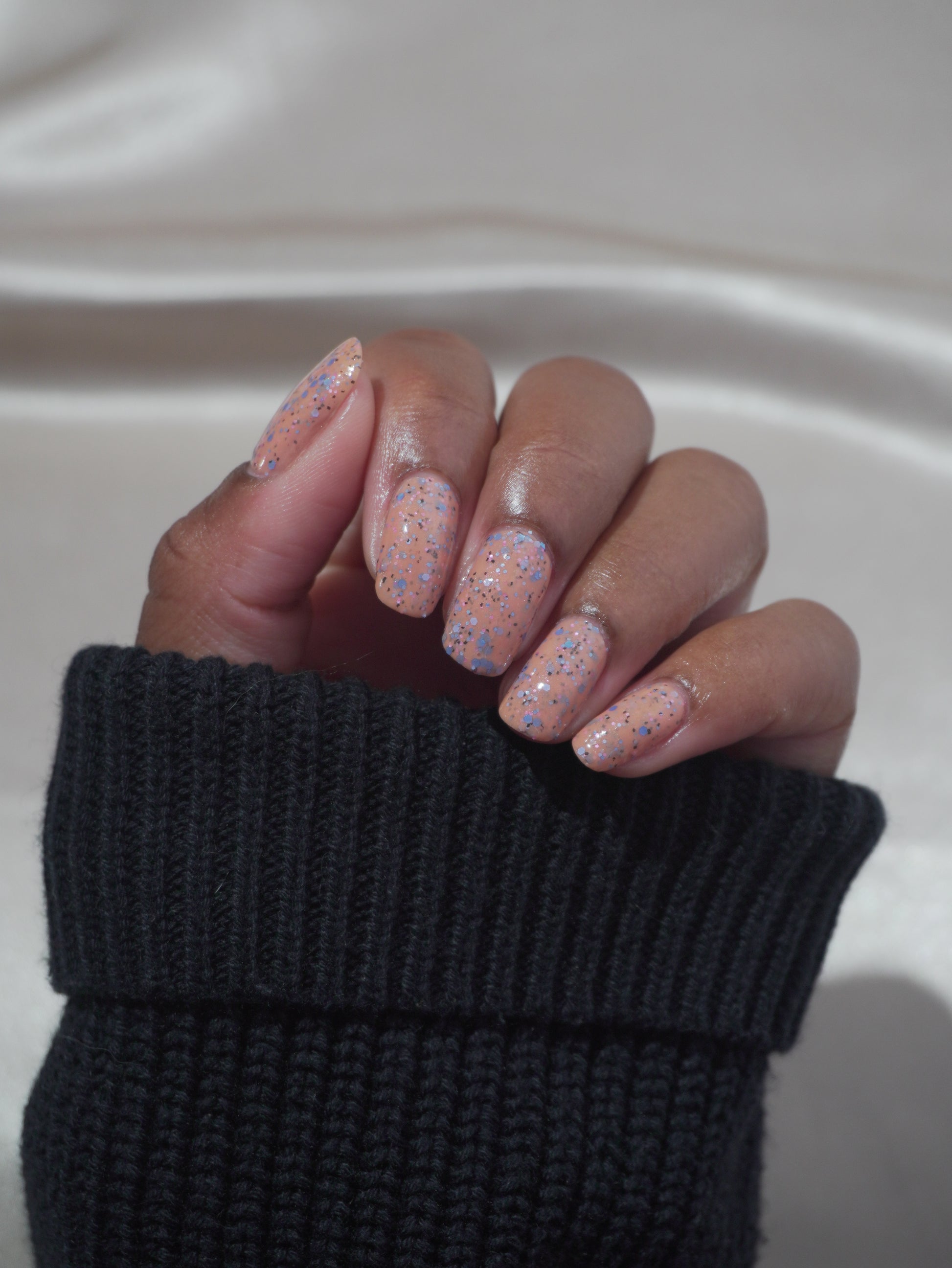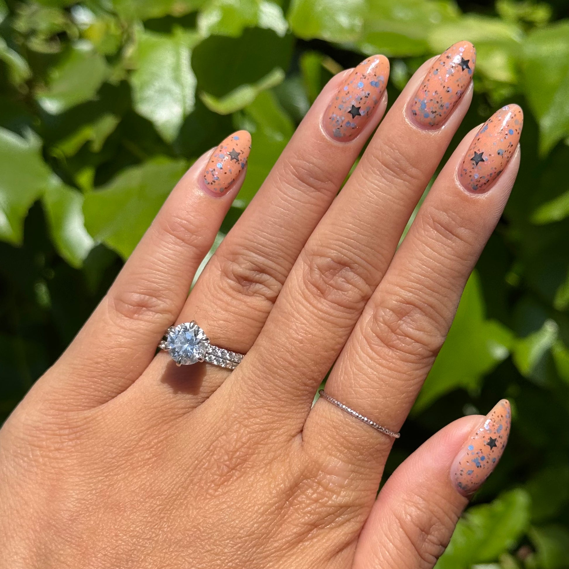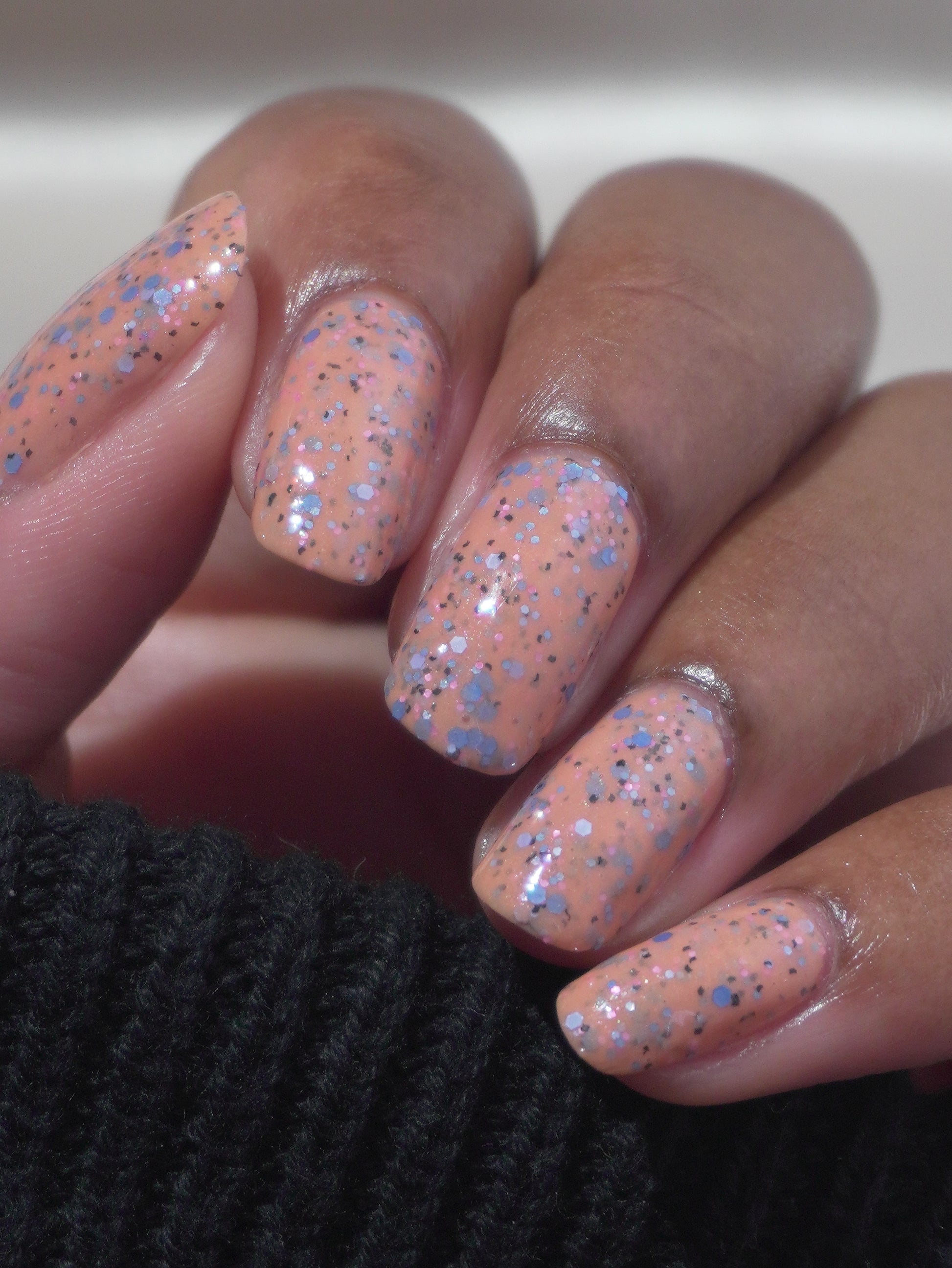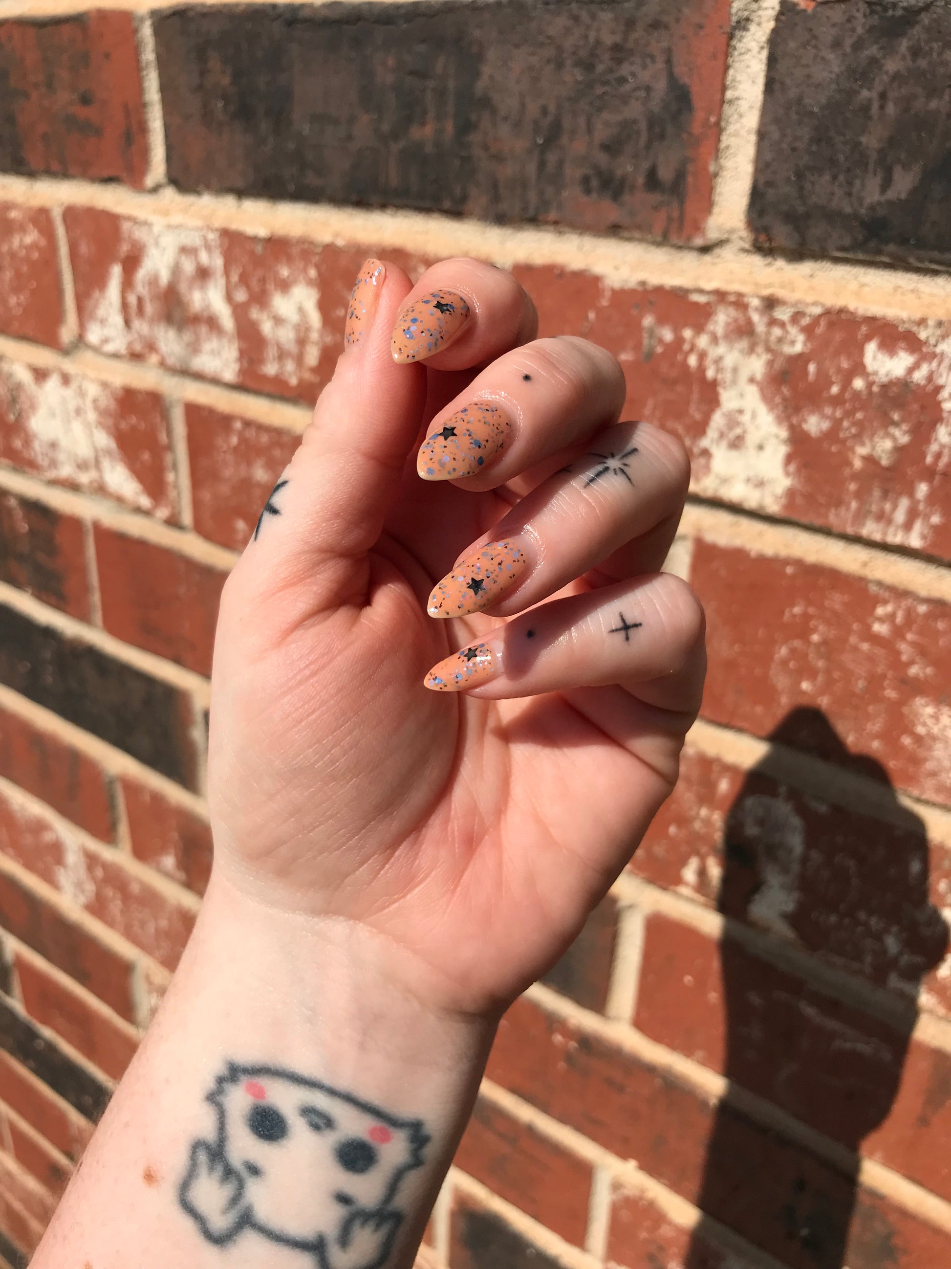 Glowing Eyes Under Her Bed is a glow in the dark crelly! A salmon orange base that glows green with micro holo glitters, black micro flakes, pink and purple glitter hexes along with black stars!
