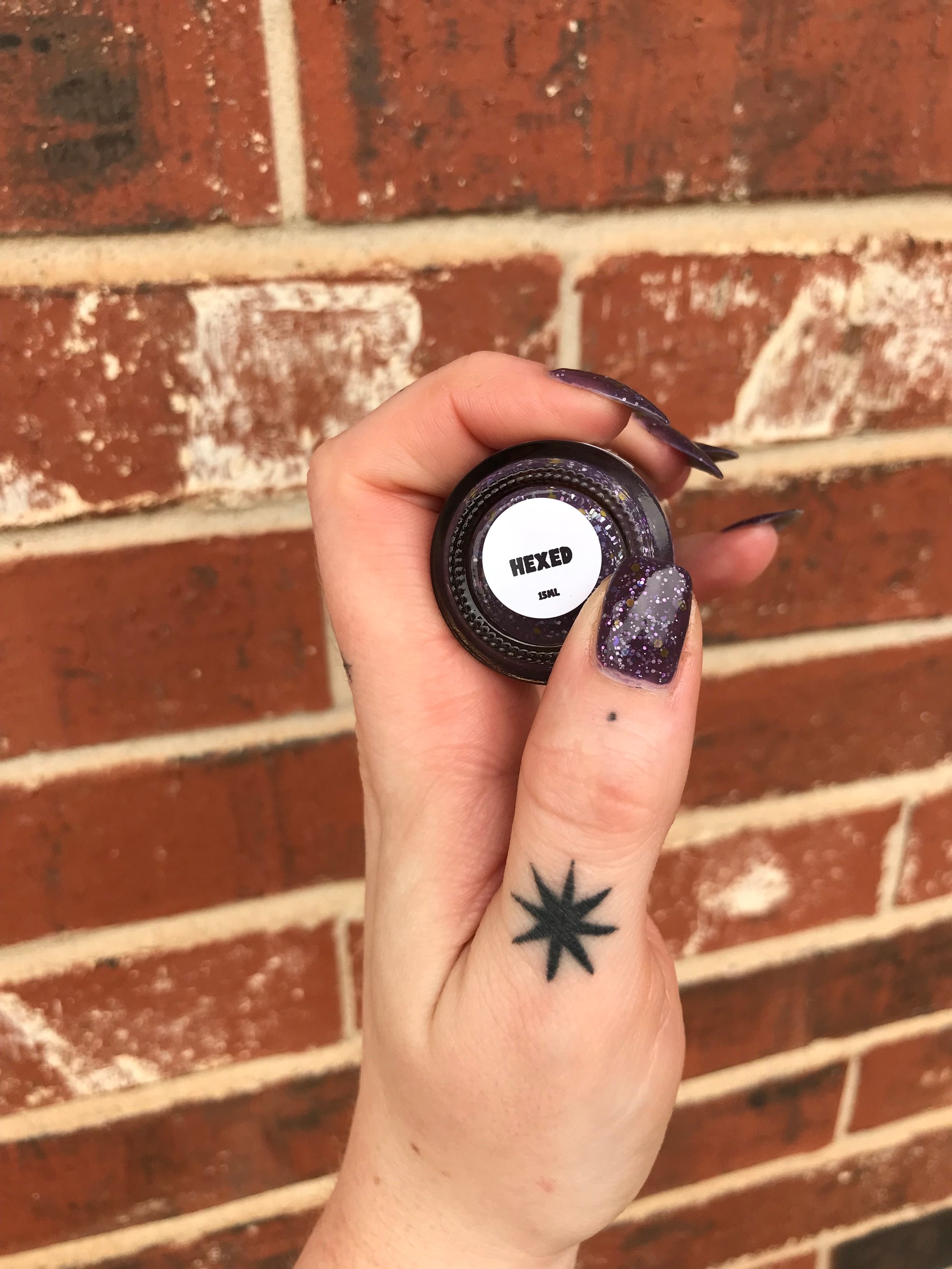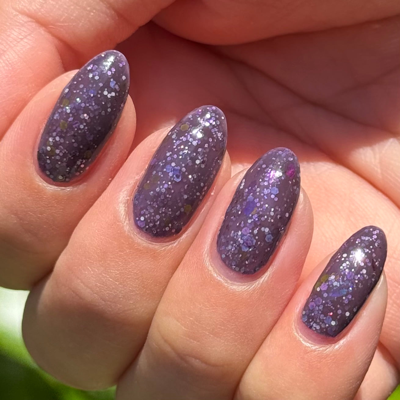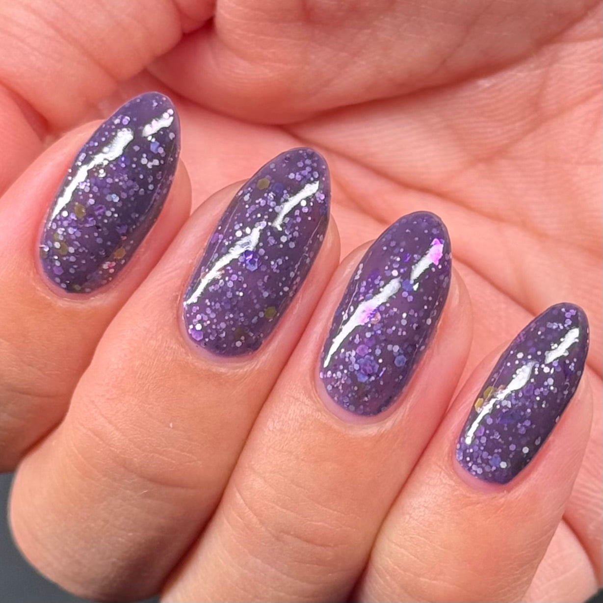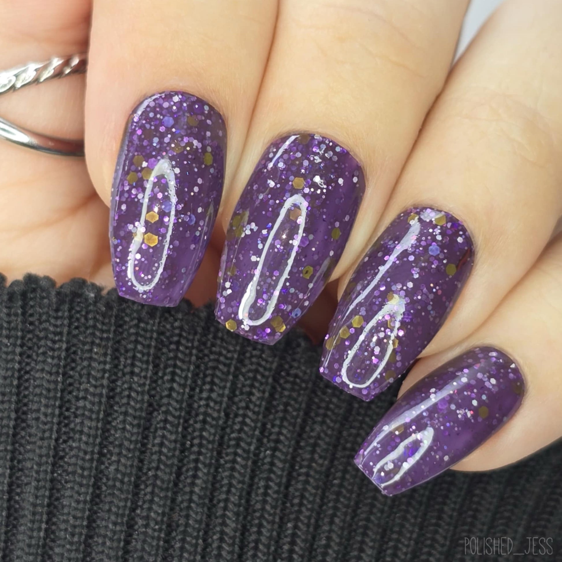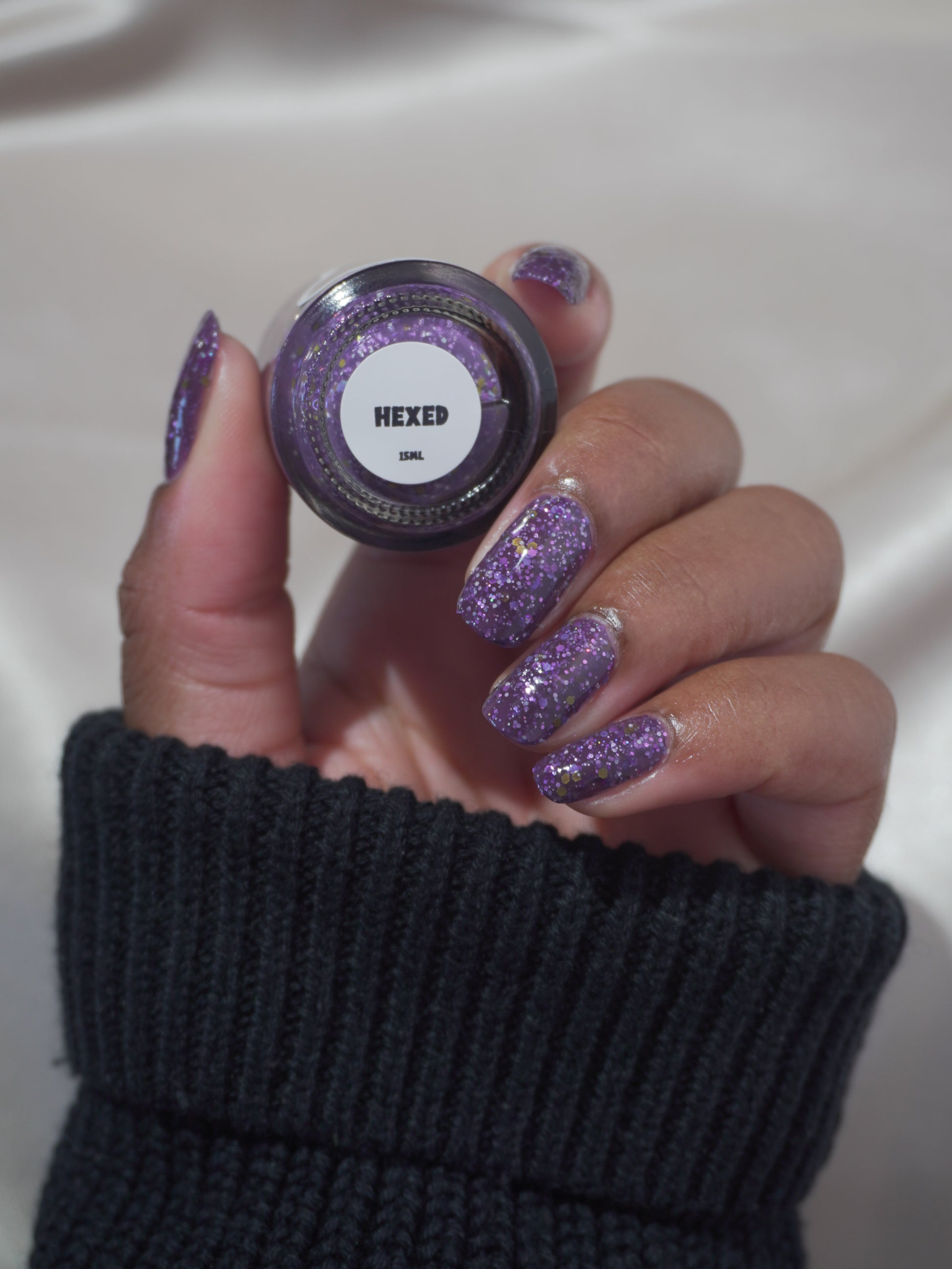 Hexed is a dark purple with a subtle white shimmer, various shades of purple glitters and a pop of green hex glitter.