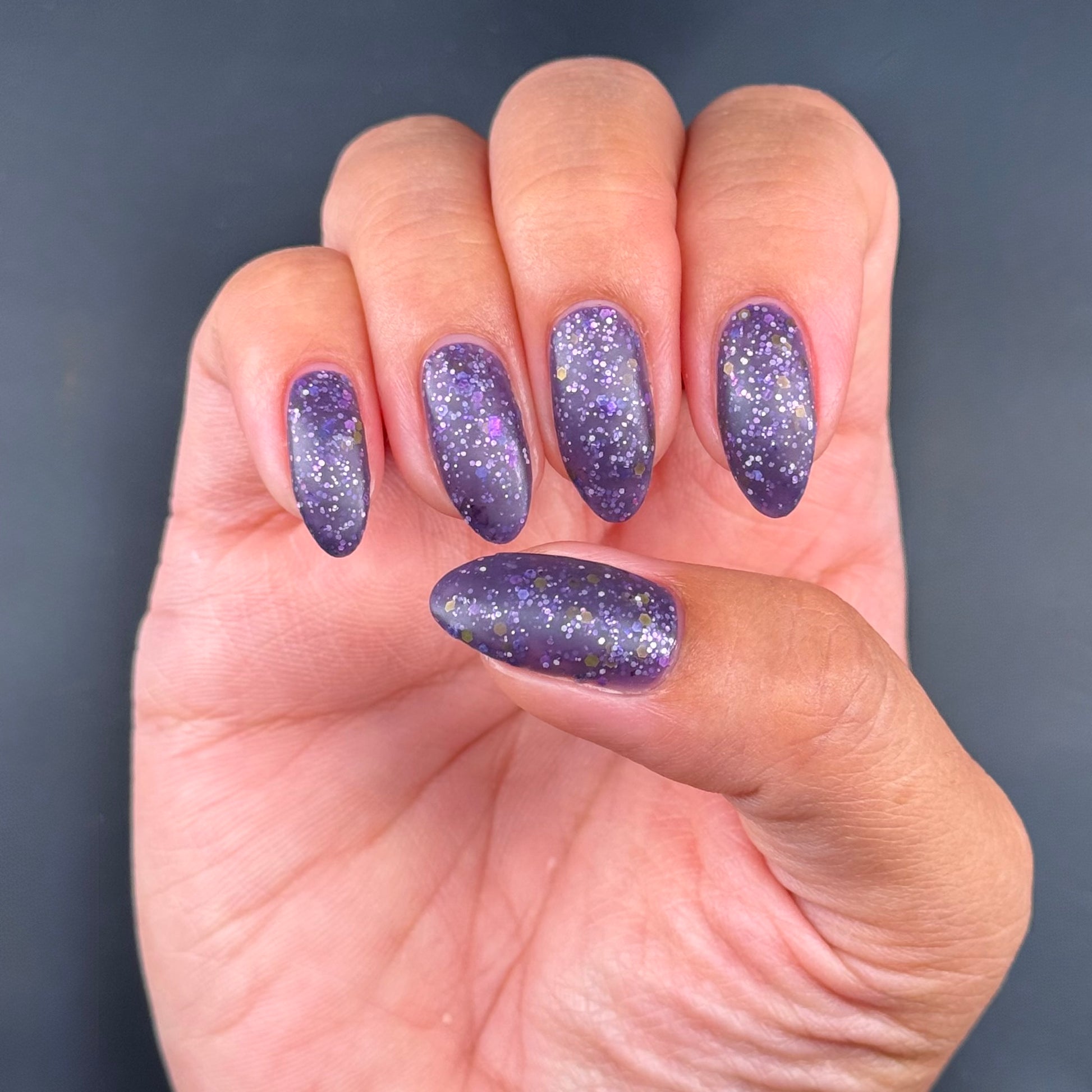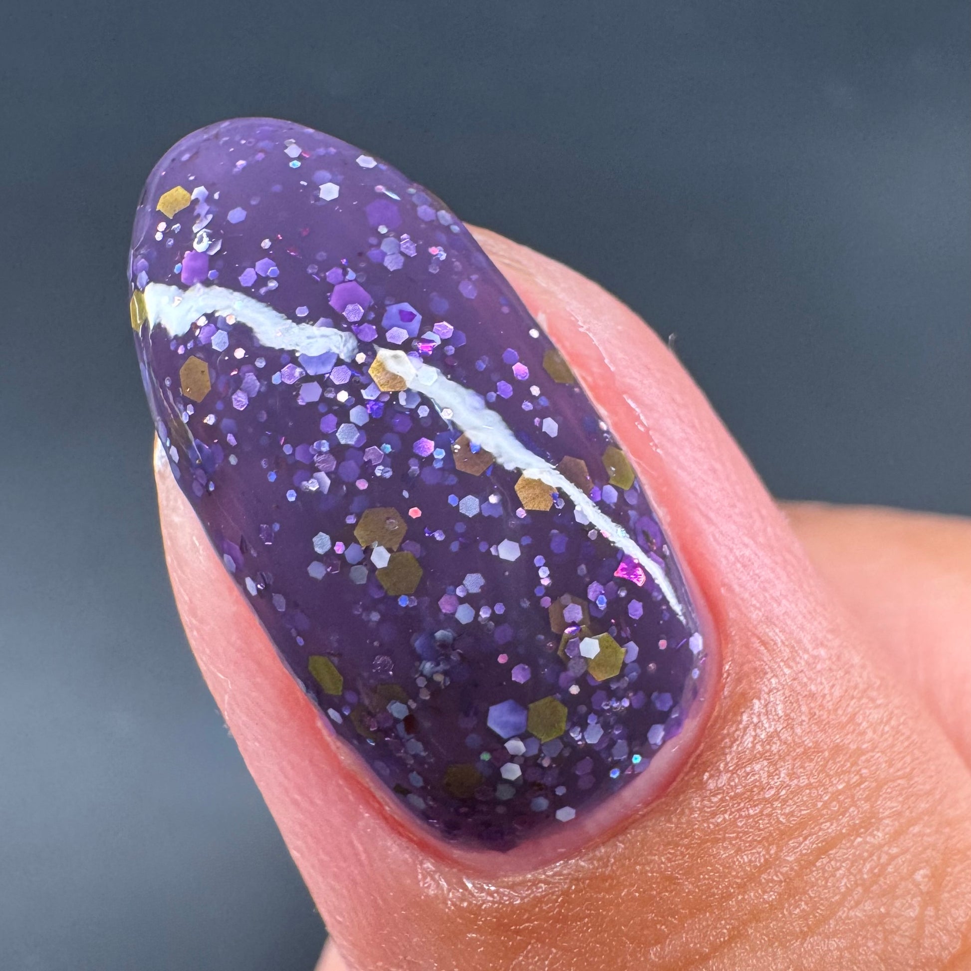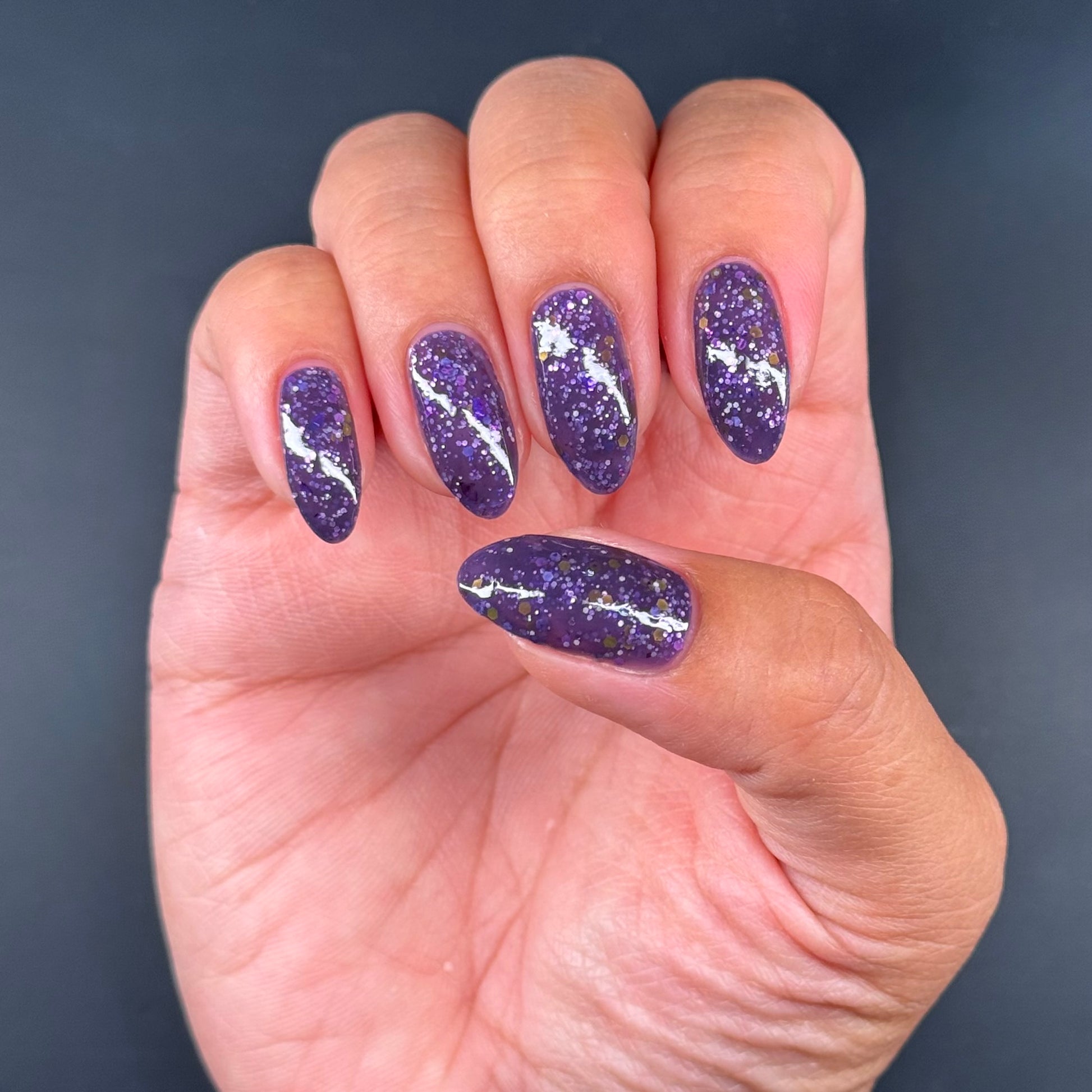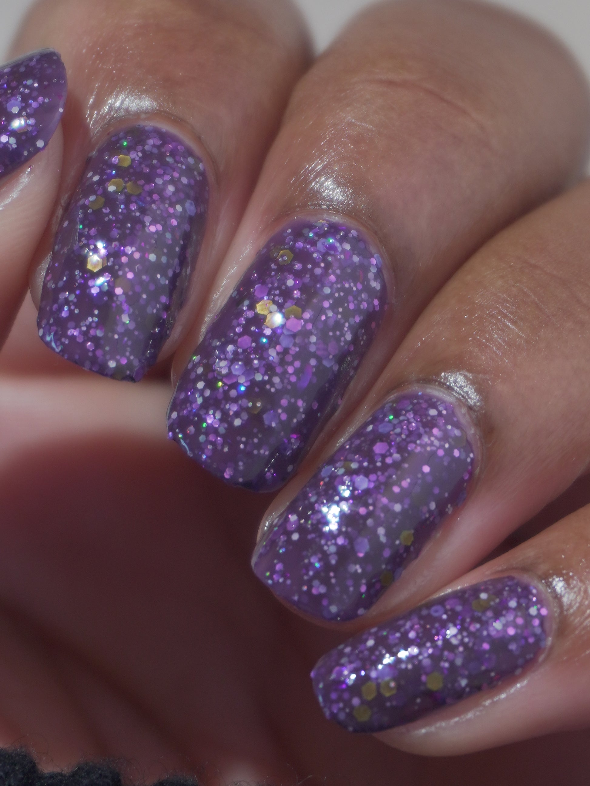Hexed is a dark purple with a subtle white shimmer, various shades of purple glitters and a pop of green hex glitter.
