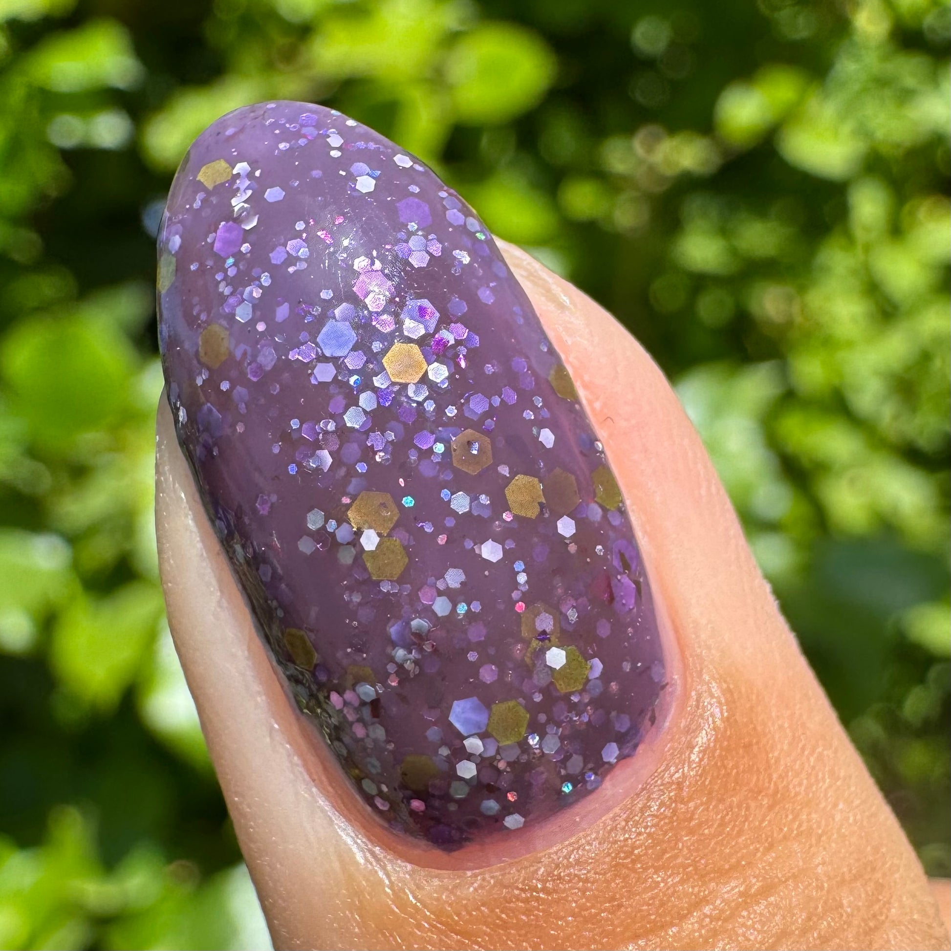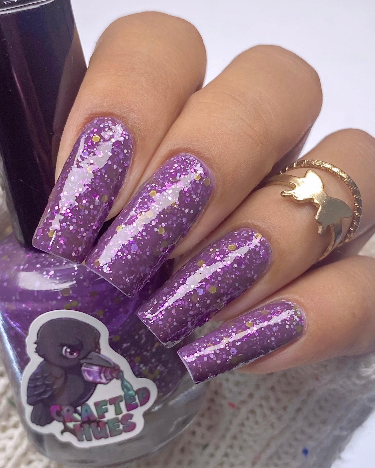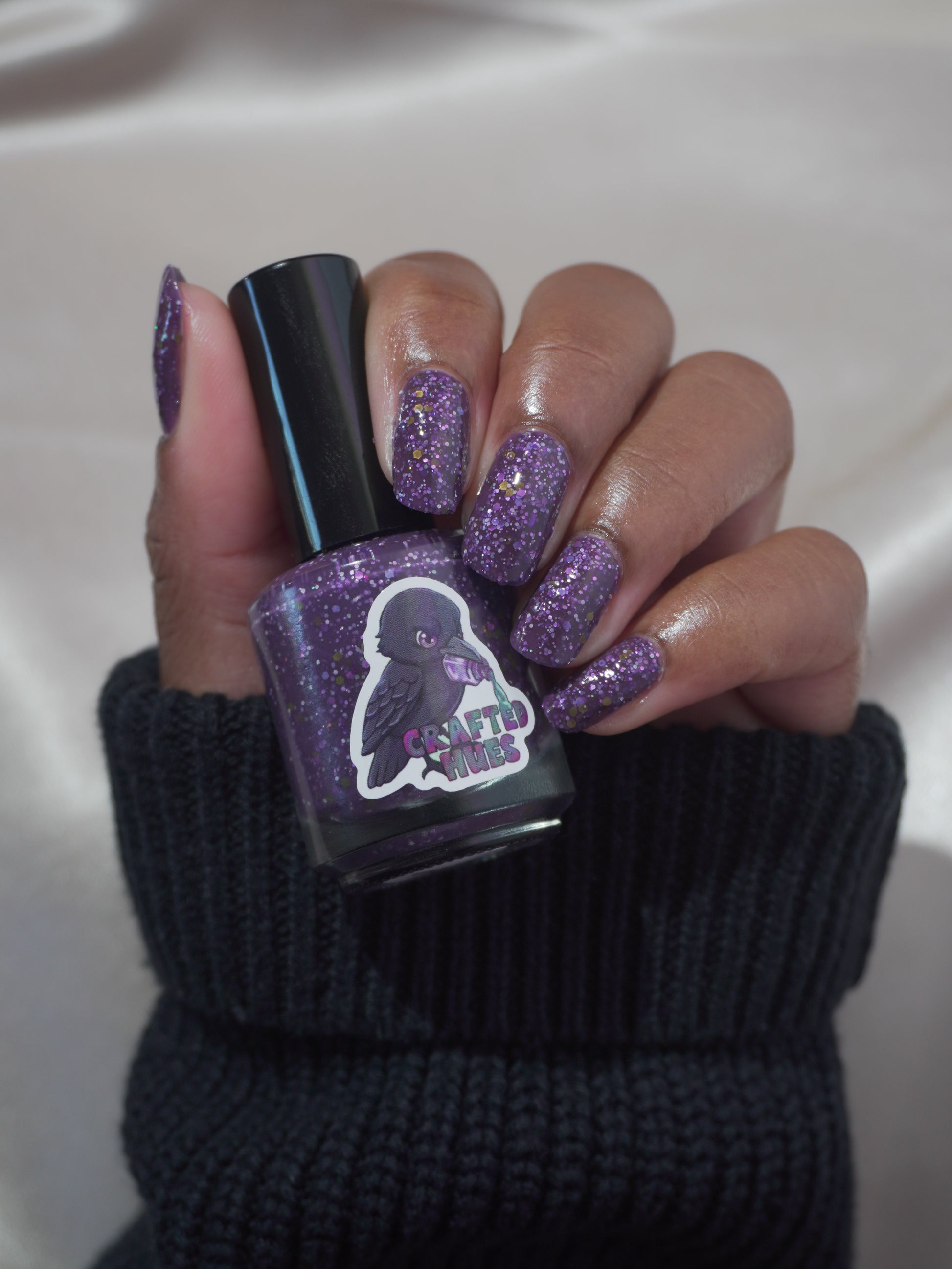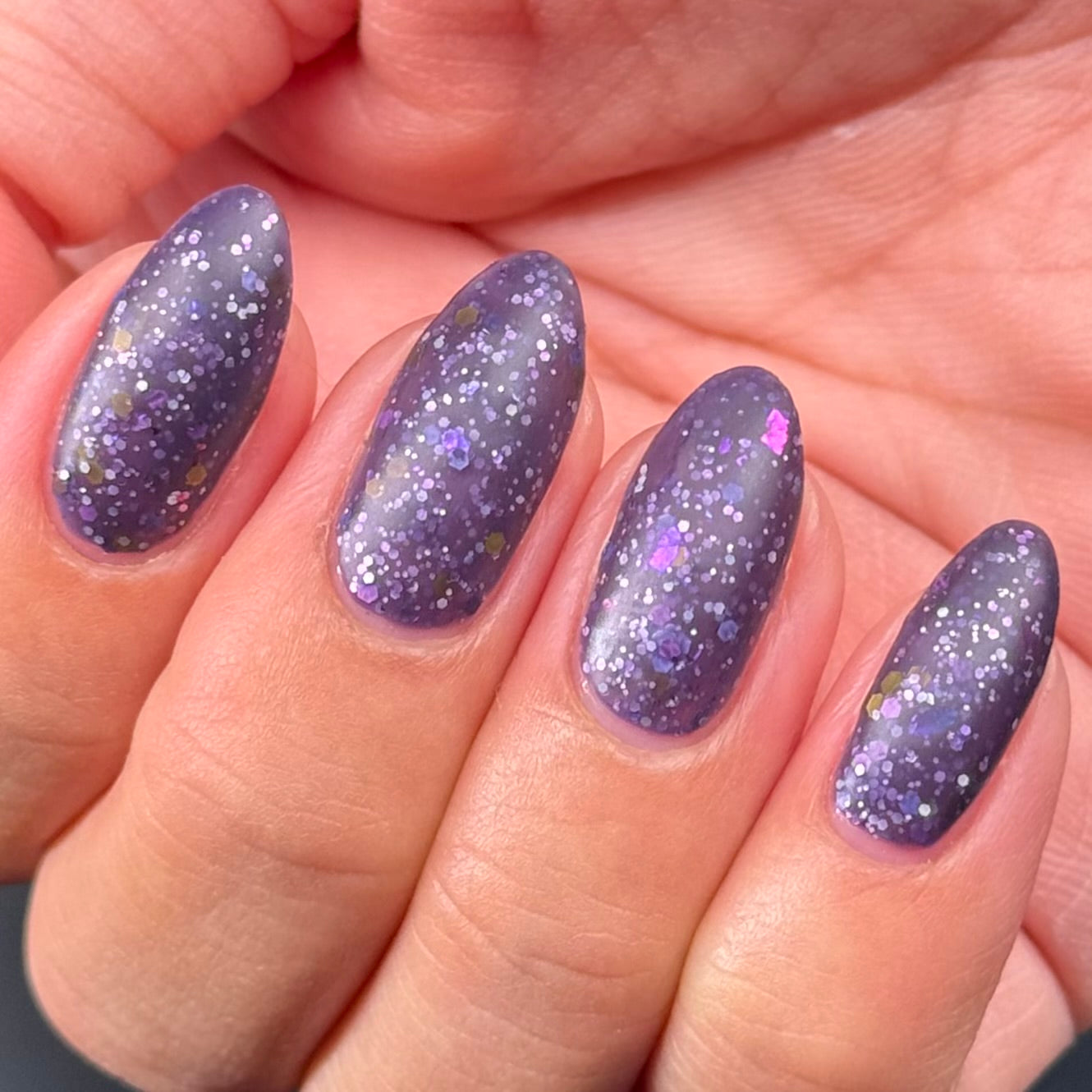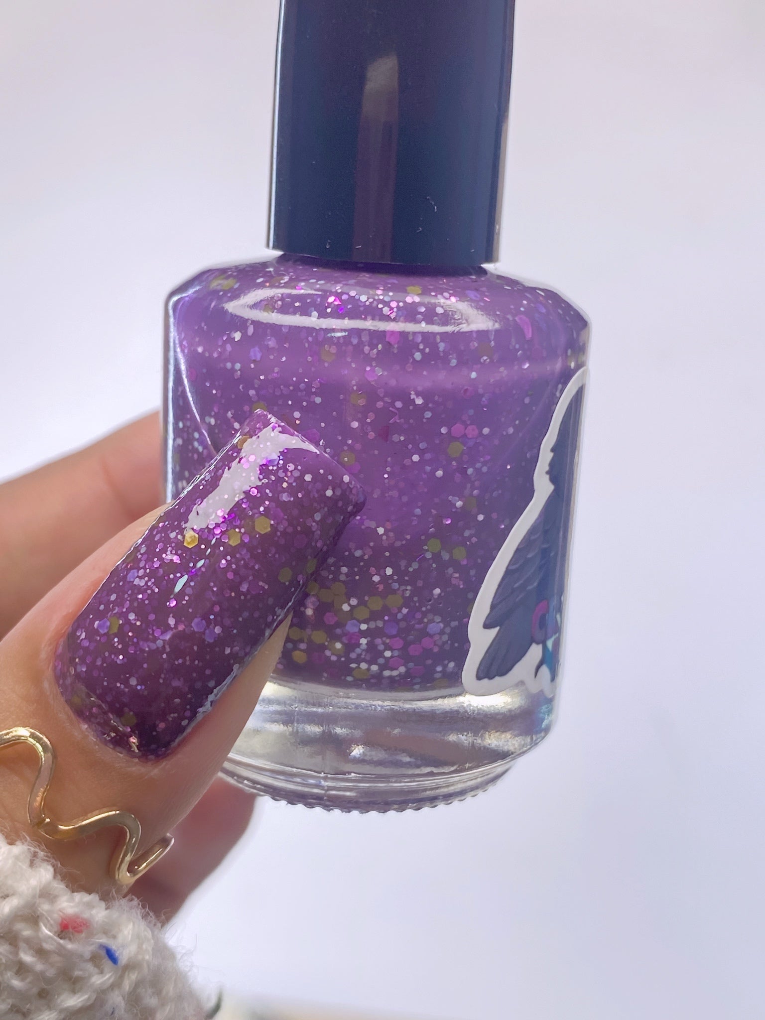 Hexed is a dark purple with a subtle white shimmer, various shades of purple glitters and a pop of green hex glitter.