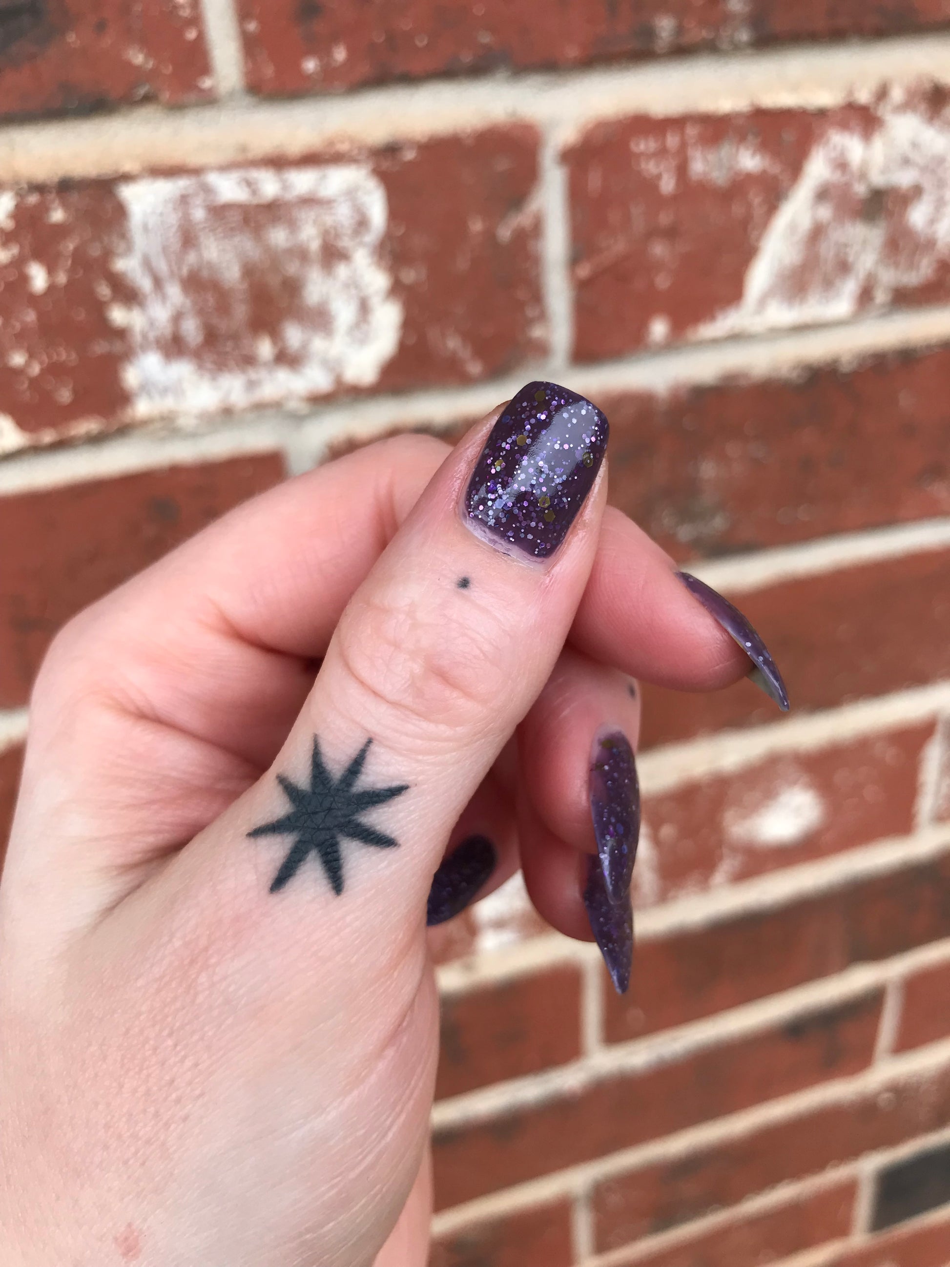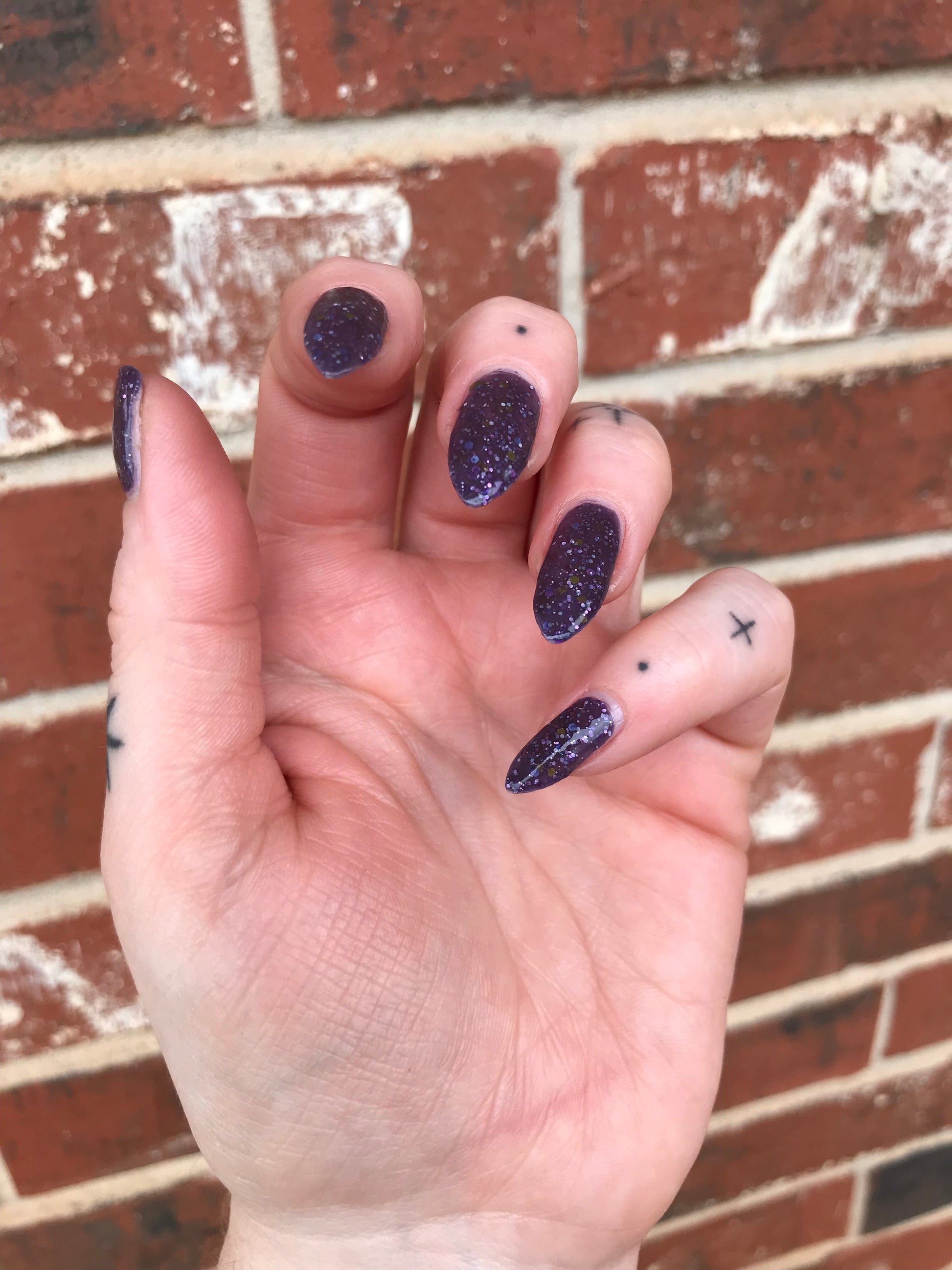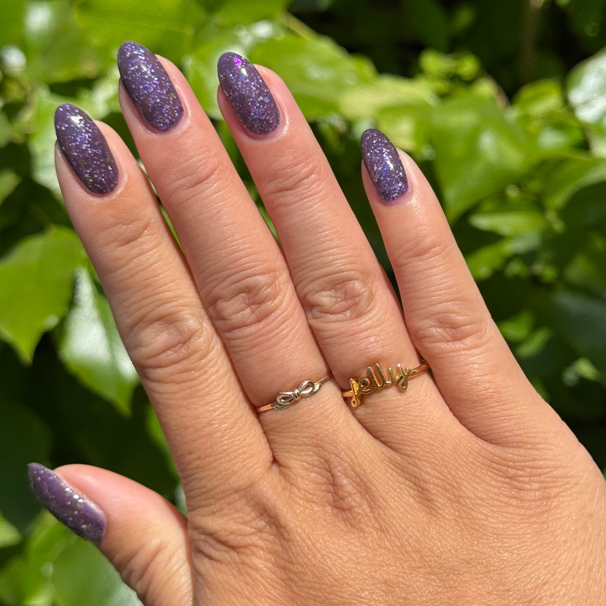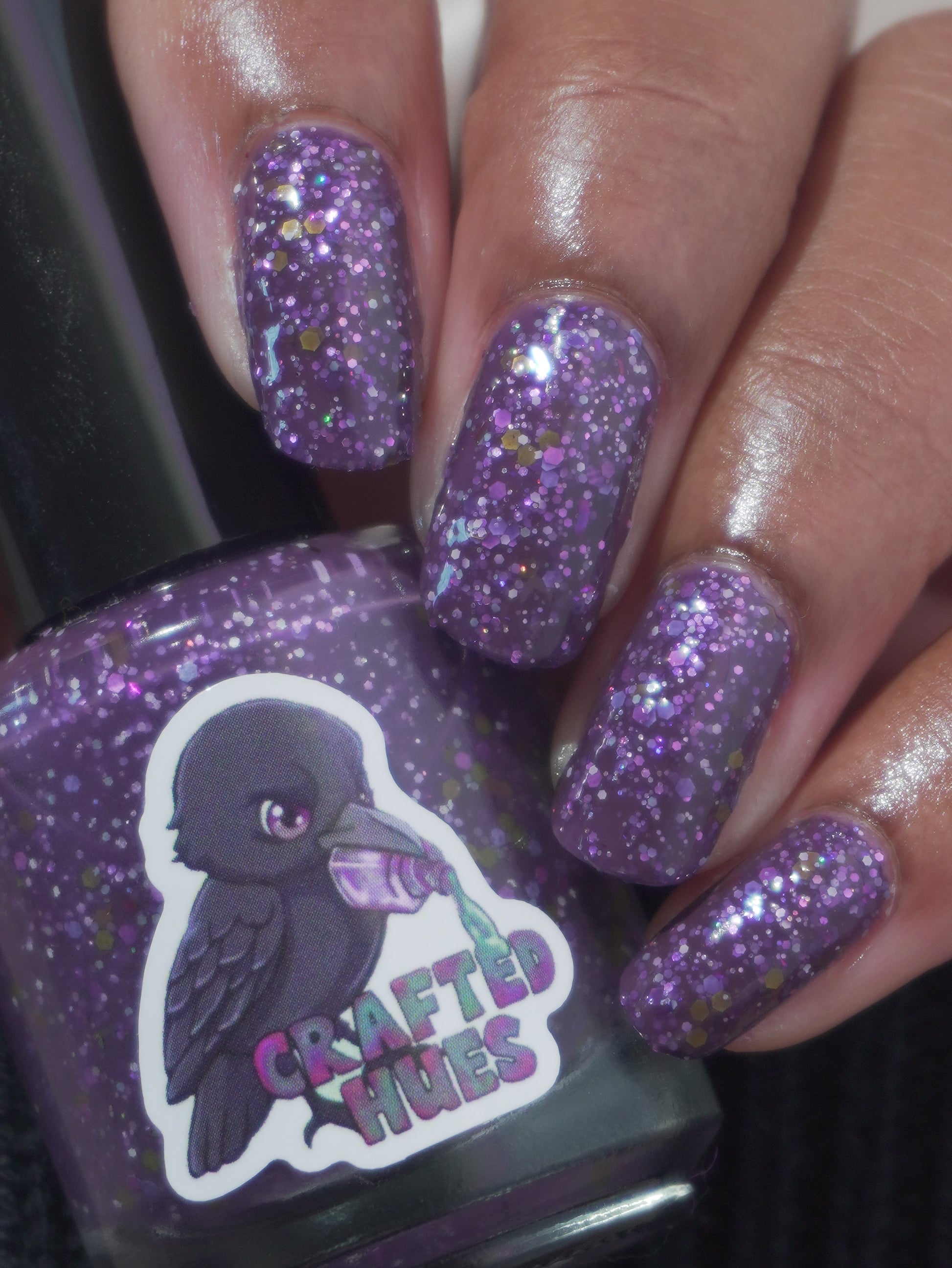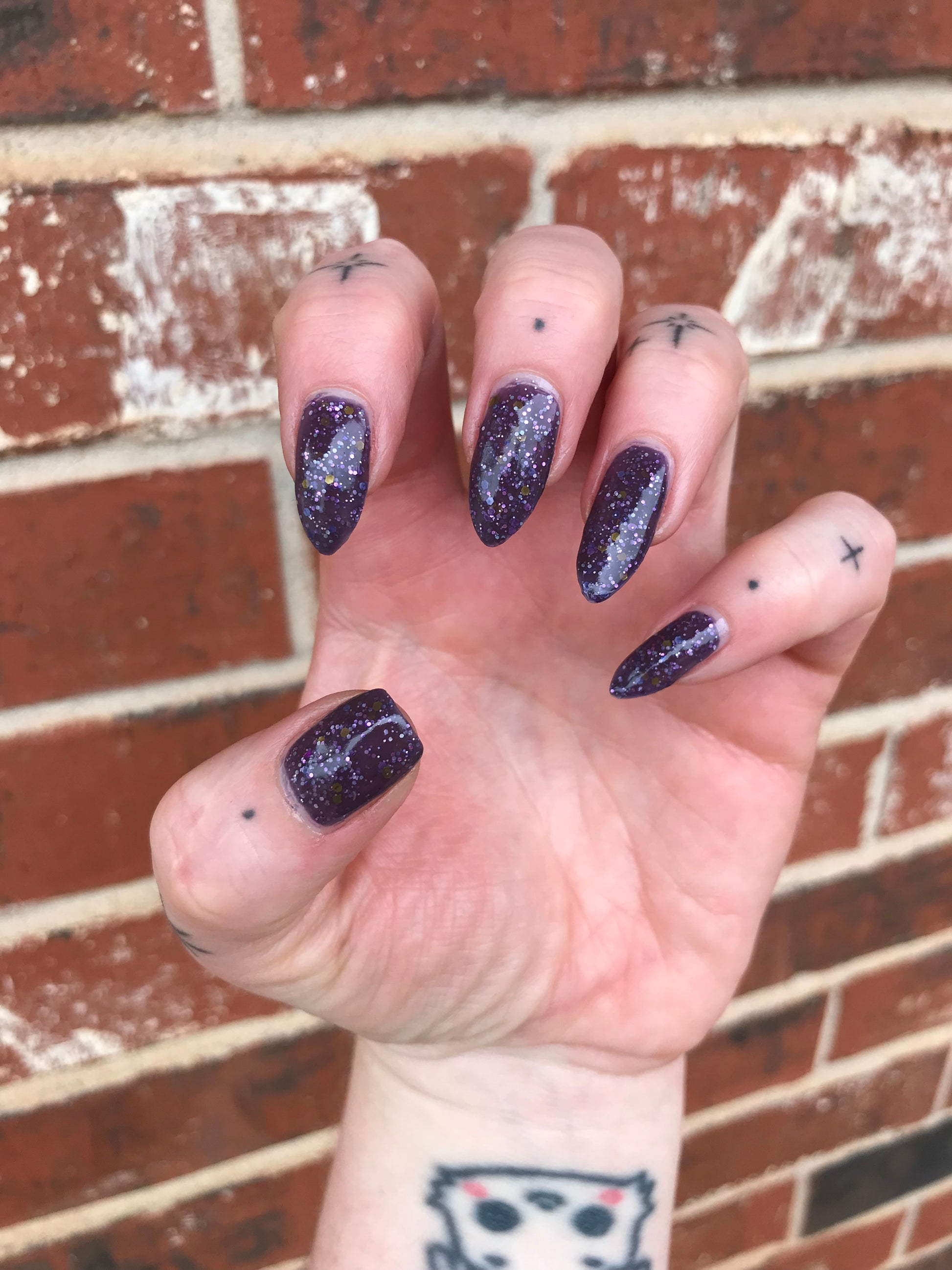 Hexed is a dark purple with a subtle white shimmer, various shades of purple glitters and a pop of green hex glitter.