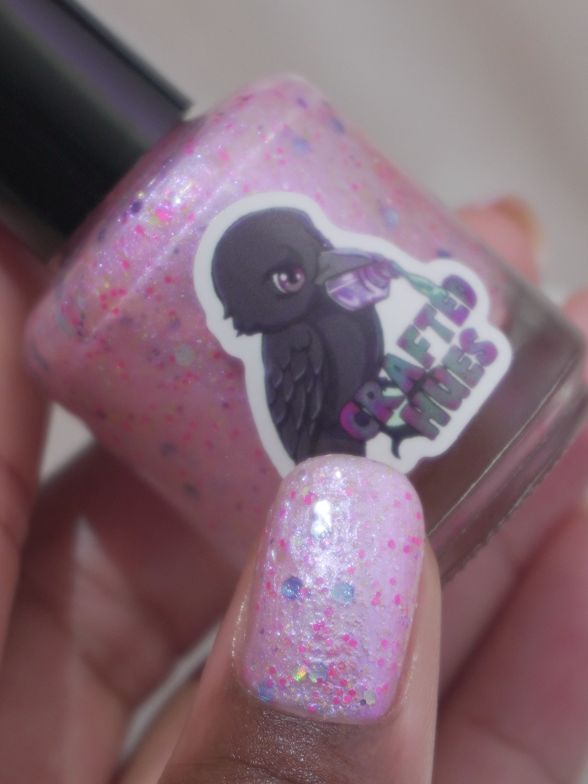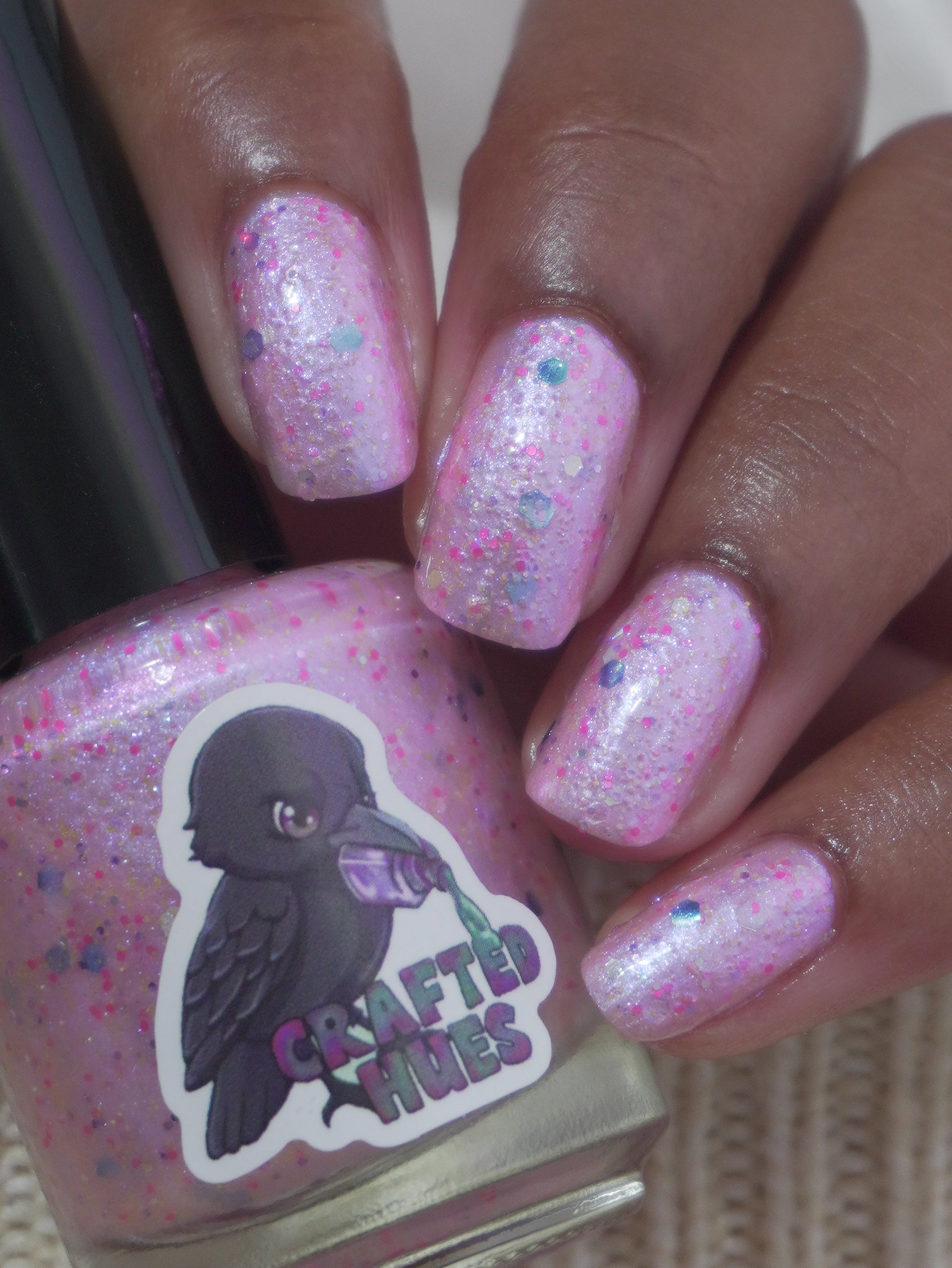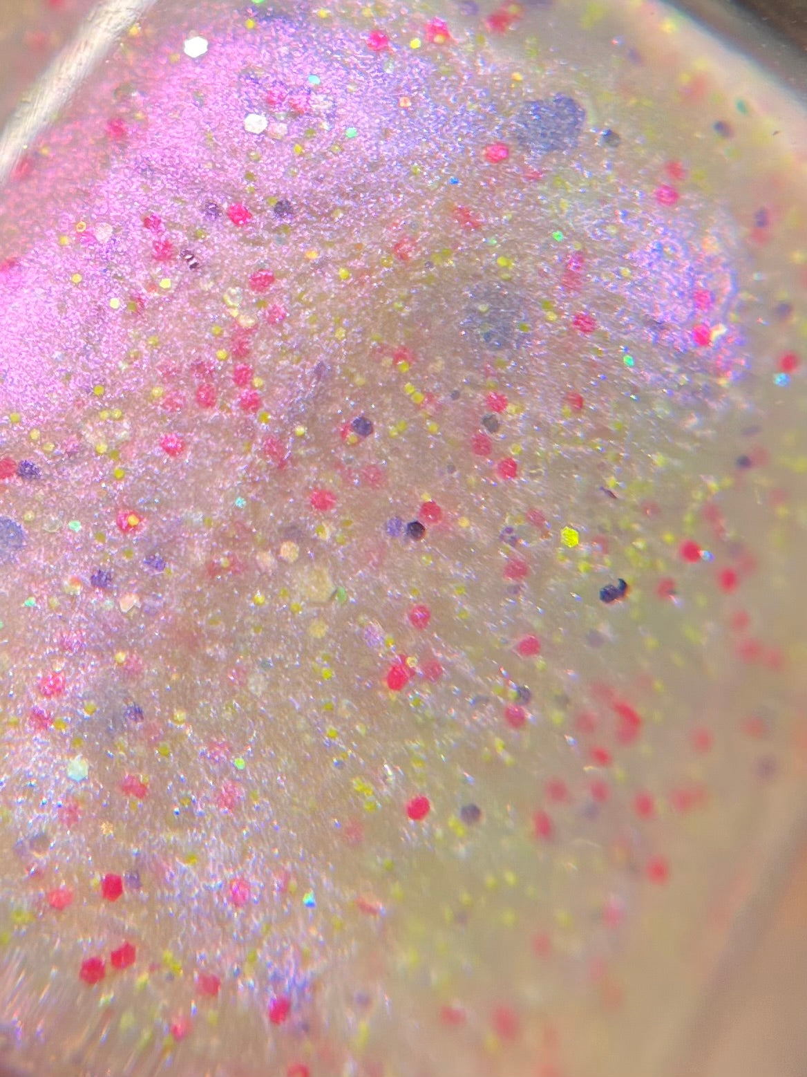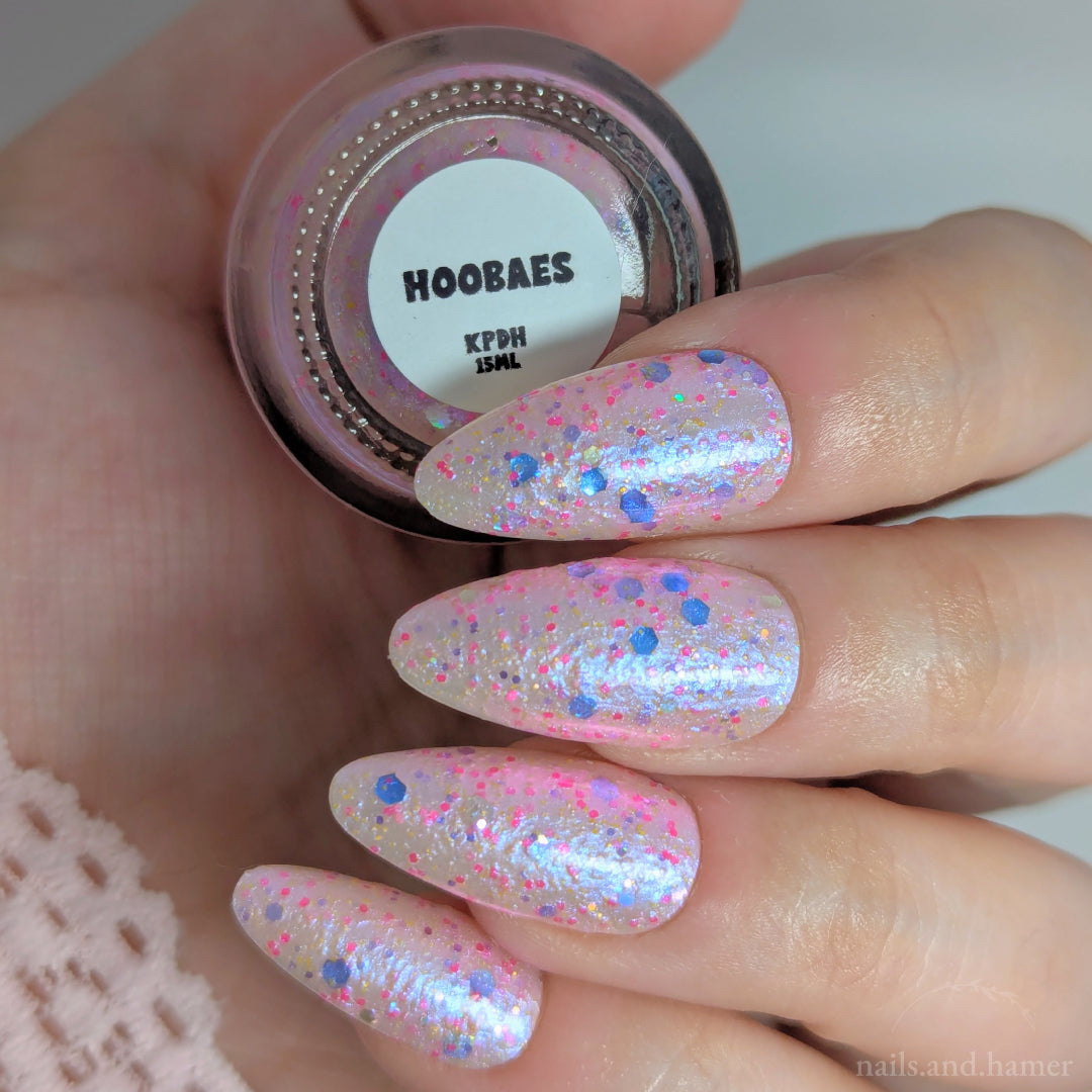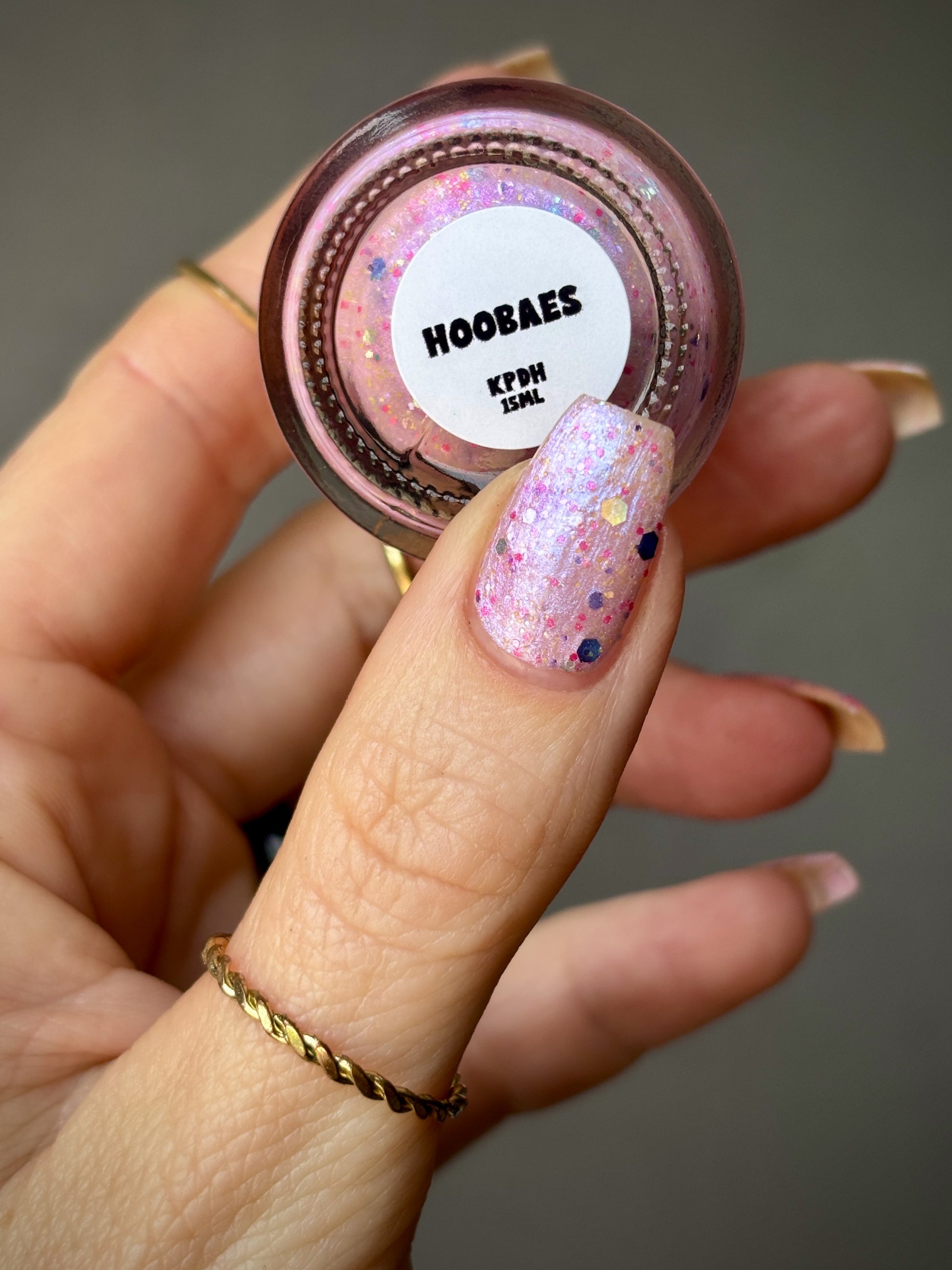 Hoobaes is a light purple pink shifty crelly with purple shift glitters, pink, neon yellow and green glitters in various sizes.
