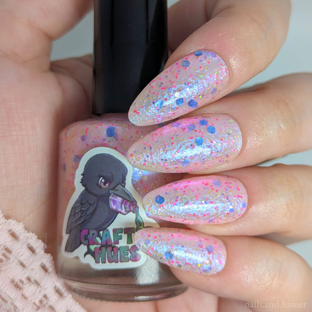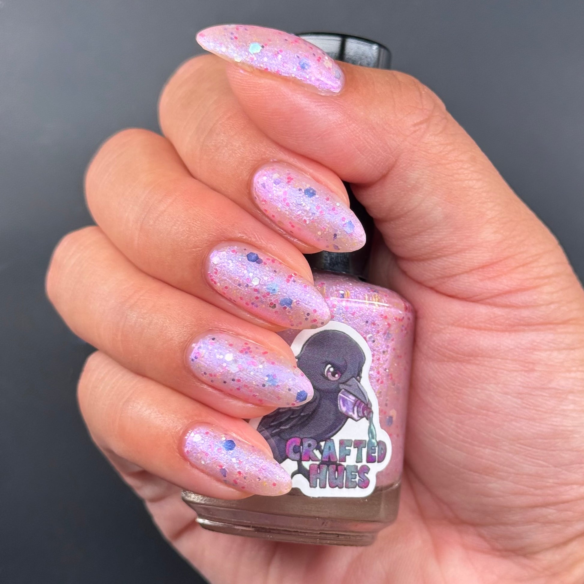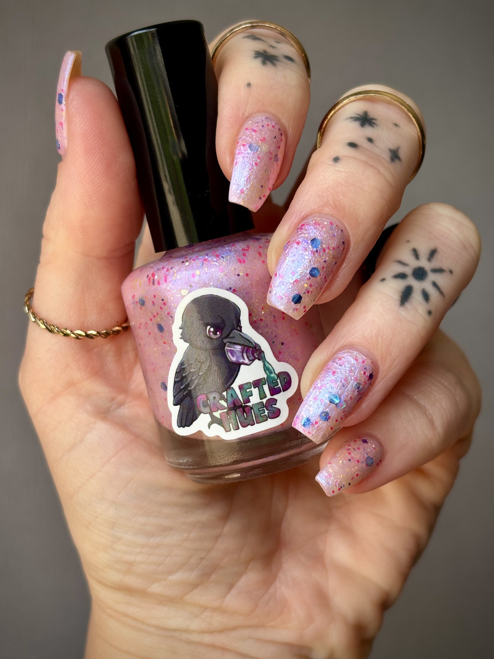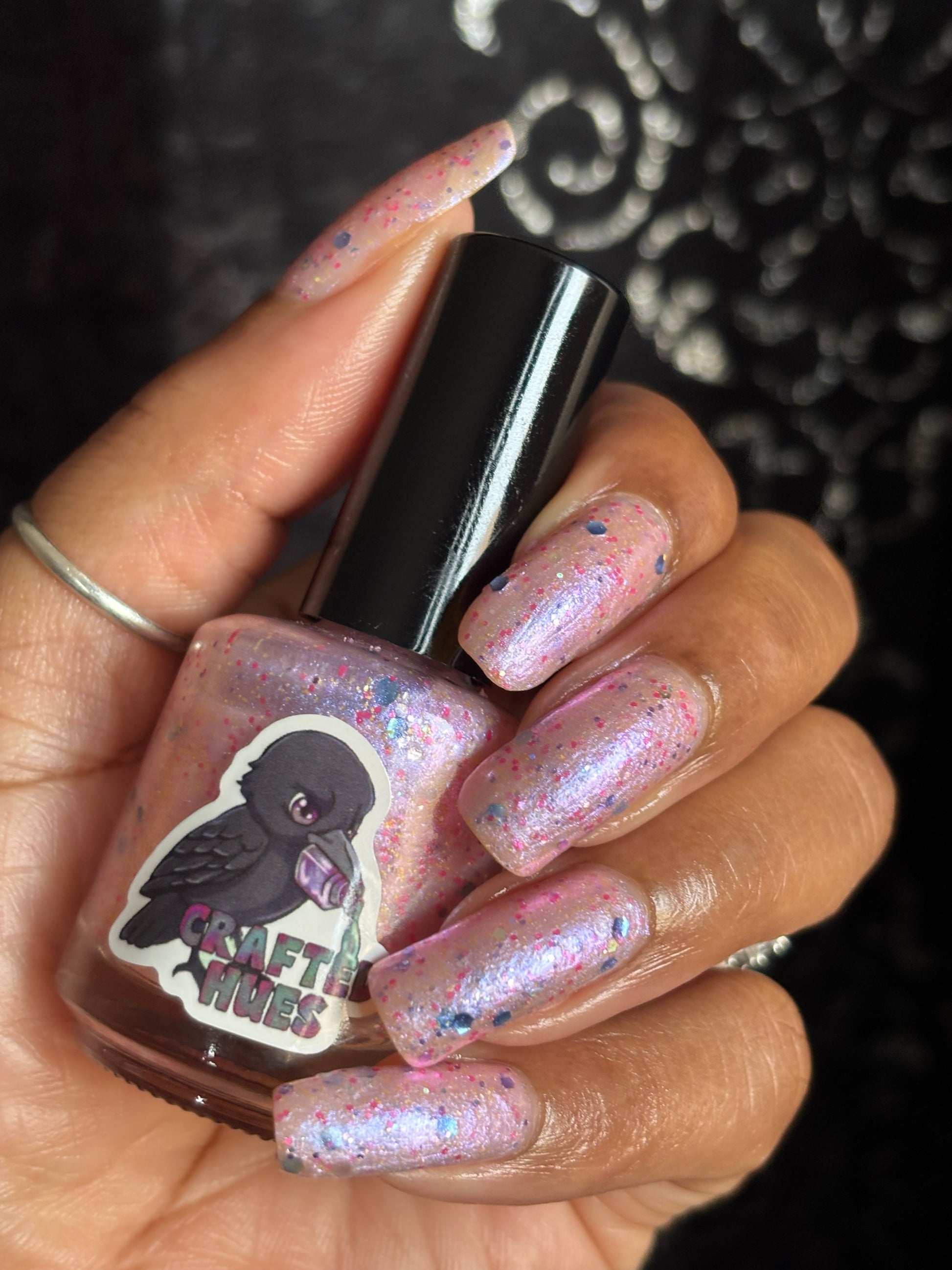 Hoobaes is a light purple pink shifty crelly with purple shift glitters, pink, neon yellow and green glitters in various sizes.