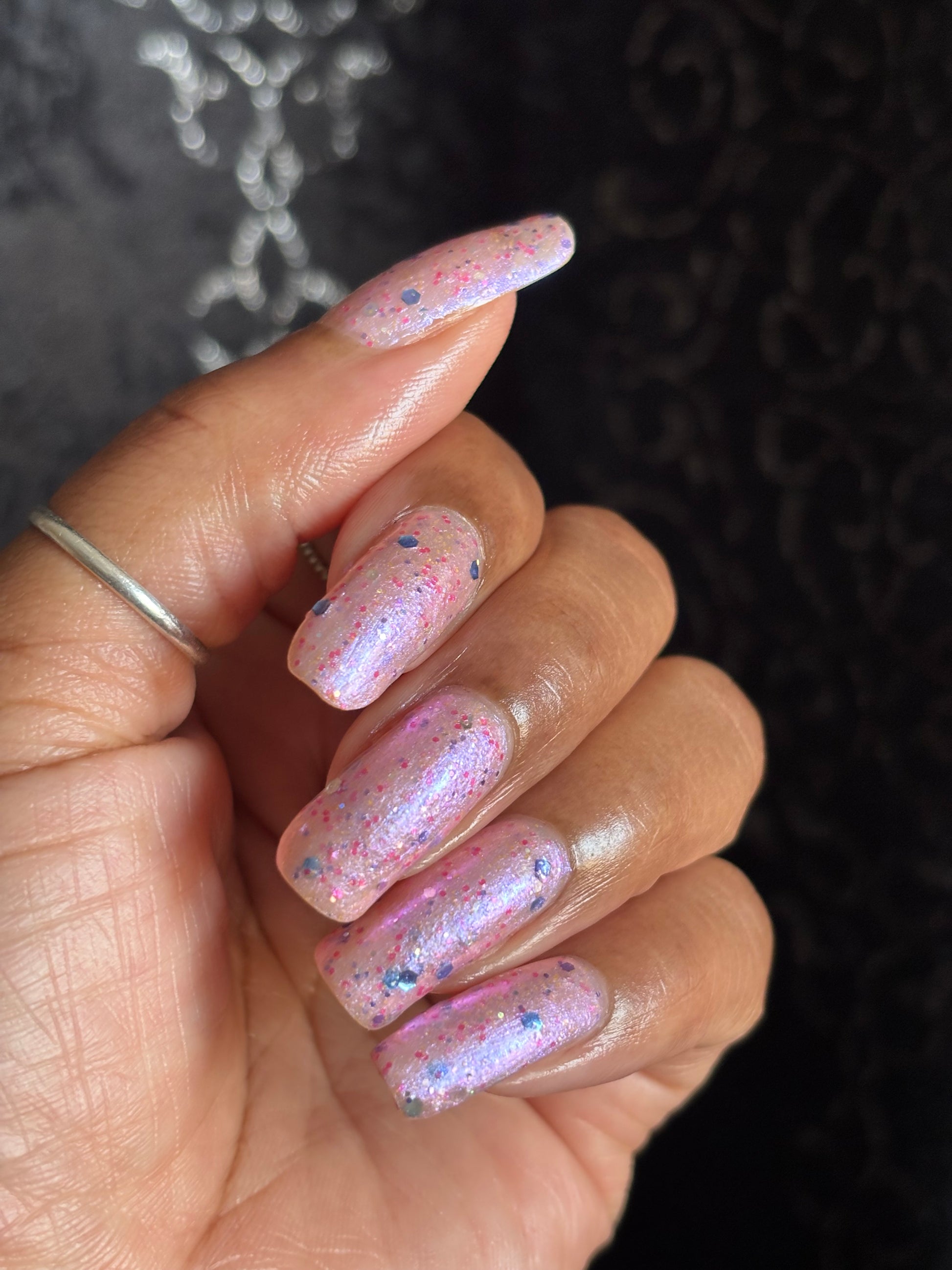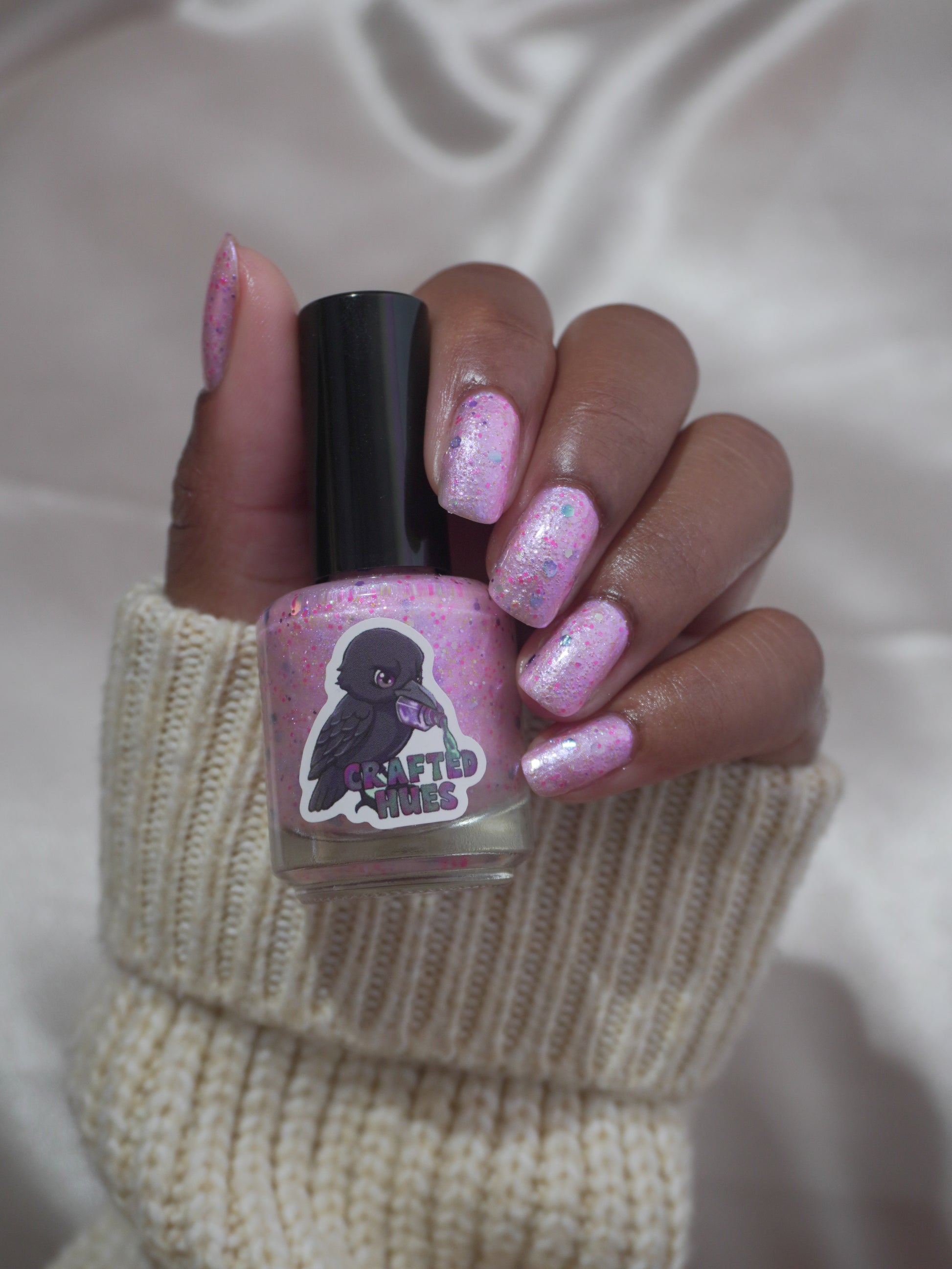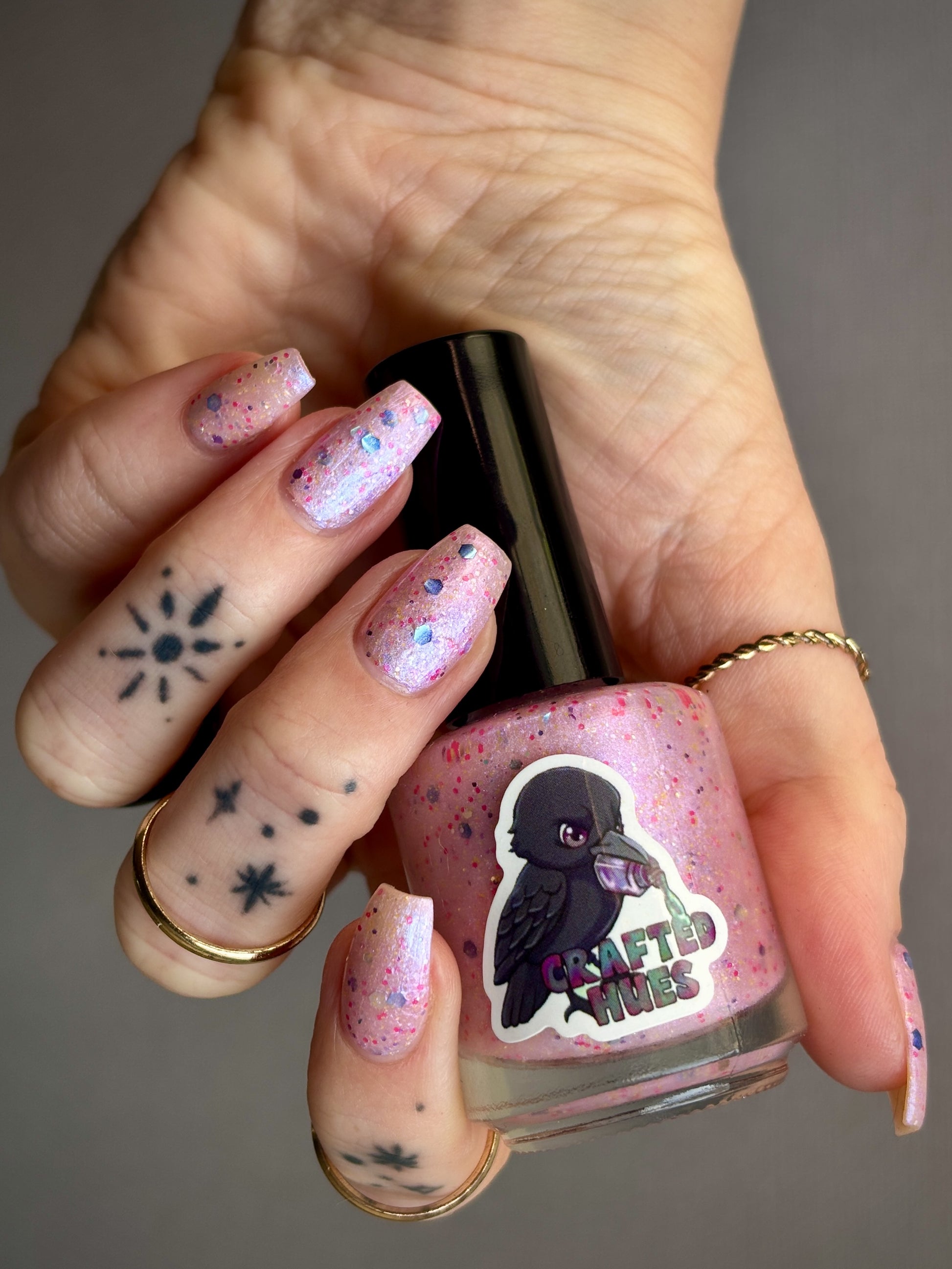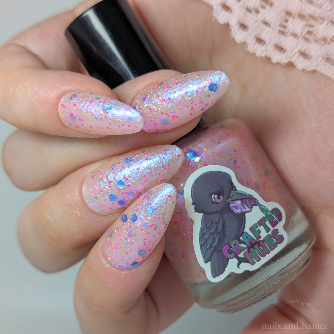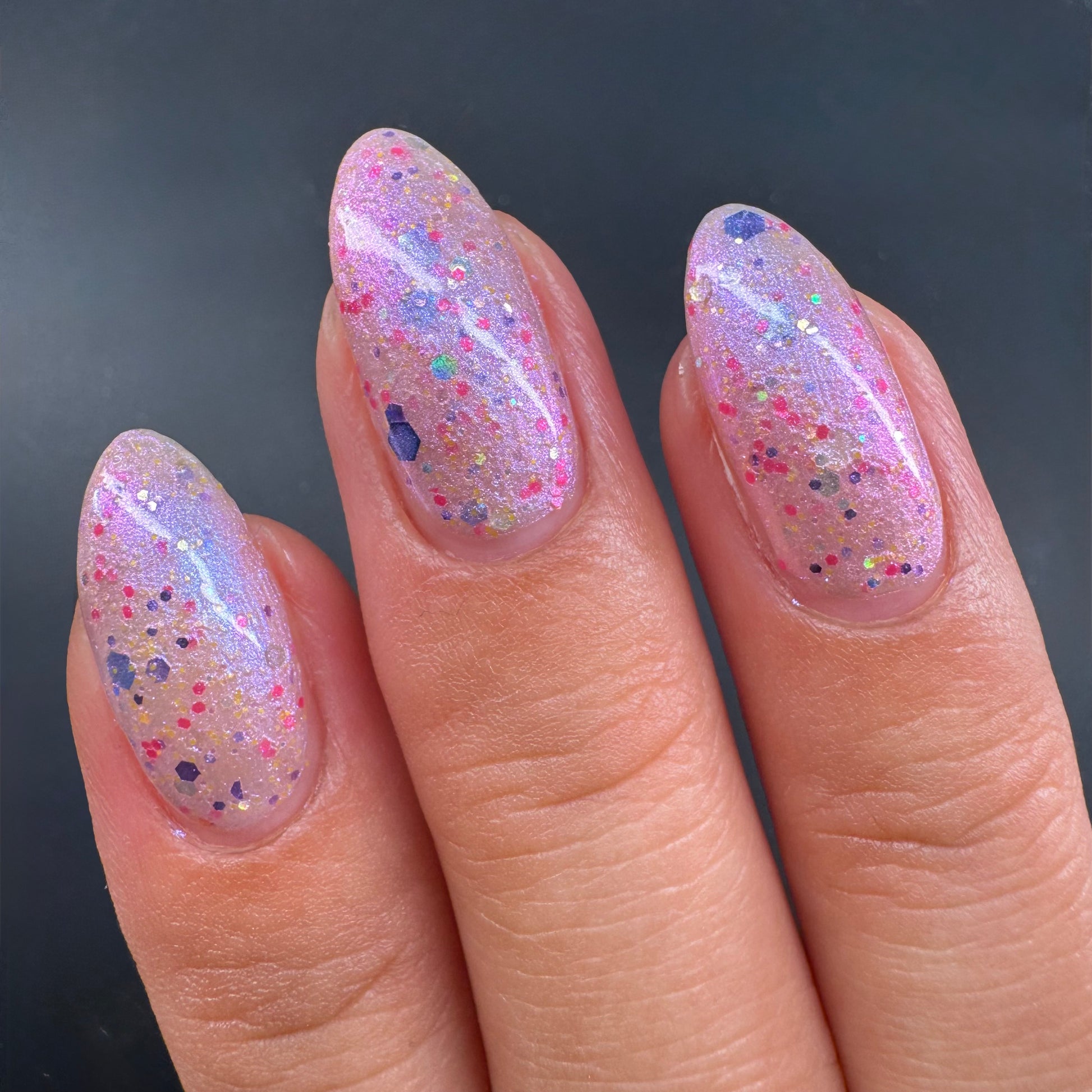 Hoobaes is a light purple pink shifty crelly with purple shift glitters, pink, neon yellow and green glitters in various sizes.