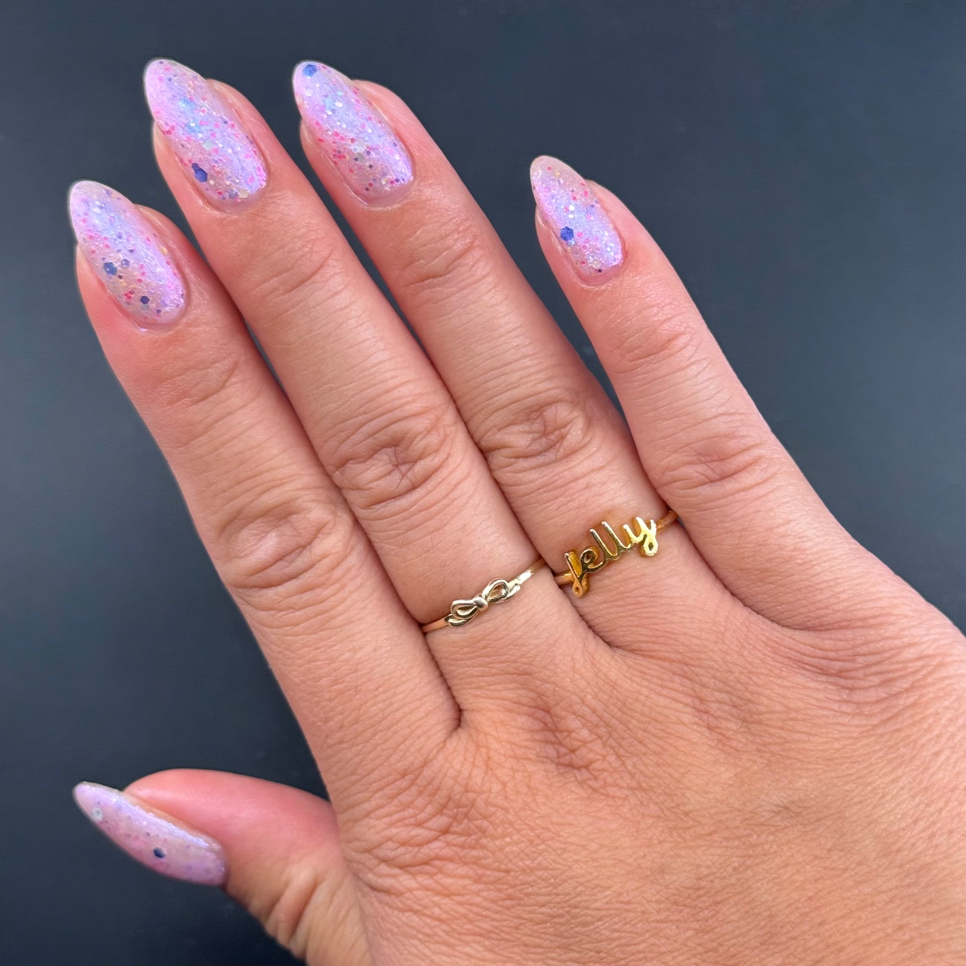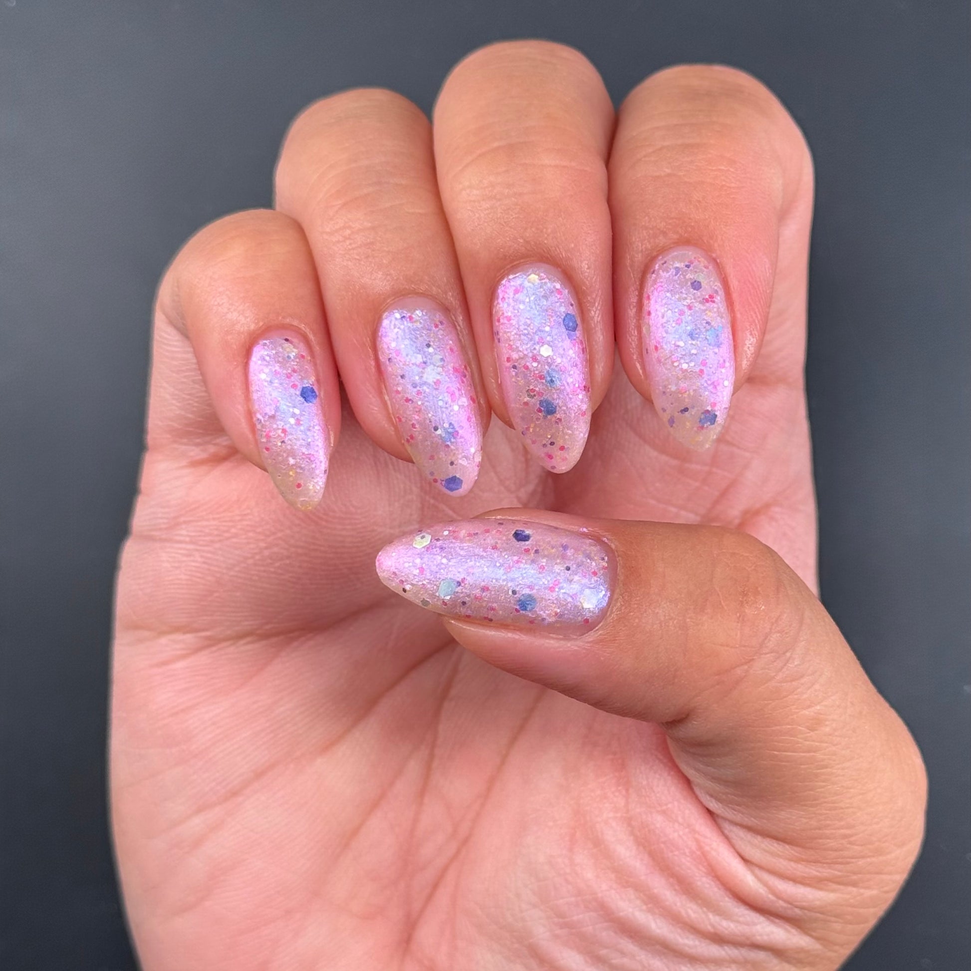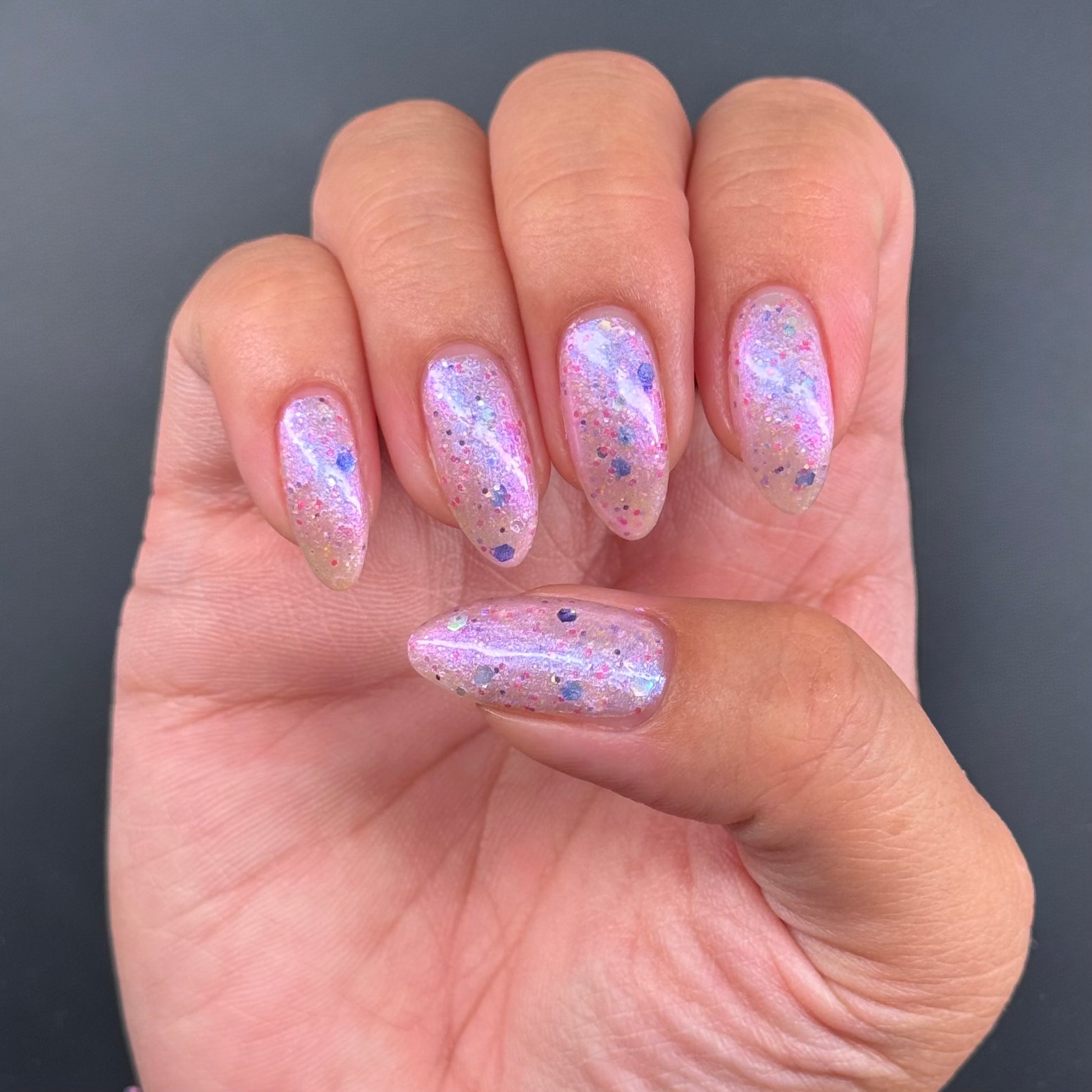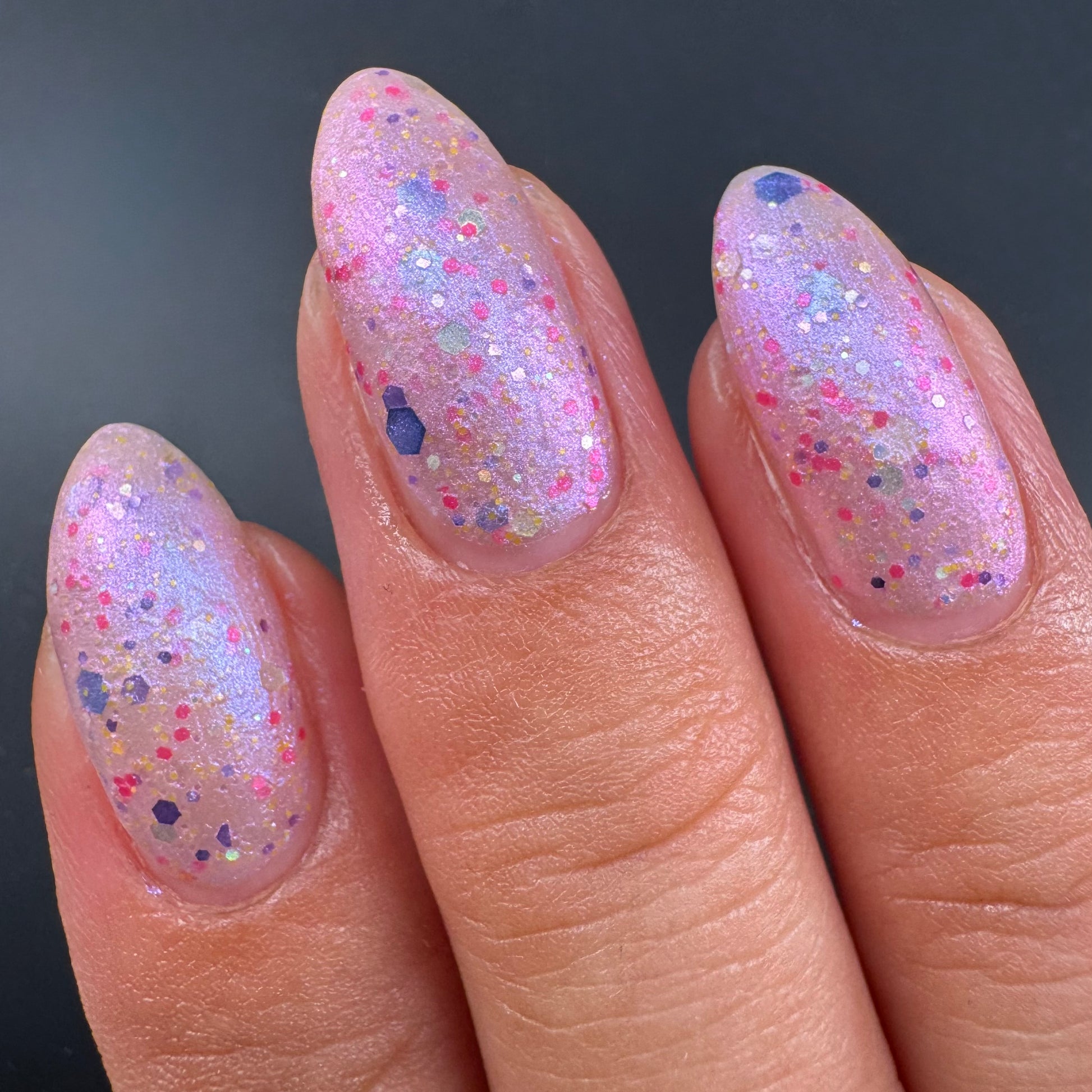 Hoobaes is a light purple pink shifty crelly with purple shift glitters, pink, neon yellow and green glitters in various sizes.