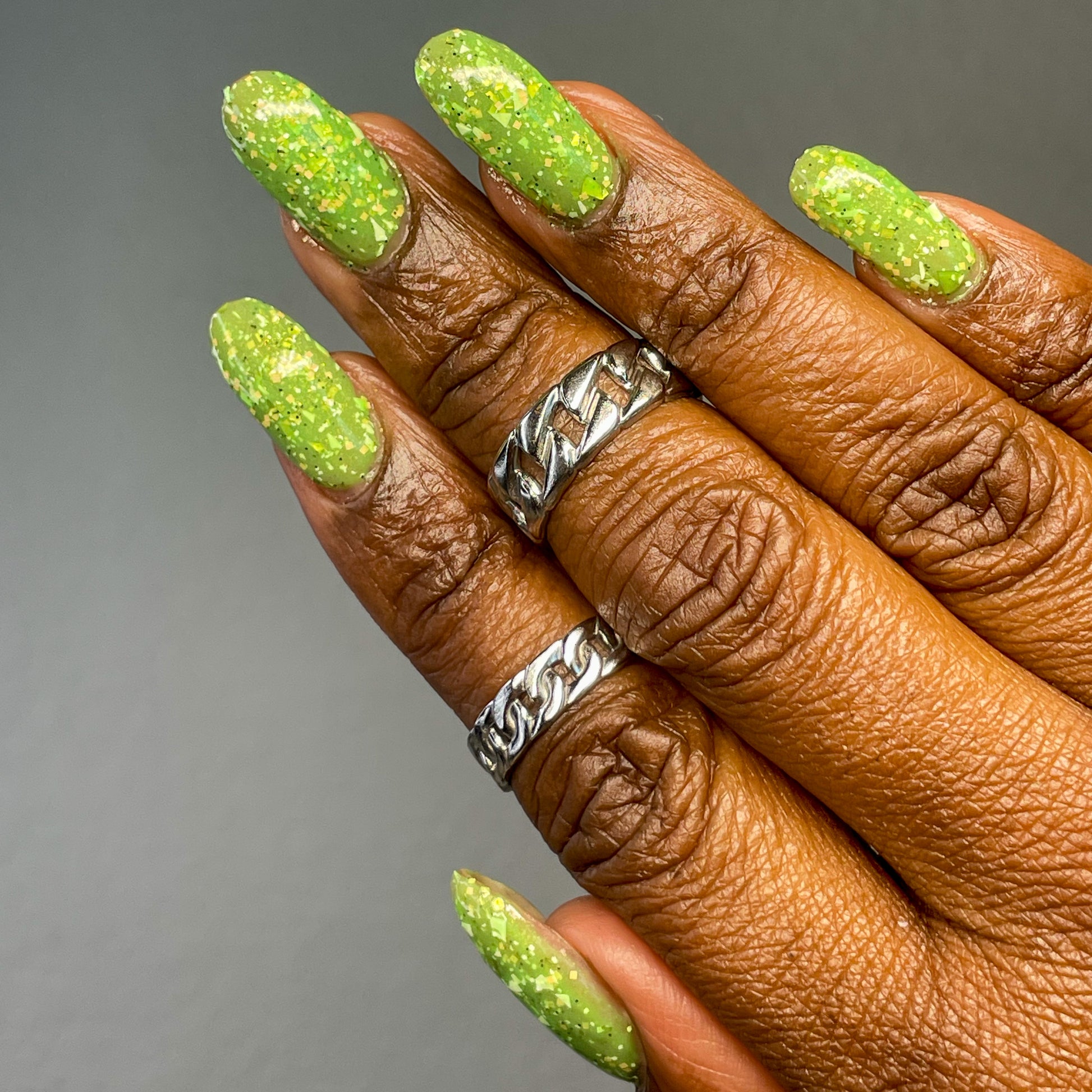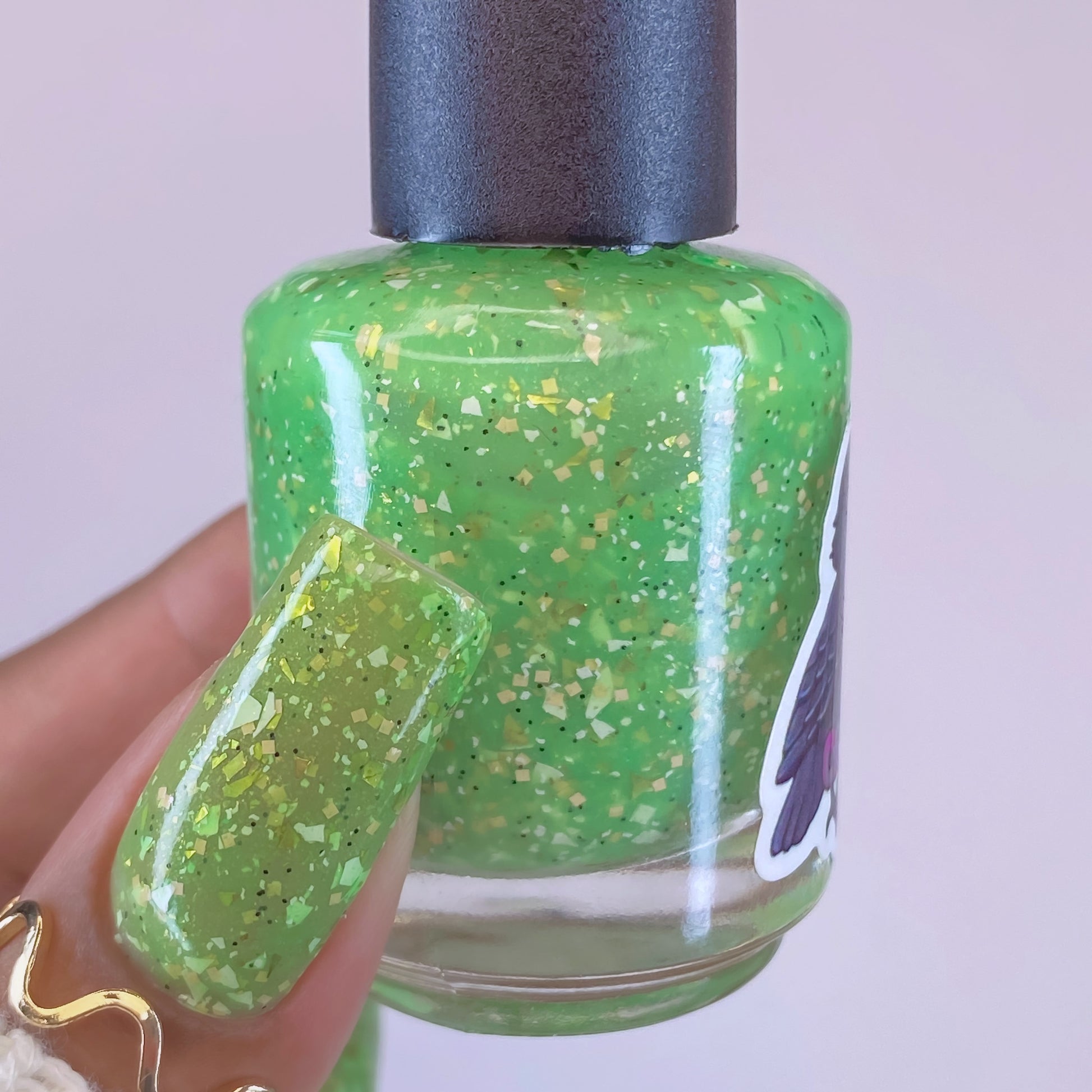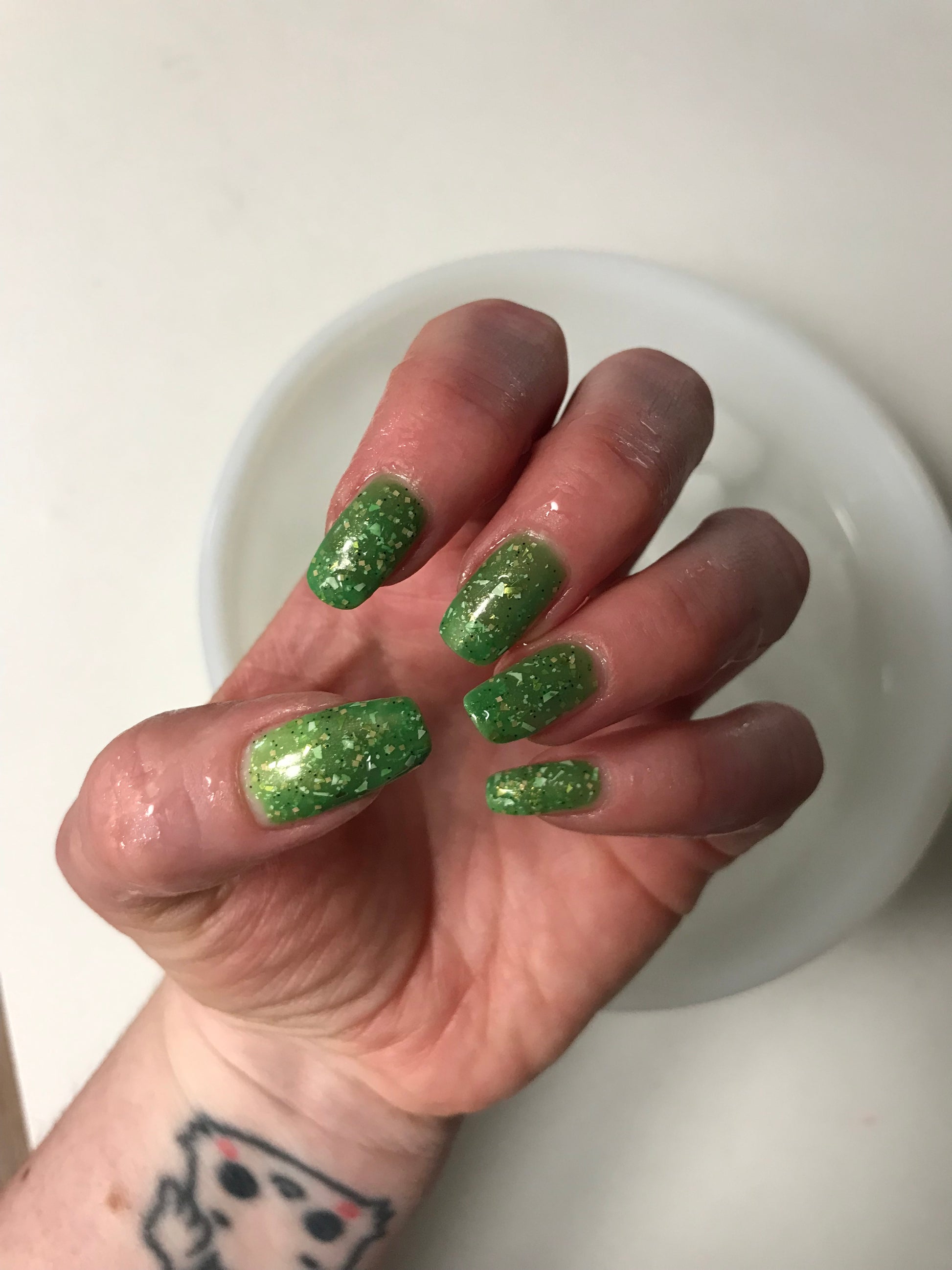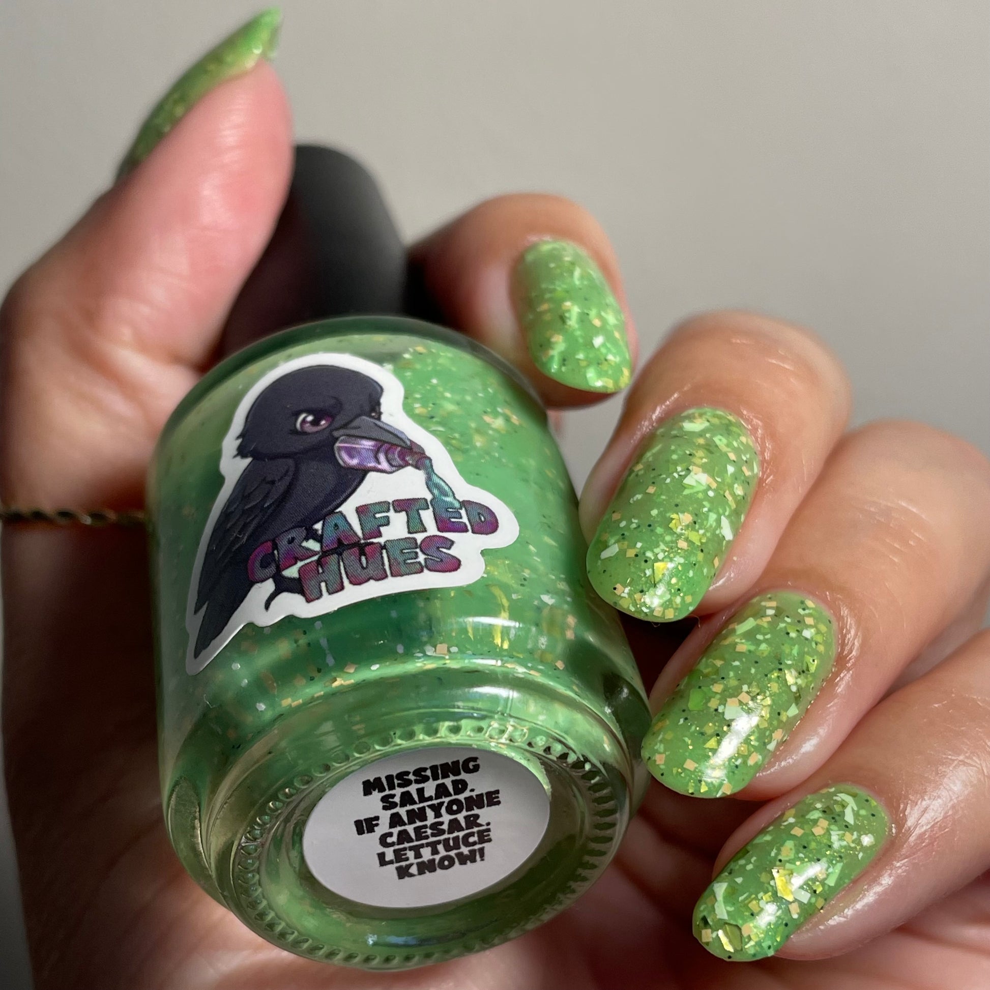 Light to dark green thermal with gold shimmer, orange squares, black and white glitter and flakes. Resembles the crunchy Caesar salad!