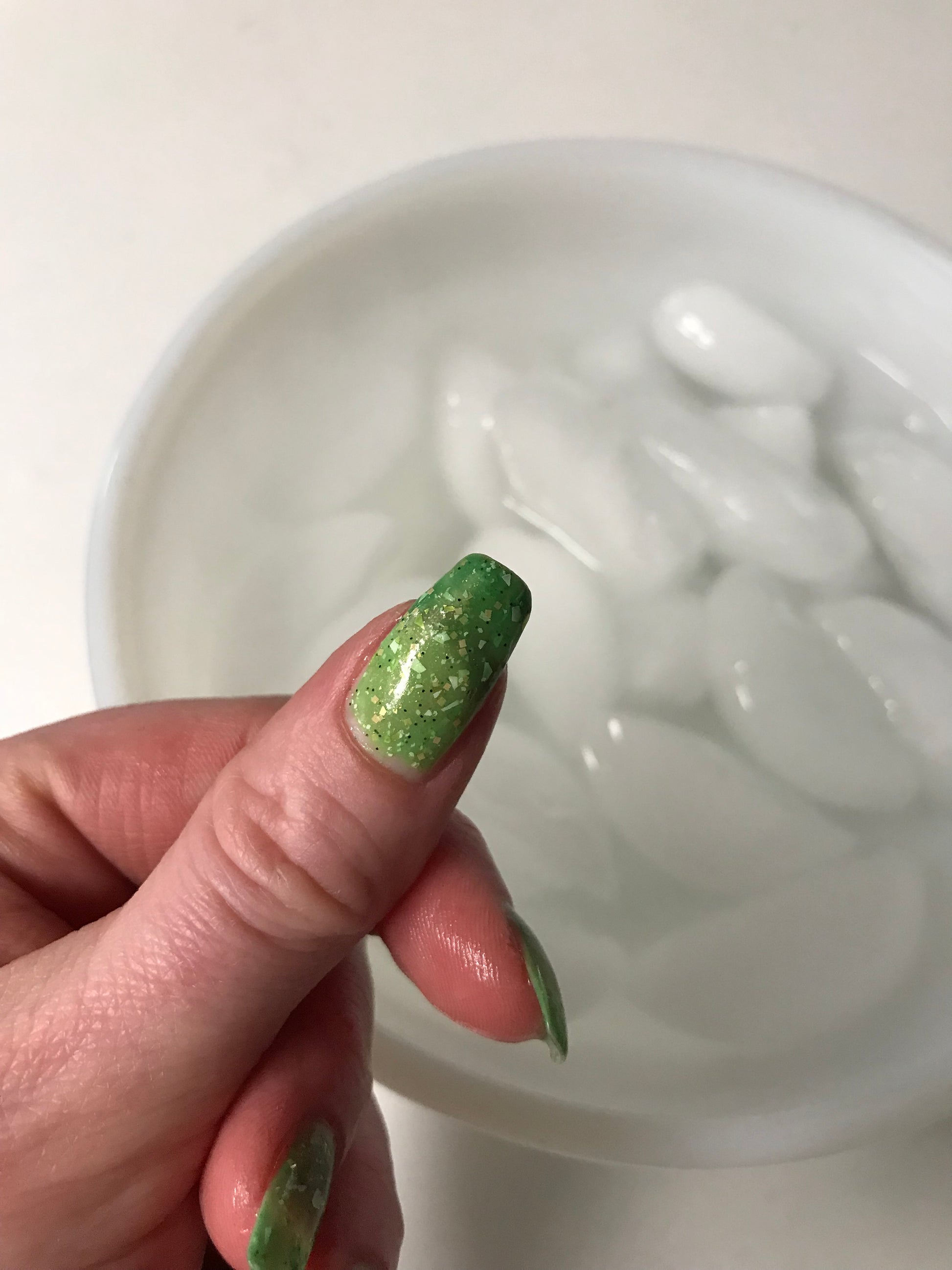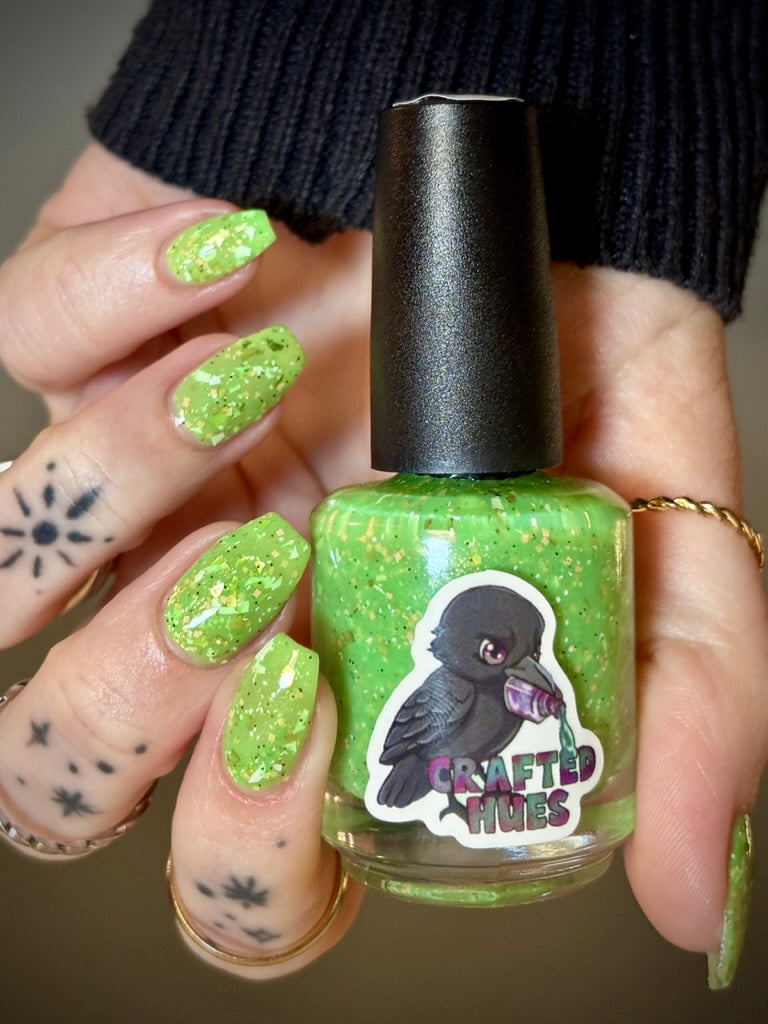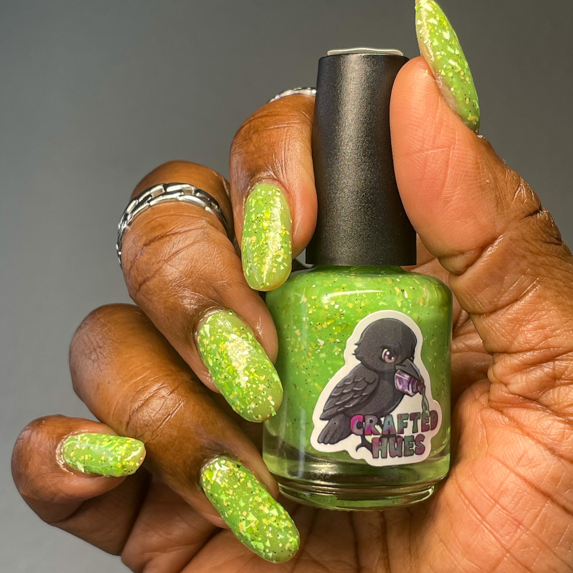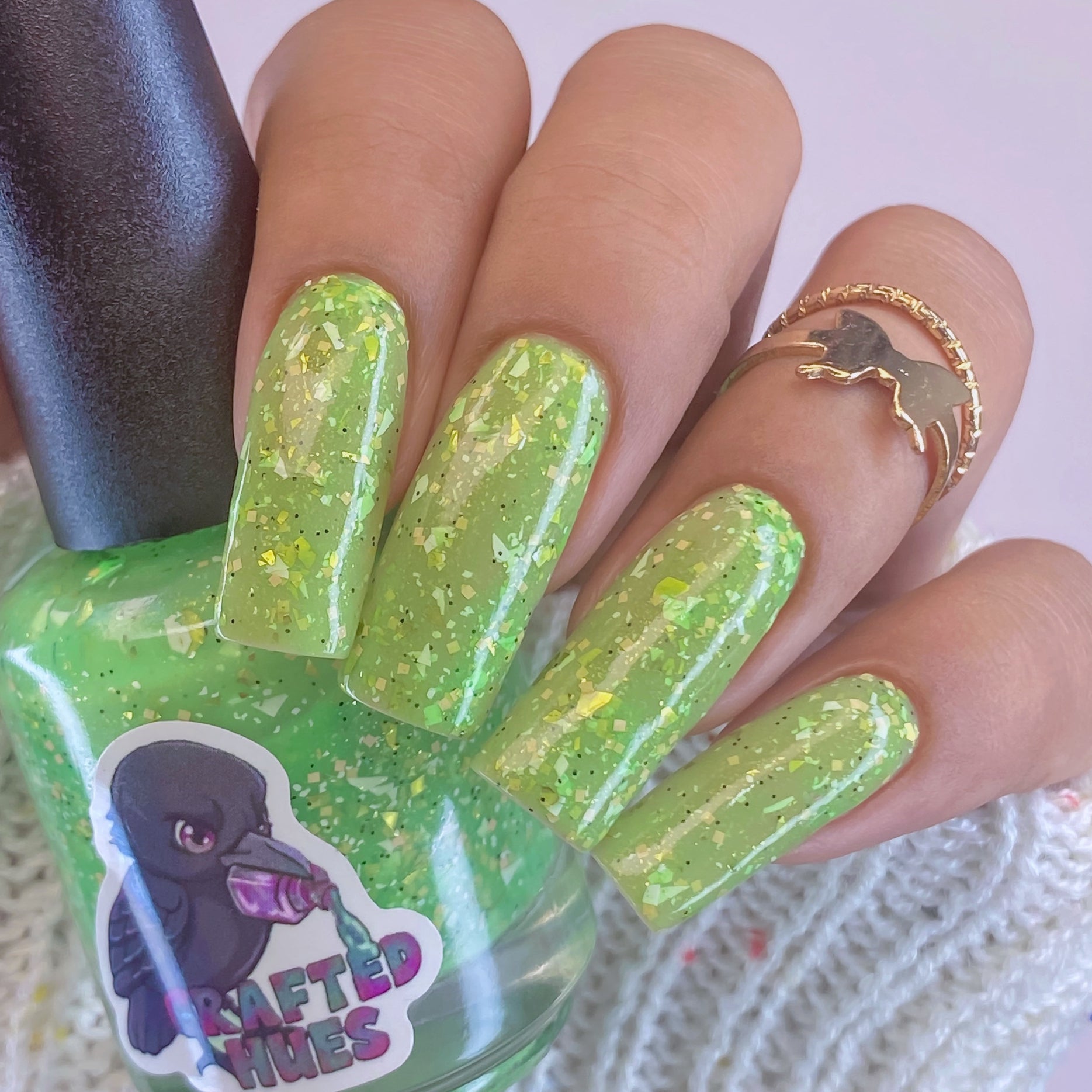 Light to dark green thermal with gold shimmer, orange squares, black and white glitter and flakes. Resembles the crunchy Caesar salad!