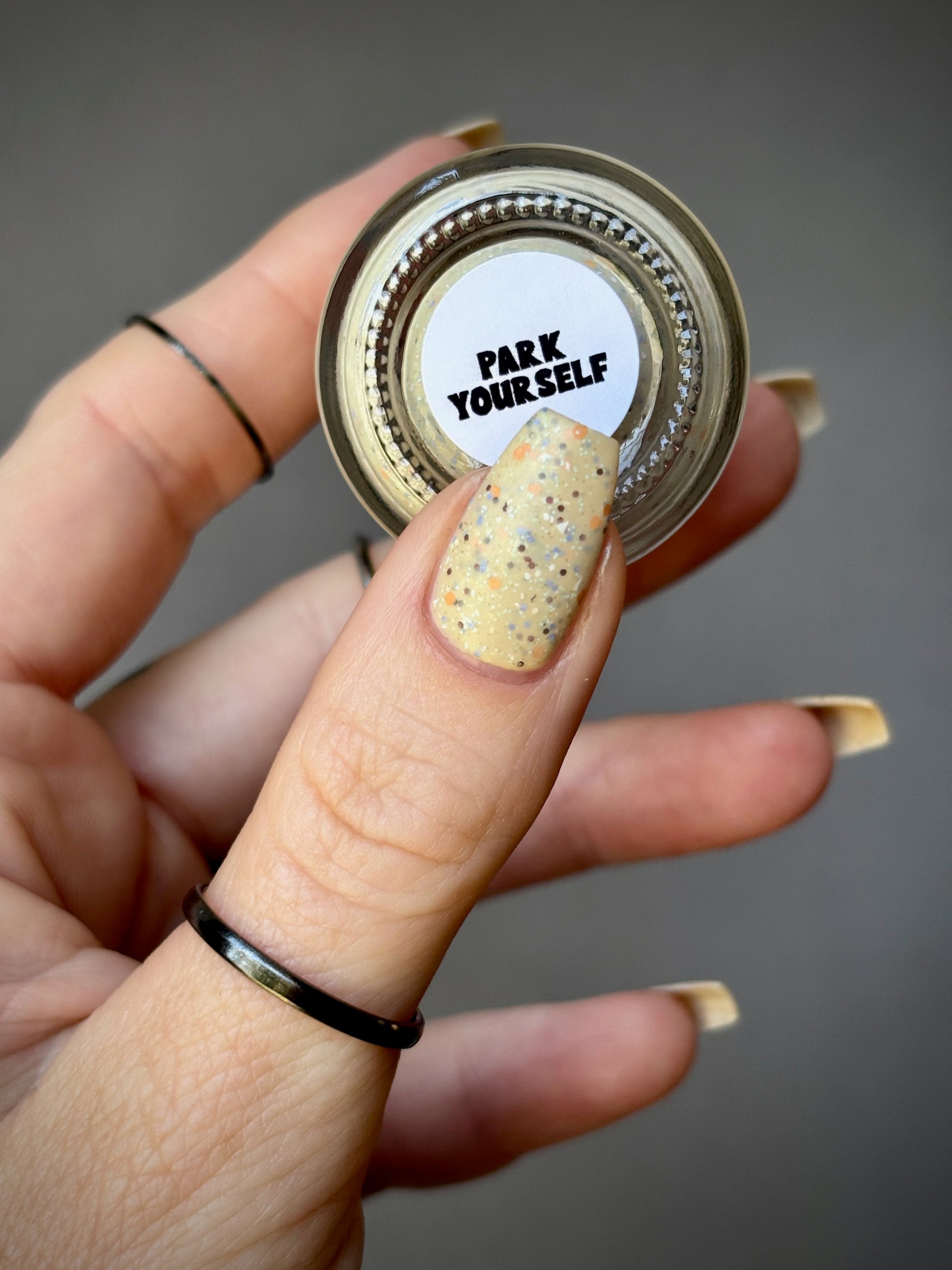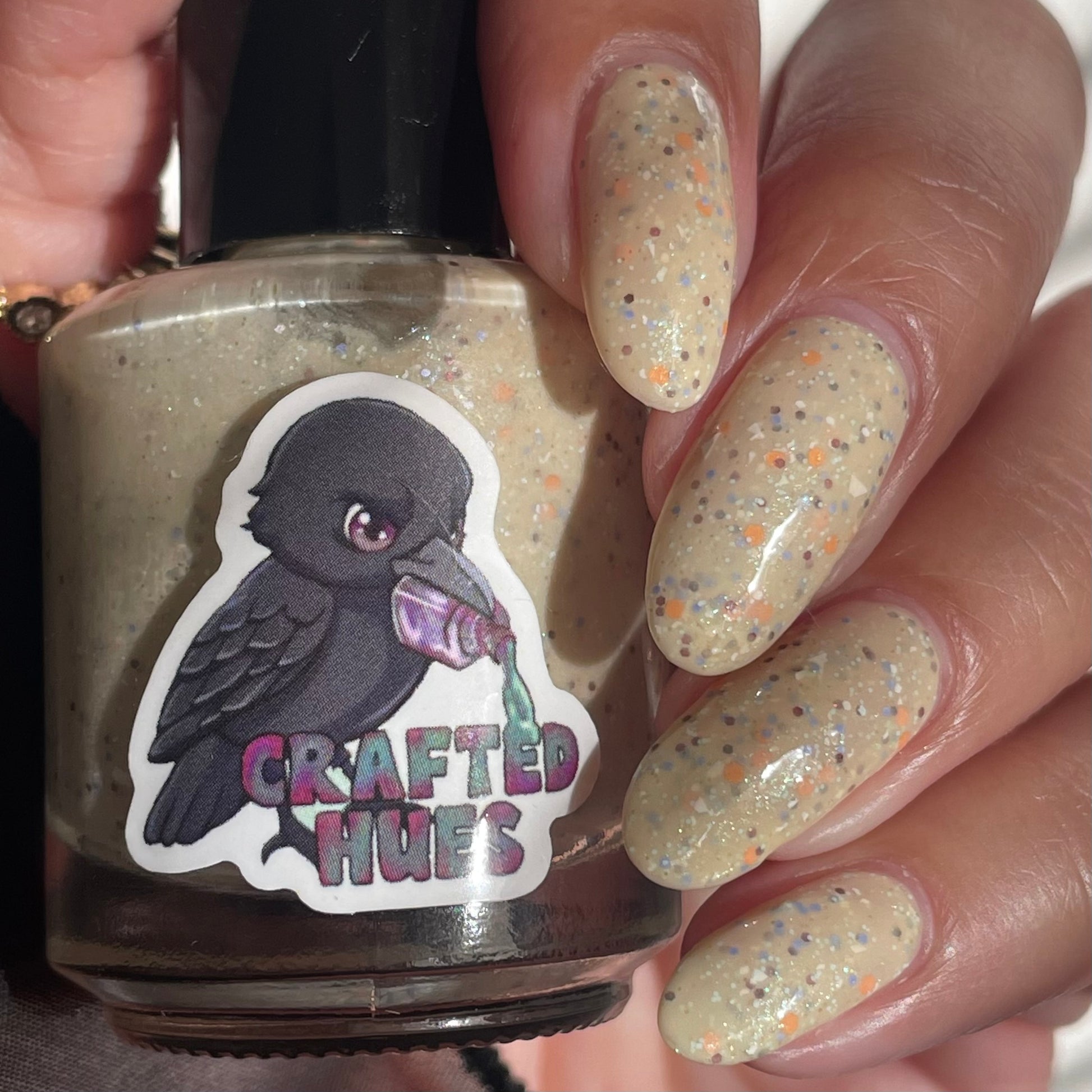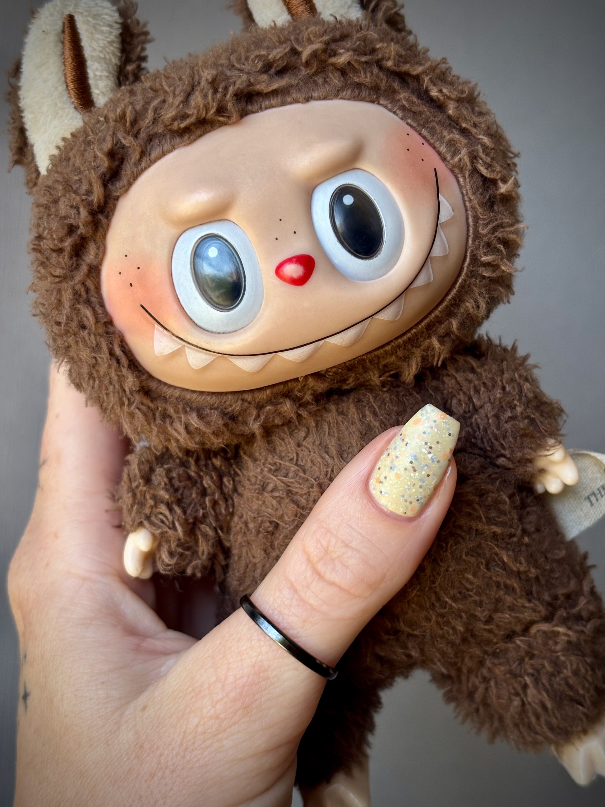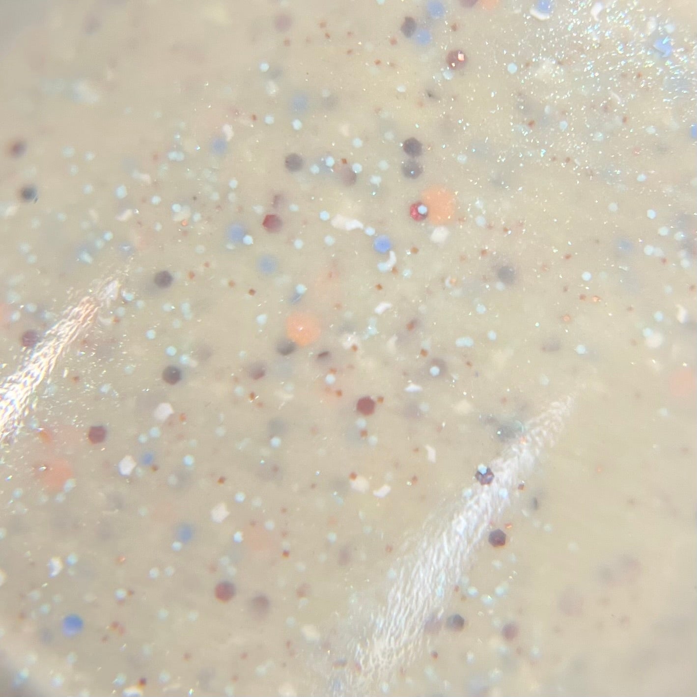 Inspired by the LABUBU - Have A Seat blind box! Park Yourself is a white cream crelly with green shimmer, white flakes, orange, blue and brown hex glitters.