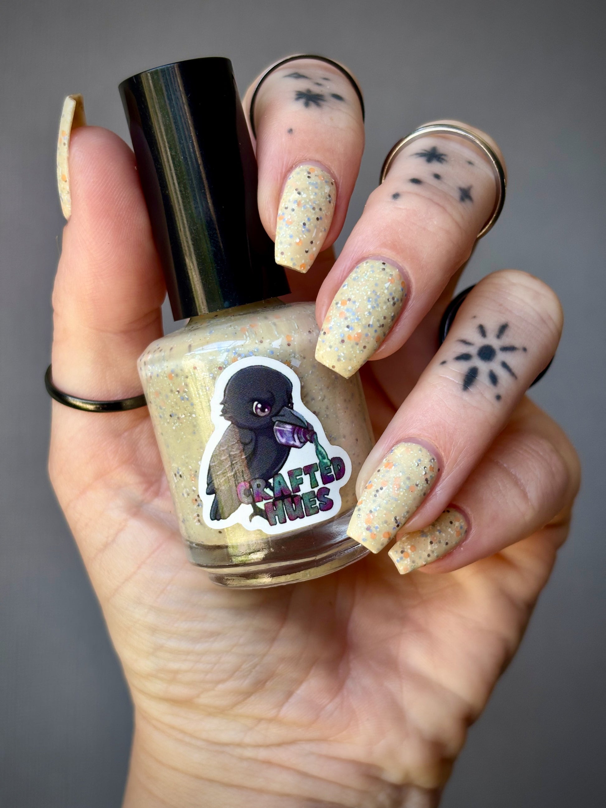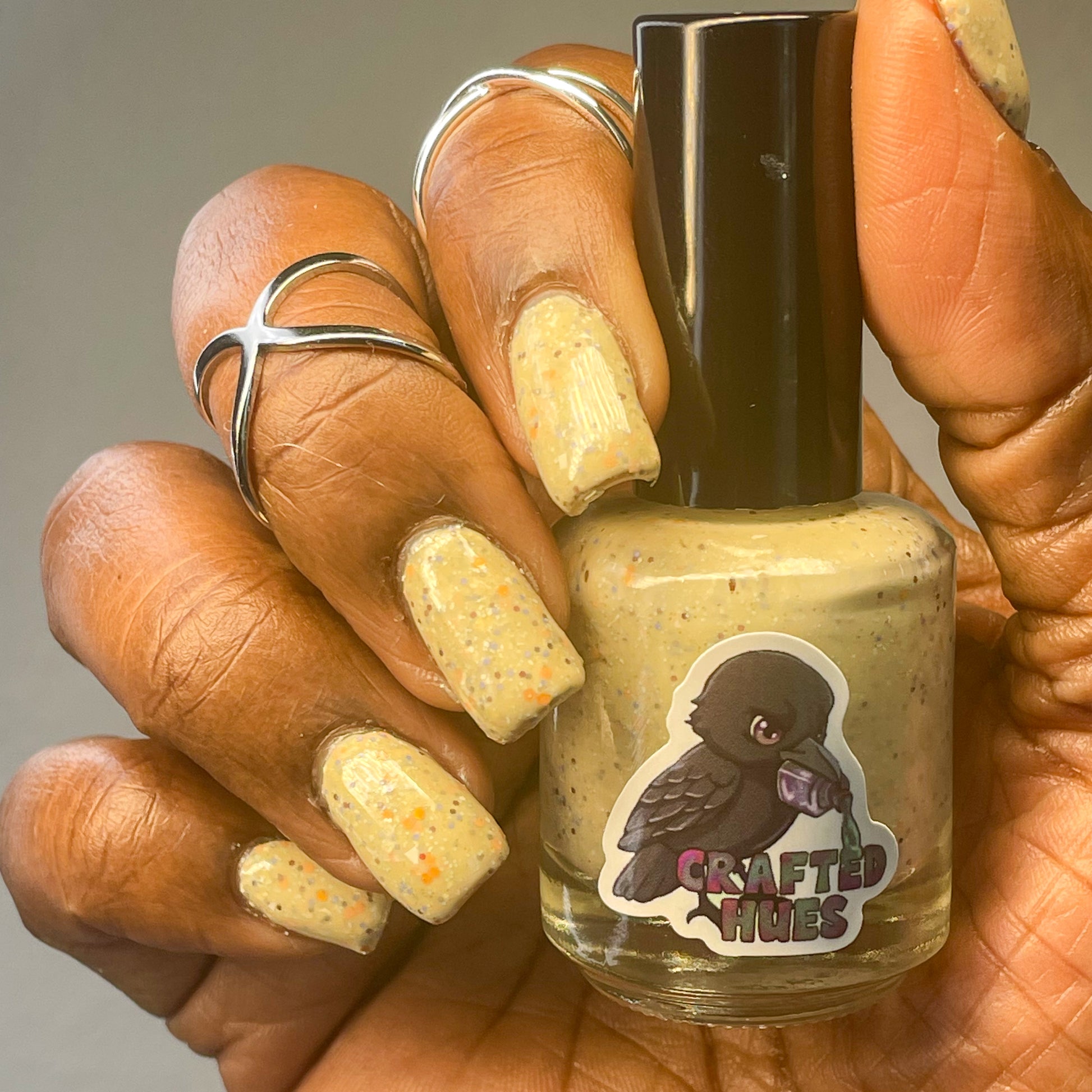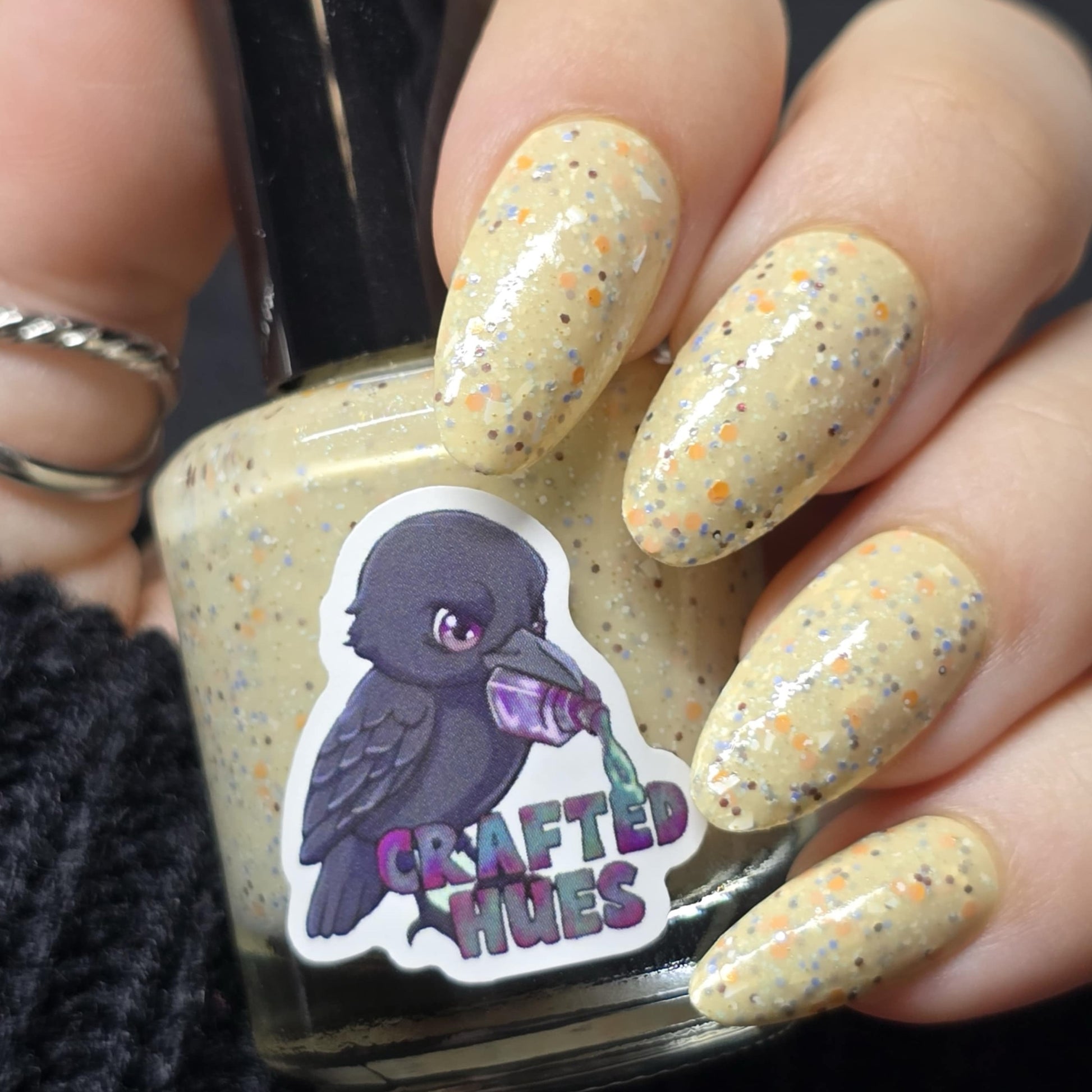 Inspired by the LABUBU - Have A Seat blind box! Park Yourself is a white cream crelly with green shimmer, white flakes, orange, blue and brown hex glitters.