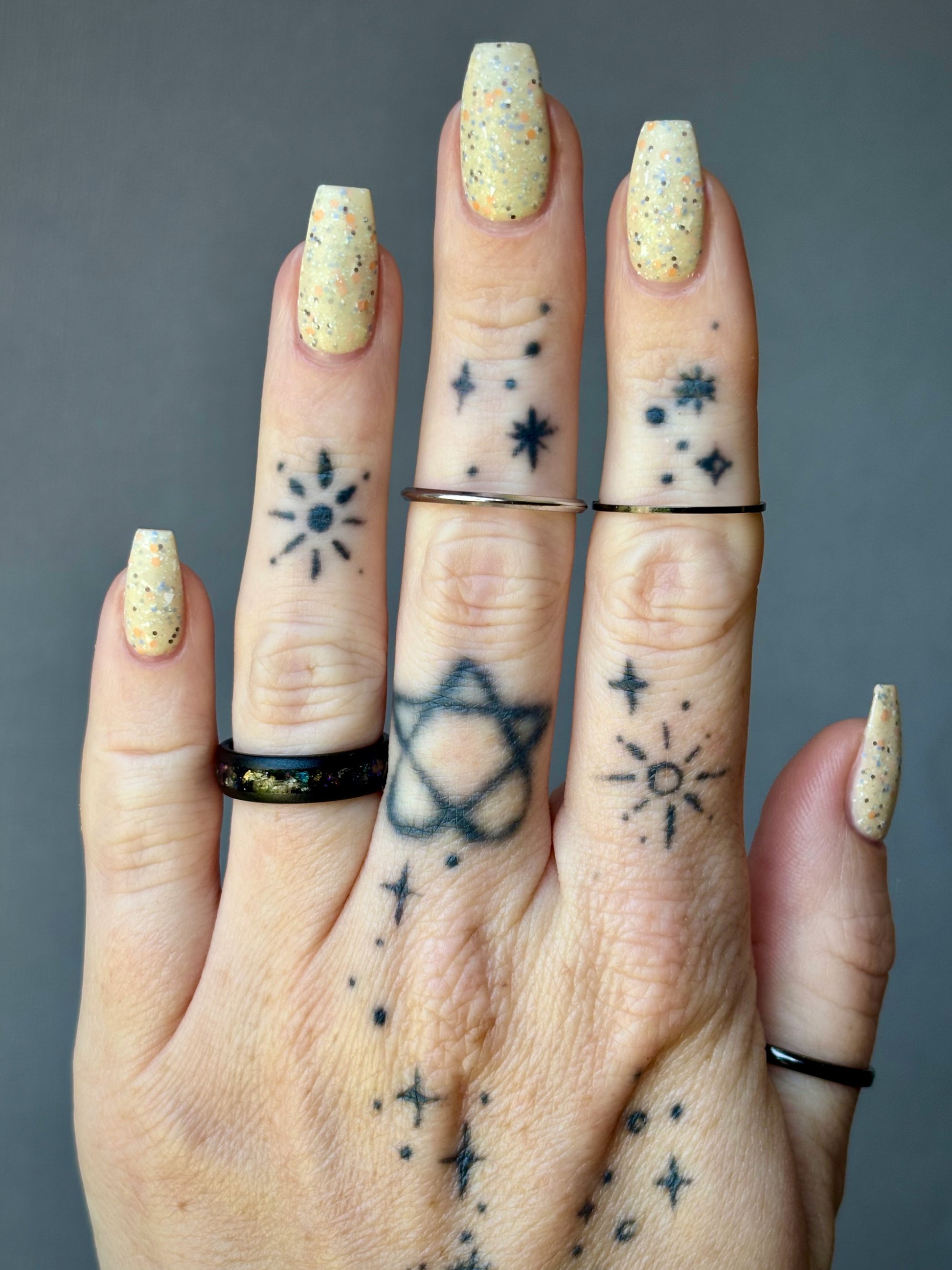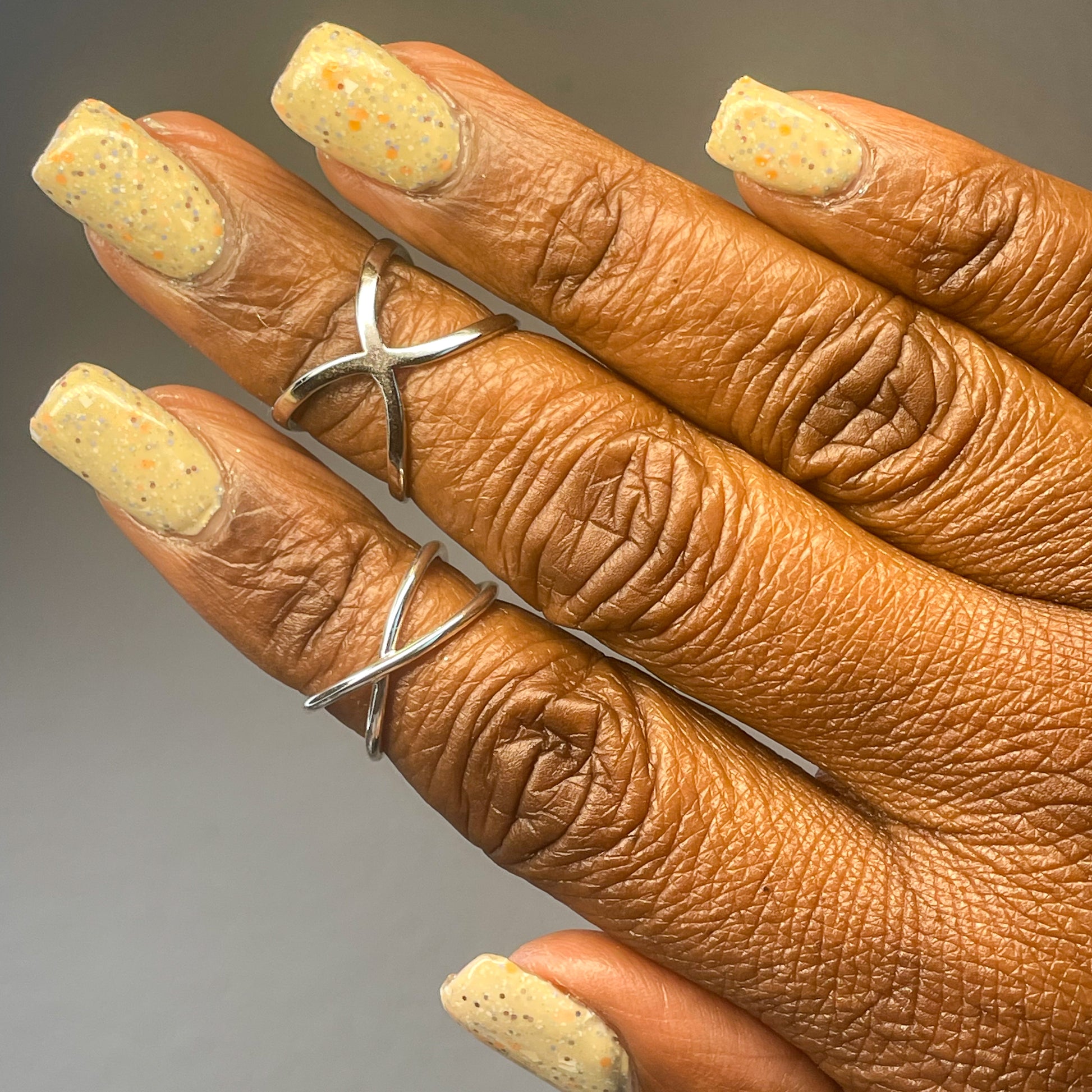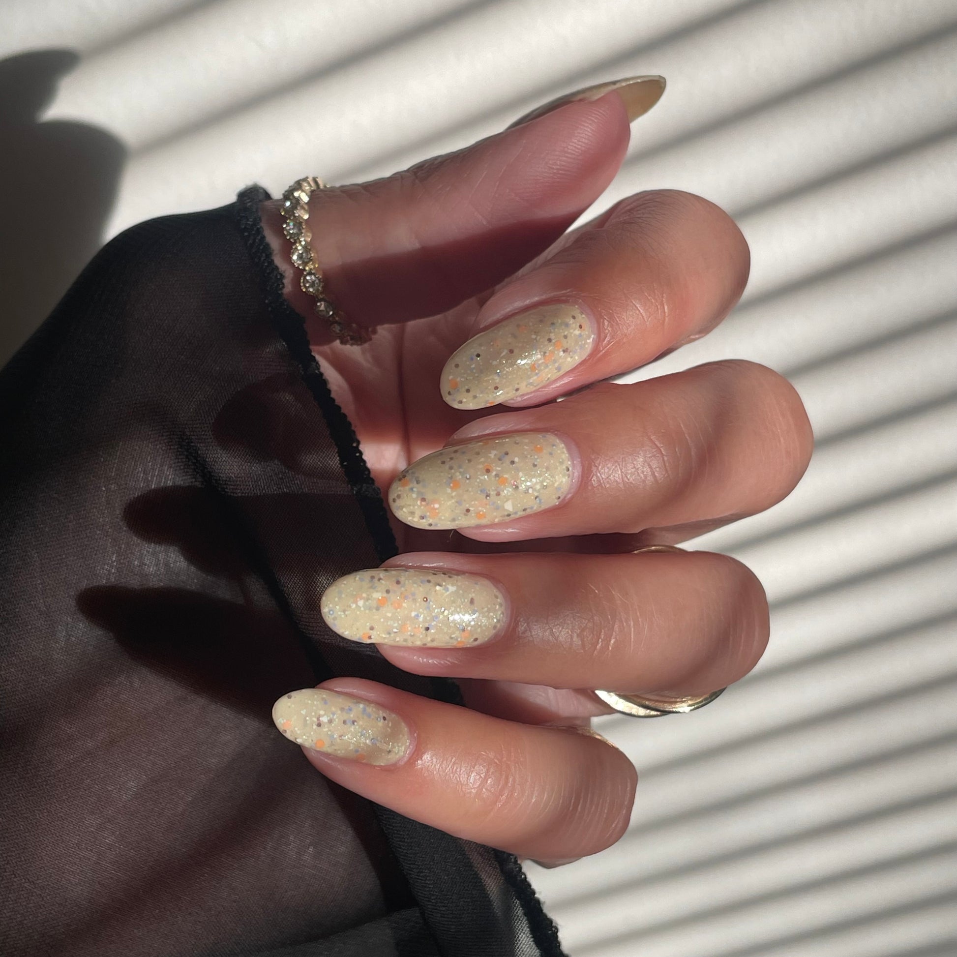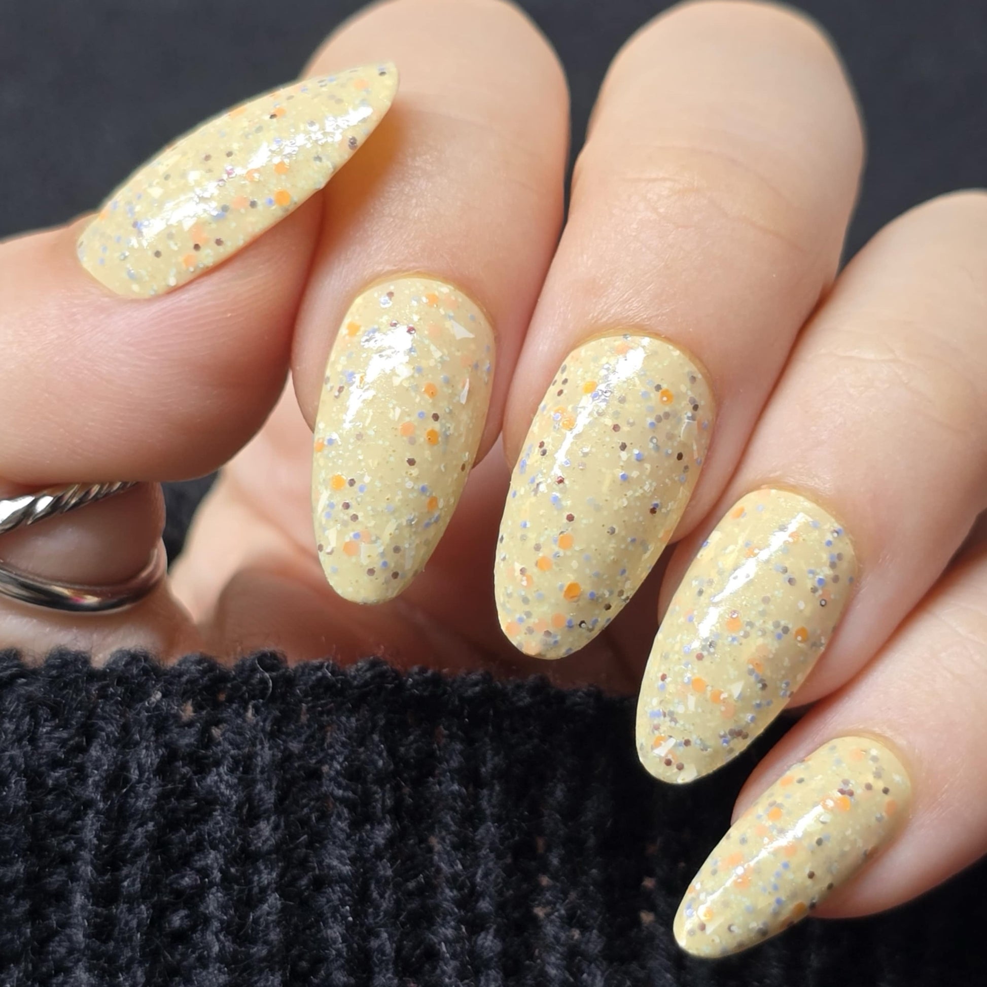Inspired by the LABUBU - Have A Seat blind box! Park Yourself is a white cream crelly with green shimmer, white flakes, orange, blue and brown hex glitters.