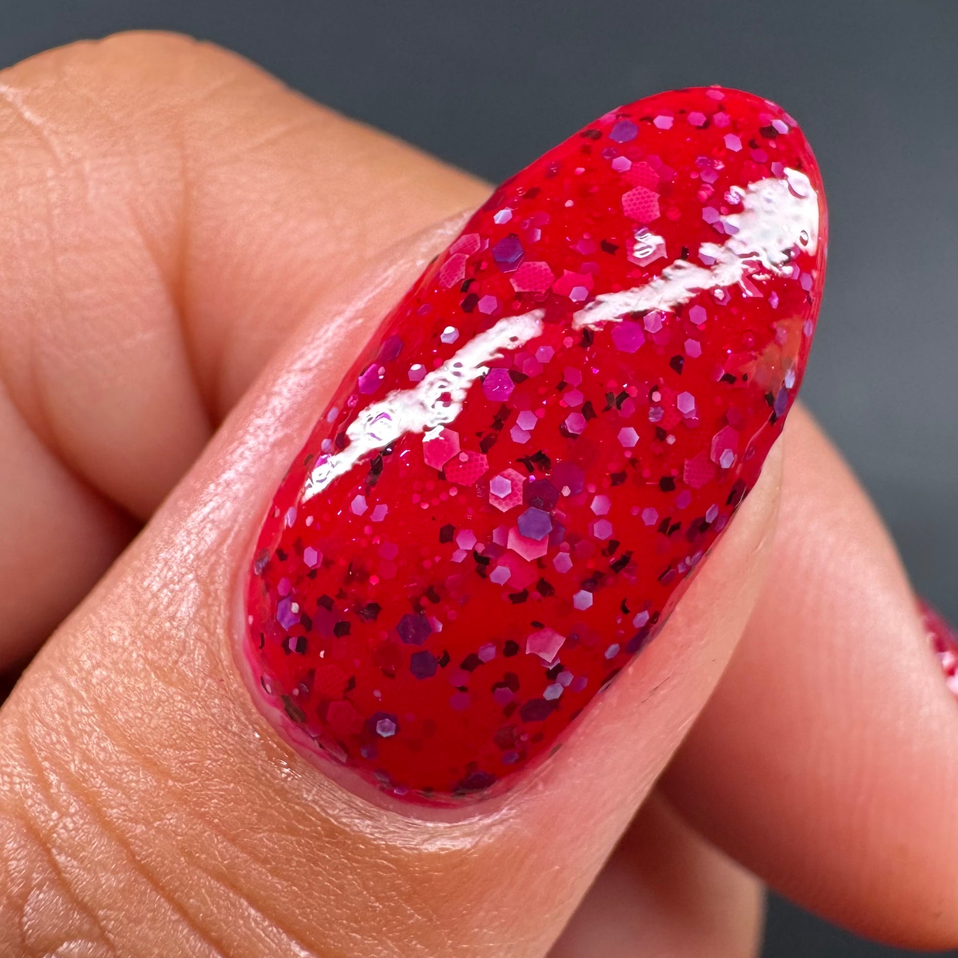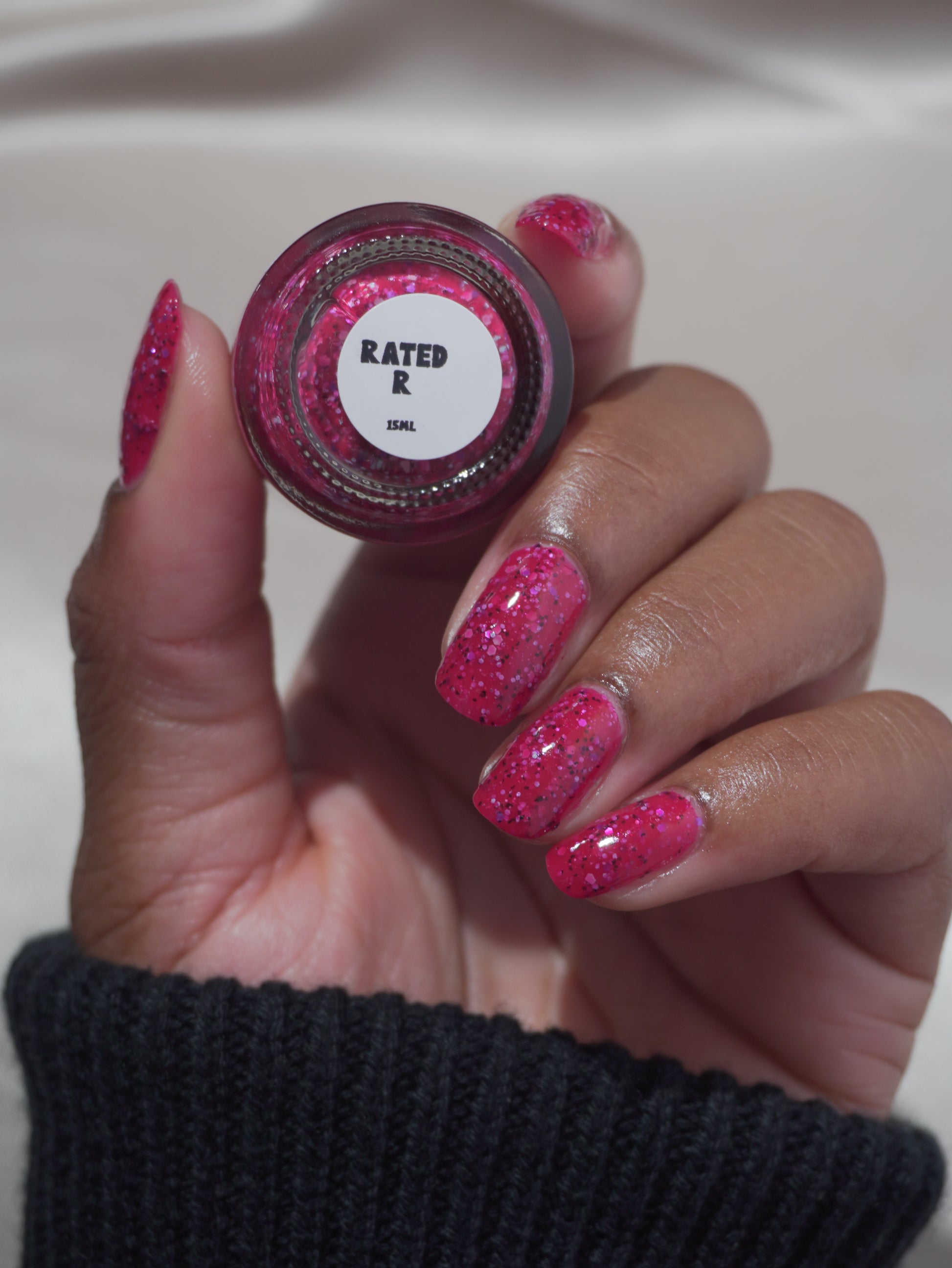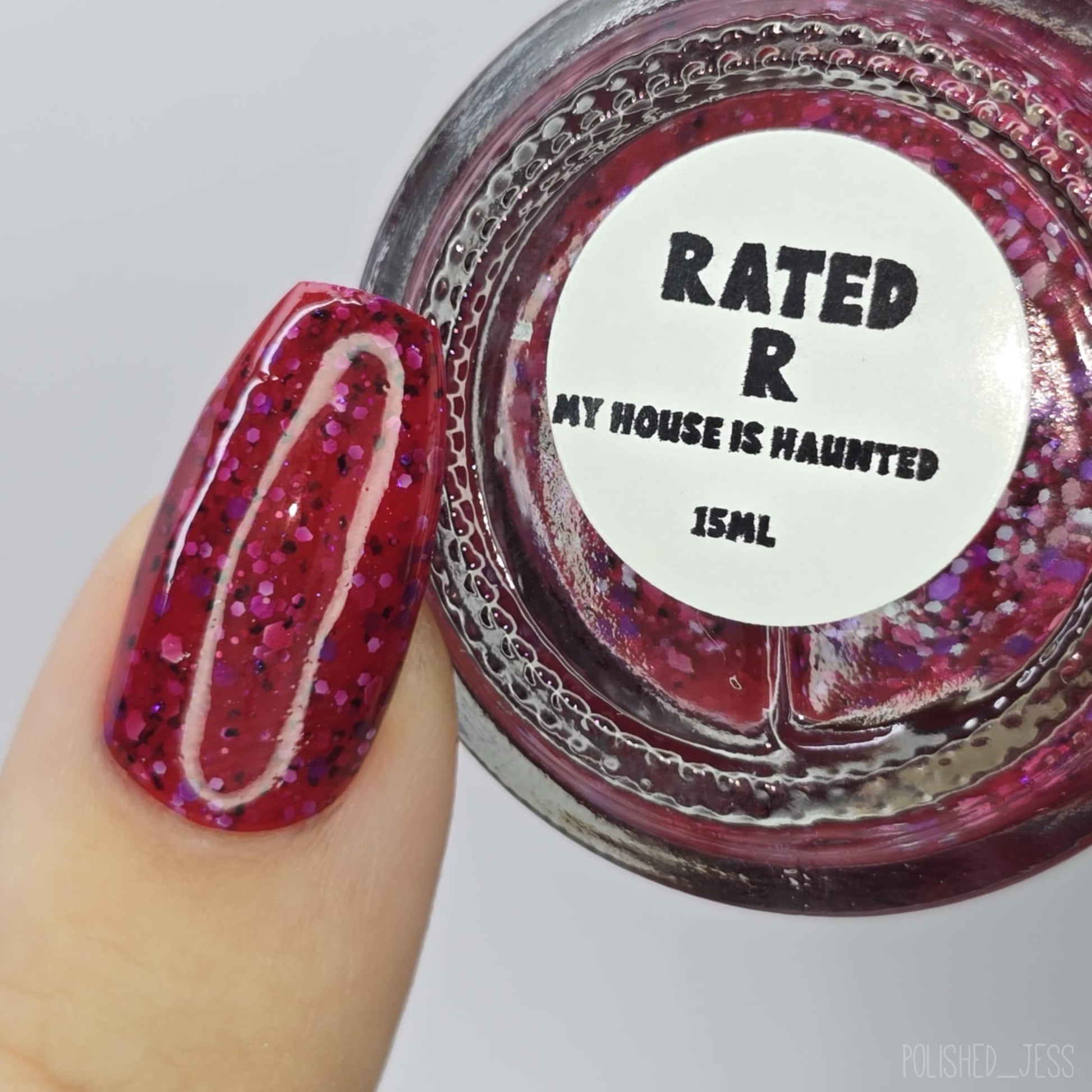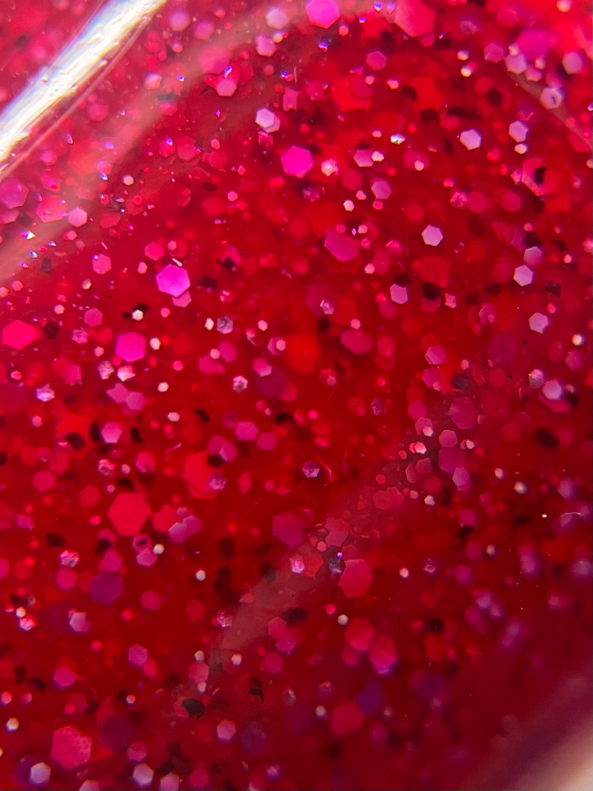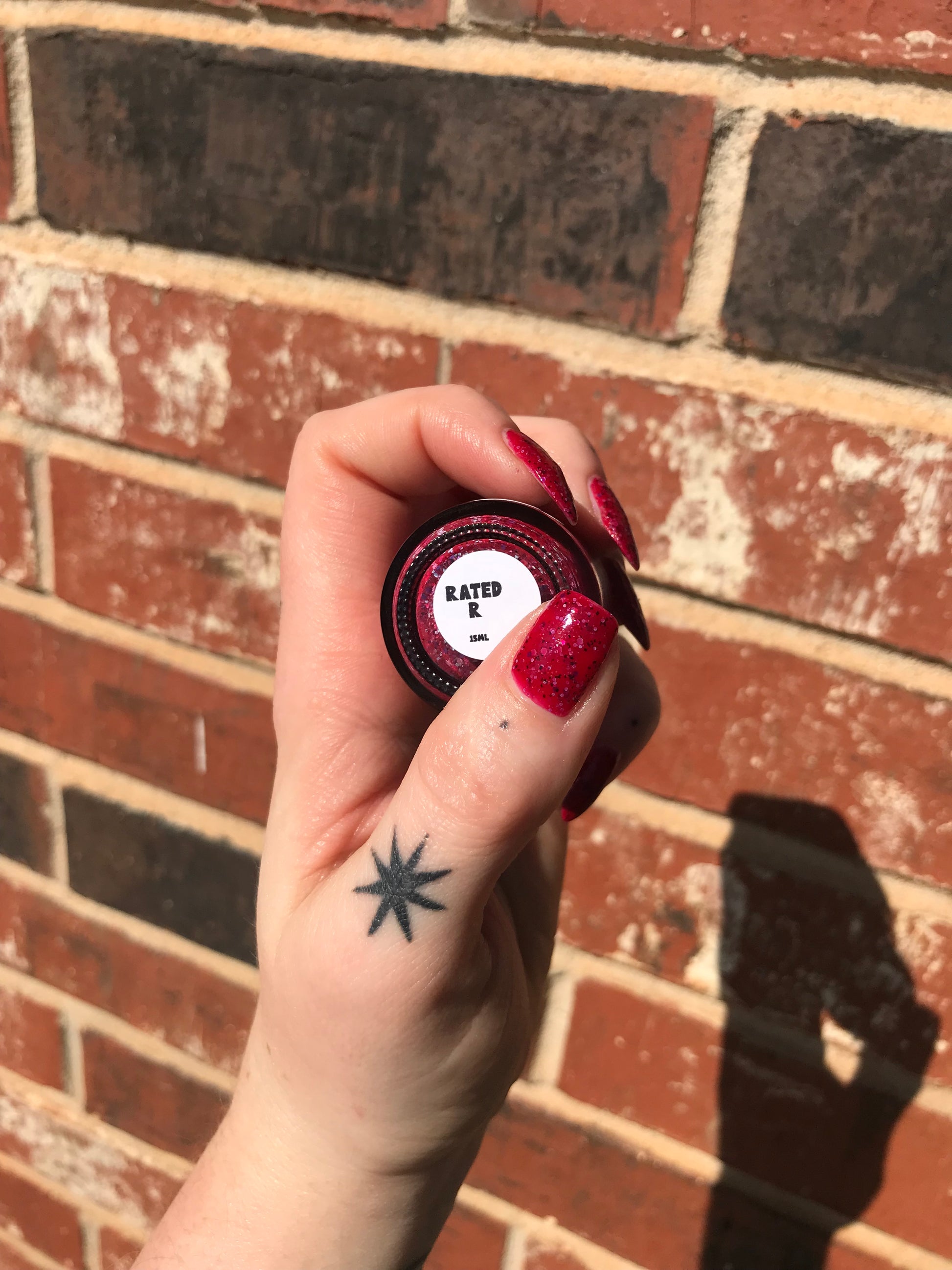Rated R is a red jelly crelly with black micro flakes, blue and purple hex glitters in various sizes!