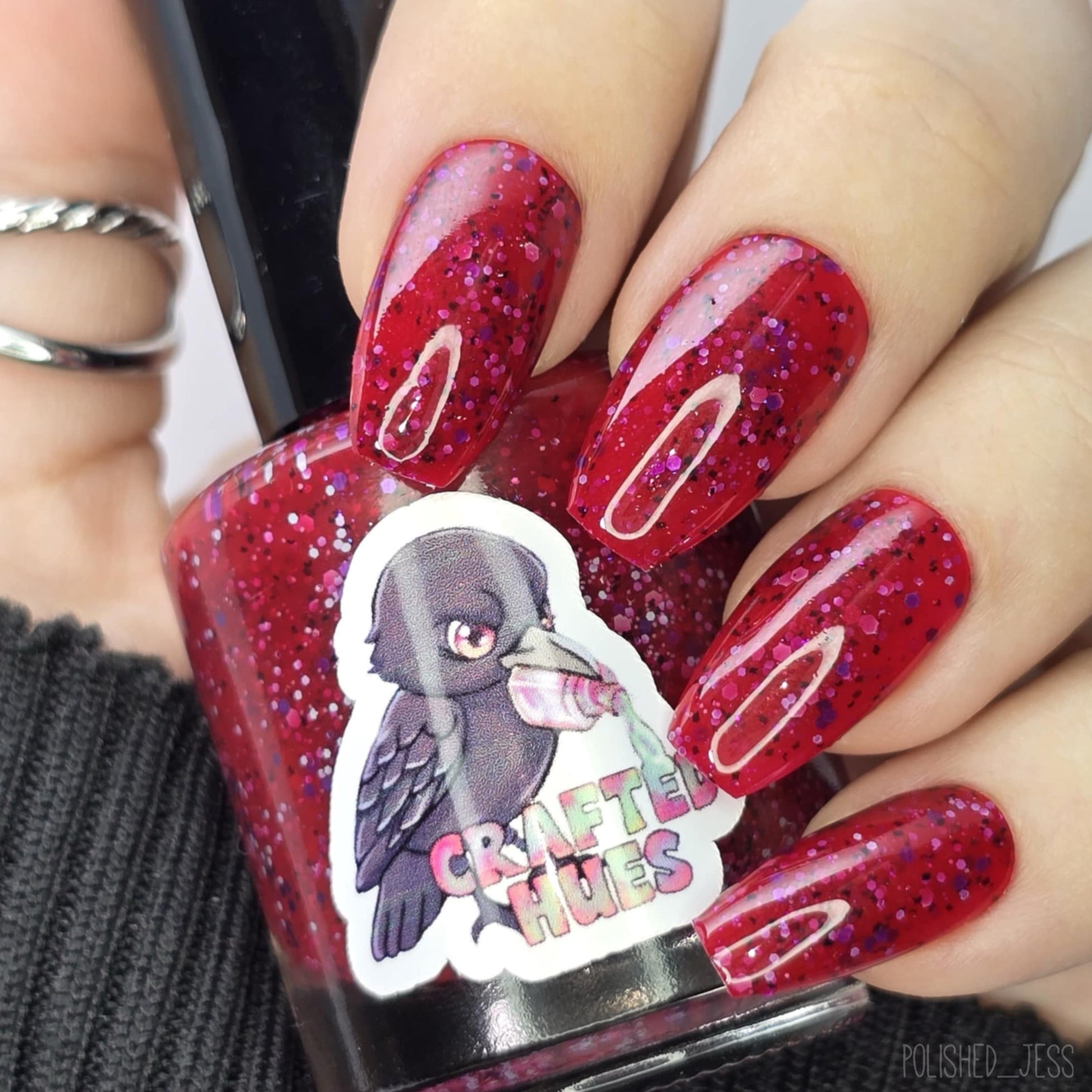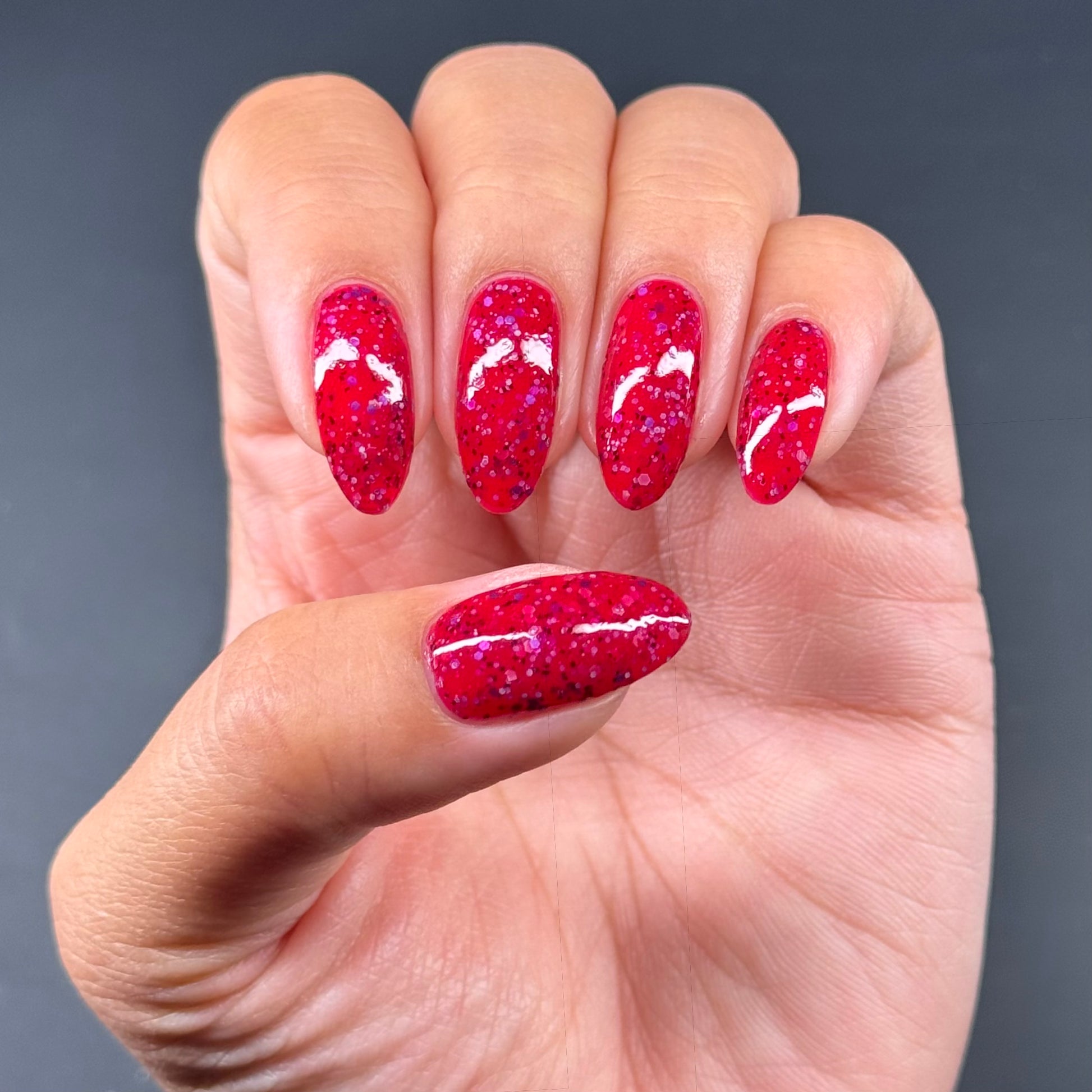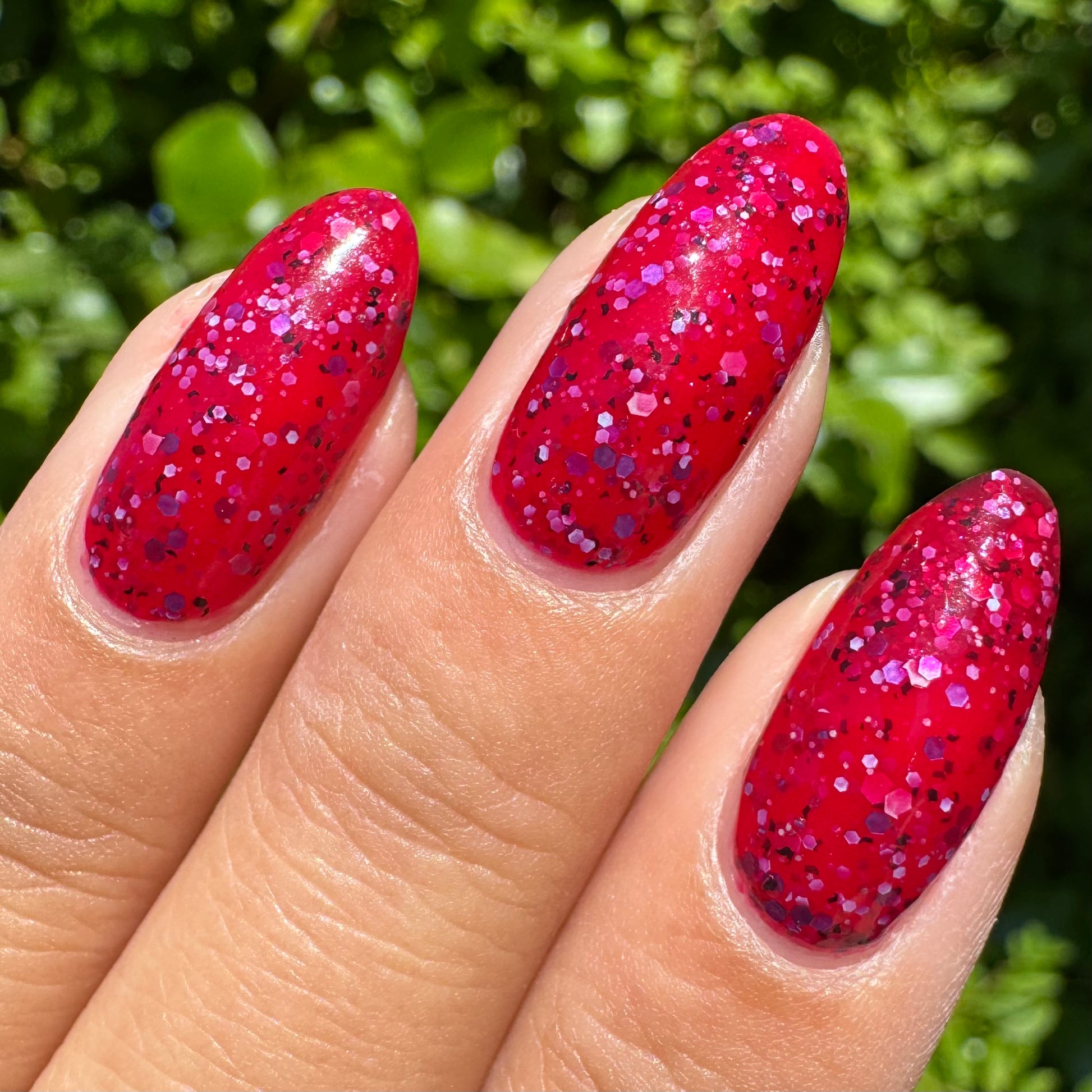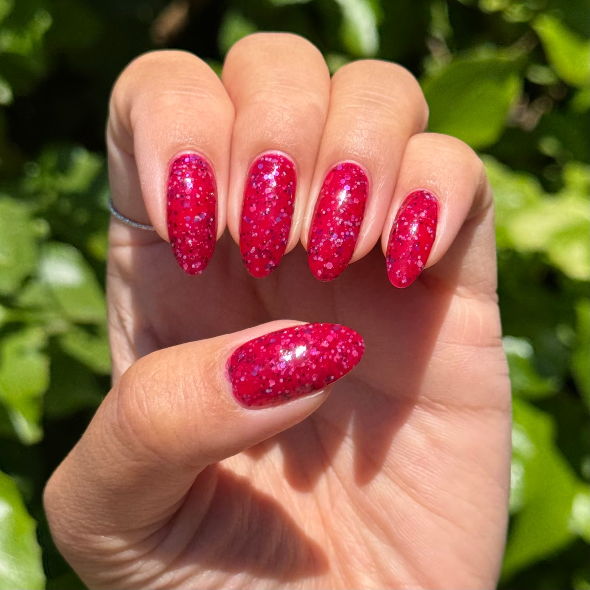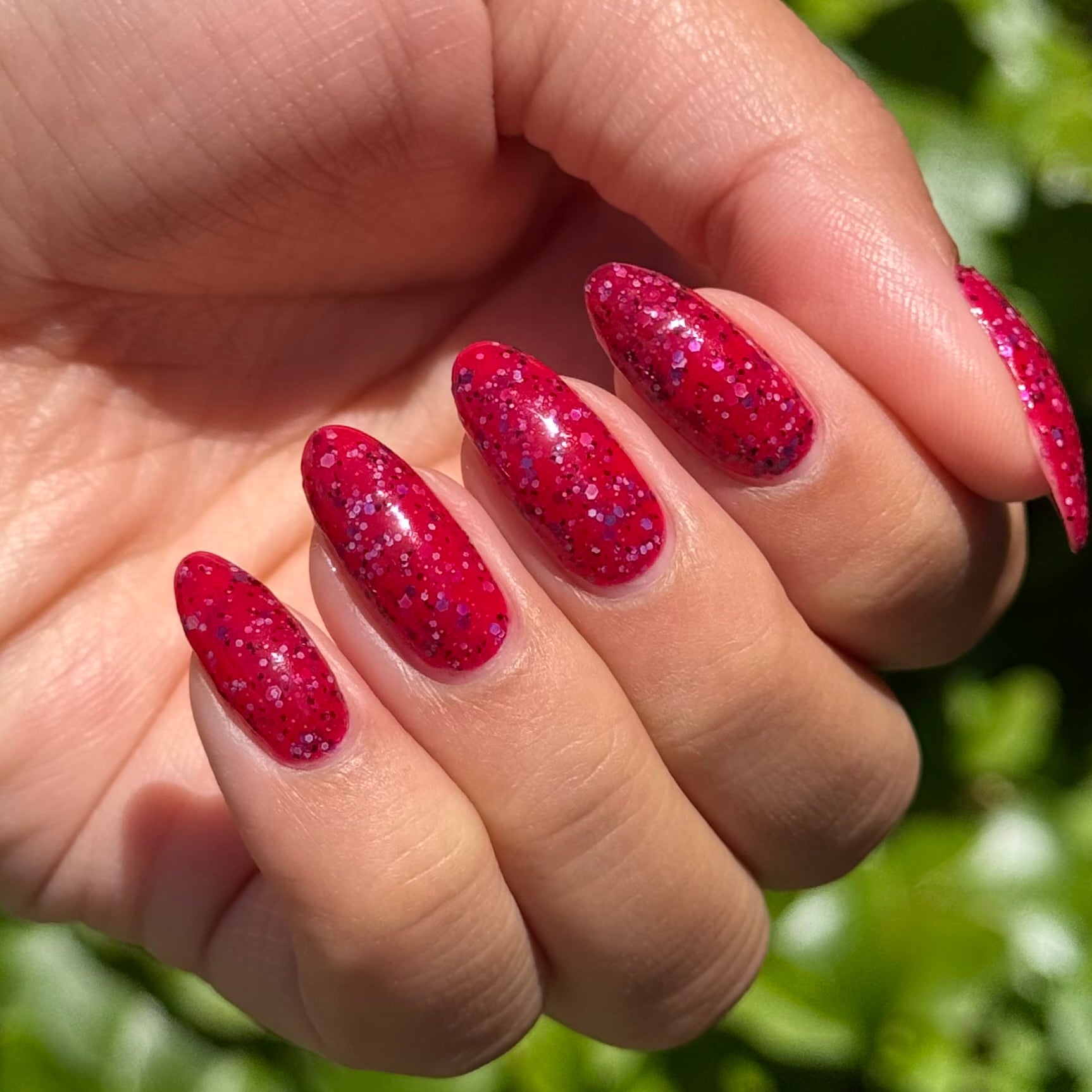 Rated R is a red jelly crelly with black micro flakes, blue and purple hex glitters in various sizes!
