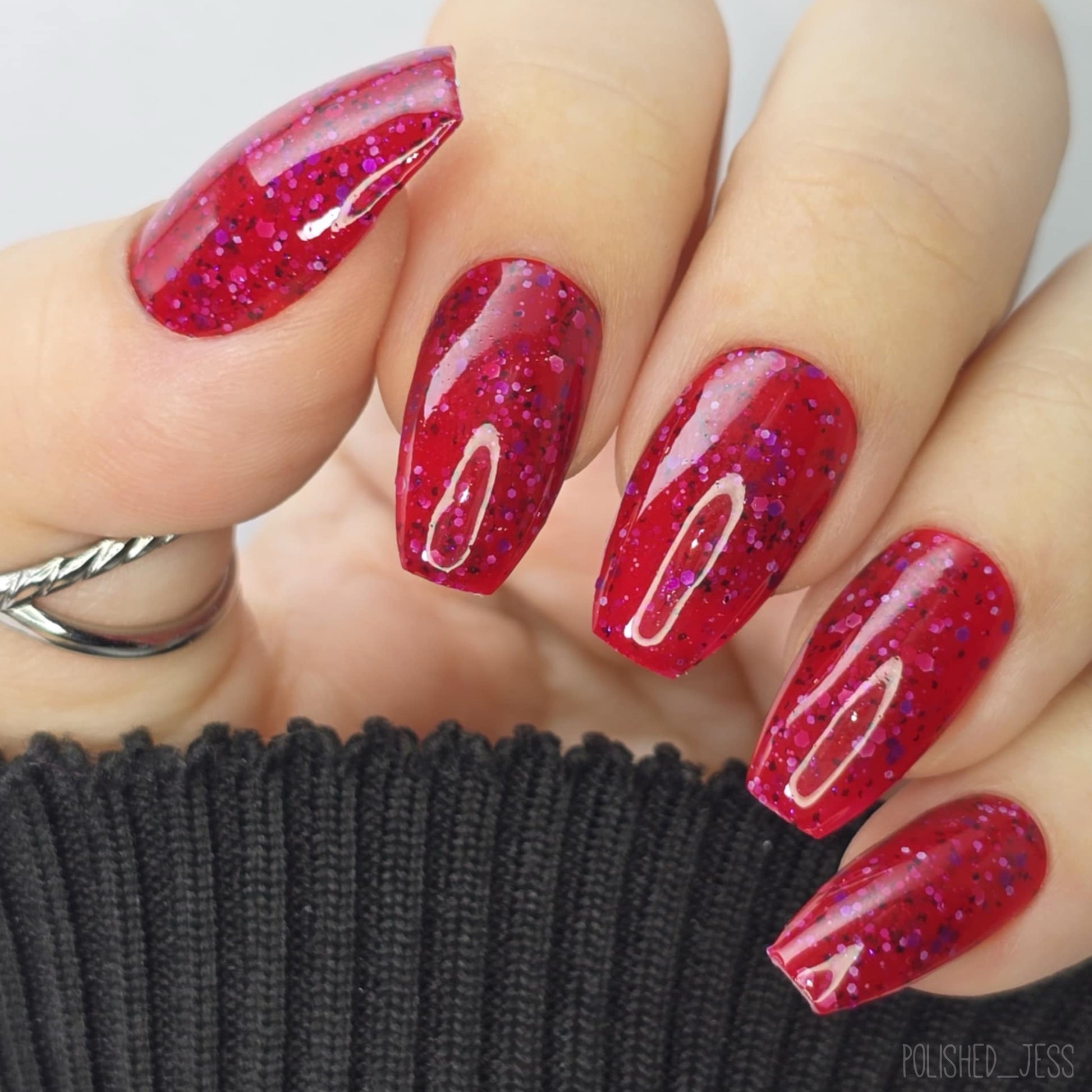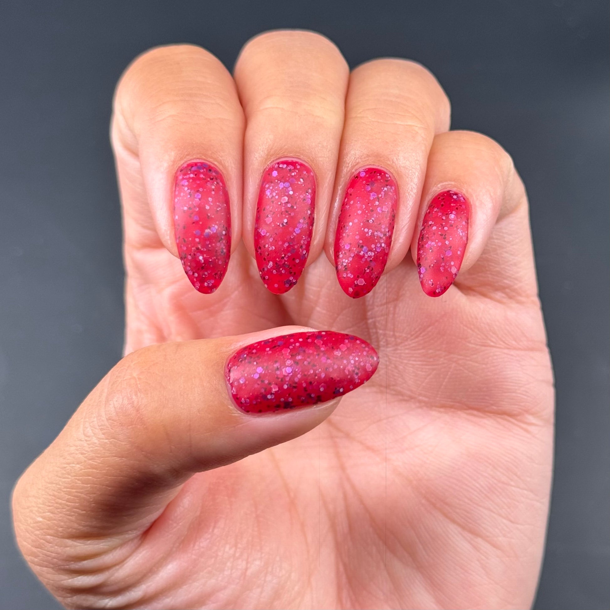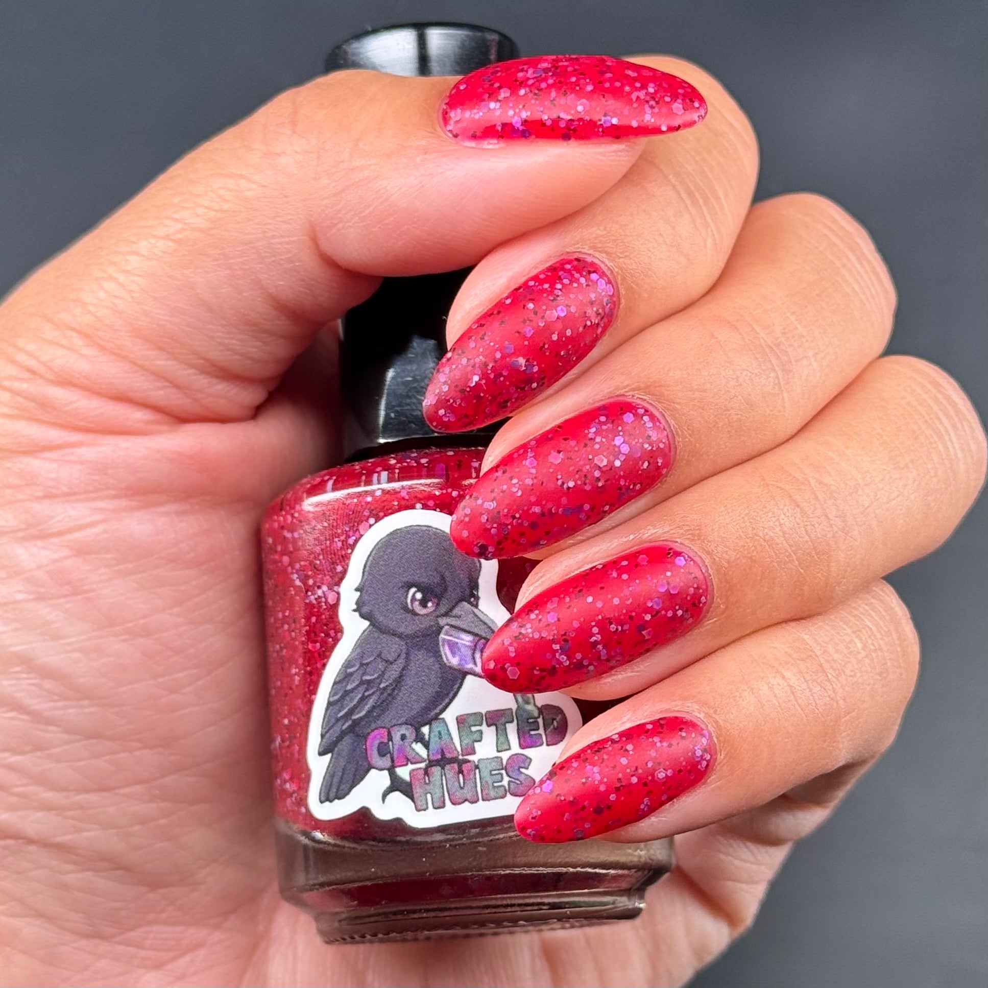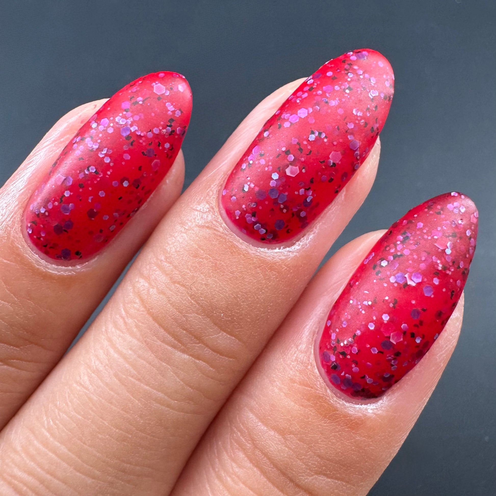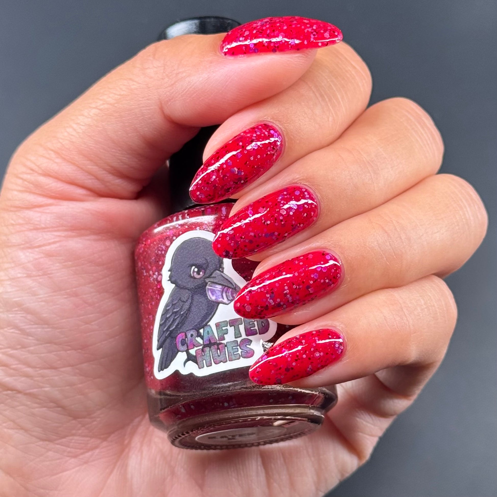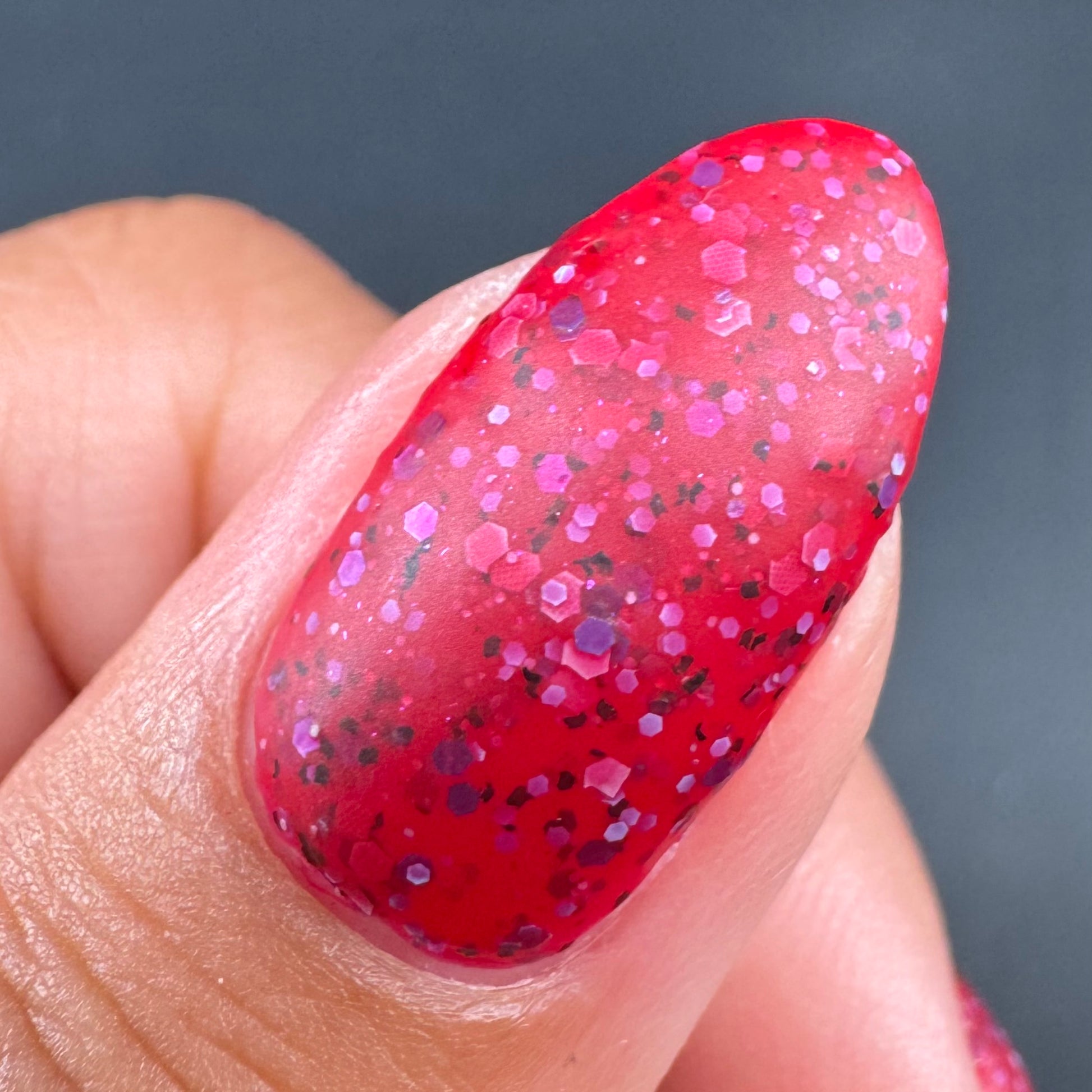 Rated R is a red jelly crelly with black micro flakes, blue and purple hex glitters in various sizes!