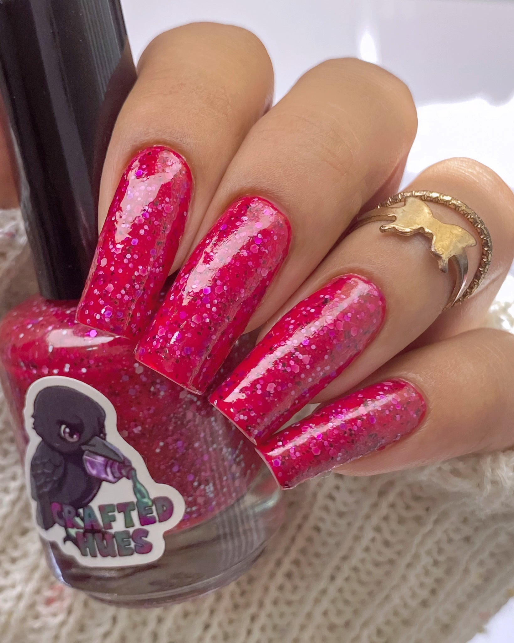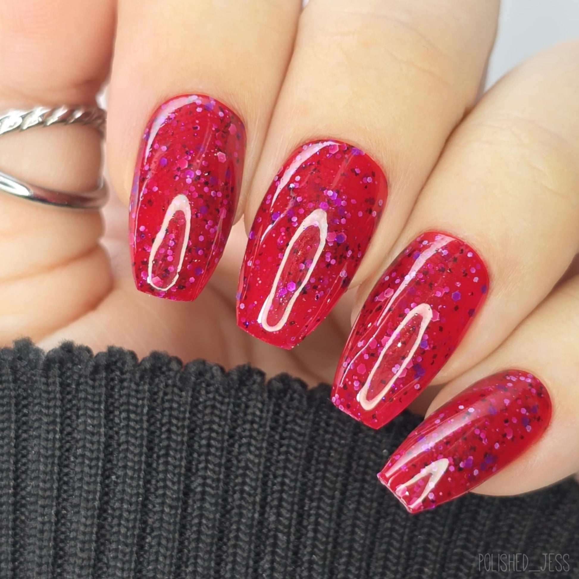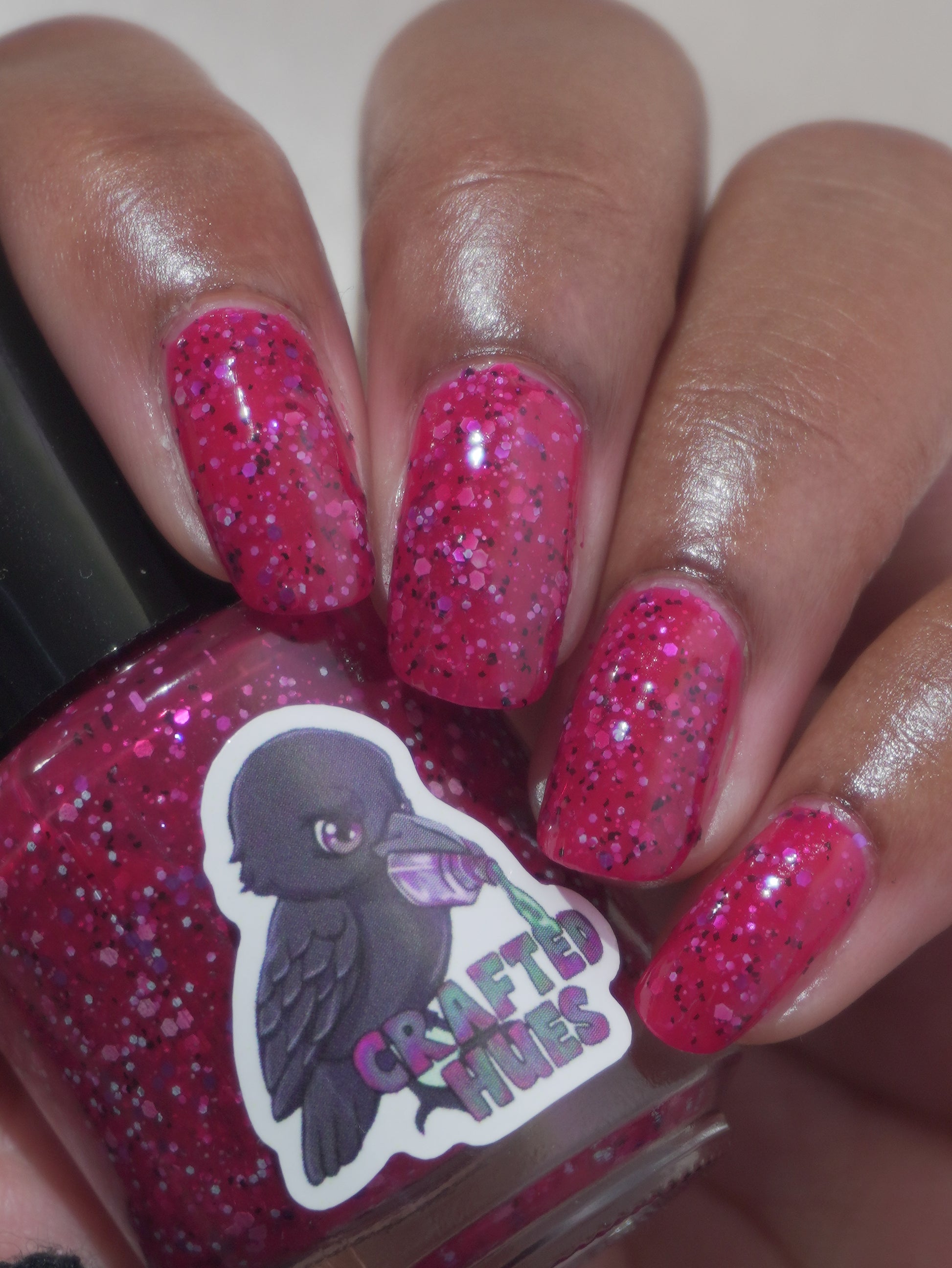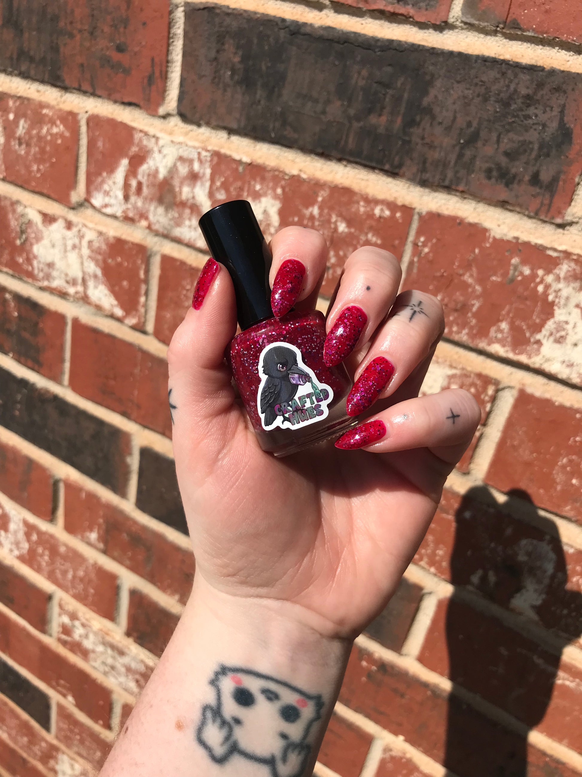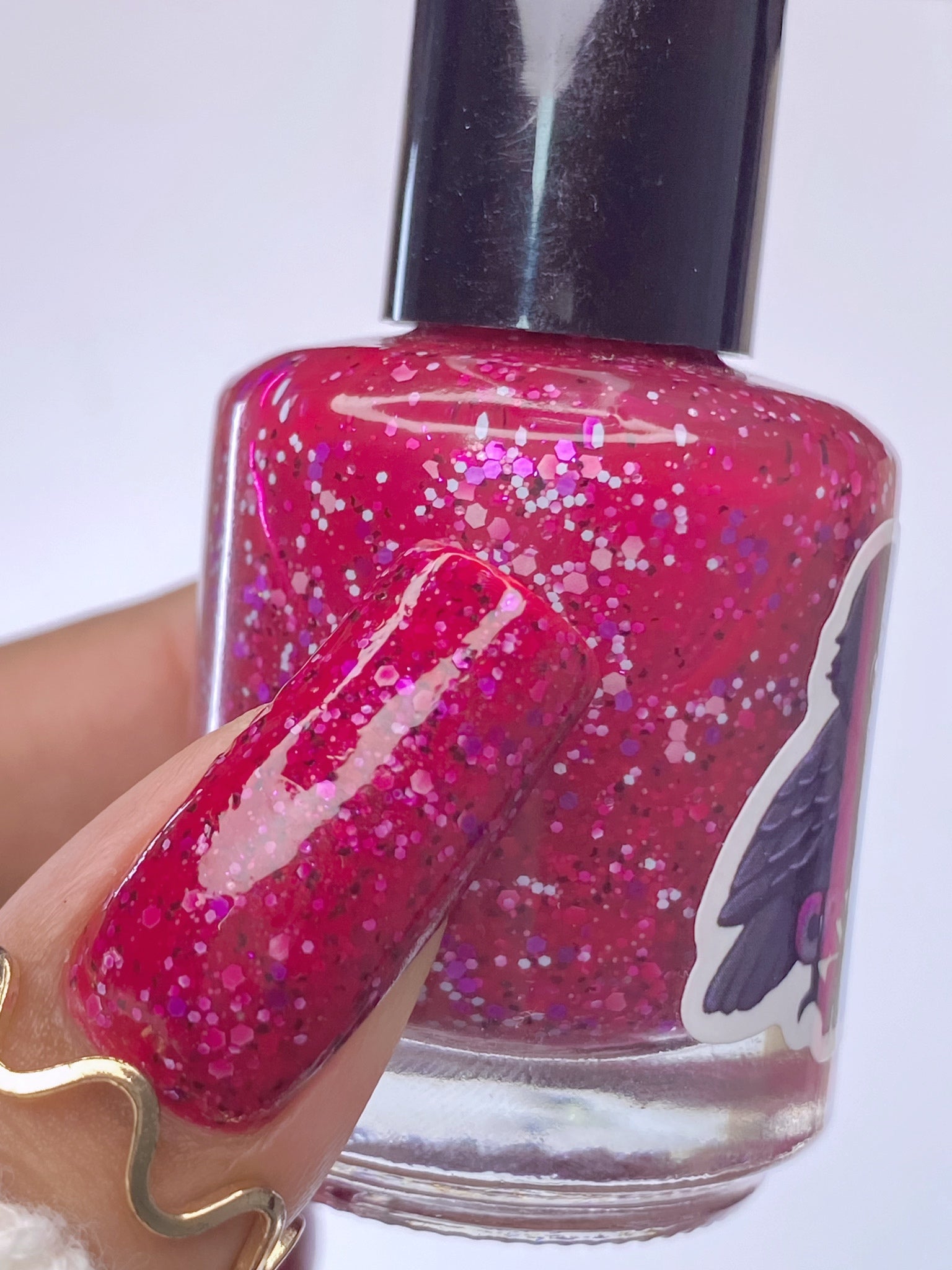 Rated R is a red jelly crelly with black micro flakes, blue and purple hex glitters in various sizes!