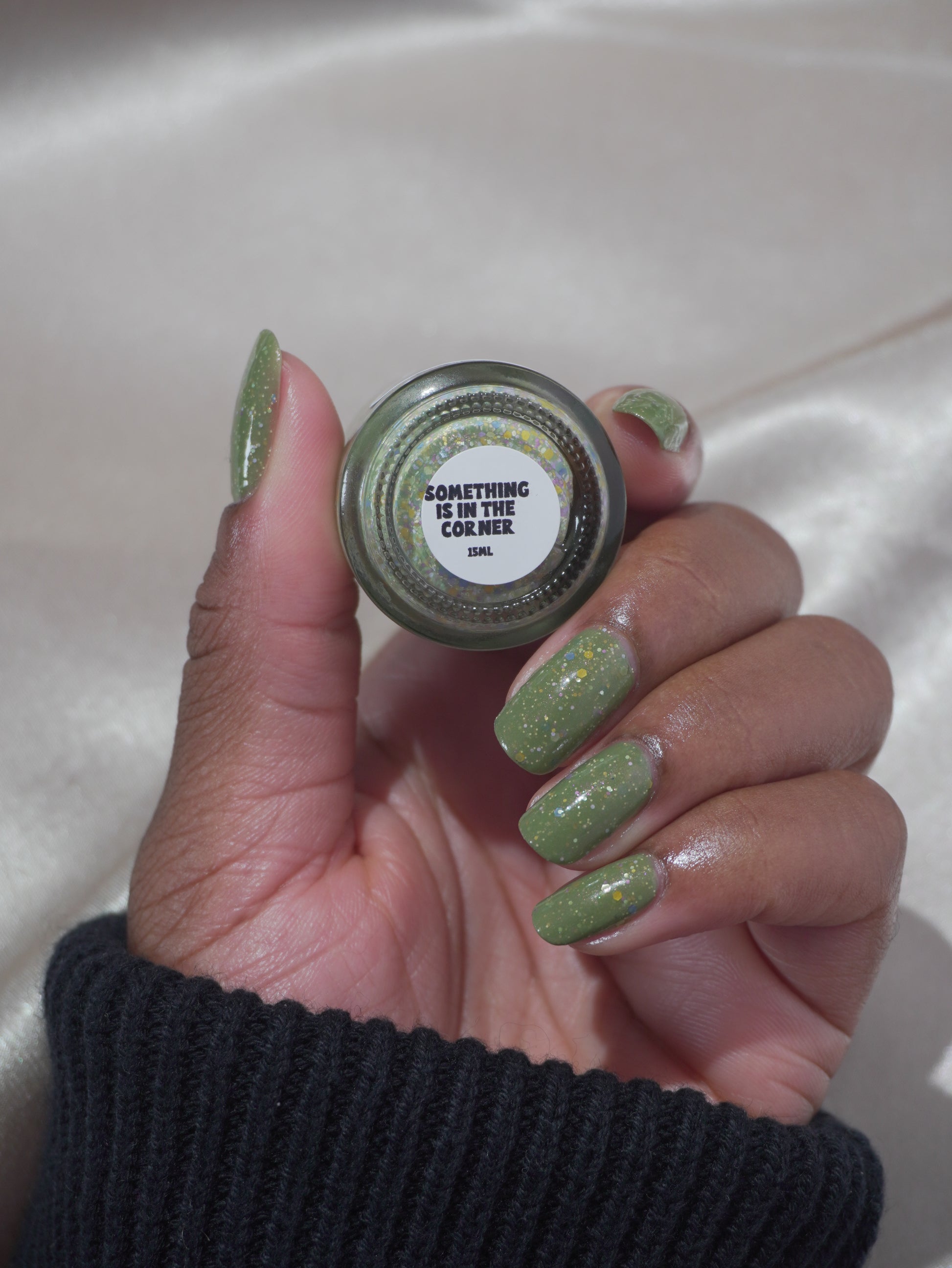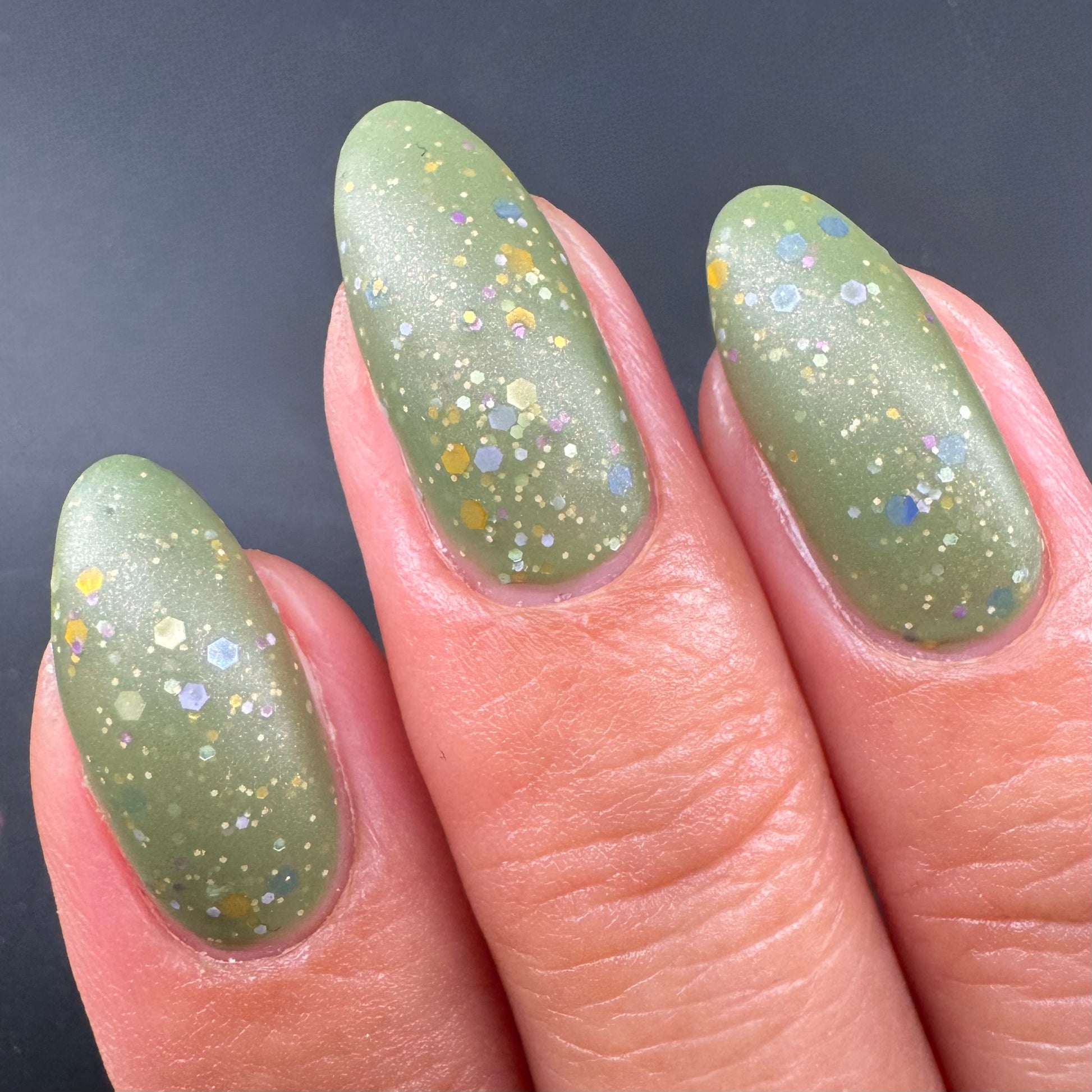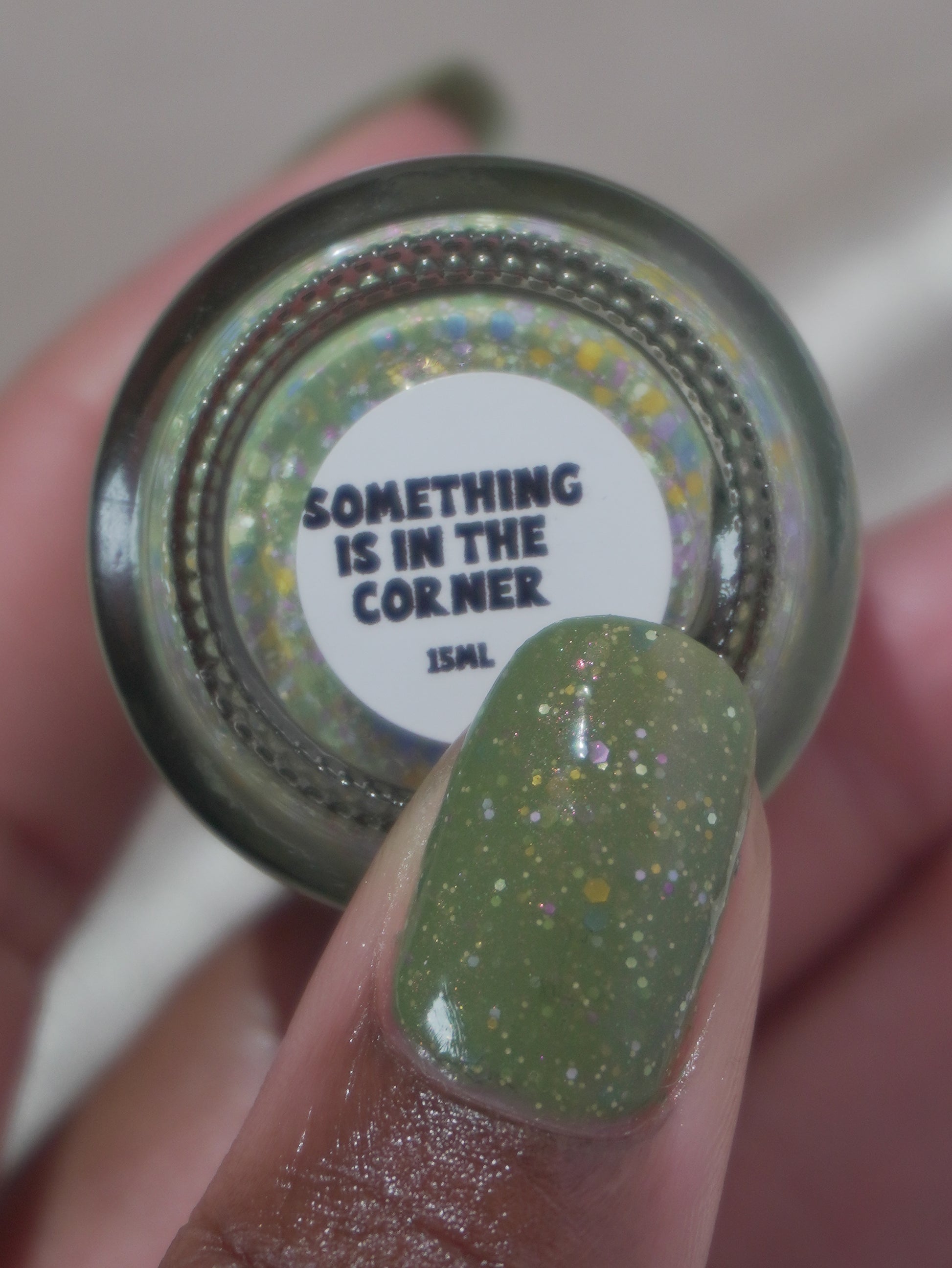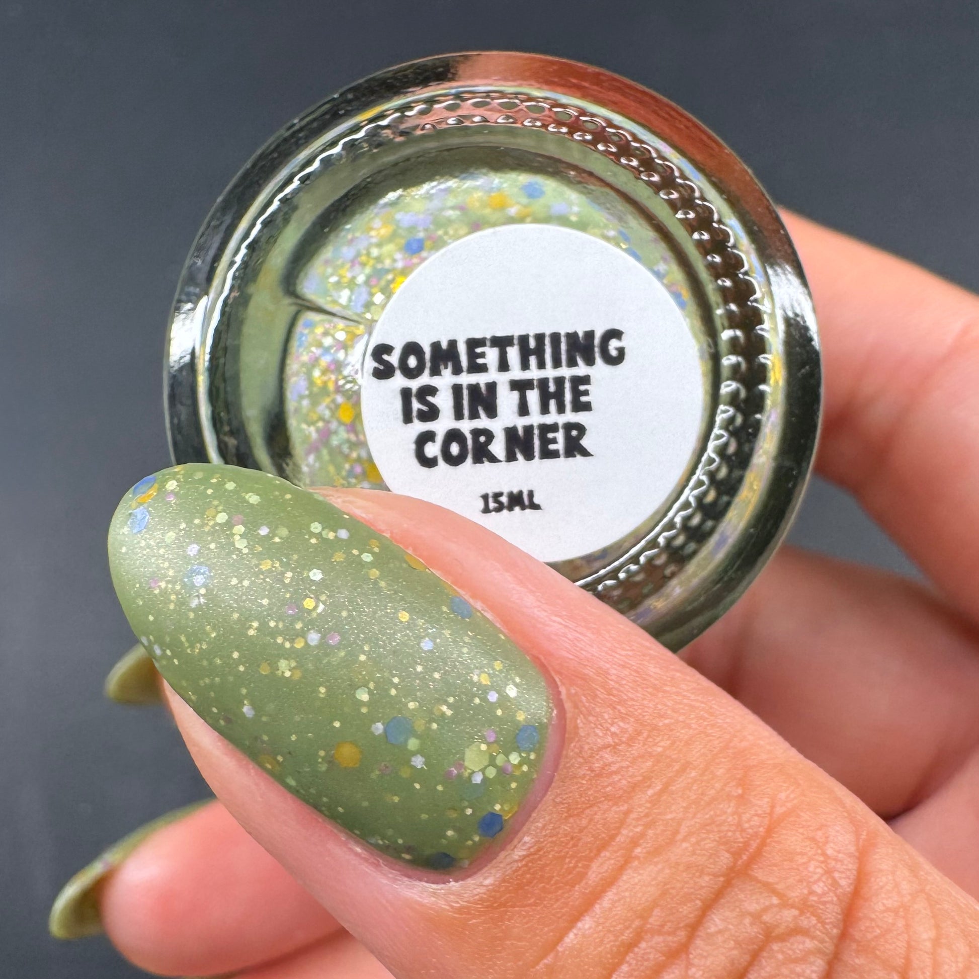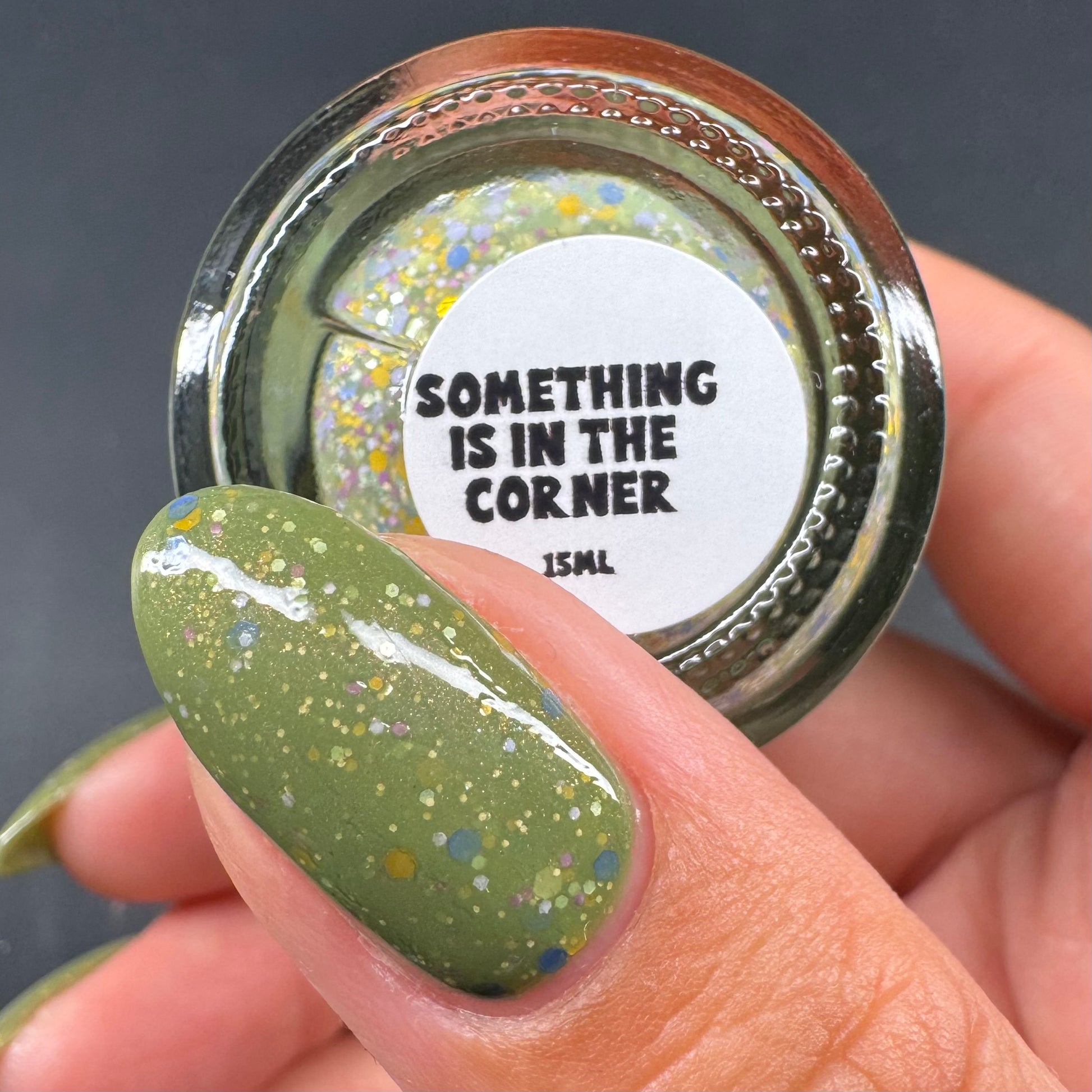 Something Is In The Corner is an army green crelly with pink shimmer, pink, green, blue and orange glitter hexes in various sizes.