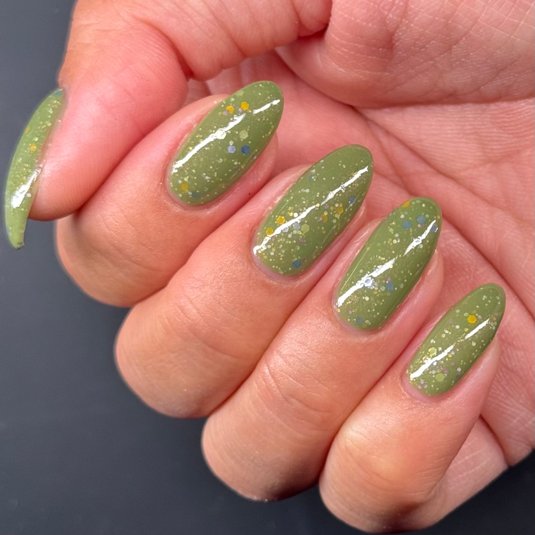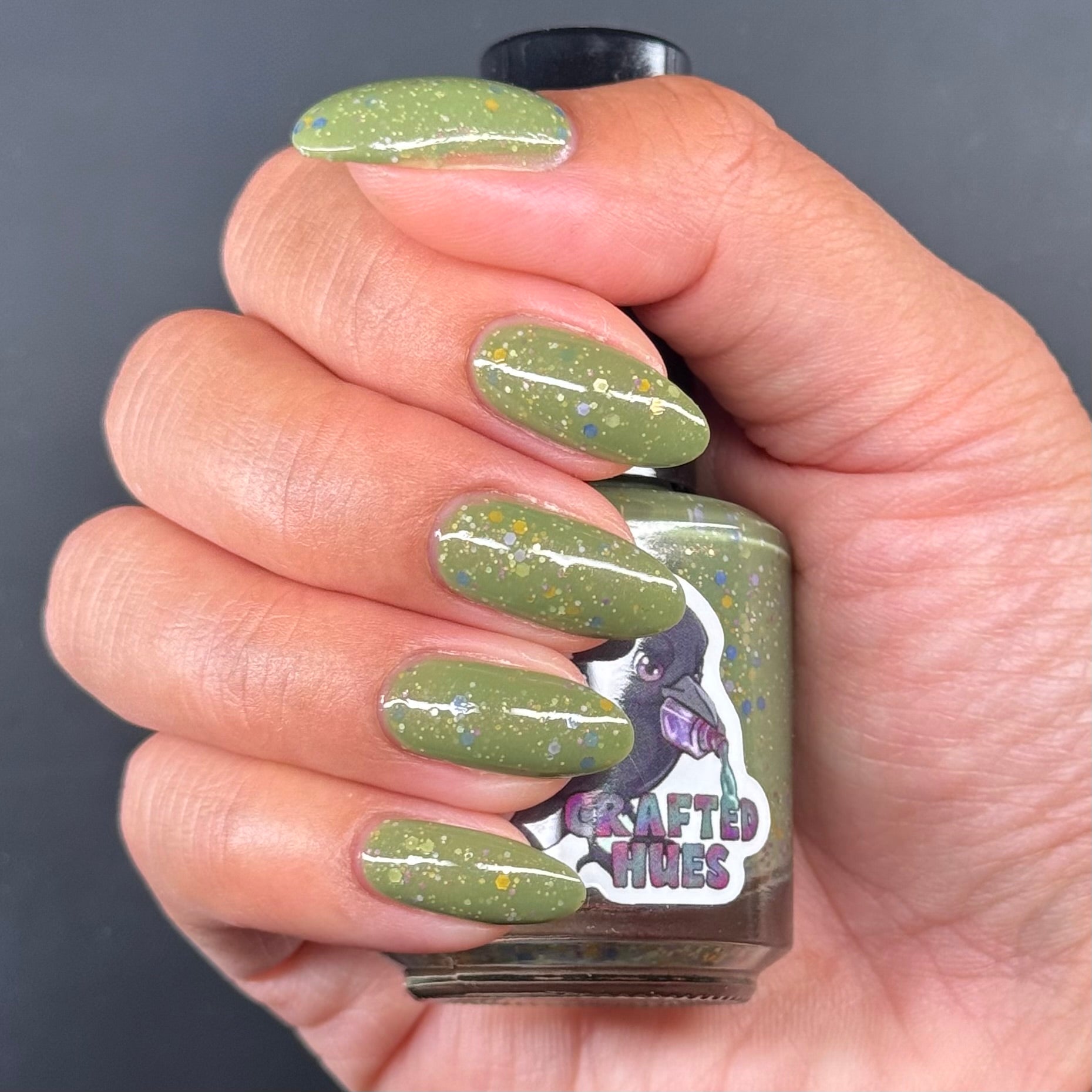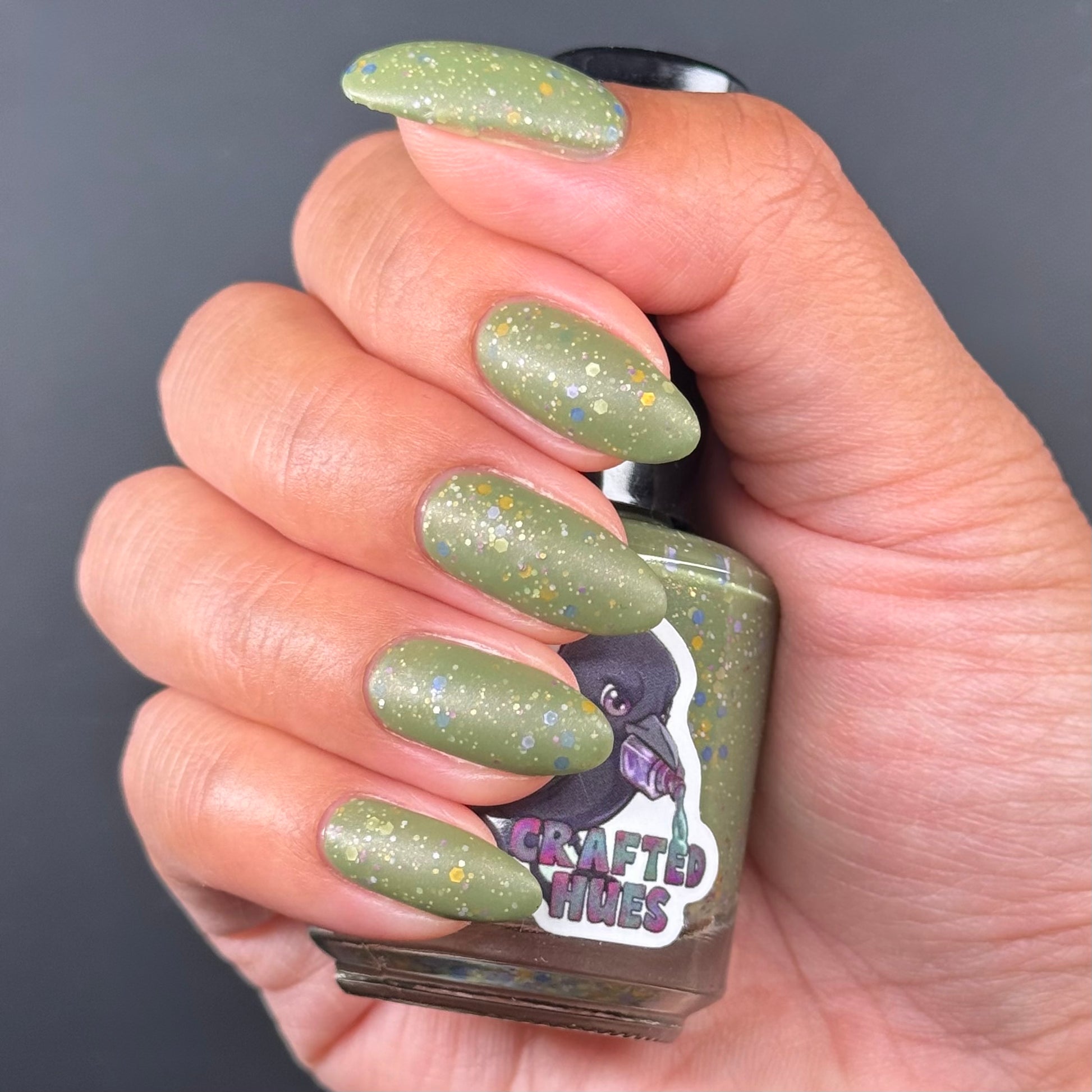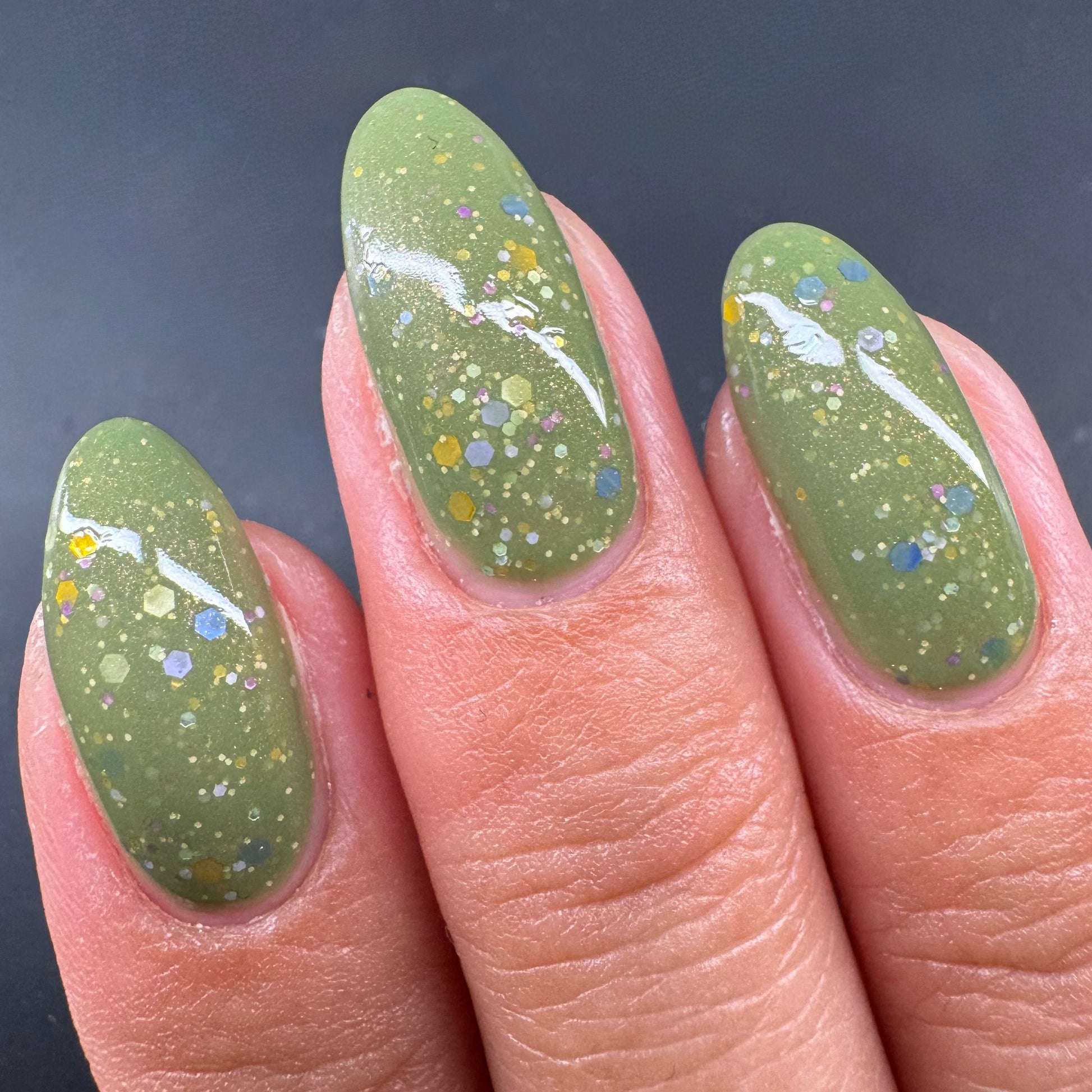 Something Is In The Corner is an army green crelly with pink shimmer, pink, green, blue and orange glitter hexes in various sizes.
