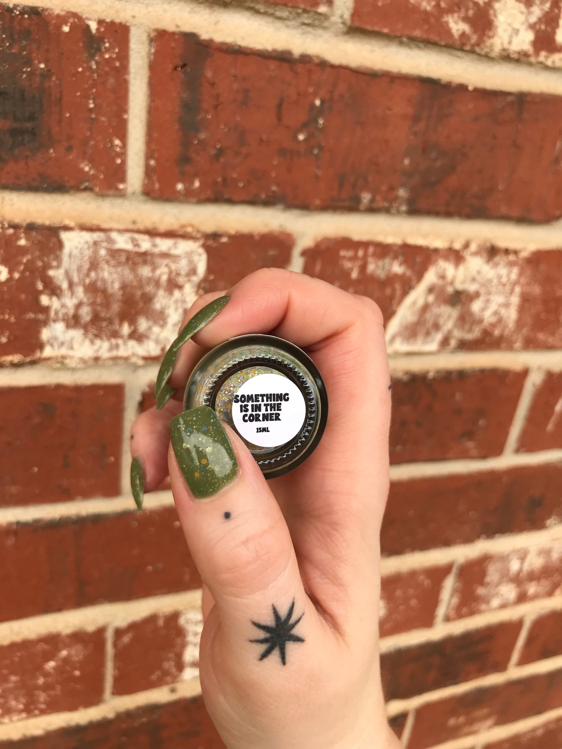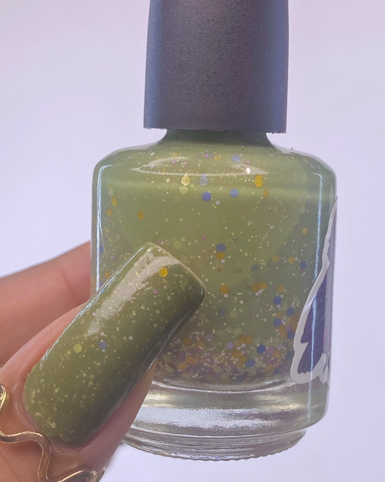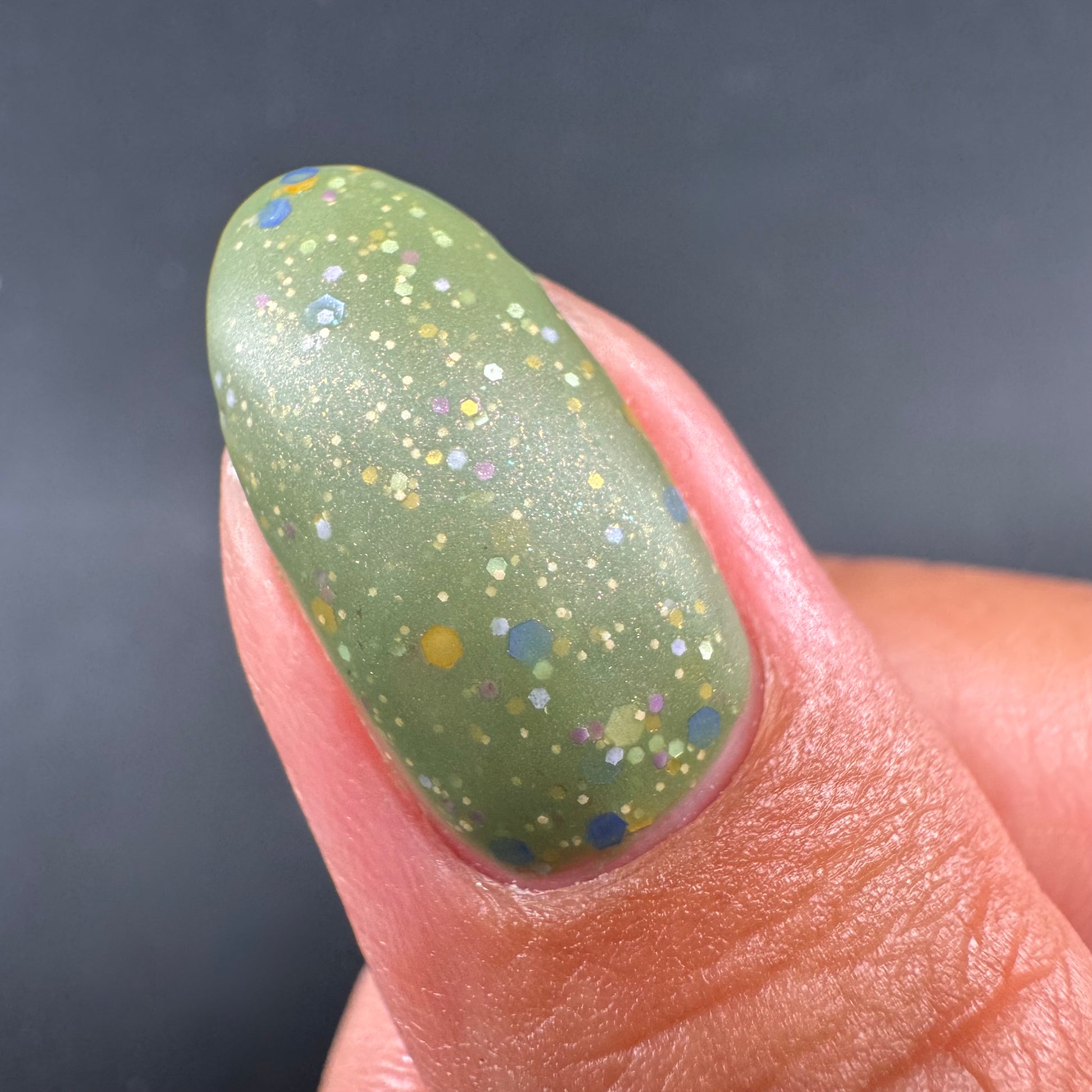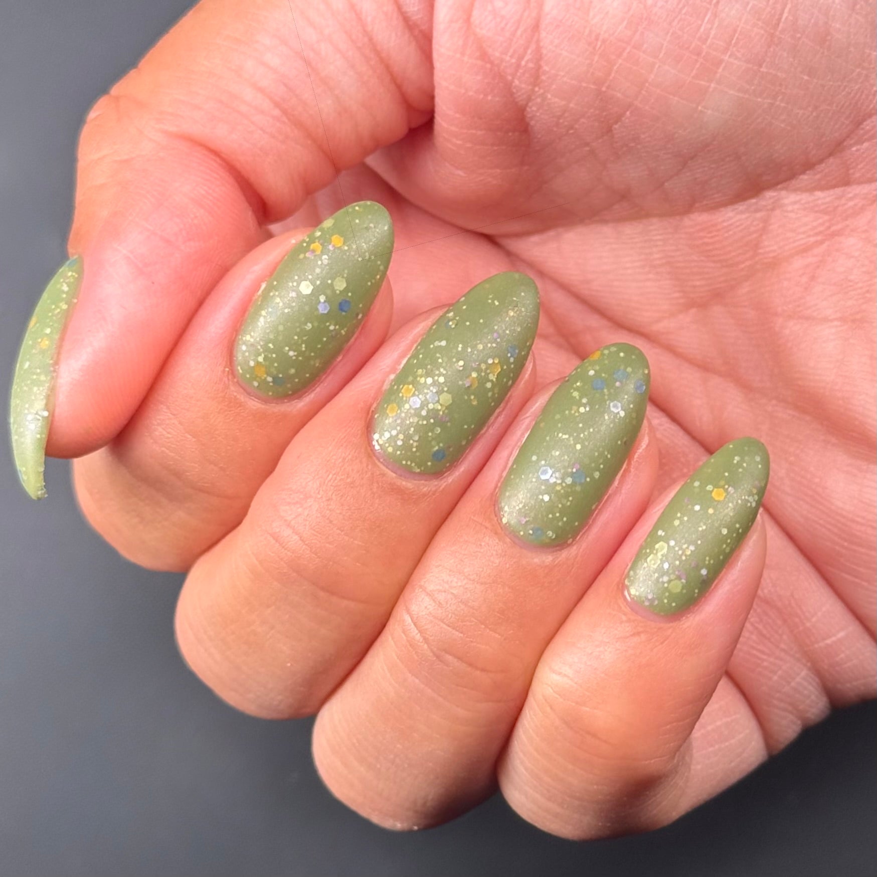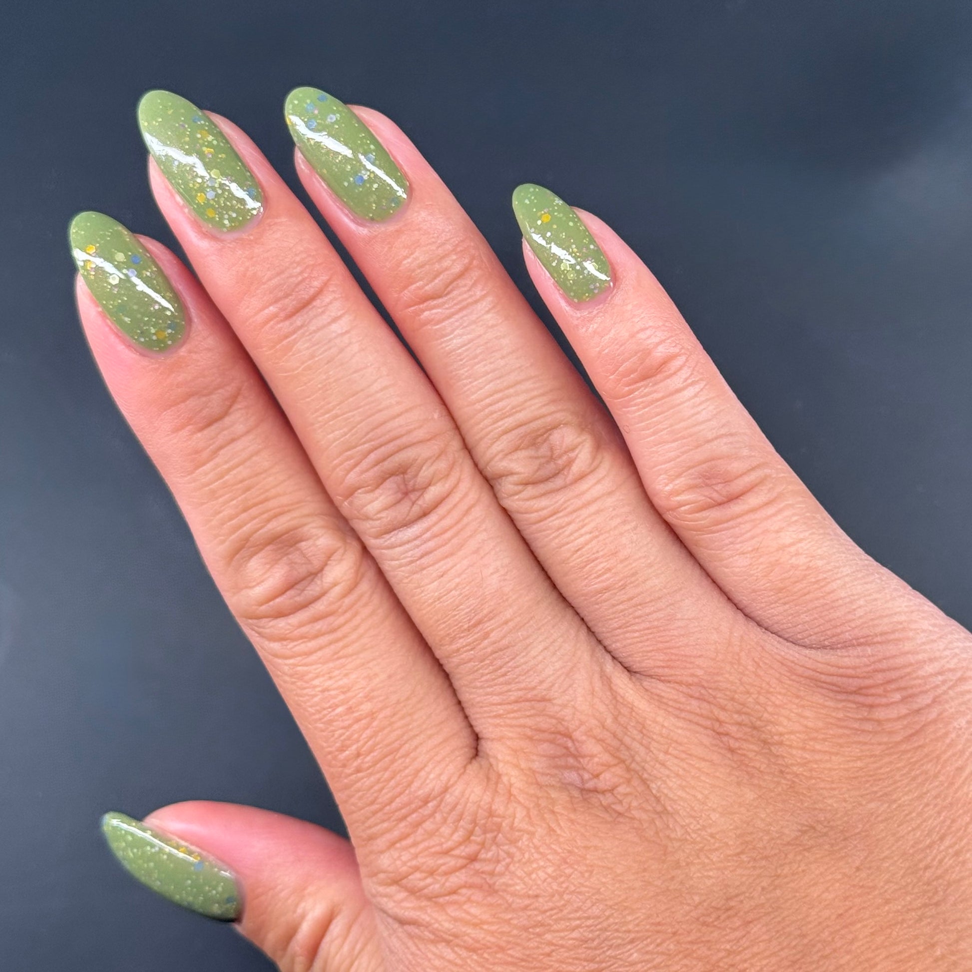 Something Is In The Corner is an army green crelly with pink shimmer, pink, green, blue and orange glitter hexes in various sizes.