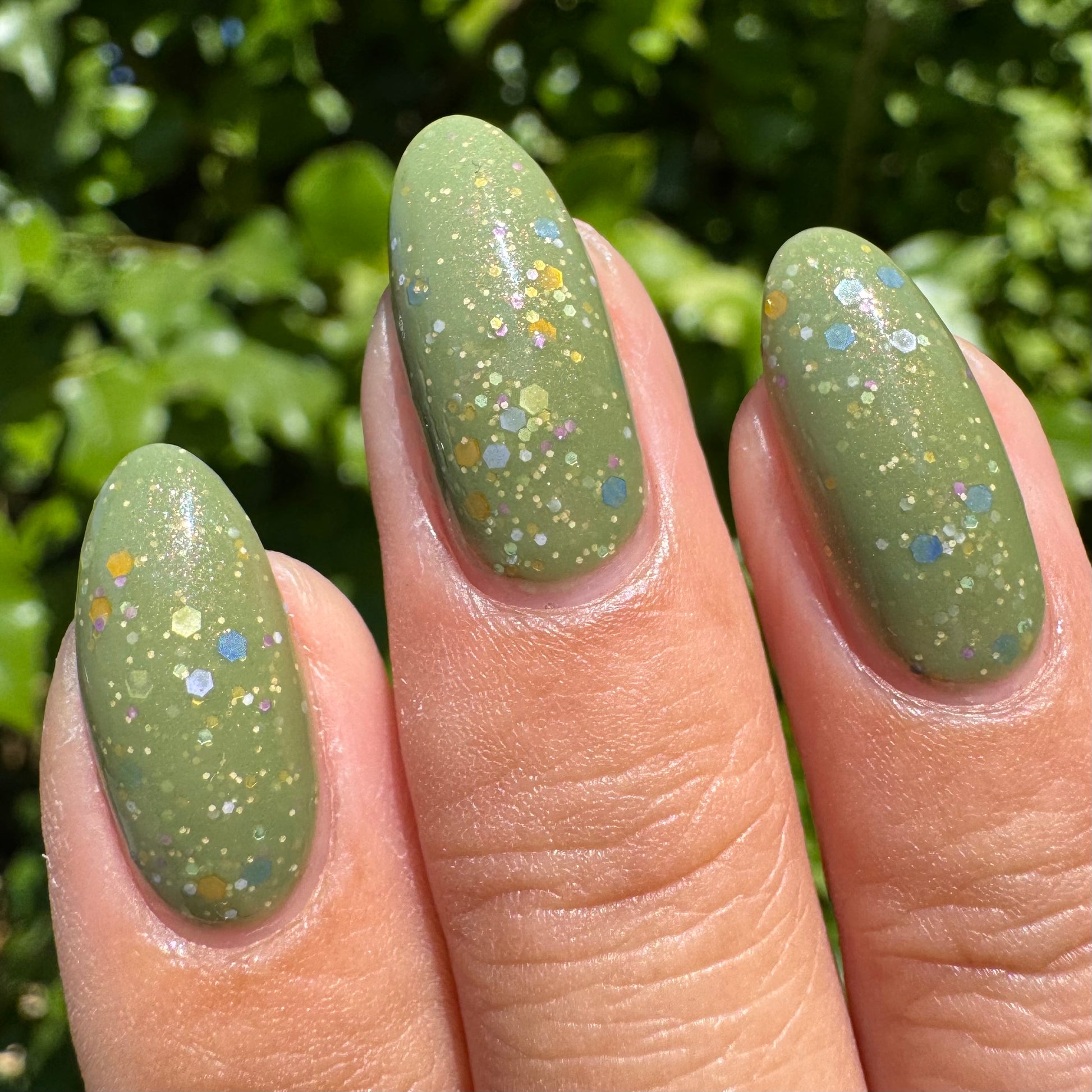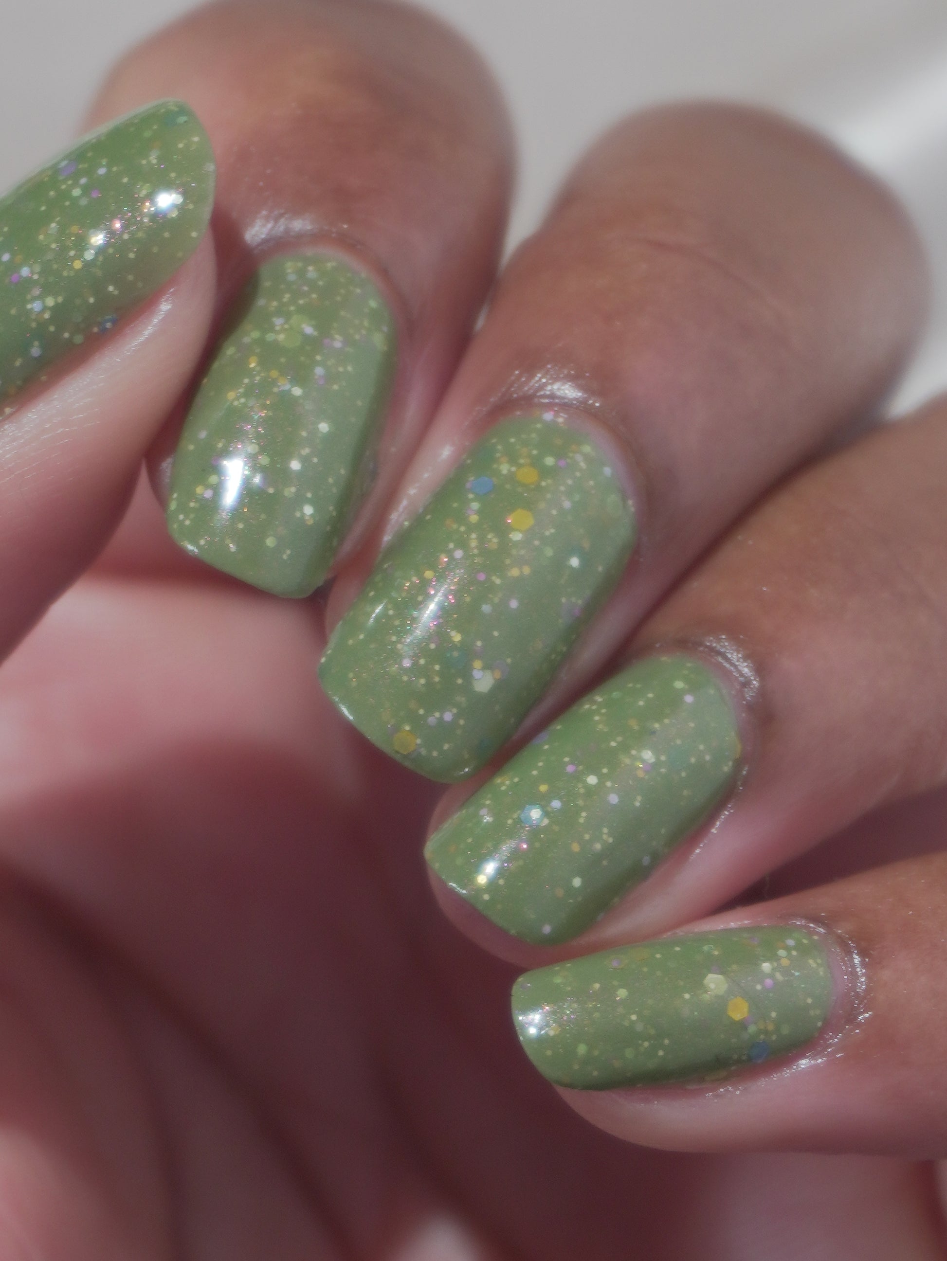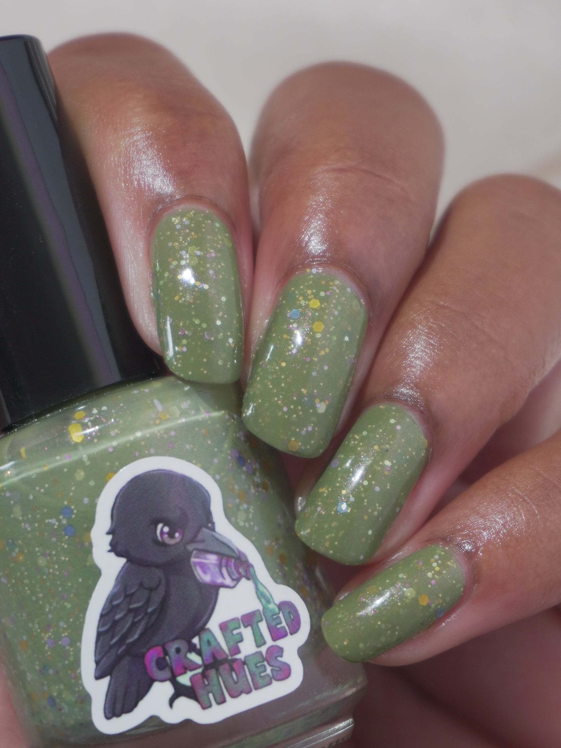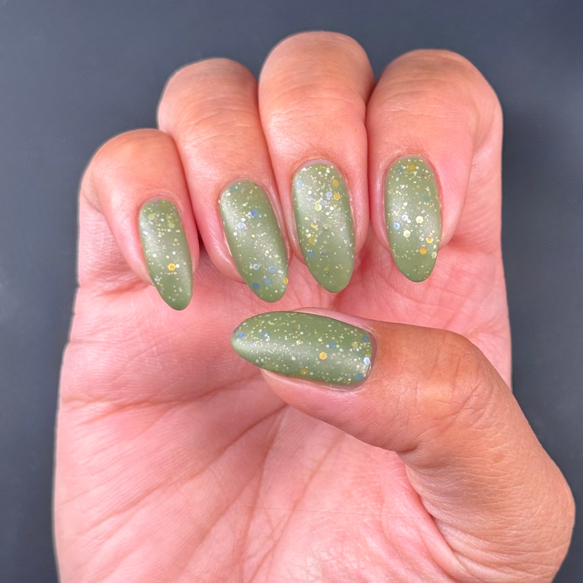 Something Is In The Corner is an army green crelly with pink shimmer, pink, green, blue and orange glitter hexes in various sizes.