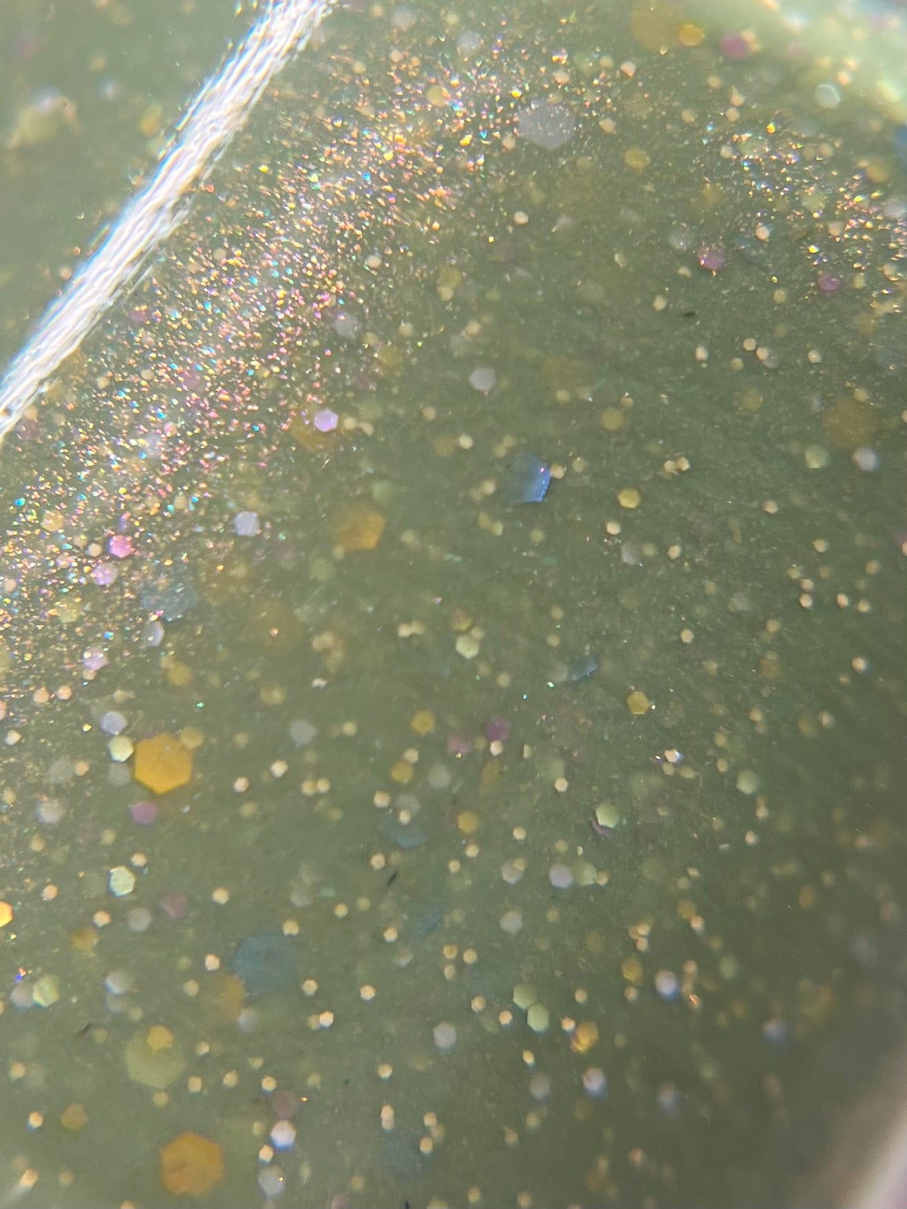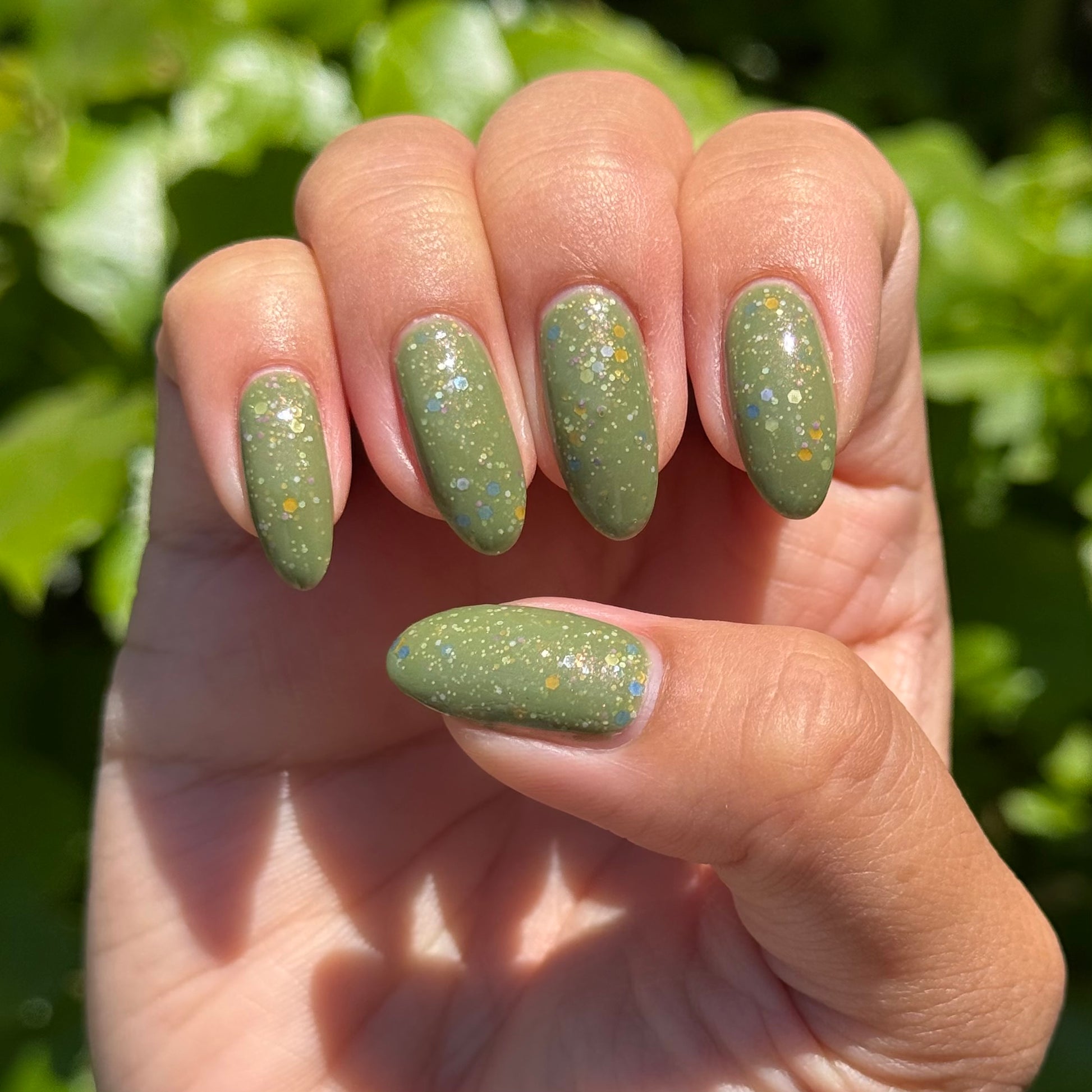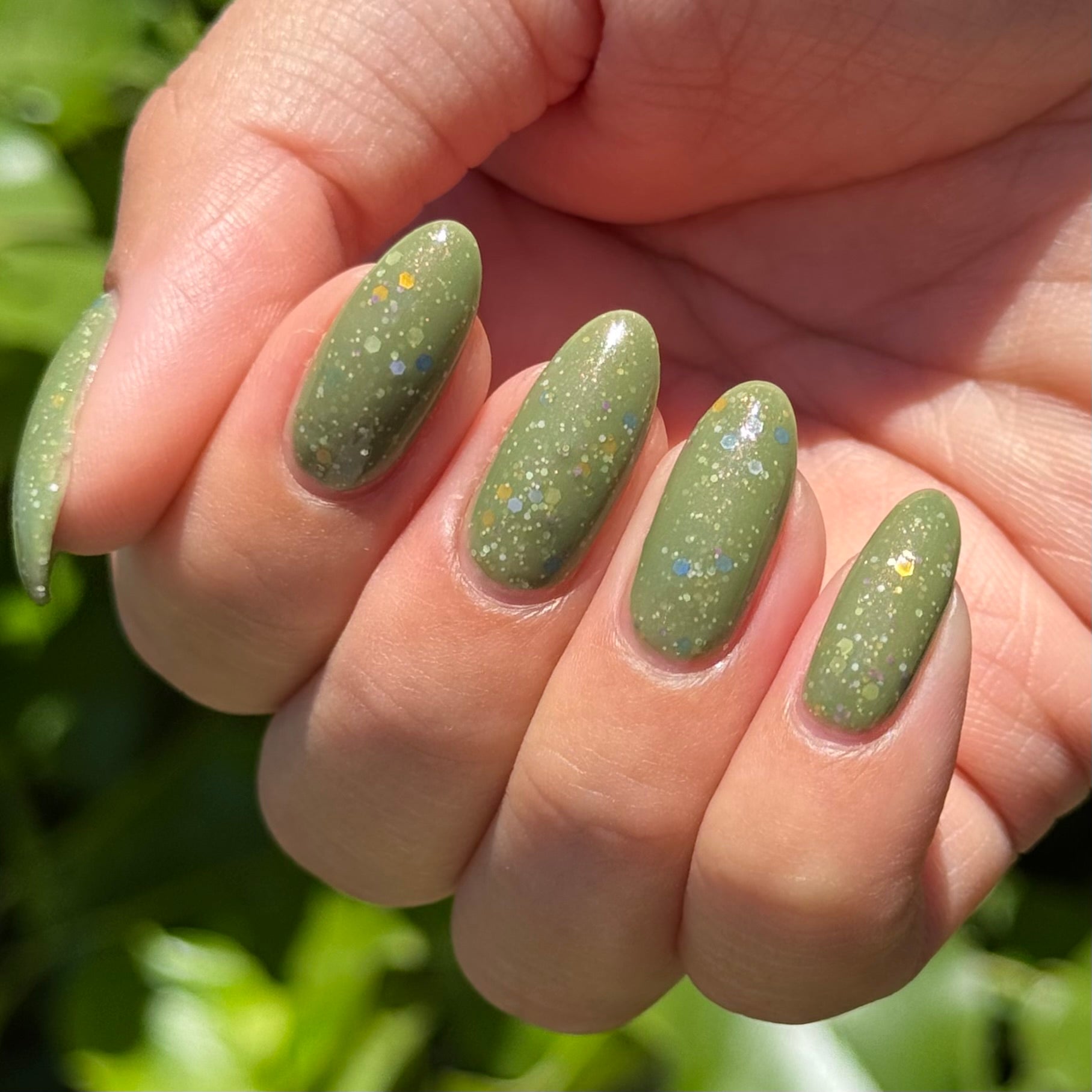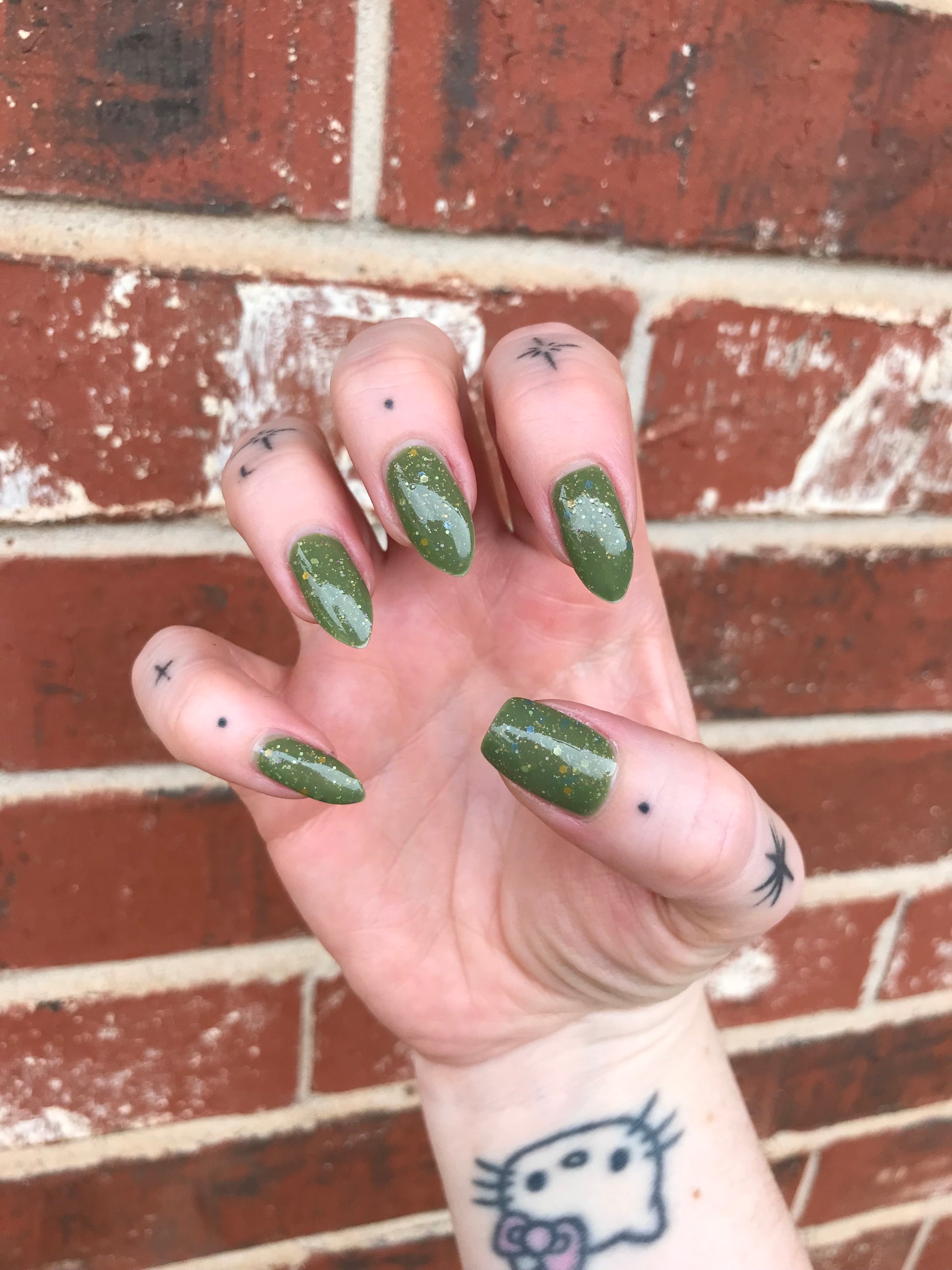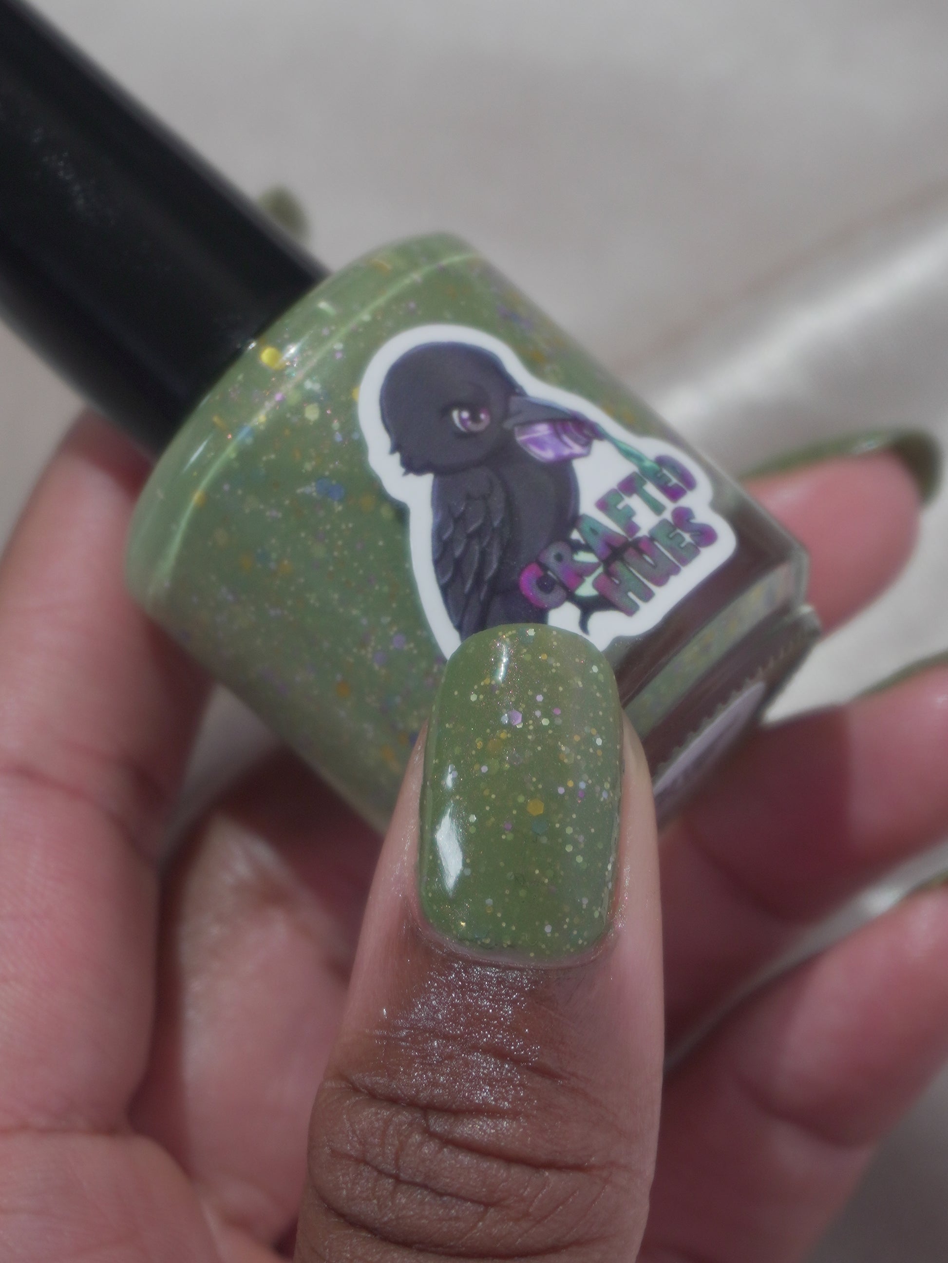 Something Is In The Corner is an army green crelly with pink shimmer, pink, green, blue and orange glitter hexes in various sizes.