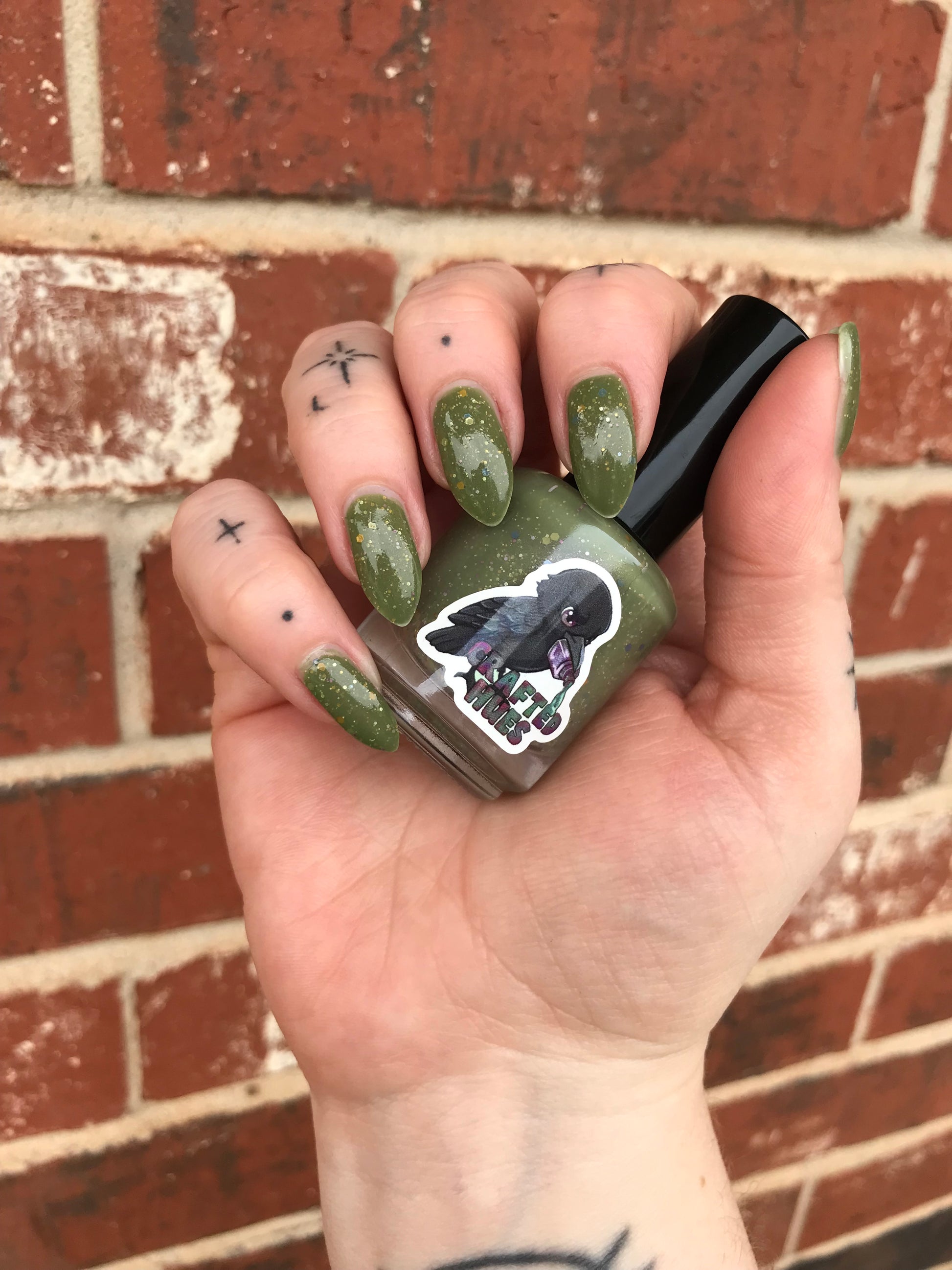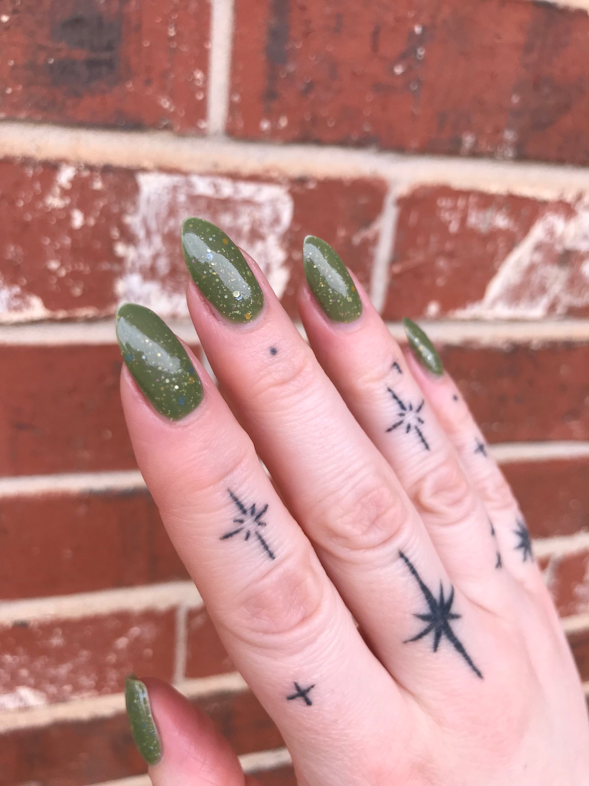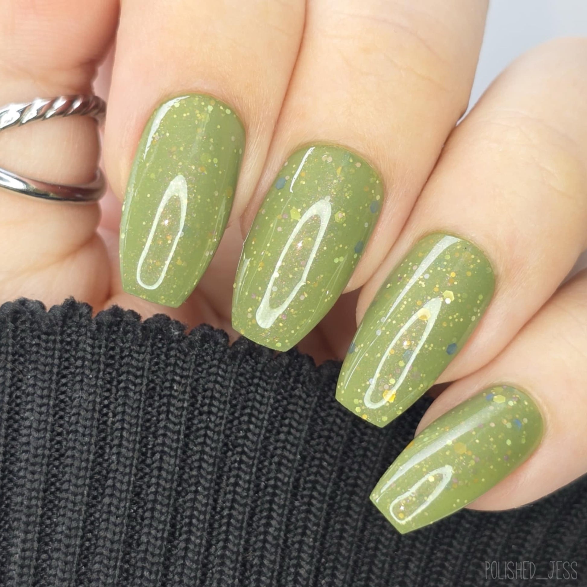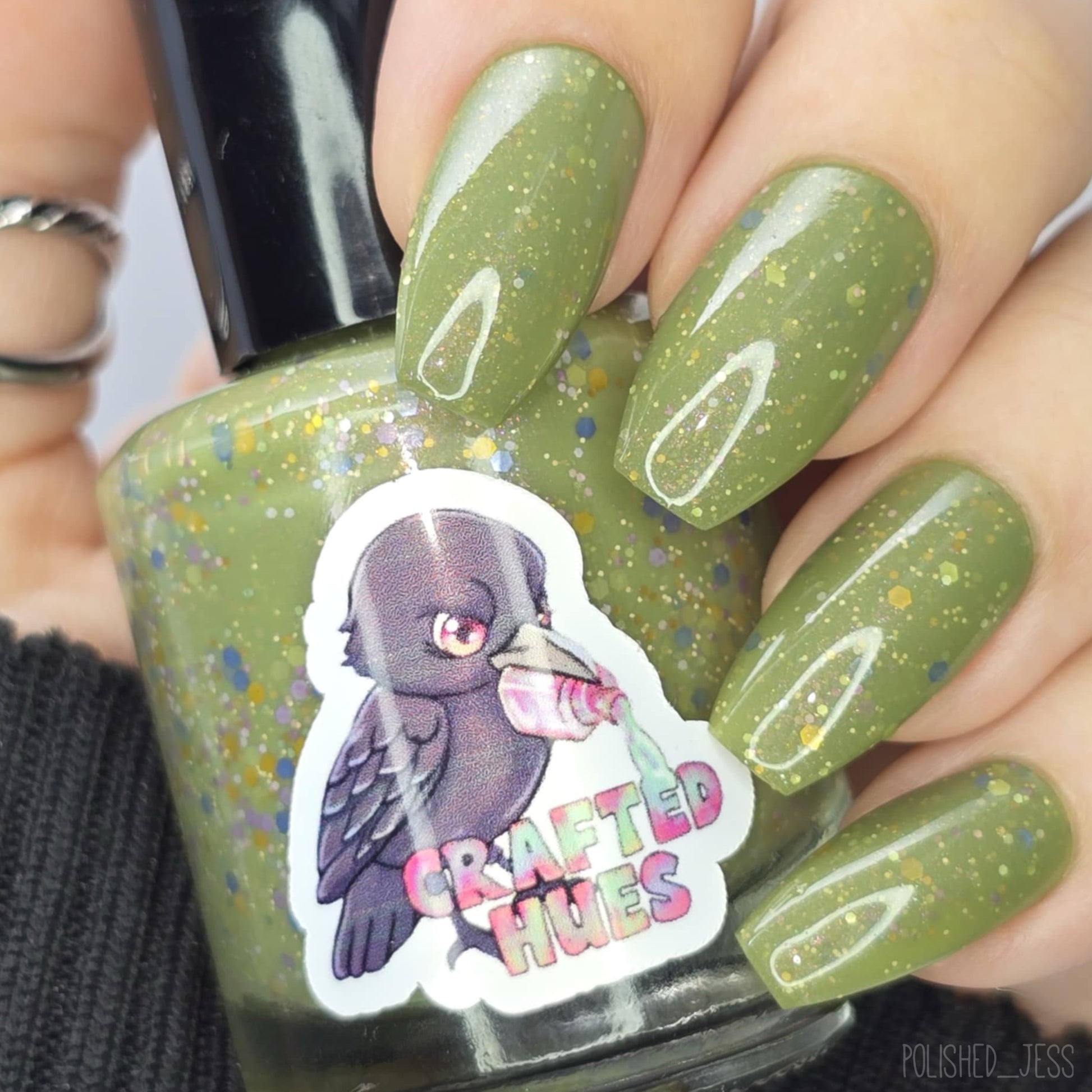 Something Is In The Corner is an army green crelly with pink shimmer, pink, green, blue and orange glitter hexes in various sizes.