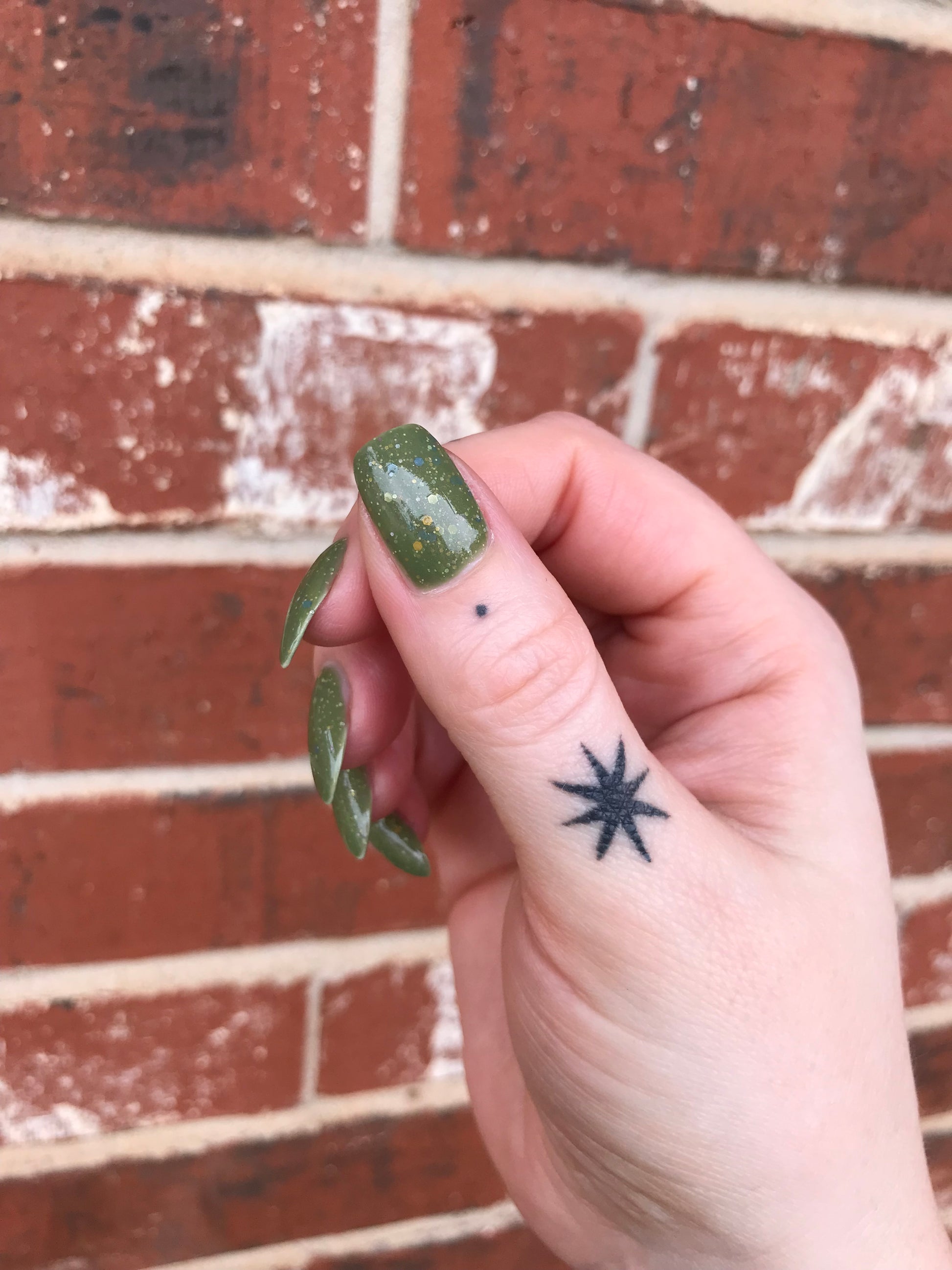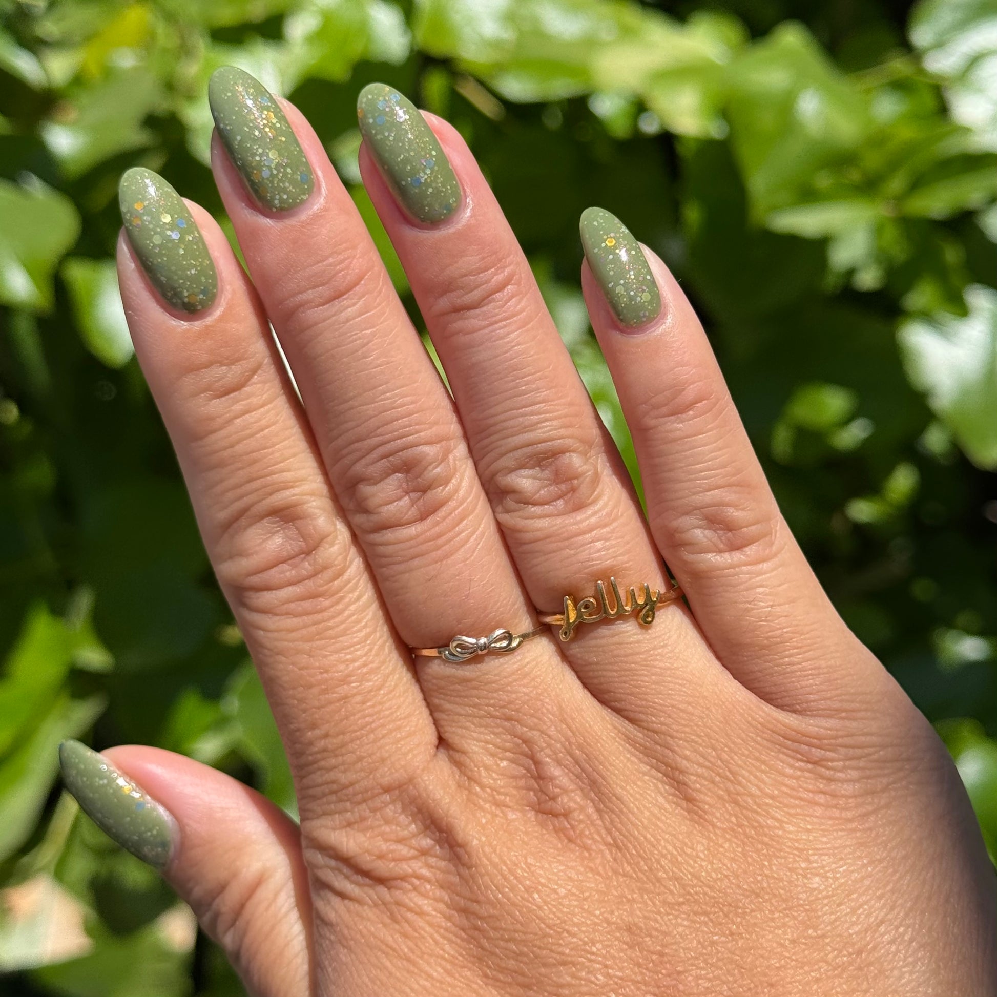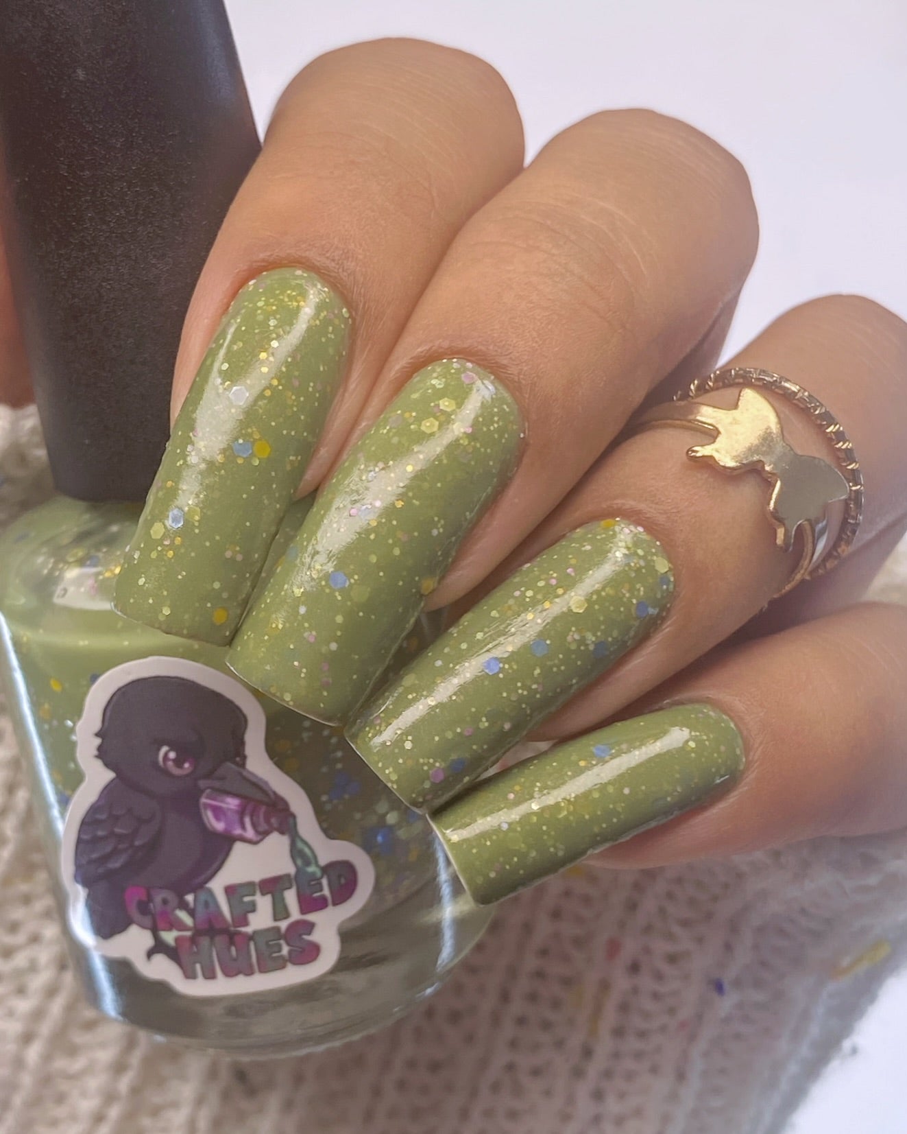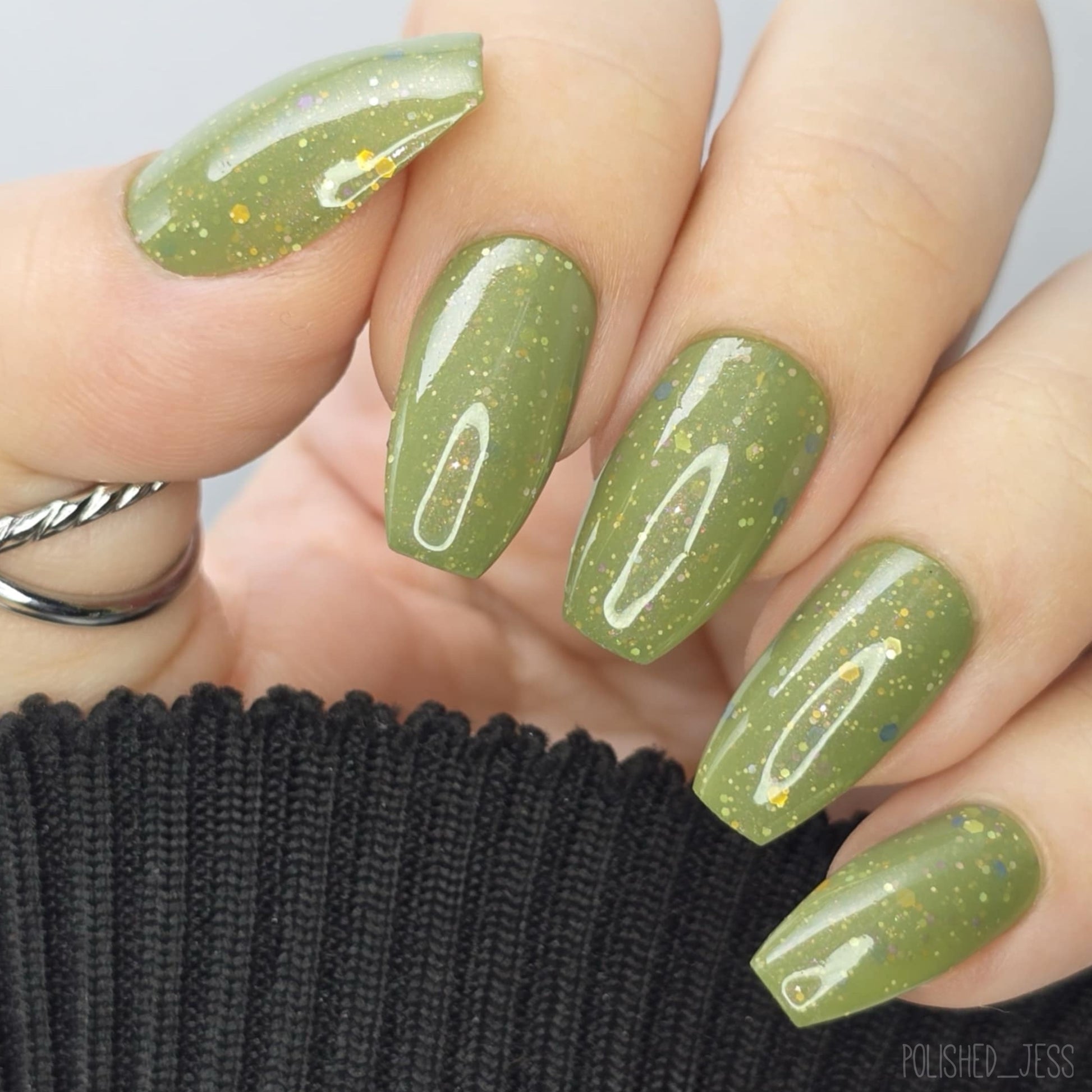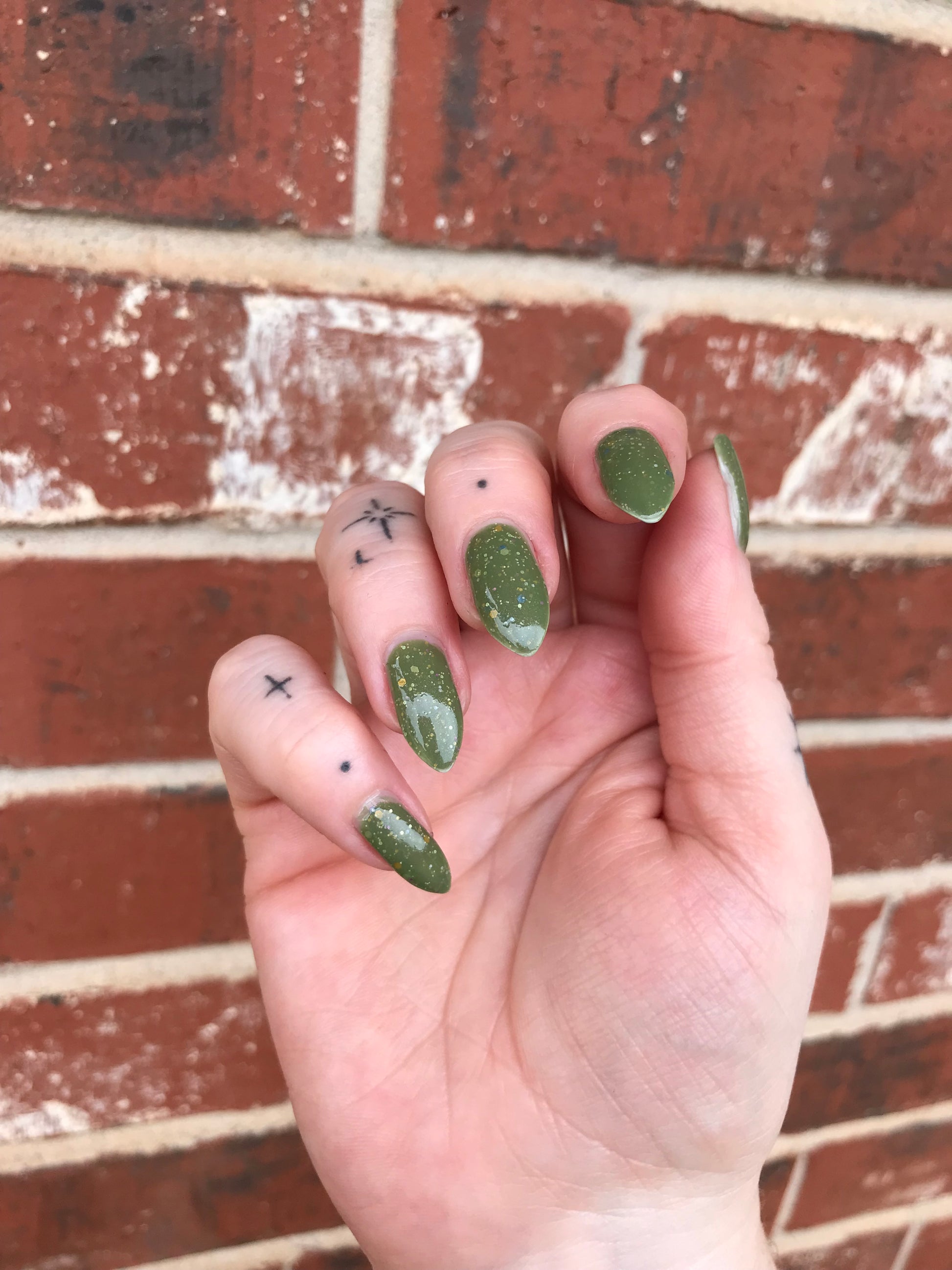 Something Is In The Corner is an army green crelly with pink shimmer, pink, green, blue and orange glitter hexes in various sizes.