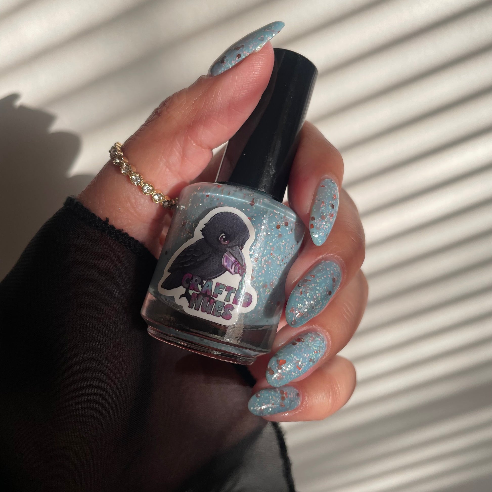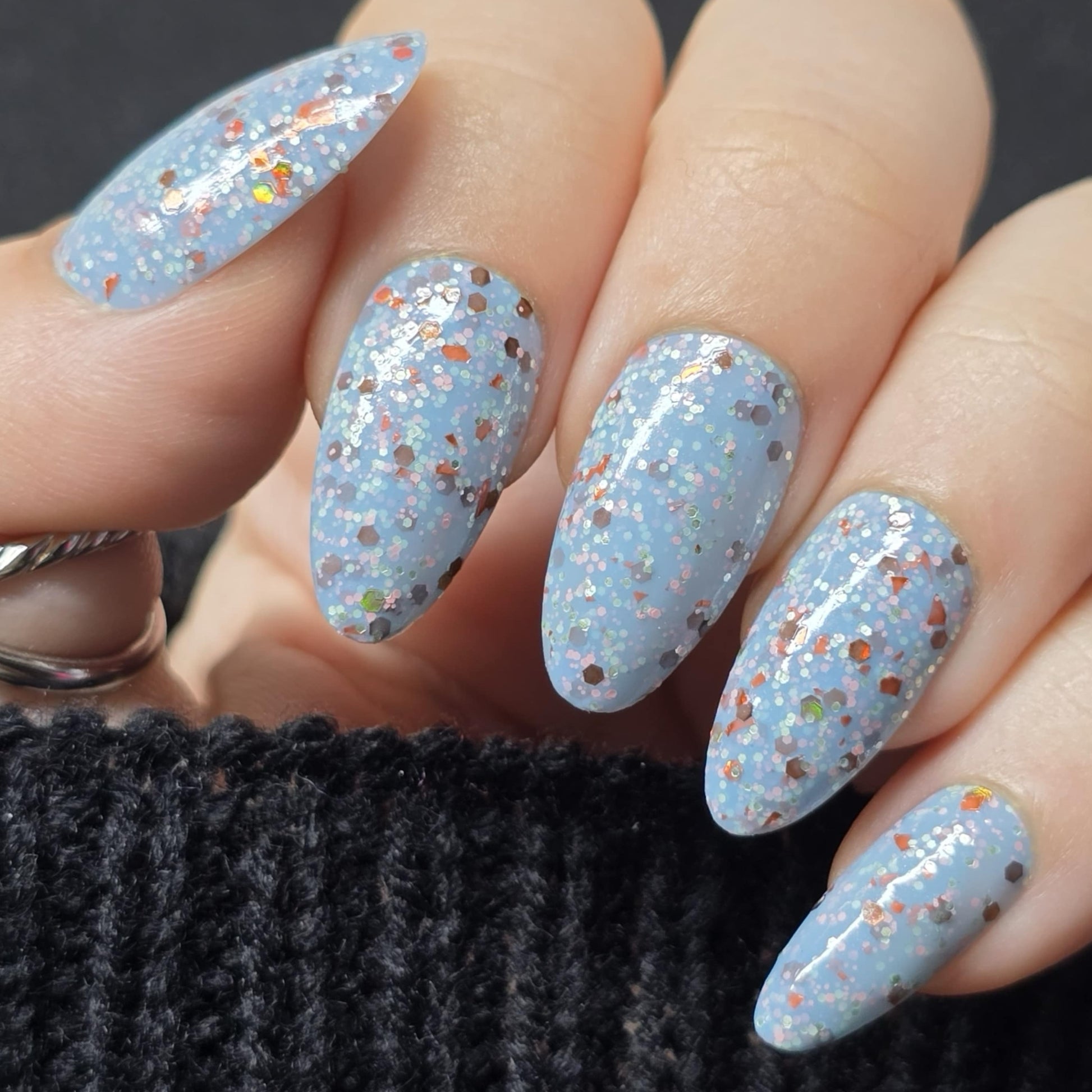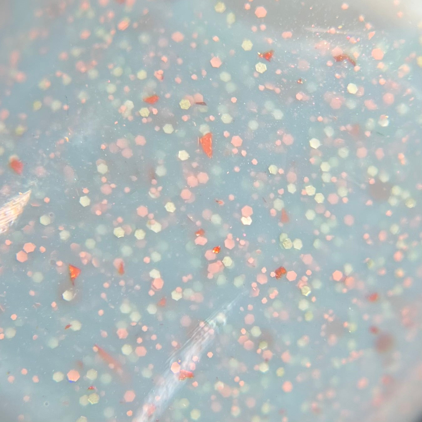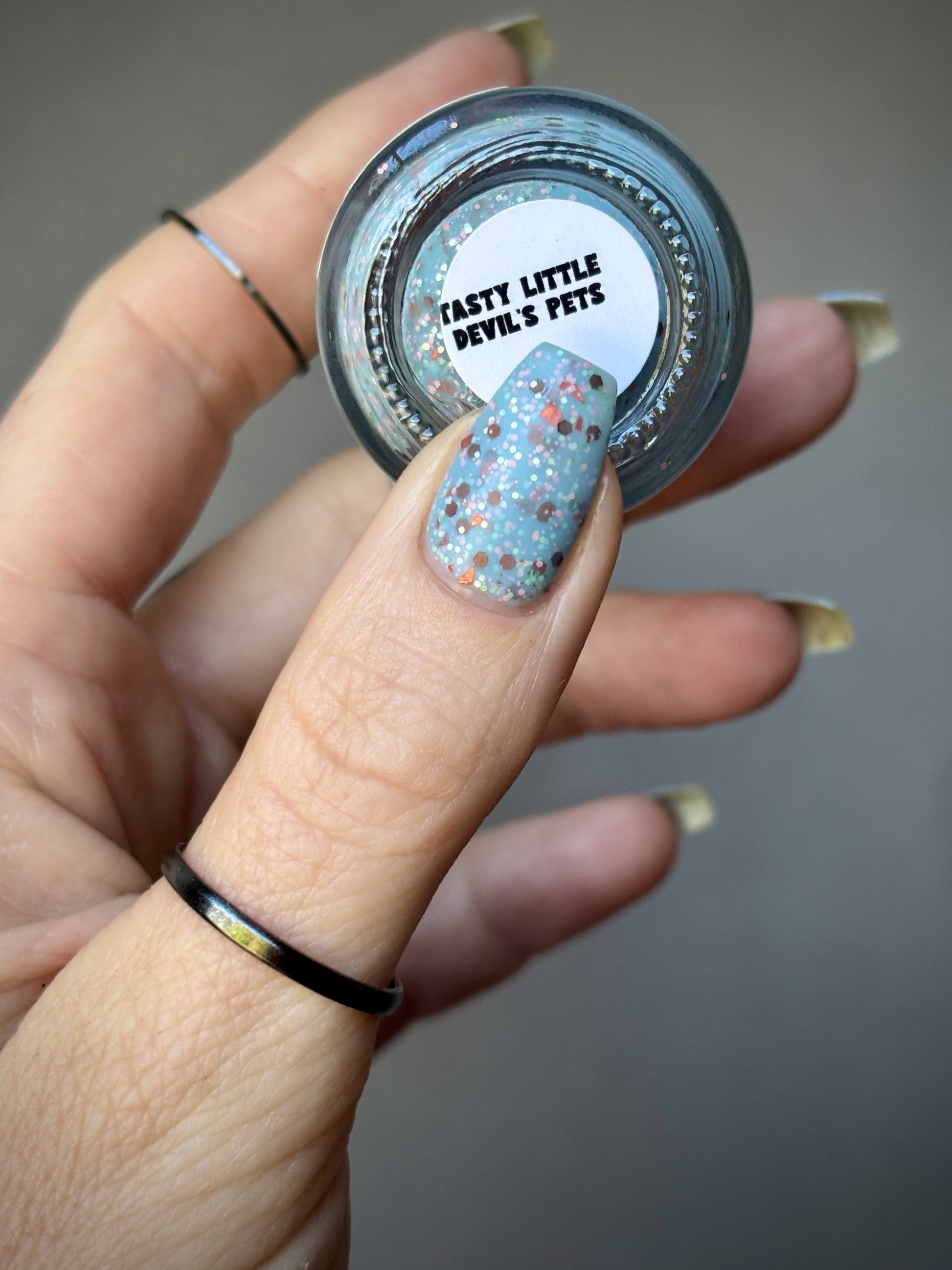 Inspired by the LABUBU - Exciting Macaron blind box! Tasty Little Devil’s Pets is a light blue crelly loaded with various shades of pastel glitters and orange brown shift glitters.